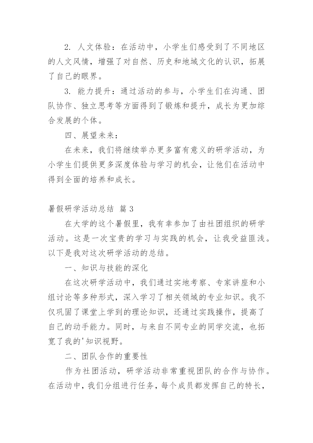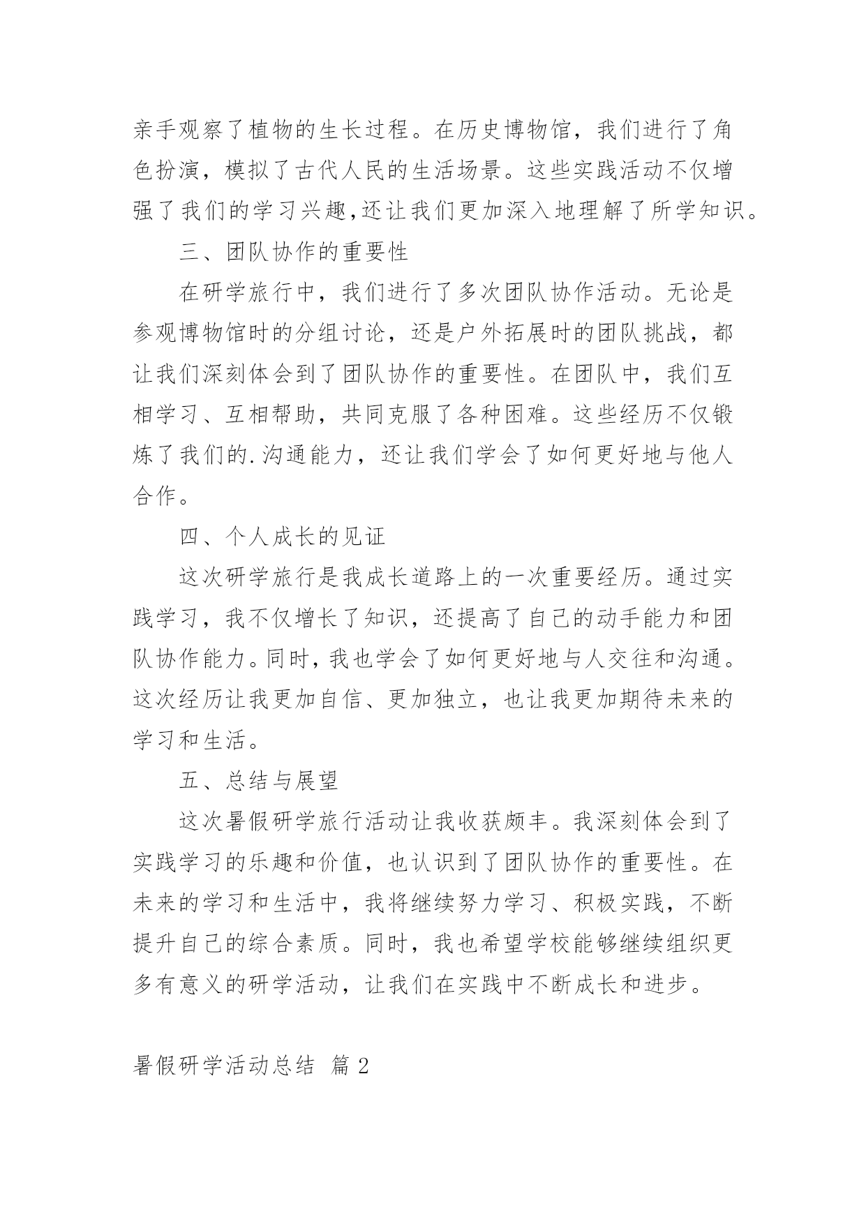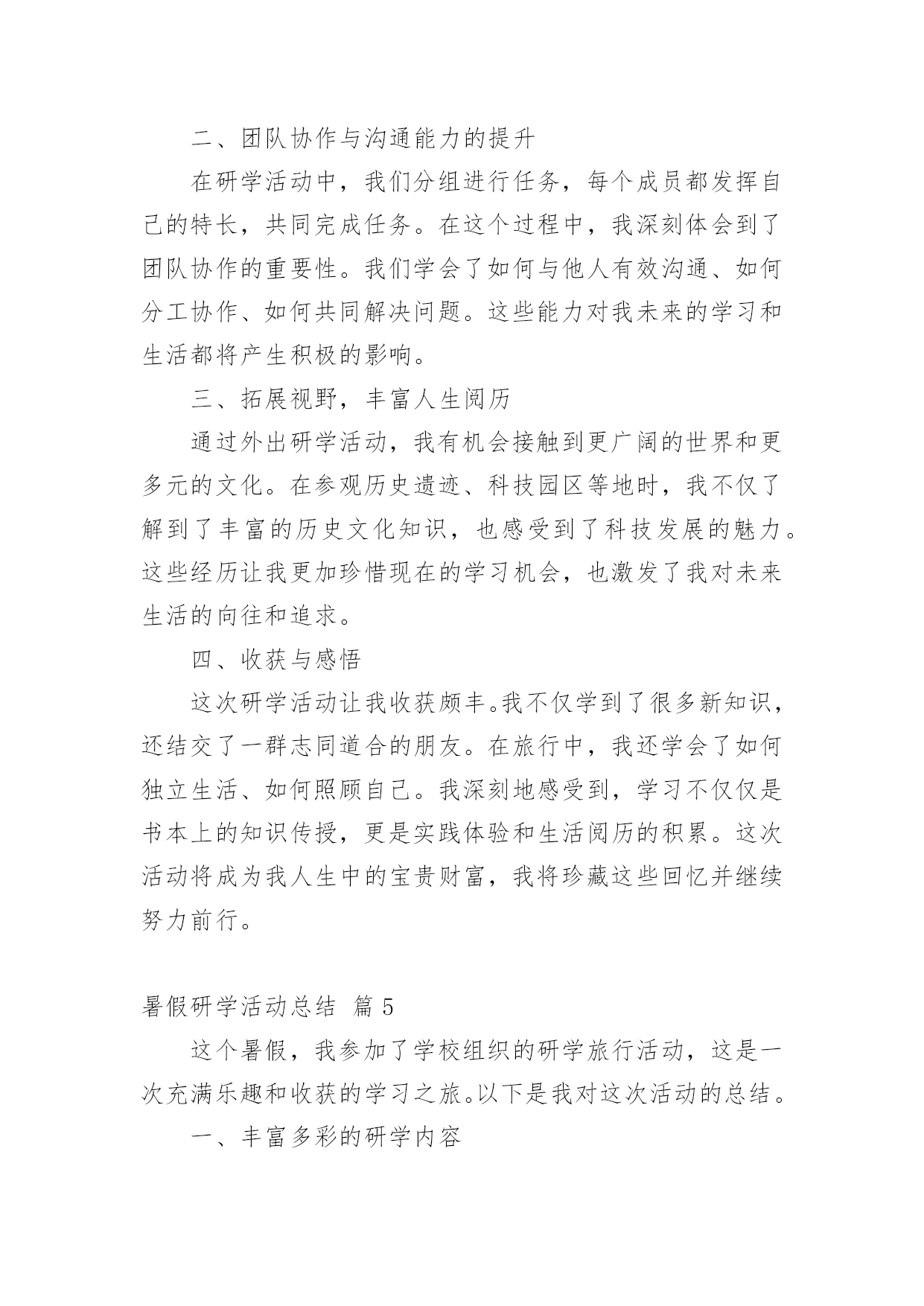 暑假研学活动总结暑假研学活动总结[汇总5篇]总结是指对某一阶段的工作、学习或思想中的经验或情况进行分析研究,做出带有规律性结论的书面材料,它可以给我们下一阶段的学习和工作生活做指导,我想我们需要写一份总结了吧。你所见过的总结应该是什么样的?下面是小编帮大家整理的暑假研学活动总结,供大家参考借鉴,希望可以帮助到有需要的朋友。暑假研学活动总结篇1暑假期间,我有幸参加了学校组织的研学旅行活动。这次研学之旅不仅让我收获了知识,更让我在实践中体验到了成长的喜悦。以下是我对这次研学活动的总结。一、研学活动的丰富性这次研学旅行的内容丰富多彩,涵盖了自然、历史、文化等多个领域。我们首先来到了当地的自然博物馆,通过讲解员的介绍和互动展示,我对动植物的生长习性和生态环境有了更深刻的理解。接着,我们参观了历史博物馆,了解了家乡的历史变迁和文化传承。在文化体验区,我们还亲手制作了传统工艺品,感受到了传统文化的魅力。二、实践学习的乐趣这次研学旅行强调实践学习,让我们在亲身体验中感受知识的魅力。在参观自然博物馆时,我们进行了生态实验,亲手观察了植物的生长过程。在历史博物馆,我们进行了角色扮演,模拟了古代人民的生活场景。这些实践活动不仅增强了我们的学习兴趣,还让我们更加深入地理解了所学知识。三、团队协作的重要性在研学旅行中,我们进行了多次团队协作活动。无论是参观博物馆时的分组讨论,还是户外拓展时的团队挑战,都让我们深刻体会到了团队协作的重要性。在团队中,我们互相学习、互相帮助,共同克服了各种困难。这些经历不仅锻炼了我们的.沟通能力,还让我们学会了如何更好地与他人合作。四、个人成长的见证这次研学旅行是我成长道路上的一次重要经历。通过实践学习,我不仅增长了知识,还提高了自己的动手能力和团队协作能力。同时,我也学会了如何更好地与人交往和沟通。这次经历让我更加自信、更加独立,也让我更加期待未来的学习和生活。五、总结与展望这次暑假研学旅行活动让我收获颇丰。我深刻体会到了实践学习的乐趣和价值,也认识到了团队协作的重要性。在未来的学习和生活中,我将继续努力学习、积极实践,不断提升自己的综合素质。同时,我也希望学校能够继续组织更多有意义的研学活动,让我们在实践中不断成长和进步。暑假研学活动总结篇2今年暑假,我们组织了一次丰富多彩、富有收获的研学之旅,让小学生们在活动中学习、探索和体验。以下是我们活动的总结:一、目的地选择:1.推陈出新:选择了一些新颖的目的地,如科技博物馆、植物园、农场等,让小学生在研学旅行中接触到更广泛的知识领域,开拓视野,拓展思维。2.融入实践:结合当地的人文历史和自然环境,安排了适合小学生的体验活动,让他们从亲身实践中领略知识的魅力。二、活动过程:1.专业指导:安排专业老师和导游,为小学生们提供专业的讲解和指导,使他们在参观过程中能够更好地理解知识,引导他们主动学习。2.互动体验:开展了互动性质的学习活动,如科学实验、DIY手工等,让小学生们在动手操作中感受知识的乐趣,增强对所学知识的记忆和理解。3.反思总结:每次活动结束后,组织学生展开反思与总结,引导他们从所学知识和体验中得到启示,培养独立思考的能力。三、活动成果:1.知识收获:通过研学活动,小学生们拓宽了知识面,了解了很多在学校课堂上无法接触到的新知识,对所学内容有了更深入的.理解。2.人文体验:在活动中,小学生们感受到了不同地区的人文风情,增强了对自然、历史和地域文化的认识,拓展了自己的眼界。3.能力提升:通过活动的参与,小学生们在沟通、团队协作、独立思考等方面得到了锻炼和提升,成长为更加综合发展的个体。四、展望未来:在未来,我们将继续举办更多富有意义的研学活动,为小学生们提供更多深度体验与学习的机会,让他们在活动中得到全面的培养和成长。暑假研学活动总结篇3在大学的这个暑假里,我有幸参加了由社团组织的研学活动。这是一次宝贵的学习与实践的机会,让我受益匪浅。以下是我对这次研学活动的总结。一、知识与技能的深化在这次研学活动中,我们通过实地考察、专家讲座和小组讨论等多种形式,深入学习了相关领域的专业知识。我不仅巩固了课堂上学到的理论知识,还通过实践操作,提高了自己的动手能力。同时,与来自不同专业的同学交流,也拓宽了我的'知识视野。二、团队合作的重要性作为社团活动,研学活动非常重视团队的合作与协作。在活动中,我们分组进行任务,每个成员都发挥自己的特长,共同完成任务。我深刻体会到,只有团队成员之间互相支持、互相帮助,才能取得更好的成绩。这次活动也锻炼了我的团队协作能力,让我更加懂得如何在团队中发挥自己的作用。三、实践经验的积累研学活动不仅提供了学习的机会,还让我们有机会将所学知识应用到实践中。通过实地考察和实际操作,我更加深入地了解了所学知识的实际应用场景,也积累了宝贵的实践经验。这些经验对于我未来