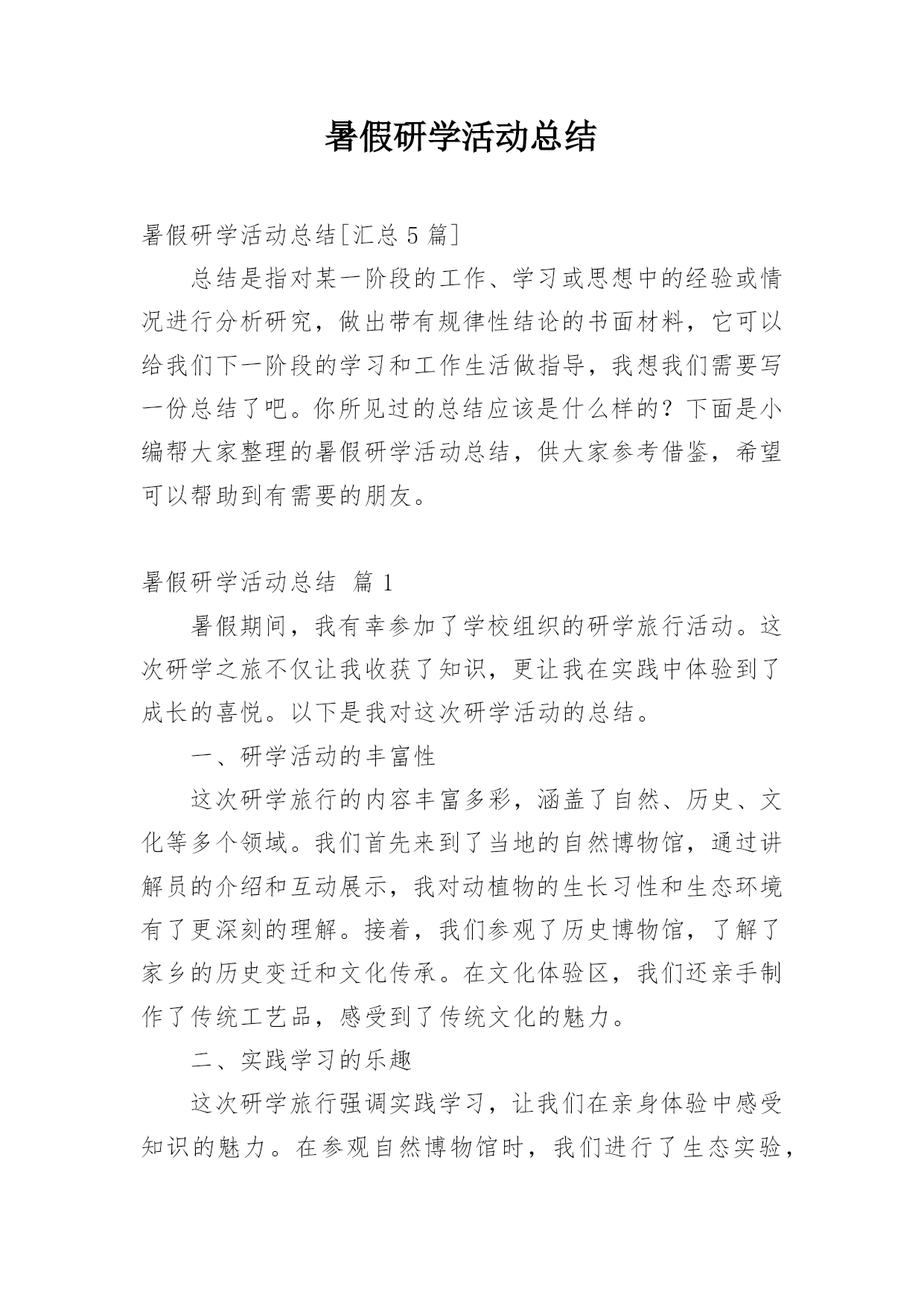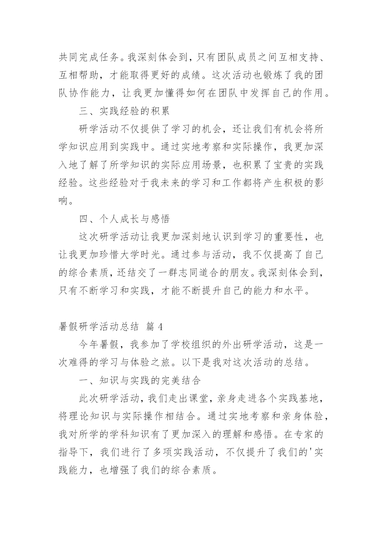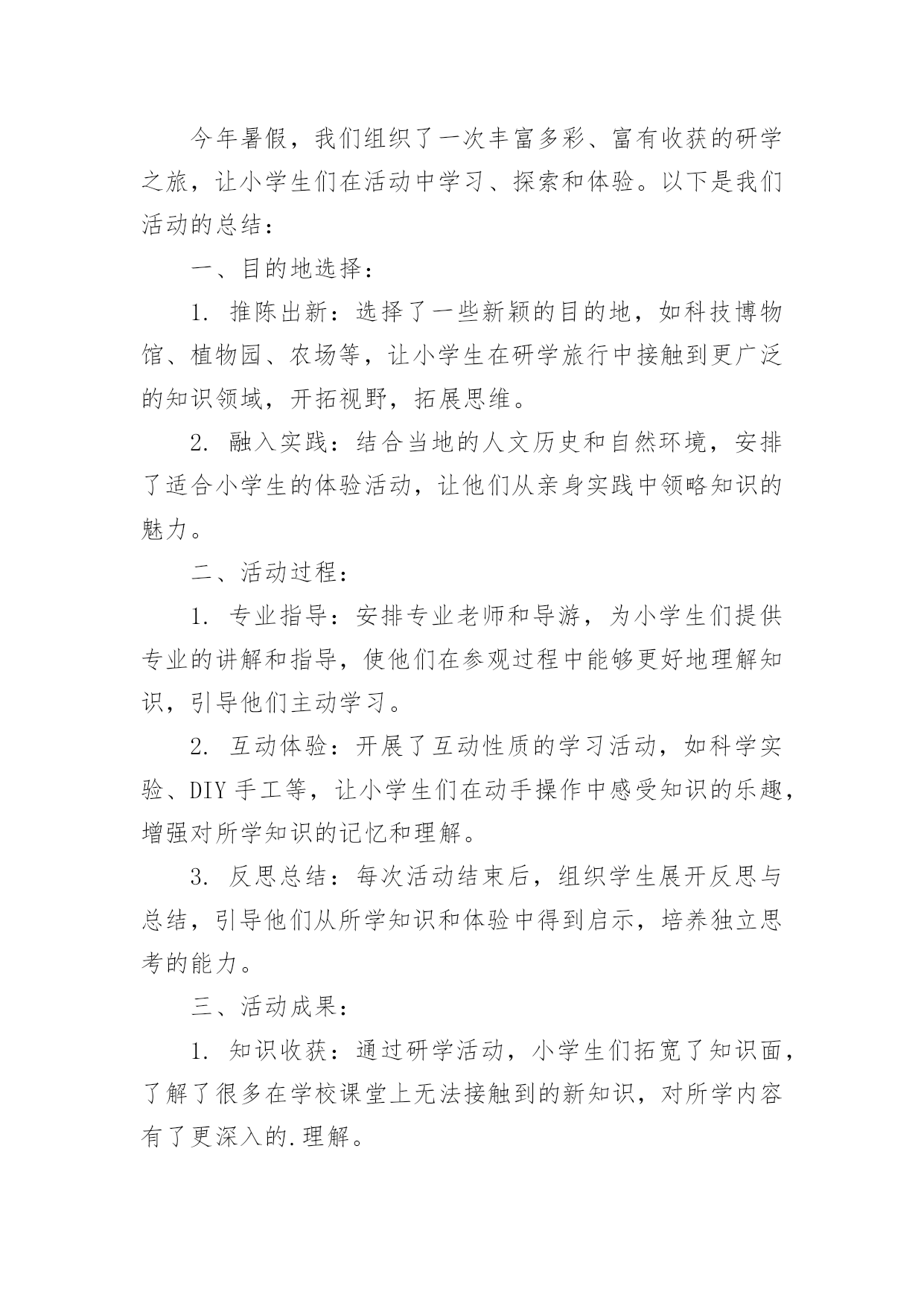 暑假研学活动总结暑假研学活动总结[汇总5篇]总结是指对某一阶段的工作、学习或思想中的经验或情况进行分析研究,做出带有规律性结论的书面材料,它可以给我们下一阶段的学习和工作生活做指导,我想我们需要写一份总结了吧。你所见过的总结应该是什么样的?下面是小编帮大家整理的暑假研学活动总结,供大家参考借鉴,希望可以帮助到有需要的朋友。暑假研学活动总结篇1暑假期间,我有幸参加了学校组织的研学旅行活动。这次研学之旅不仅让我收获了知识,更让我在实践中体验到了成长的喜悦。以下是我对这次研学活动的总结。一、研学活动的丰富性这次研学旅行的内容丰富多彩,涵盖了自然、历史、文化等多个领域。我们首先来到了当地的自然博物馆,通过讲解员的介绍和互动展示,我对动植物的生长习性和生态环境有了更深刻的理解。接着,我们参观了历史博物馆,了解了家乡的历史变迁和文化传承。在文化体验区,我们还亲手制作了传统工艺品,感受到了传统文化的魅力。二、实践学习的乐趣这次研学旅行强调实践学习,让我们在亲身体验中感受知识的魅力。在参观自然博物馆时,我们进行了生态实验,亲手观察了植物的生长过程。在历史博物馆,我们进行了角色扮演,模拟了古代人民的生活场景。这些实践活动不仅增强了我们的学习兴趣,还让我们更加深入地理解了所学知识。三、团队协作的重要性在研学旅行中,我们进行了多次团队协作活动。无论是参观博物馆时的分组讨论,还是户外拓展时的团队挑战,都让我们深刻体会到了团队协作的重要性。在团队中,我们互相学习、互相帮助,共同克服了各种困难。这些经历不仅锻炼了我们的.沟通能力,还让我们学会了如何更好地与他人合作。四、个人成长的见证这次研学旅行是我成长道路上的一次重要经历。通过实践学习,我不仅增长了知识,还提高了自己的动手能力和团队协作能力。同时,我也学会了如何更好地与人交往和沟通。这次经历让我更加自信、更加独立,也让我更加期待未来的学习和生活。五、总结与展望这次暑假研学旅行活动让我收获颇丰。我深刻体会到了实践学习的乐趣和价值,也认识到了团队协作的重要性。在未来的学习和生活中,我将继续努力学习、积极实践,不断提升自己的综合素质。同时,我也希望学校能够继续组织更多有意义的研学活动,让我们在实践中不断成长和进步。暑假研学活动总结篇2今年暑假,我们组织了一次丰富多彩、富有收获的研学之旅,让小学生们在活动中学习、探索和体验。以下是我们活动的总结:一、目的地选择:1.推陈出新:选择了一些新颖的目的地,如科技博物馆、植物园、农场等,让小学生在研学旅行中接触到更广泛的知识领域,开拓视野,拓展思维。2.融入实践:结合当地的人文历史和自然环境,安排了适合小学生的体验活动,让他们从亲身实践中领略知识的魅力。二、活动过程:1.专业指导:安排专业老师和导游,为小学生们提供专业的讲解和指导,使他们在参观过程中能够更好地理解知识,引导他们主动学习。2.互动体验:开展了互动性质的学习活动,如科学实验、DIY手工等,让小学生们在动手操作中感受知识的乐趣,增强对所学知识的记忆和理解。3.反思总结:每次活动结束后,组织学生展开反思与总结,引导他们从所学知识和体验中得到启示,培养独立思考的能力。三、活动成果:1.知识收获:通过研学活动,小学生们拓宽了知识面,了解了很多在学校课堂上无法接触到的新知识,对所学内容有了更深入的.理解。2.人文体验:在活动中,小学生们感受到了不同地区的人文风情,增强了对自然、历史和地域文化的认识,拓展了自己的眼界。3.能力提升:通过活动的参与,小学生们在沟通、团队协作、独立思考等方面得到了锻炼和提升,成长为更加综合发展的个体。四、展望未来:在未来,我们将继续举办更多富有意义的研学活动,为小学生们提供更多深度体验与学习的机会,让他们在活动中得到全面的培养和成长。暑假研学活动总结篇3在大学的这个暑假里,我有幸参加了由社团组织的研学活动。这是一次宝贵的学习与实践的机会,让我受益匪浅。以下是我对这次研学活动的总结。一、知识与技能的深化在这次研学活动中,我们通过实地考察、专家讲座和小组讨论等多种形式,深入学习了相关领域的专业知识。我不仅巩固了课堂上学到的理论知识,还通过实践操作,提高了自己的动手能力。同时,与来自不同专业的同学交流,也拓宽了我的'知识视野。二、团队合作的重要性作为社团活动,研学活动非常重视团队的合作与协作。在活动中,我们分组进行任务,每个成员都发挥自己的特长,共同完成任务。我深刻体会到,只有团队成员之间互相支持、互相帮助,才能取得更好的成绩。这次活动也锻炼了我的团队协作能力,让我更加懂得如何在团队中发挥自己的作用。三、实践经验的积累研学活动不仅提供了学习的机会,还让我们有机会将所学知识应用到实践中。通过实地考察和实际操作,我更加深入地了解了所学知识的实际应用场景,也积累了宝贵的实践经验。这些经验对于我未来