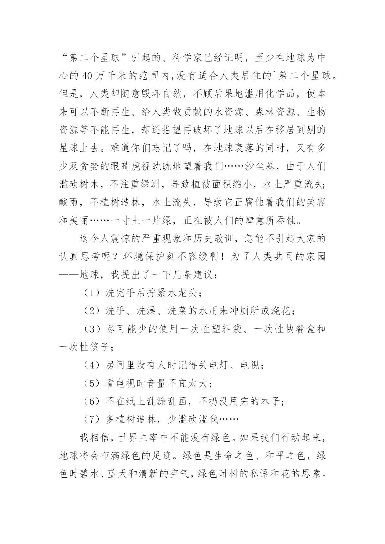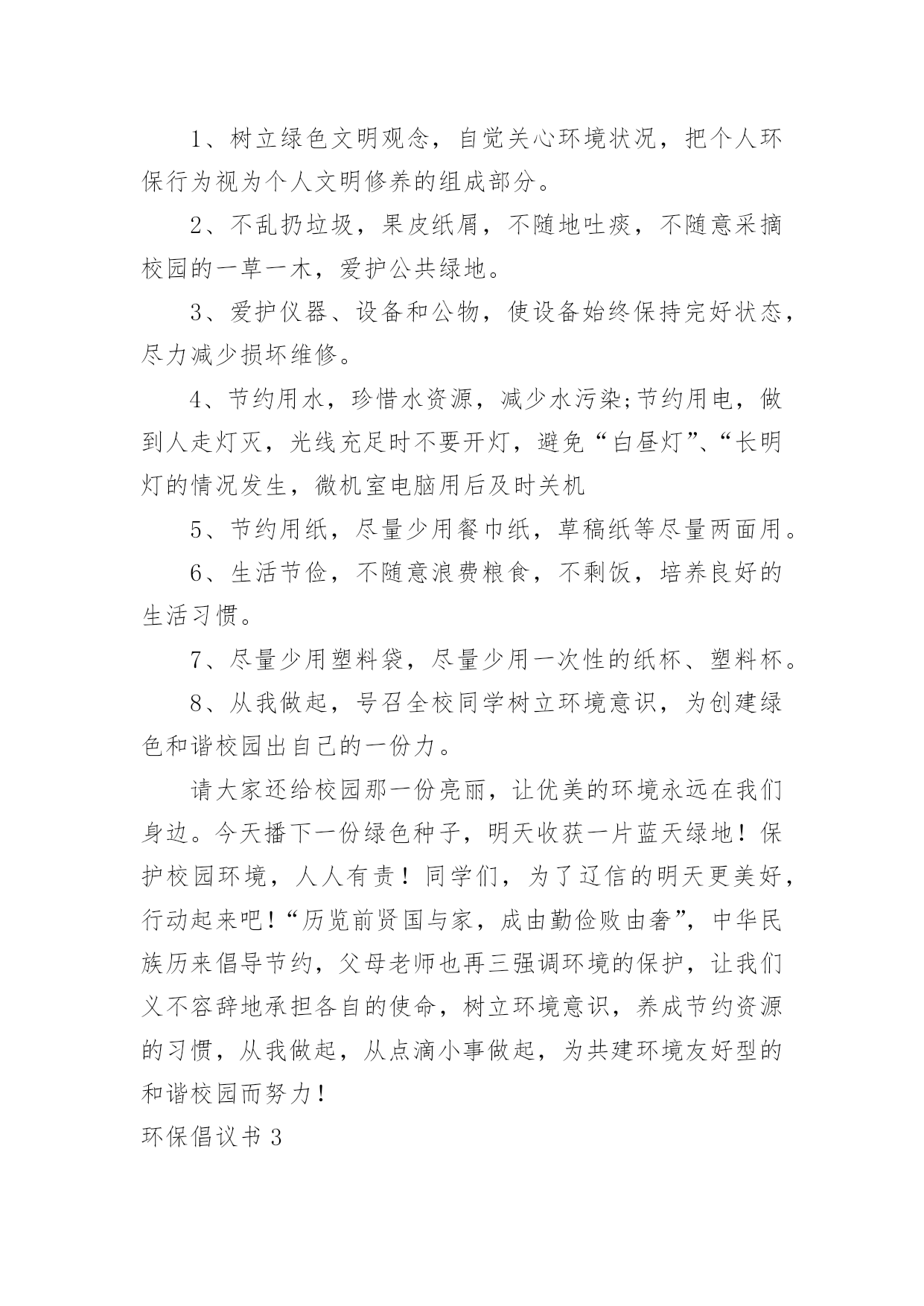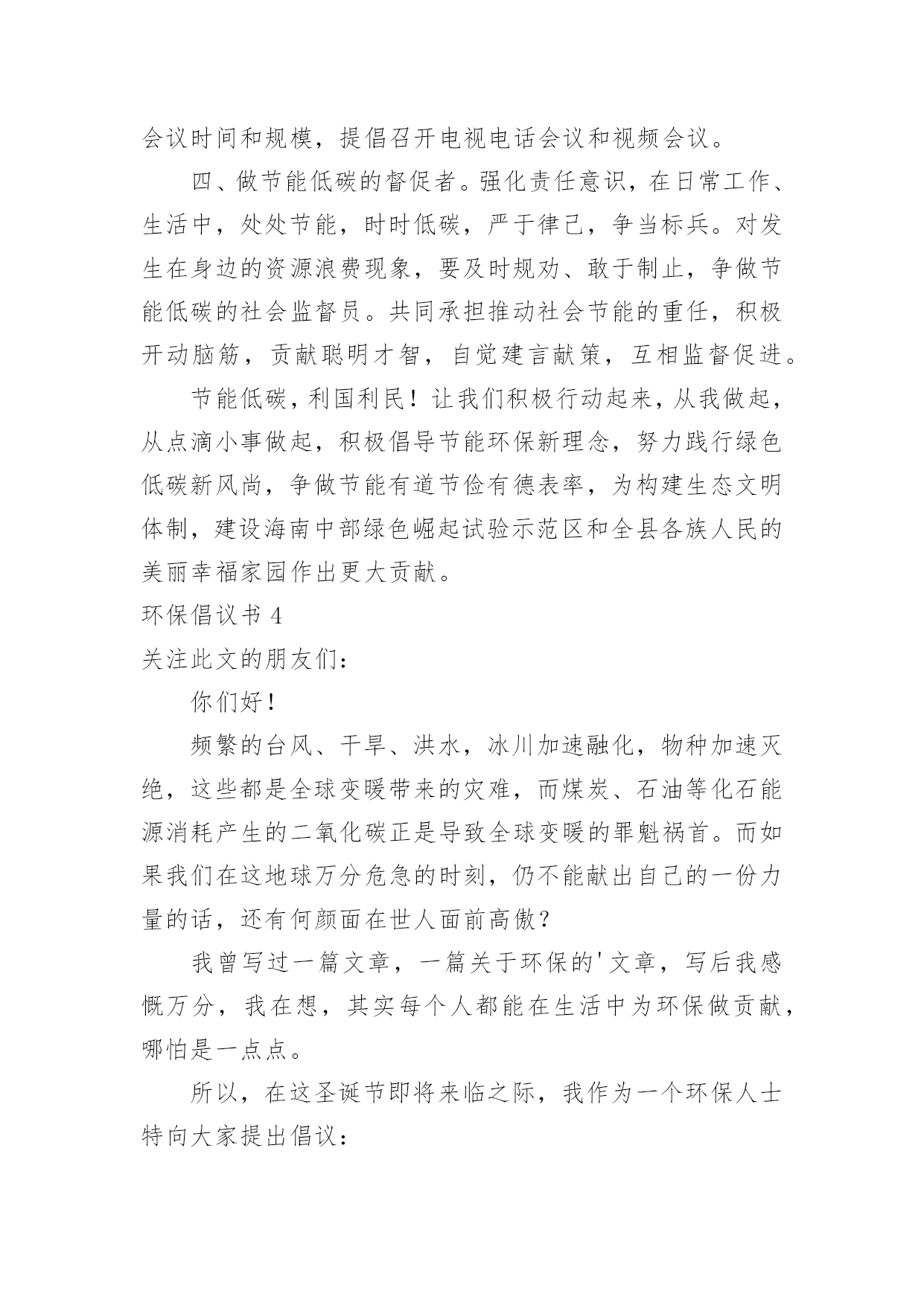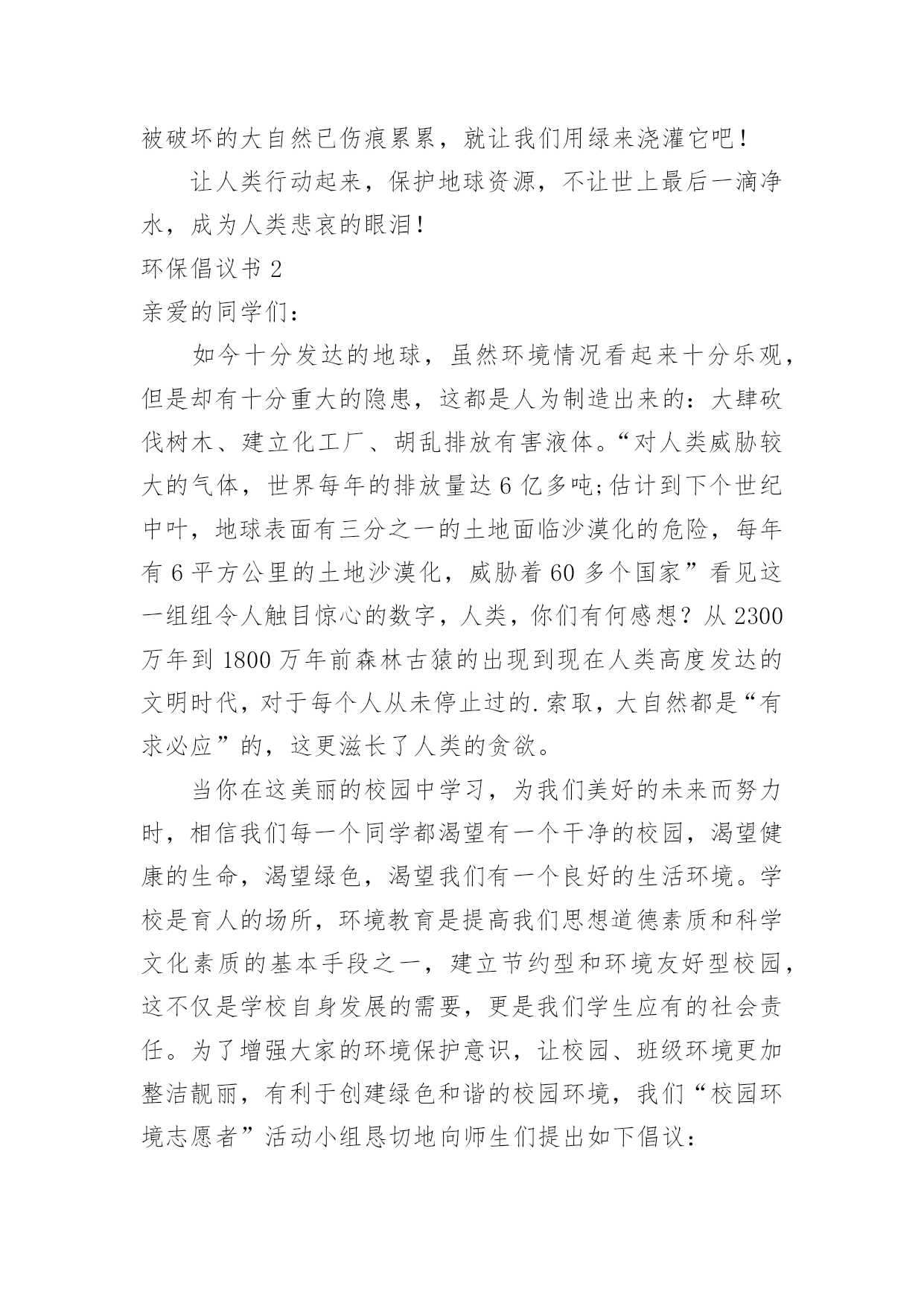 环保倡议书环保倡议书精品【4篇】在现在的社会生活中,我们使用上倡议书的情况与日俱增,倡议书有利于倡议者交代清楚倡议活动的原因,以及当时的各种背景事实。倡议书的注意事项有许多,你确定会写吗?下面是小编帮大家整理的环保倡议书,仅供参考,欢迎大家阅读。环保倡议书1敬爱的环保局局长:地球,这位人类的母亲,这个生命的摇篮,是那么的美丽壮观,和蔼可亲。但是近几年来由于人们对生态环境的破坏、绿洲的不重视,我们生存的地球犹如一位生命垂危的老人,奄奄一息……“哗——哗……”水龙头不停地流出清澈的自来水,用水人不知去向;开着电灯、电视,房间里长时间空无一人;笔记本被随身扔进垃圾箱,却只用了几页;森林、绿洲不断消失,人们却置之不理……您说,地球拥有的自然资源难道是无限的吗?我们不加节制地利用资源,大地就不会干枯吗?黄河断流、罗布泊干涸、一些大江大河被污染、森林滥砍滥伐……这一切一切的不良现象,都是由我们人类心中那“第二个星球”引起的、科学家已经证明,至少在地球为中心的40万千米的范围内,没有适合人类居住的`第二个星球。但是,人类却随意毁坏自然,不顾后果地滥用化学品,使本来可以不断再生、给人类做贡献的水资源、森林资源、生物资源等不能再生,却还指望再破坏了地球以后在移居到别的星球上去。难道你们忘记了吗,在地球衰落的同时,又有多少双贪婪的眼睛虎视眈眈地望着我们……沙尘暴,由于人们滥砍树木,不注重绿洲,导致植被面积缩小,水土严重流失;酸雨,不植树造林,水土流失,导致它正腐蚀着我们的笑容和美丽……一寸土一片绿,正在被人们的肆意所吞蚀。这令人震惊的严重现象和历史教训,怎能不引起大家的认真思考呢?环境保护刻不容缓啊!为了人类共同的家园——地球,我提出了一下几条建议:(1)洗完手后拧紧水龙头;(2)洗手、洗澡、洗菜的水用来冲厕所或浇花;(3)尽可能少的使用一次性塑料袋、一次性快餐盒和一次性筷子;(4)房间里没有人时记得关电灯、电视;(5)看电视时音量不宜太大;(6)不在纸上乱涂乱画,不扔没用完的本子;(7)多植树造林,少滥砍滥伐……我相信,世界主宰中不能没有绿色。如果我们行动起来,地球将会布满绿色的足迹。绿色是生命之色、和平之色,绿色时碧水、蓝天和清新的空气,绿色时树的私语和花的思索。被破坏的大自然已伤痕累累,就让我们用绿来浇灌它吧!让人类行动起来,保护地球资源,不让世上最后一滴净水,成为人类悲哀的眼泪!环保倡议书2亲爱的同学们:如今十分发达的地球,虽然环境情况看起来十分乐观,但是却有十分重大的隐患,这都是人为制造出来的:大肆砍伐树木、建立化工厂、胡乱排放有害液体。“对人类威胁较大的气体,世界每年的排放量达6亿多吨;估计到下个世纪中叶,地球表面有三分之一的土地面临沙漠化的危险,每年有6平方公里的土地沙漠化,威胁着60多个国家”看见这一组组令人触目惊心的数字,人类,你们有何感想?从2300万年到1800万年前森林古猿的出现到现在人类高度发达的文明时代,对于每个人从未停止过的.索取,大自然都是“有求必应”的,这更滋长了人类的贪欲。当你在这美丽的校园中学习,为我们美好的未来而努力时,相信我们每一个同学都渴望有一个干净的校园,渴望健康的生命,渴望绿色,渴望我们有一个良好的生活环境。学校是育人的场所,环境教育是提高我们思想道德素质和科学文化素质的基本手段之一,建立节约型和环境友好型校园,这不仅是学校自身发展的需要,更是我们学生应有的社会责任。为了增强大家的环境保护意识,让校园、班级环境更加整洁靓丽,有利于创建绿色和谐的校园环境,我们“校园环境志愿者”活动小组恳切地向师生们提出如下倡议:1、树立绿色文明观念,自觉关心环境状况,把个人环保行为视为个人文明修养的组成部分。2、不乱扔垃圾,果皮纸屑,不随地吐痰,不随意采摘校园的一草一木,爱护公共绿地。3、爱护仪器、设备和公物,使设备始终保持完好状态,尽力减少损坏维修。4、节约用水,珍惜水资源,减少水污染;节约用电,做到人走灯灭,光线充足时不要开灯,避免“白昼灯”、“长明灯的情况发生,微机室电脑用后及时关机5、节约用纸,尽量少用餐巾纸,草稿纸等尽量两面用。6、生活节俭,不随意浪费粮食,不剩饭,培养良好的生活习惯。7、尽量少用塑料袋,尽量少用一次性的纸杯、塑料杯。8、从我做起,号召全校同学树立环境意识,为创建绿色和谐校园出自己的一份力。请大家还给校园那一份亮丽,让优美的环境永远在我们身边。今天播下一份绿色种子,明天收获一片蓝天绿地!保护校园环境,人人有责!同学们,为了辽信的明天更美好,行动起来吧!“历览前贤国与家,成由勤俭败由奢”,中华民族历来倡导节约,父母老师也再三强调环境的保护,让我们义不容辞地承担各自的使命,树立环境意识,养成节约资源的习惯,从我做起,从点滴小事做起,为共建环境友好型的和谐校园而努力!环保倡议书3全县各公共机构