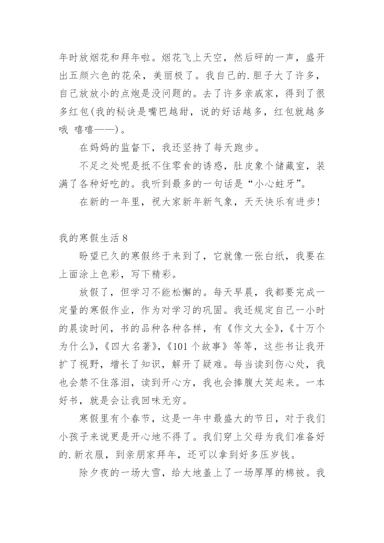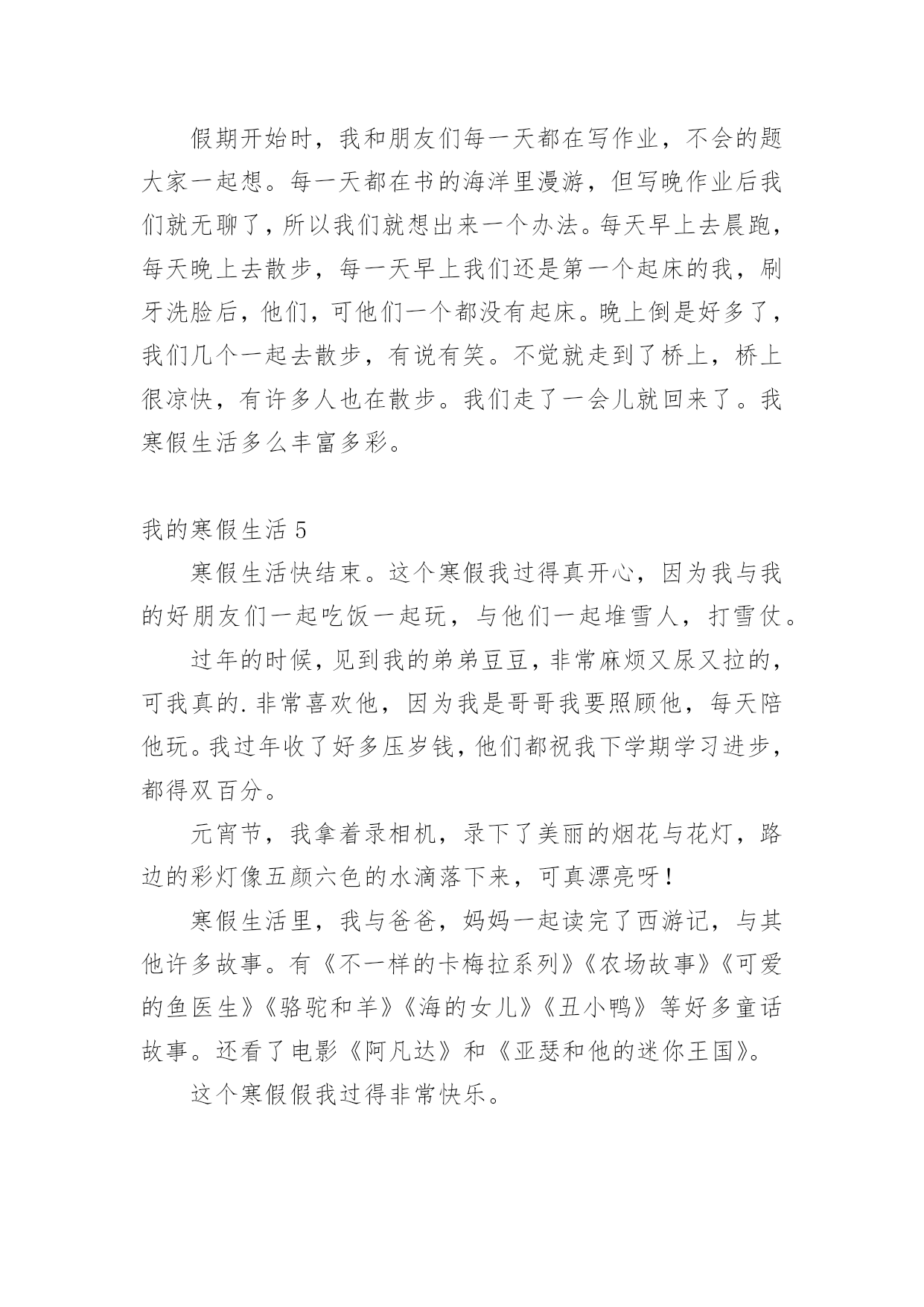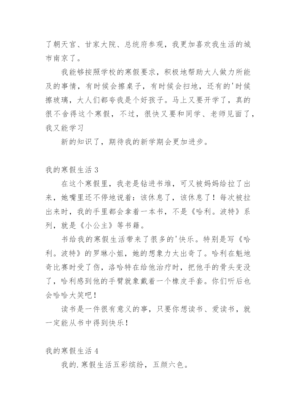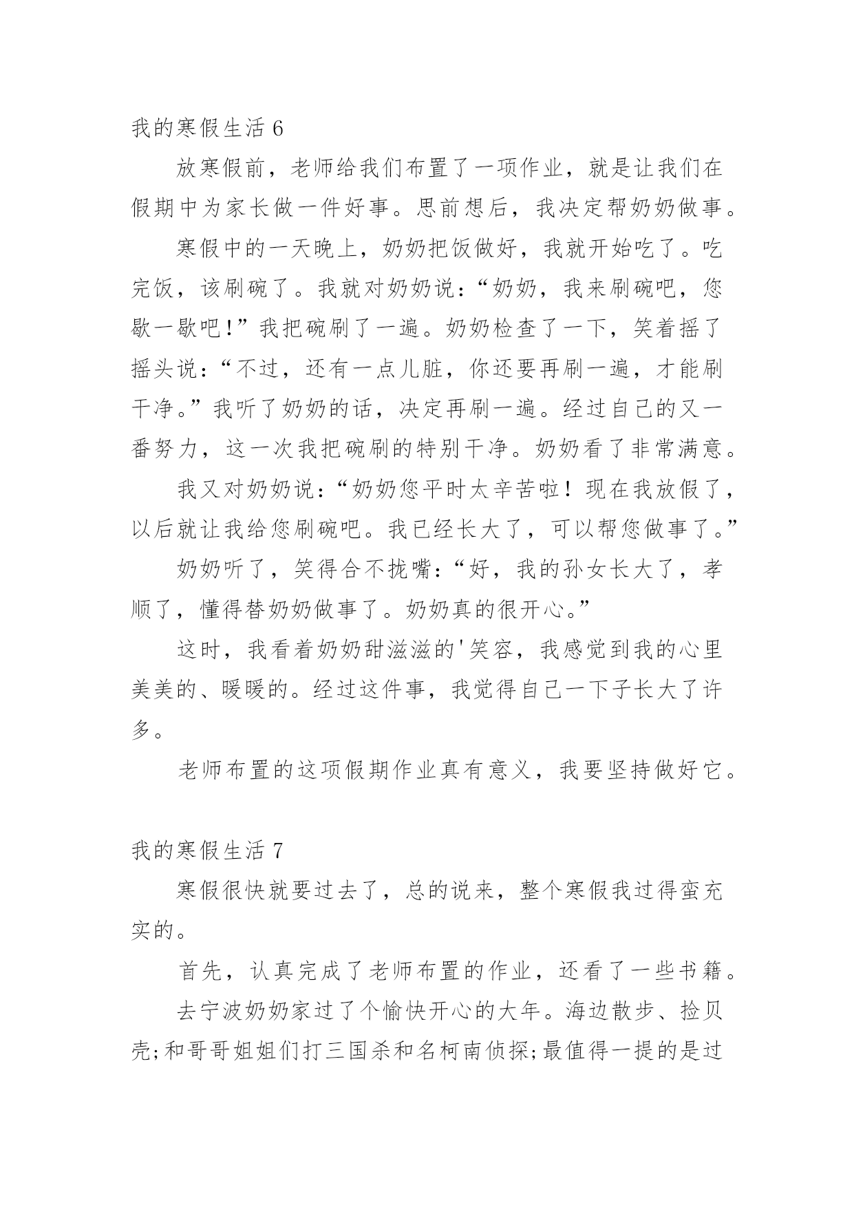 我的寒假生活我的寒假生活(精选)我的寒假生活1今天我和爸爸妈妈去了福州的三坊七巷。三坊七巷总共有三座牌坊和七条巷子所以被叫做三坊七巷。今天三坊七巷里人山人海。街道的两边各有一排整整齐齐的树木,树木的后面有一间间古色古香的商店。商店里摆着各种各样的商品。妈妈最喜欢打扮所以她去逛了卖丝巾的商店。爸爸是个吃货,所以他最喜欢逛卖小吃的商店。我也跟着爸爸妈妈逛了一家又一家的商店。后来我在一家店里看见了一面很漂亮的.小镜子,我好喜欢就让爸爸给我买,刚开始爸爸没同意,后来经过我多次的要求爸爸终于同意给我买了那面镜子。我太高兴了!我的寒假生活220xx年的寒假,是我成为一个小学生以来的第一个寒假。虽然我放假了,可是爸爸妈妈却还要辛苦地工作,于是我就轮流在爷爷奶奶、外公外婆家住着。我每天都要做老师布置的作业,做完后我就和外公外婆去户外活动,我们打羽毛球,爬紫金山,游玄武湖,去梅花山。我更期待双休日的时候爸爸妈妈能带我一起玩,我们去了朝天宫、甘家大院、总统府参观,我更加喜欢我生活的城市南京了。我能够按照学校的寒假要求,积极地帮助大人做力所能及的事情,有时候会擦桌子,有时候会扫地,还有的'时候擦玻璃,大人们都夸我是个好孩子。马上又要开学了,真的很不舍得这个寒假,不过,很快又要和同学、老师见面了,我又能学习新的知识了,期待我的新学期会更加进步。我的寒假生活3在这个寒假里,我老是钻进书堆,可又被妈妈给拉了出来,她嘴里还不停地说着:该休息了,该休息了!每次被拉出来时,我的手里都会拿着一本书,不是《哈利。波特》系列,就是《小公主》等书籍。书给我的寒假生活带来了很多的'快乐。特别是写《哈利。波特》的罗琳小姐,她的想象力太出奇了。哈利在魁地奇比赛时受了伤,洛哈特在给他治疗时,把他手的骨头变没了,哈利感到他的手臂就象戴着一个橡皮手套。你们听后也会哈哈大笑吧!读书是一件很有意义的事,只要你想读书、爱读书,就一定能从书中得到快乐!我的寒假生活4我的.寒假生活五彩缤纷,五颜六色。假期开始时,我和朋友们每一天都在写作业,不会的题大家一起想。每一天都在书的海洋里漫游,但写晚作业后我们就无聊了,所以我们就想出来一个办法。每天早上去晨跑,每天晚上去散步,每一天早上我们还是第一个起床的我,刷牙洗脸后,他们,可他们一个都没有起床。晚上倒是好多了,我们几个一起去散步,有说有笑。不觉就走到了桥上,桥上很凉快,有许多人也在散步。我们走了一会儿就回来了。我寒假生活多么丰富多彩。我的寒假生活5寒假生活快结束。这个寒假我过得真开心,因为我与我的好朋友们一起吃饭一起玩,与他们一起堆雪人,打雪仗。过年的时候,见到我的弟弟豆豆,非常麻烦又尿又拉的,可我真的.非常喜欢他,因为我是哥哥我要照顾他,每天陪他玩。我过年收了好多压岁钱,他们都祝我下学期学习进步,都得双百分。元宵节,我拿着录相机,录下了美丽的烟花与花灯,路边的彩灯像五颜六色的水滴落下来,可真漂亮呀!寒假生活里,我与爸爸,妈妈一起读完了西游记,与其他许多故事。有《不一样的卡梅拉系列》《农场故事》《可爱的鱼医生》《骆驼和羊》《海的女儿》《丑小鸭》等好多童话故事。还看了电影《阿凡达》和《亚瑟和他的迷你王国》。这个寒假假我过得非常快乐。我的寒假生活6放寒假前,老师给我们布置了一项作业,就是让我们在假期中为家长做一件好事。思前想后,我决定帮奶奶做事。寒假中的一天晚上,奶奶把饭做好,我就开始吃了。吃完饭,该刷碗了。我就对奶奶说:“奶奶,我来刷碗吧,您歇一歇吧!”我把碗刷了一遍。奶奶检查了一下,笑着摇了摇头说:“不过,还有一点儿脏,你还要再刷一遍,才能刷干净。”我听了奶奶的话,决定再刷一遍。经过自己的又一番努力,这一次我把碗刷的特别干净。奶奶看了非常满意。我又对奶奶说:“奶奶您平时太辛苦啦!现在我放假了,以后就让我给您刷碗吧。我已经长大了,可以帮您做事了。”奶奶听了,笑得合不拢嘴:“好,我的孙女长大了,孝顺了,懂得替奶奶做事了。奶奶真的很开心。”这时,我看着奶奶甜滋滋的'笑容,我感觉到我的心里美美的、暖暖的。经过这件事,我觉得自己一下子长大了许多。老师布置的这项假期作业真有意义,我要坚持做好它。我的寒假生活7寒假很快就要过去了,总的说来,整个寒假我过得蛮充实的。首先,认真完成了老师布置的作业,还看了一些书籍。去宁波奶奶家过了个愉快开心的大年。海边散步、捡贝壳;和哥哥姐姐们打三国杀和名柯南侦探;最值得一提的是过年时放烟花和拜年啦。烟花飞上天空,然后砰的一声,盛开出五颜六色的花朵,美丽极了。我自己的.胆子大了许多,自己放放小的点炮是没问题的。去了许多亲戚家,得到了很多红包(我的秘诀是嘴巴越甜,说的好话越多,红包就越多哦嘻嘻——)。在妈妈的监督下,我还坚持了每天跑步。不足之处呢是抵不住零食的诱惑,肚皮象个储藏室,装满了各种好吃的。我听到最多的一句话是“小心蛀