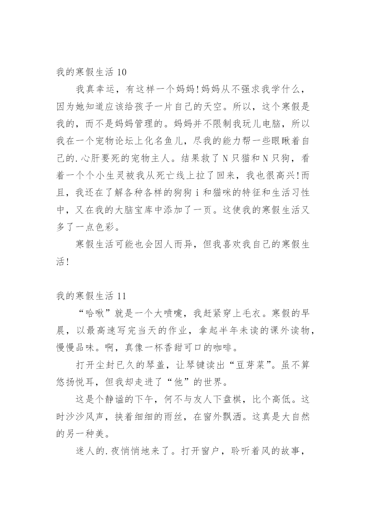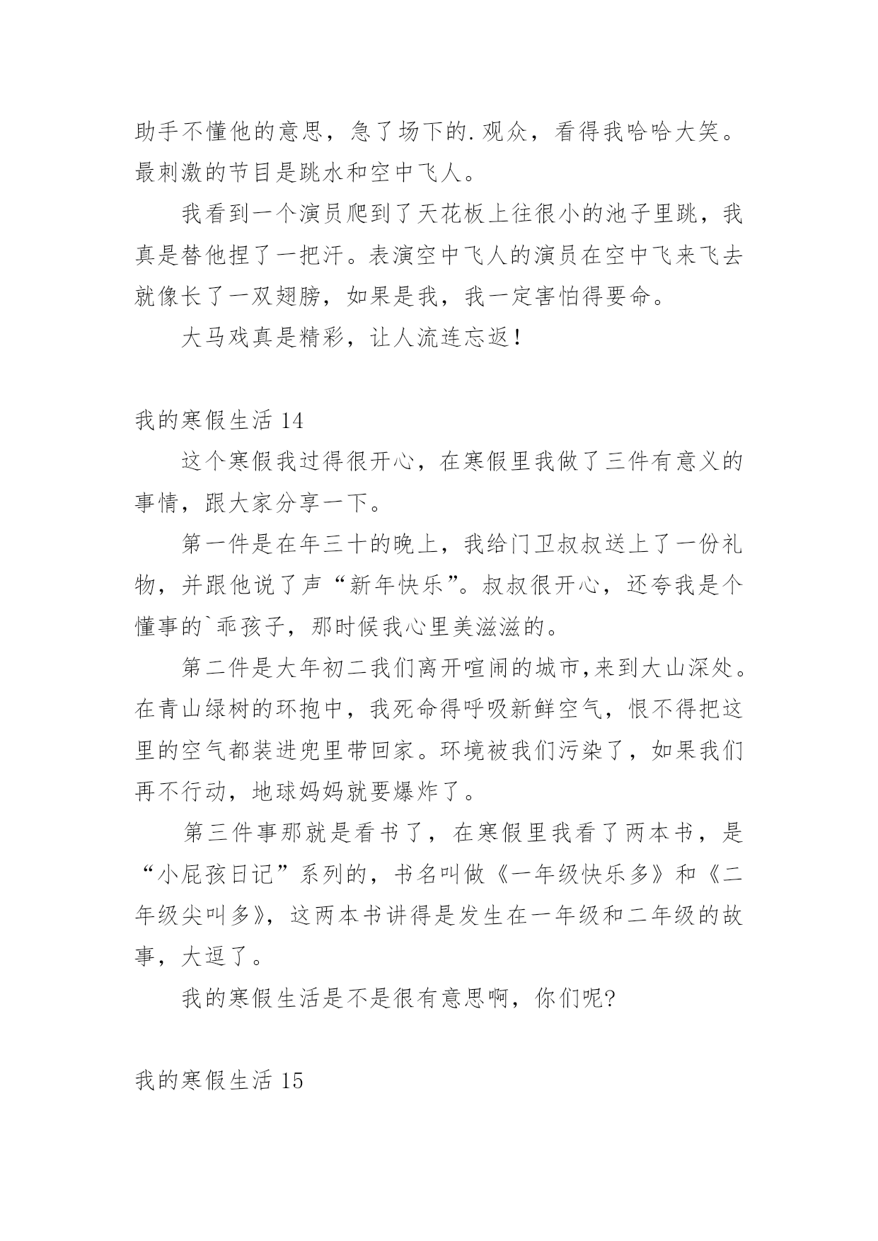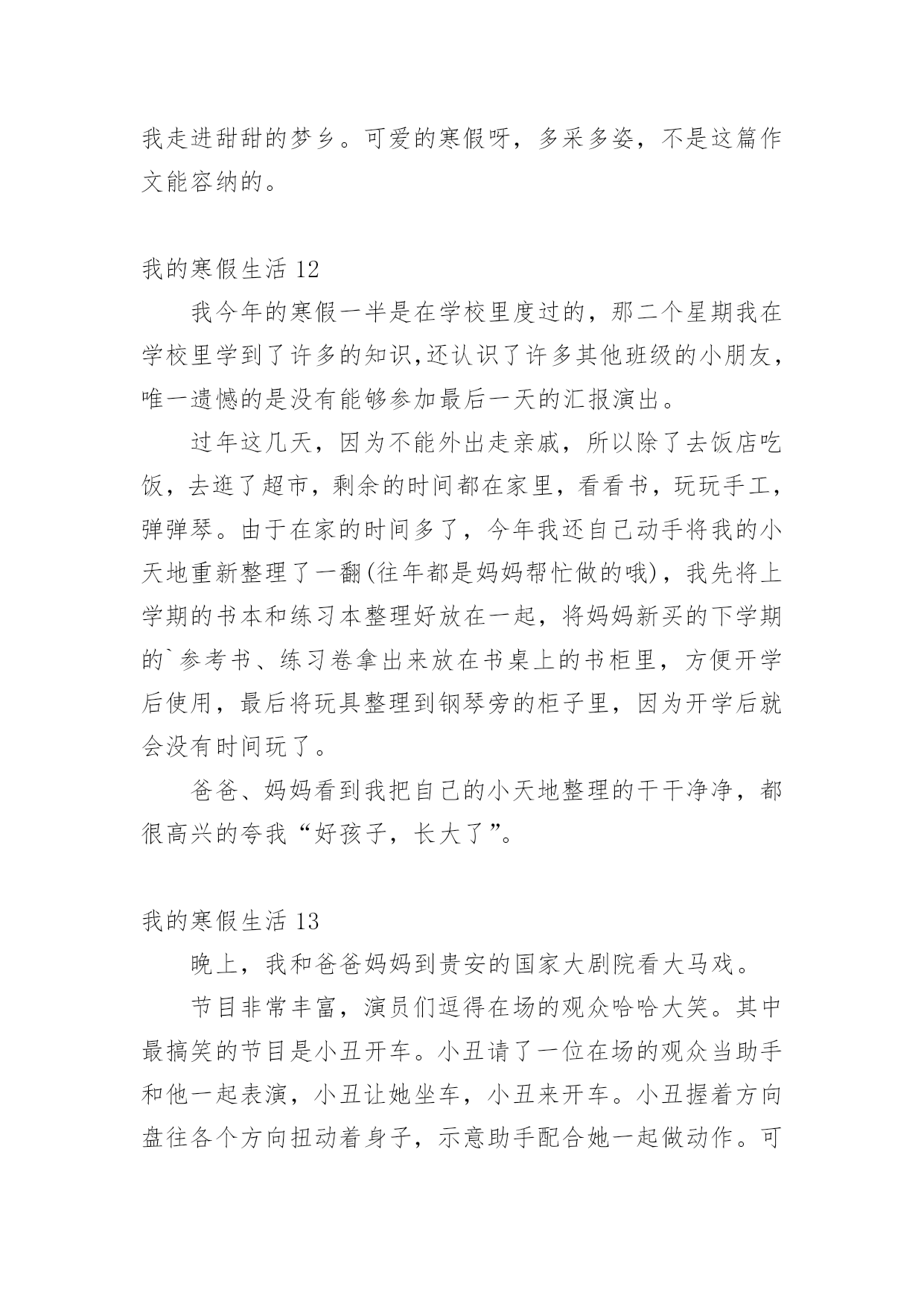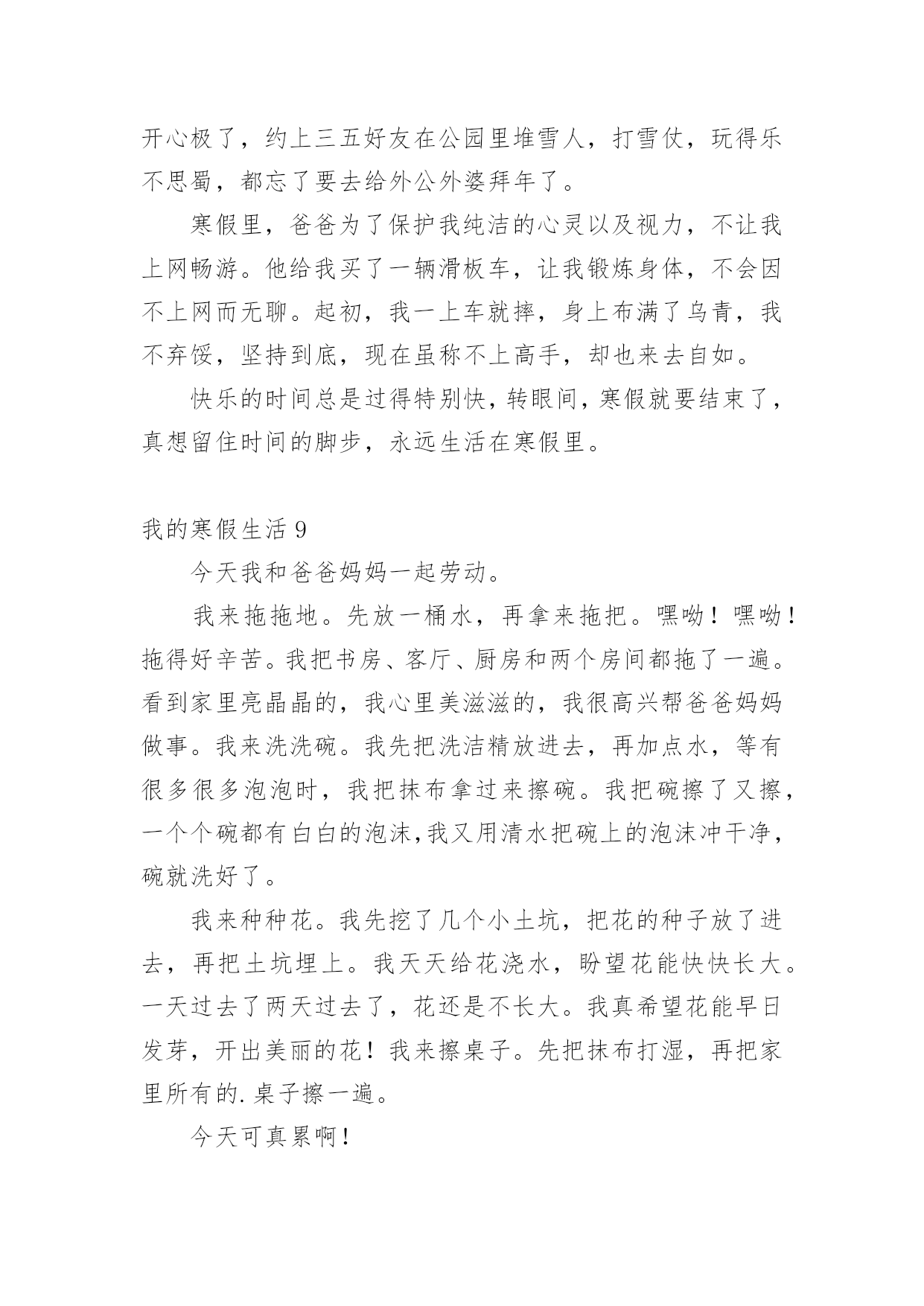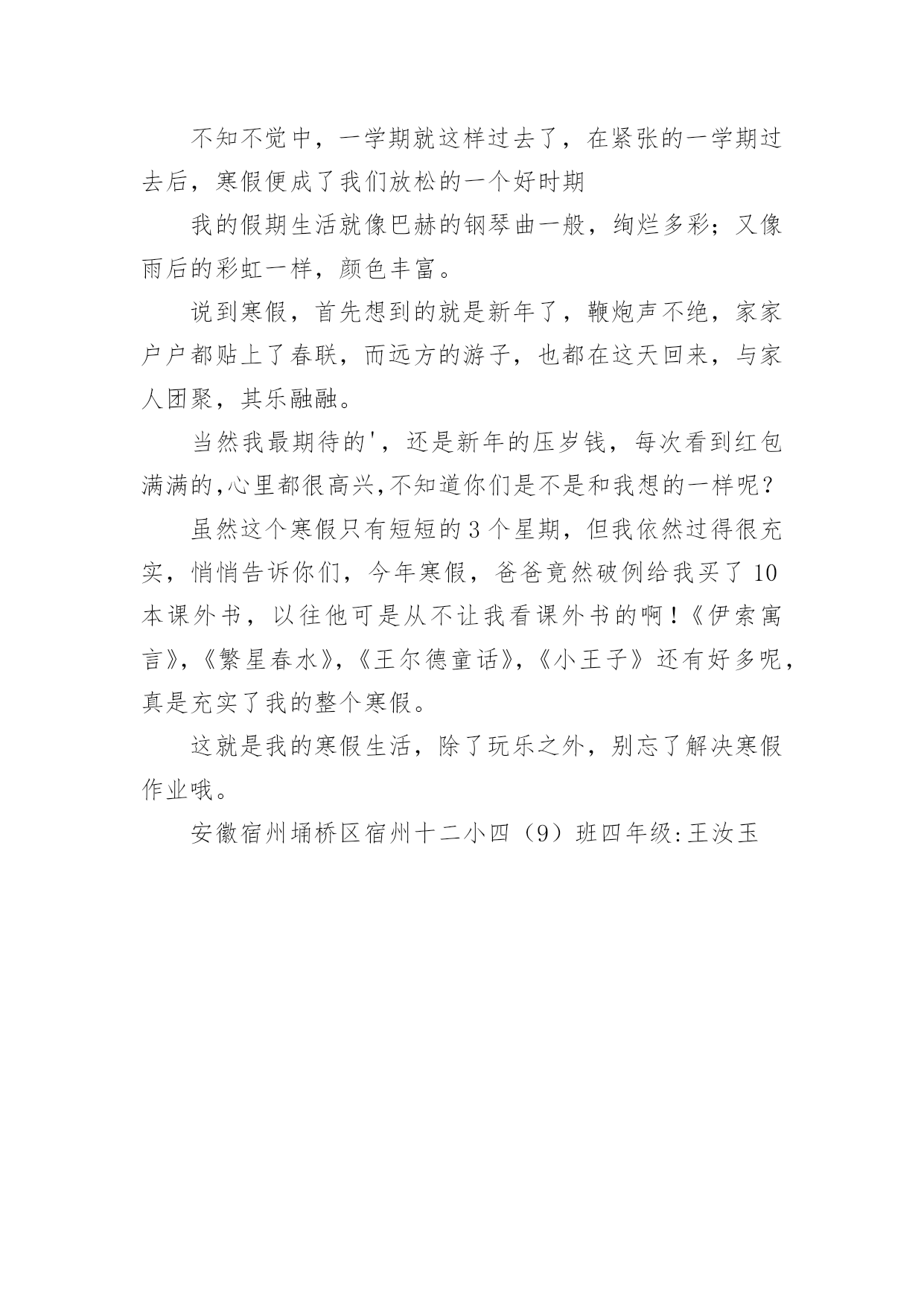 我的寒假生活我的寒假生活(精选)我的寒假生活1今天我和爸爸妈妈去了福州的三坊七巷。三坊七巷总共有三座牌坊和七条巷子所以被叫做三坊七巷。今天三坊七巷里人山人海。街道的两边各有一排整整齐齐的树木,树木的后面有一间间古色古香的商店。商店里摆着各种各样的商品。妈妈最喜欢打扮所以她去逛了卖丝巾的商店。爸爸是个吃货,所以他最喜欢逛卖小吃的商店。我也跟着爸爸妈妈逛了一家又一家的商店。后来我在一家店里看见了一面很漂亮的.小镜子,我好喜欢就让爸爸给我买,刚开始爸爸没同意,后来经过我多次的要求爸爸终于同意给我买了那面镜子。我太高兴了!我的寒假生活220xx年的寒假,是我成为一个小学生以来的第一个寒假。虽然我放假了,可是爸爸妈妈却还要辛苦地工作,于是我就轮流在爷爷奶奶、外公外婆家住着。我每天都要做老师布置的作业,做完后我就和外公外婆去户外活动,我们打羽毛球,爬紫金山,游玄武湖,去梅花山。我更期待双休日的时候爸爸妈妈能带我一起玩,我们去了朝天宫、甘家大院、总统府参观,我更加喜欢我生活的城市南京了。我能够按照学校的寒假要求,积极地帮助大人做力所能及的事情,有时候会擦桌子,有时候会扫地,还有的'时候擦玻璃,大人们都夸我是个好孩子。马上又要开学了,真的很不舍得这个寒假,不过,很快又要和同学、老师见面了,我又能学习新的知识了,期待我的新学期会更加进步。我的寒假生活3在这个寒假里,我老是钻进书堆,可又被妈妈给拉了出来,她嘴里还不停地说着:该休息了,该休息了!每次被拉出来时,我的手里都会拿着一本书,不是《哈利。波特》系列,就是《小公主》等书籍。书给我的寒假生活带来了很多的'快乐。特别是写《哈利。波特》的罗琳小姐,她的想象力太出奇了。哈利在魁地奇比赛时受了伤,洛哈特在给他治疗时,把他手的骨头变没了,哈利感到他的手臂就象戴着一个橡皮手套。你们听后也会哈哈大笑吧!读书是一件很有意义的事,只要你想读书、爱读书,就一定能从书中得到快乐!我的寒假生活4我的.寒假生活五彩缤纷,五颜六色。假期开始时,我和朋友们每一天都在写作业,不会的题大家一起想。每一天都在书的海洋里漫游,但写晚作业后我们就无聊了,所以我们就想出来一个办法。每天早上去晨跑,每天晚上去散步,每一天早上我们还是第一个起床的我,刷牙洗脸后,他们,可他们一个都没有起床。晚上倒是好多了,我们几个一起去散步,有说有笑。不觉就走到了桥上,桥上很凉快,有许多人也在散步。我们走了一会儿就回来了。我寒假生活多么丰富多彩。我的寒假生活5寒假生活快结束。这个寒假我过得真开心,因为我与我的好朋友们一起吃饭一起玩,与他们一起堆雪人,打雪仗。过年的时候,见到我的弟弟豆豆,非常麻烦又尿又拉的,可我真的.非常喜欢他,因为我是哥哥我要照顾他,每天陪他玩。我过年收了好多压岁钱,他们都祝我下学期学习进步,都得双百分。元宵节,我拿着录相机,录下了美丽的烟花与花灯,路边的彩灯像五颜六色的水滴落下来,可真漂亮呀!寒假生活里,我与爸爸,妈妈一起读完了西游记,与其他许多故事。有《不一样的卡梅拉系列》《农场故事》《可爱的鱼医生》《骆驼和羊》《海的女儿》《丑小鸭》等好多童话故事。还看了电影《阿凡达》和《亚瑟和他的迷你王国》。这个寒假假我过得非常快乐。我的寒假生活6放寒假前,老师给我们布置了一项作业,就是让我们在假期中为家长做一件好事。思前想后,我决定帮奶奶做事。寒假中的一天晚上,奶奶把饭做好,我就开始吃了。吃完饭,该刷碗了。我就对奶奶说:“奶奶,我来刷碗吧,您歇一歇吧!”我把碗刷了一遍。奶奶检查了一下,笑着摇了摇头说:“不过,还有一点儿脏,你还要再刷一遍,才能刷干净。”我听了奶奶的话,决定再刷一遍。经过自己的又一番努力,这一次我把碗刷的特别干净。奶奶看了非常满意。我又对奶奶说:“奶奶您平时太辛苦啦!现在我放假了,以后就让我给您刷碗吧。我已经长大了,可以帮您做事了。”奶奶听了,笑得合不拢嘴:“好,我的孙女长大了,孝顺了,懂得替奶奶做事了。奶奶真的很开心。”这时,我看着奶奶甜滋滋的'笑容,我感觉到我的心里美美的、暖暖的。经过这件事,我觉得自己一下子长大了许多。老师布置的这项假期作业真有意义,我要坚持做好它。我的寒假生活7寒假很快就要过去了,总的说来,整个寒假我过得蛮充实的。首先,认真完成了老师布置的作业,还看了一些书籍。去宁波奶奶家过了个愉快开心的大年。海边散步、捡贝壳;和哥哥姐姐们打三国杀和名柯南侦探;最值得一提的是过年时放烟花和拜年啦。烟花飞上天空,然后砰的一声,盛开出五颜六色的花朵,美丽极了。我自己的.胆子大了许多,自己放放小的点炮是没问题的。去了许多亲戚家,得到了很多红包(我的秘诀是嘴巴越甜,说的好话越多,红包就越多哦嘻嘻——)。在妈妈的监督下,我还坚持了每天跑步。不足之处呢是抵不住零食的诱惑,肚皮象个储藏室,装满了各种好吃的。我听到最多的一句话是“小心蛀