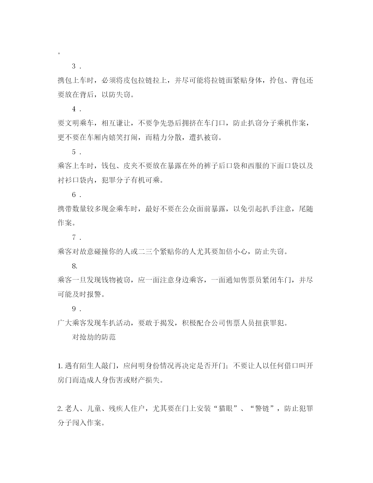 公共场所安全小常识车辆防盗1.自行车、助动车和机动车,要慎重选择停放点,应停放在有专人看管的停车处。2.夜晚应将车停放在专门的车棚和车库内,没有车棚、车库的要落实其它防范措施.3.养成离车上锁带走钥匙的习惯。4.非机动车停放后要带走车上的悬挂物品,以防失窃。5.保证锁具完好,有条件的可在车辆上安装防盗装置或小型报警器。对扒窃的防范1.钱款如要随身携带,应将钱款和其他物品混杂放置在包袋内,并将其挂在身前。2.携带现金较多时,应分散放置,并记住现款特征,以便必要时能及时辩认。3.不要在公共场所翻弄钱款,不要将钱款放在外衣口袋和裤子的插袋里。4.随身携带钱款应放在尽量不被他人看见和摸到的位置。5.乘坐公交车,把暂不使用的钱款放在内衣口袋或包袋内,扣好钮扣和拉链等。反扒防窃小常识1.外出游玩或在商店挑选商品时,做到物不离视线,包不离手,更不要随意委托他人代看所携物品。2.在乘座公交汽车时,应避免携带贵重物品,马甲袋、时装袋内不要放置贵重物品。3.携包上车时,必须将皮包拉链拉上,并尽可能将拉链面紧贴身体,拎包、背包还要放在背后,以防失窃。4.要文明乘车,相互谦让,不要争先恐后拥挤在车门口,防止扒窃分子乘机作案,更不要在车厢内嬉笑打闹,而精力分散,遭扒被窃。5.乘客上车时,钱包、皮夹不要放在暴露在外的裤子后口袋和西服的下面口袋以及衬衫口袋内,犯罪分子有机可乘。6.携带数量较多现金乘车时,最好不要在公众面前暴露,以免引起扒手注意,尾随作案。7.乘客对故意碰撞你的人或二三个紧贴你的人尤其要加倍小心,防止失窃。8.乘客一旦发现钱物被窃,应一面注意身边乘客,一面通知售票员紧闭车门,并尽可能及时报警。9.广大乘客发现车扒活动,要敢于揭发,积极配合公司售票人员扭获罪犯。对抢劫的防范1.遇有陌生人敲门,应问明身份情况再决定是否开门;不要让人以任何借口叫开房门而造成人身伤害或财产损失。2.老人、儿童、残疾人住户,尤其要在门上安装“猫眼”、“警链”,防止犯罪分子闯入作案。3.外出旅行时,不要让人知道您携有巨款或贵重物品等,以防不测。4.男女谈恋爱,不要在深夜或在地处偏僻路段滞留,以免遭抢劫、污辱。5.到银行等机构存取较大数额的钱款时,要有人陪护,以防抢劫。