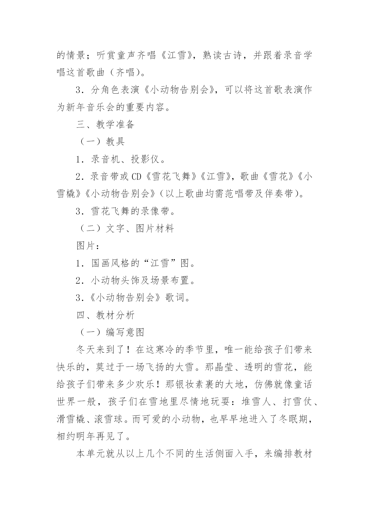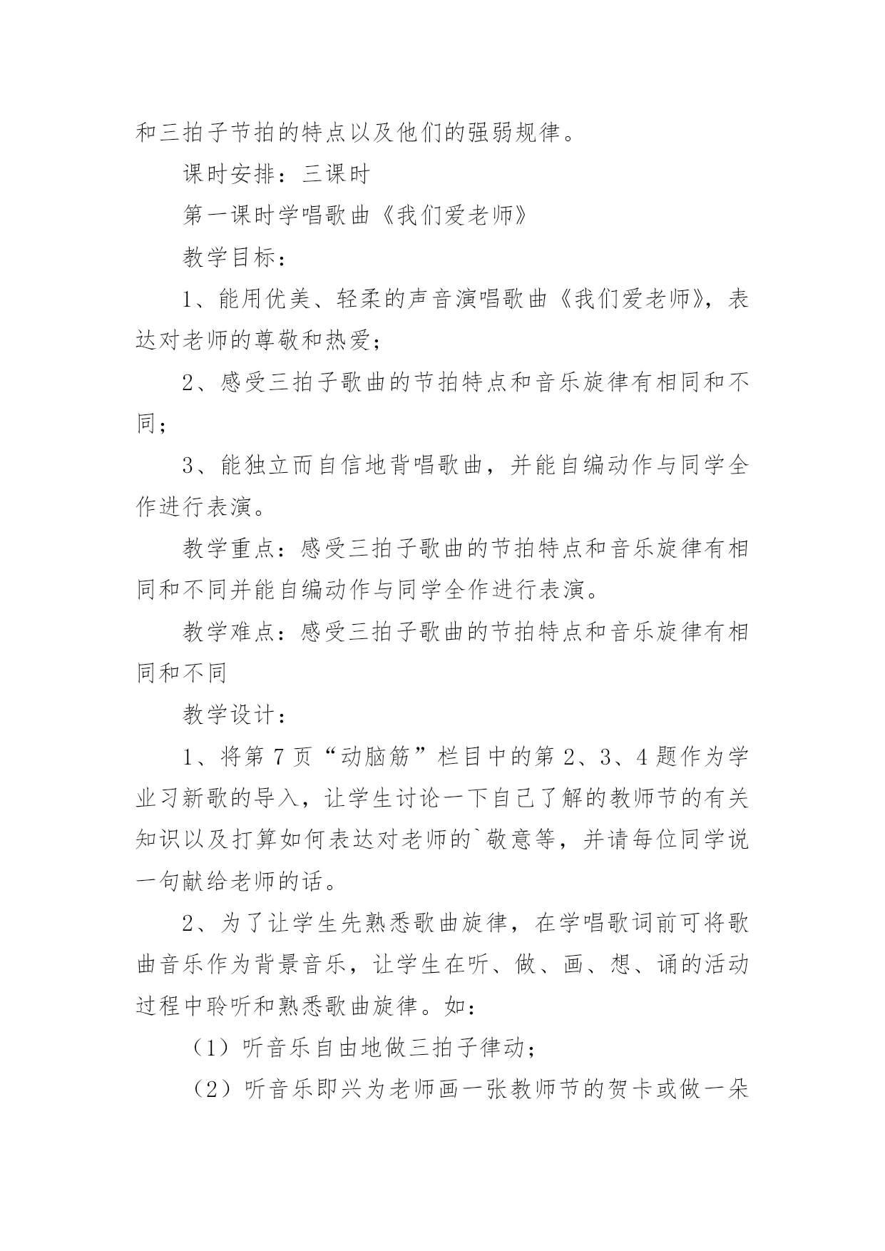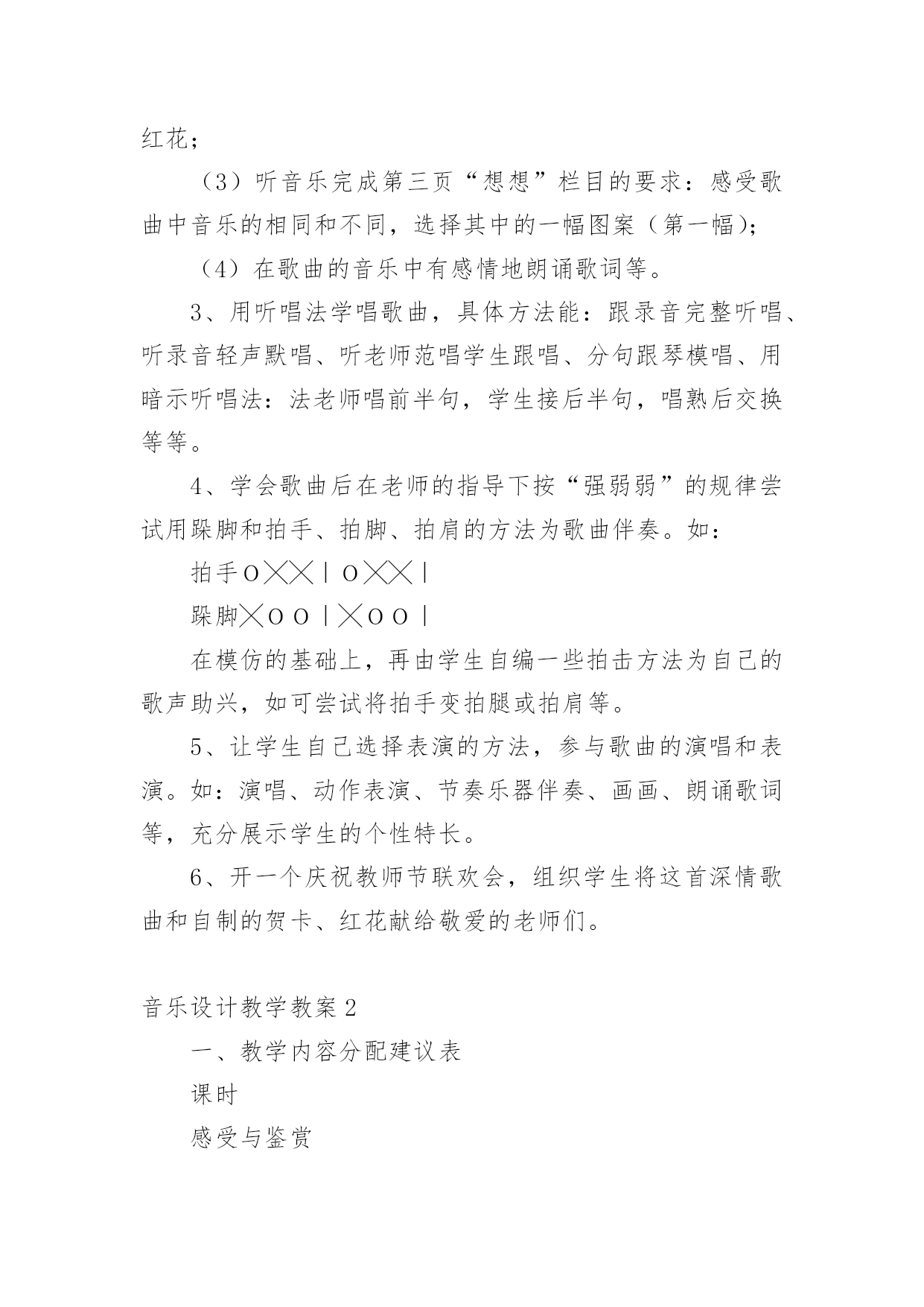 音乐设计教学教案(荐)音乐设计教学教案15篇作为一无名无私奉献的教育工作者,时常需要用到教学设计,教学设计是实现教学目标的计划性和决策性活动。我们应该怎么写教学设计呢?下面是小编收集整理的音乐设计教学教案,供大家参考借鉴,希望可以帮助到有需要的朋友。音乐设计教学教案1教学目标:1、对学生进行爱师爱校教育,要求学生在教师节即将来临之际,以实际行动为学校做一件好事,为老师献一份爱心。2、能用优美、轻柔的声音演唱歌曲《我们爱老师》,表达对老师的尊敬和热爱;感受三拍子歌曲的节拍特点和音乐旋律有相同和不同;能独立而自信地背唱歌曲,并能自编动作与同学全作进行表演。3、通过歌曲《我们的学校亚克西》的学习,感受新疆歌曲的节奏风格;学会根据简单的新疆舞步编创歌曲的动作;学会自选打击乐器参与歌曲的伴奏活动。4、从学生的生活入手,通过他们对喊劳动号子中的“嘿哟!”和“嘿哟嗬!”两种节拍的感受,“体验和表现二拍子和三拍子节拍的特点以及他们的强弱规律。课时安排:三课时第一课时学唱歌曲《我们爱老师》教学目标:1、能用优美、轻柔的声音演唱歌曲《我们爱老师》,表达对老师的尊敬和热爱;2、感受三拍子歌曲的节拍特点和音乐旋律有相同和不同;3、能独立而自信地背唱歌曲,并能自编动作与同学全作进行表演。教学重点:感受三拍子歌曲的节拍特点和音乐旋律有相同和不同并能自编动作与同学全作进行表演。教学难点:感受三拍子歌曲的节拍特点和音乐旋律有相同和不同教学设计:1、将“动脑筋”栏目中的第2、3、4题作为学业习新歌的导入,让学生讨论一下自己了解的教师节的有关知识以及打算如何表达对老师的`敬意等,并请每位同学说一句献给老师的话。2、为了让学生先熟悉歌曲旋律,在学唱歌词前可将歌曲音乐作为背景音乐,让学生在听、做、画、想、诵的活动过程中聆听和熟悉歌曲旋律。如:(1)听音乐自由地做三拍子律动;(2)听音乐即兴为老师画一张教师节的贺卡或做一朵红花;(3)听音乐完成第三页“想想”栏目的要求:感受歌曲中音乐的相同和不同,选择其中的一幅图案(第一幅);(4)在歌曲的音乐中有感情地朗诵歌词等。3、用听唱法学唱歌曲,具体方法能:跟录音完整听唱、听录音轻声默唱、听老师范唱学生跟唱、分句跟琴模唱、用暗示听唱法:法老师唱前半句,学生接后半句,唱熟后交换等等。4、学会歌曲后在老师的指导下按“强弱弱”的规律尝试用跺脚和拍手、拍脚、拍肩的方法为歌曲伴奏。如:拍手O╳╳|O╳╳|跺脚╳OO|╳OO|在模仿的基础上,再由学生自编一些拍击方法为自己的歌声助兴,如可尝试将拍手变拍腿或拍肩等。5、让学生自己选择表演的方法,参与歌曲的演唱和表演。如:演唱、动作表演、节奏乐器伴奏、画画、朗诵歌词等,充分展示学生的个性特长。6、开一个庆祝教师节联欢会,组织学生将这首深情歌曲和自制的贺卡、红花献给敬爱的老师们。音乐设计教学教案2一、教学内容分配建议表课时感受与鉴赏音乐表现音乐创造音乐与相关文化第一课时《雪花飞舞》《江雪》跟着录音学唱《江雪》用动作表现雪花飞舞的情景熟读古诗第二课时唱歌《雪花》雪花的形成第三课时唱歌《小雪橇》用打击乐器编配伴奏第四课时跟着录音学唱《小动物告别会》动物冬眠的有关知识第五课时排练、表演《小动物告别会》二、教学要求(一)单元总要求1.通过演唱、听赏本单元的歌曲、乐曲,使学生了解与冬天有关的音乐作品,从不同的角度体验冬天带给我们的不同感受;继续引导和激发学生学习音乐的兴趣;在各项音乐活动中培养开朗、大方的性格和勇于实践的精神。3.完整地表演《小动物告别会》。(二)具体要求1.学会歌曲《雪花》和《小雪橇》?了解雪花的形成。2.听赏《雪花飞舞》,随着音乐,用动作表现雪花飞舞的情景;听赏童声齐唱《江雪》,熟读古诗,并跟着录音学唱这首歌曲(齐唱)。3.分角色表演《小动物告别会》,可以将这首歌表演作为新年音乐会的重要内容。三、教学准备(一)教具1.录音机、投影仪。2.录音带或CD《雪花飞舞》《江雪》,歌曲《雪花》《小雪橇》《小动物告别会》(以上歌曲均需范唱带及伴奏带)。3.雪花飞舞的录像带。(二)文字、图片材料图片:1.国画风格的“江雪”图。2.小动物头饰及场景布置。3.《小动物告别会》歌词。四、教材分析(一)编写意图冬天来到了!在这寒冷的季节里,唯一能给孩子们带来快乐的,莫过于一场飞扬的大雪。那晶莹、透明的雪花,能给孩子们带来多少欢乐!那银妆素裹的大地,仿佛就像童话世界一般,孩子们在雪地里尽情地玩耍:堆雪人、打雪仗、滑雪橇、滚雪球。而可爱的小动物,也早早地进入了冬眠期,相约明年再见了。本单元就从以上几个不同的生活侧面入手,来编排教材内容。学唱歌曲《雪花》,表达了孩子们对自然现象的探究心理;《小雪橇》表达了孩子们快乐的天性;听赏乐曲《雪花飞舞》则与《小雪橇》快乐的情绪有所不同,乐曲带有一丝淡淡的忧伤;歌曲《江雪