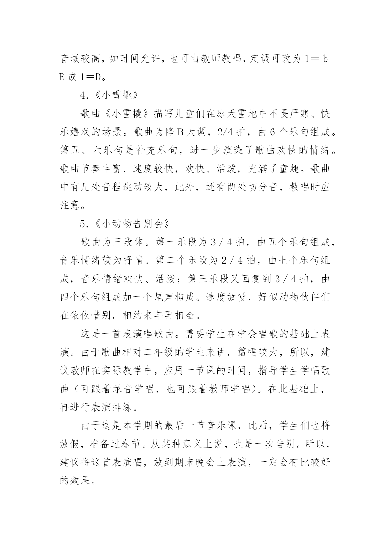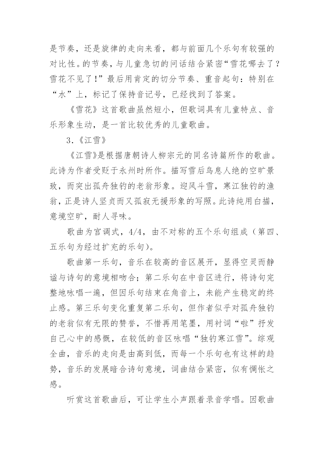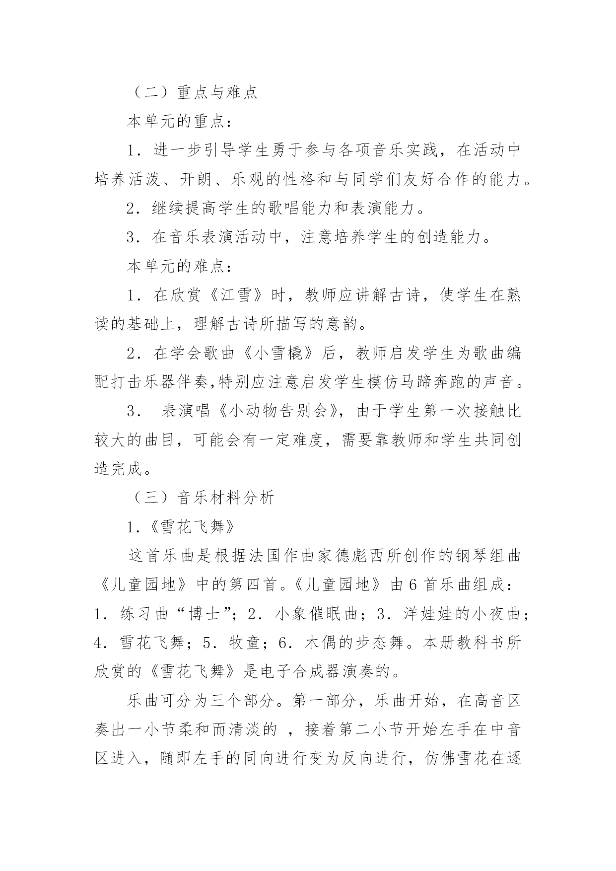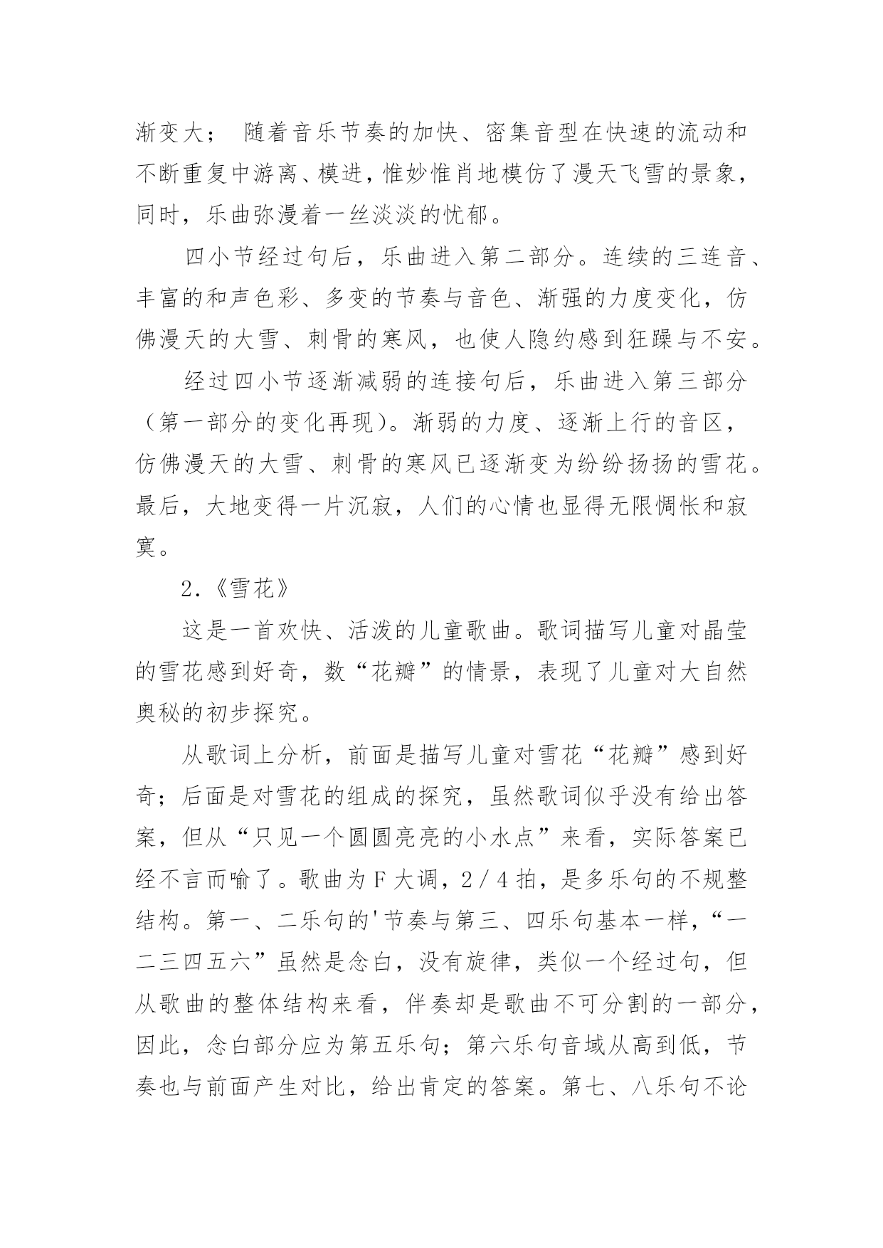 音乐设计教学教案(荐)音乐设计教学教案15篇作为一无名无私奉献的教育工作者,时常需要用到教学设计,教学设计是实现教学目标的计划性和决策性活动。我们应该怎么写教学设计呢?下面是小编收集整理的音乐设计教学教案,供大家参考借鉴,希望可以帮助到有需要的朋友。音乐设计教学教案1教学目标:1、对学生进行爱师爱校教育,要求学生在教师节即将来临之际,以实际行动为学校做一件好事,为老师献一份爱心。2、能用优美、轻柔的声音演唱歌曲《我们爱老师》,表达对老师的尊敬和热爱;感受三拍子歌曲的节拍特点和音乐旋律有相同和不同;能独立而自信地背唱歌曲,并能自编动作与同学全作进行表演。3、通过歌曲《我们的学校亚克西》的学习,感受新疆歌曲的节奏风格;学会根据简单的新疆舞步编创歌曲的动作;学会自选打击乐器参与歌曲的伴奏活动。4、从学生的生活入手,通过他们对喊劳动号子中的“嘿哟!”和“嘿哟嗬!”两种节拍的感受,“体验和表现二拍子和三拍子节拍的特点以及他们的强弱规律。课时安排:三课时第一课时学唱歌曲《我们爱老师》教学目标:1、能用优美、轻柔的声音演唱歌曲《我们爱老师》,表达对老师的尊敬和热爱;2、感受三拍子歌曲的节拍特点和音乐旋律有相同和不同;3、能独立而自信地背唱歌曲,并能自编动作与同学全作进行表演。教学重点:感受三拍子歌曲的节拍特点和音乐旋律有相同和不同并能自编动作与同学全作进行表演。教学难点:感受三拍子歌曲的节拍特点和音乐旋律有相同和不同教学设计:1、将“动脑筋”栏目中的第2、3、4题作为学业习新歌的导入,让学生讨论一下自己了解的教师节的有关知识以及打算如何表达对老师的`敬意等,并请每位同学说一句献给老师的话。2、为了让学生先熟悉歌曲旋律,在学唱歌词前可将歌曲音乐作为背景音乐,让学生在听、做、画、想、诵的活动过程中聆听和熟悉歌曲旋律。如:(1)听音乐自由地做三拍子律动;(2)听音乐即兴为老师画一张教师节的贺卡或做一朵红花;(3)听音乐完成第三页“想想”栏目的要求:感受歌曲中音乐的相同和不同,选择其中的一幅图案(第一幅);(4)在歌曲的音乐中有感情地朗诵歌词等。3、用听唱法学唱歌曲,具体方法能:跟录音完整听唱、听录音轻声默唱、听老师范唱学生跟唱、分句跟琴模唱、用暗示听唱法:法老师唱前半句,学生接后半句,唱熟后交换等等。4、学会歌曲后在老师的指导下按“强弱弱”的规律尝试用跺脚和拍手、拍脚、拍肩的方法为歌曲伴奏。如:拍手O╳╳|O╳╳|跺脚╳OO|╳OO|在模仿的基础上,再由学生自编一些拍击方法为自己的歌声助兴,如可尝试将拍手变拍腿或拍肩等。5、让学生自己选择表演的方法,参与歌曲的演唱和表演。如:演唱、动作表演、节奏乐器伴奏、画画、朗诵歌词等,充分展示学生的个性特长。6、开一个庆祝教师节联欢会,组织学生将这首深情歌曲和自制的贺卡、红花献给敬爱的老师们。音乐设计教学教案2一、教学内容分配建议表课时感受与鉴赏音乐表现音乐创造音乐与相关文化第一课时《雪花飞舞》《江雪》跟着录音学唱《江雪》用动作表现雪花飞舞的情景熟读古诗第二课时唱歌《雪花》雪花的形成第三课时唱歌《小雪橇》用打击乐器编配伴奏第四课时跟着录音学唱《小动物告别会》动物冬眠的有关知识第五课时排练、表演《小动物告别会》二、教学要求(一)单元总要求1.通过演唱、听赏本单元的歌曲、乐曲,使学生了解与冬天有关的音乐作品,从不同的角度体验冬天带给我们的不同感受;继续引导和激发学生学习音乐的兴趣;在各项音乐活动中培养开朗、大方的性格和勇于实践的精神。3.完整地表演《小动物告别会》。(二)具体要求1.学会歌曲《雪花》和《小雪橇》?了解雪花的形成。2.听赏《雪花飞舞》,随着音乐,用动作表现雪花飞舞的情景;听赏童声齐唱《江雪》,熟读古诗,并跟着录音学唱这首歌曲(齐唱)。3.分角色表演《小动物告别会》,可以将这首歌表演作为新年音乐会的重要内容。三、教学准备(一)教具1.录音机、投影仪。2.录音带或CD《雪花飞舞》《江雪》,歌曲《雪花》《小雪橇》《小动物告别会》(以上歌曲均需范唱带及伴奏带)。3.雪花飞舞的录像带。(二)文字、图片材料图片:1.国画风格的“江雪”图。2.小动物头饰及场景布置。3.《小动物告别会》歌词。四、教材分析(一)编写意图冬天来到了!在这寒冷的季节里,唯一能给孩子们带来快乐的,莫过于一场飞扬的大雪。那晶莹、透明的雪花,能给孩子们带来多少欢乐!那银妆素裹的大地,仿佛就像童话世界一般,孩子们在雪地里尽情地玩耍:堆雪人、打雪仗、滑雪橇、滚雪球。而可爱的小动物,也早早地进入了冬眠期,相约明年再见了。本单元就从以上几个不同的生活侧面入手,来编排教材内容。学唱歌曲《雪花》,表达了孩子们对自然现象的探究心理;《小雪橇》表达了孩子们快乐的天性;听赏乐曲《雪花飞舞》则与《小雪橇》快乐的情绪有所不同,乐曲带有一丝淡淡的忧伤;歌曲《江雪