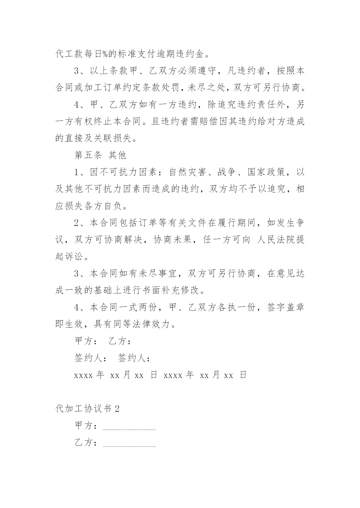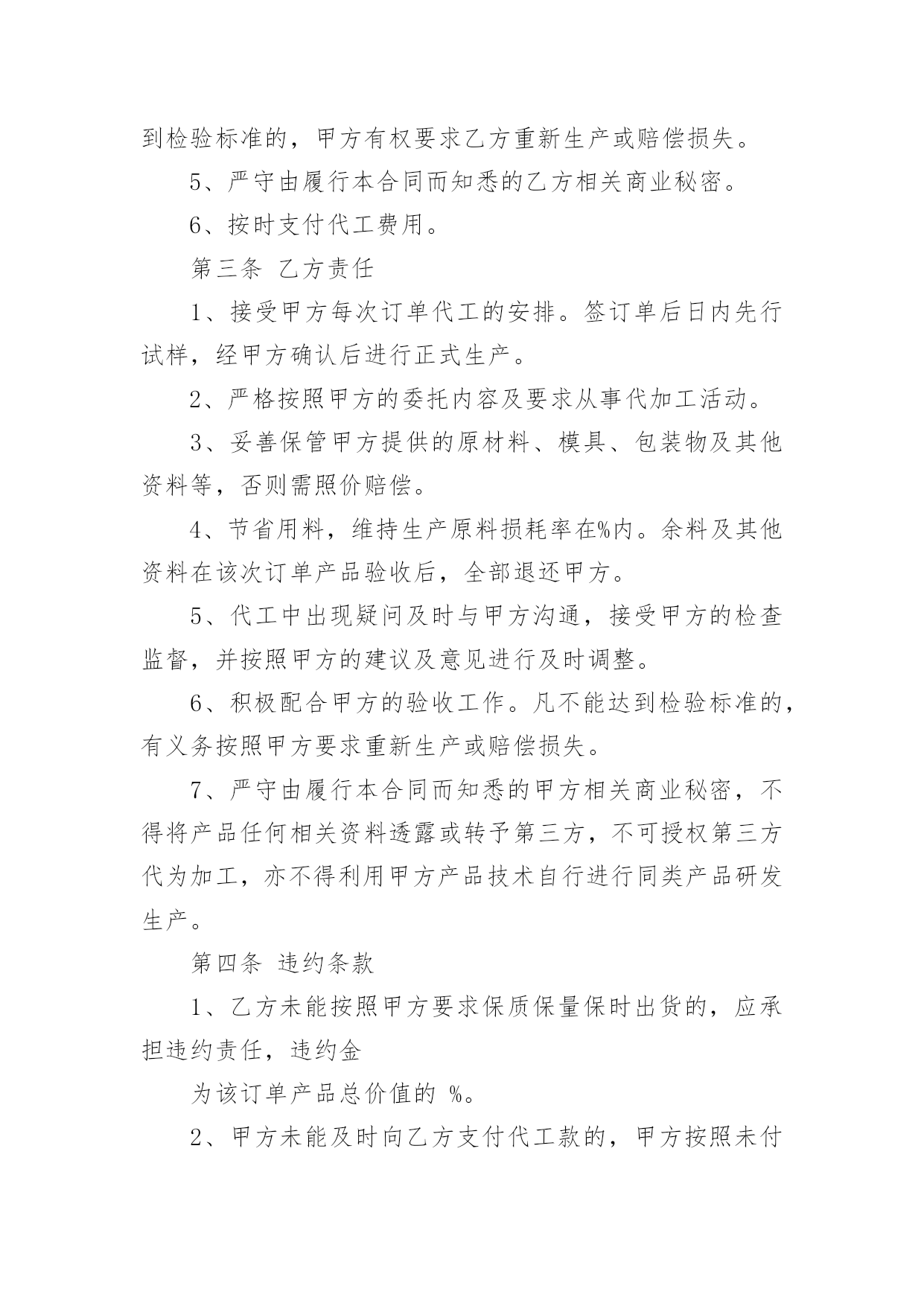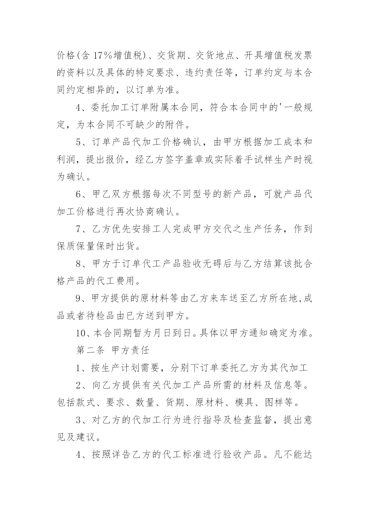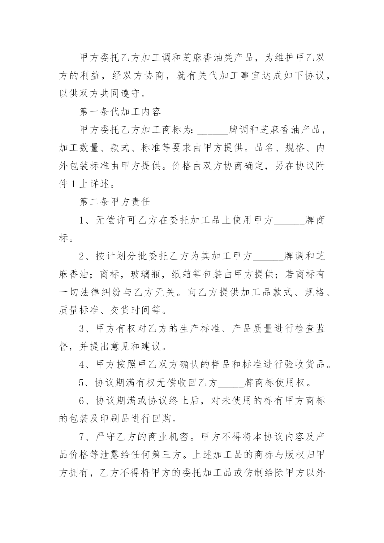 代加工协议书在快速变化和不断变革的今天,我们都跟协议有着直接或间接的联系,签订协议可以保护当事人的合法权益。想写协议却不知道该请教谁?下面是小编帮大家整理的代加工协议书,仅供参考,大家一起来看看吧。代加工协议书1委托方(甲方):xxxx受委托方(乙方):xxxxx地址:地址:负责人:负责人:联系方式:联系方式:甲方因生产安排需要,委托乙方代加工产品,乙方同意完全按照甲方要求及供料生产。双方为维护自身权益,经自愿友好协商,就本代加工事宜达成如下协议,以便共同遵守。第一条代加工细则1、甲方委托乙方为其代加工产品,加工产品款式品种、标准要求、质量数量、交货期限、原料使用等由甲方提供为准,乙方同意接受甲方委托及要求进行代工生产。2、在每次生产前,甲方开立具体的委托加工订单,其一般条款由本合同规定,补充条款在订单中说明,经双方确认签字盖章或乙方实际着手试样生产时生效。3、委托加工订单的主要内容为加工的货物名称、数量、价格(含17%增值税)、交货期、交货地点、开具增值税发票的资料以及具体的特定要求、违约责任等,订单约定与本合同约定相异的,以订单为准。4、委托加工订单附属本合同,符合本合同中的'一般规定,为本合同不可缺少的附件。5、订单产品代加工价格确认,由甲方根据加工成本和利润,提出报价,经乙方签字盖章或实际着手试样生产时视为确认。6、甲乙双方根据每次不同型号的新产品,可就产品代加工价格进行再次协商确认。7、乙方优先安排工人完成甲方交代之生产任务,作到保质保量保时出货。8、甲方于订单代工产品验收无碍后与乙方结算该批合格产品的代工费用。9、甲方提供的原材料等由乙方来车送至乙方所在地,成品或者待检品由已方送到甲方。10、本合同期暂为月日到日。具体以甲方通知确定为准。第二条甲方责任1、按生产计划需要,分别下订单委托乙方为其代加工2、向乙方提供有关代加工产品所需的材料及信息等。包括款式、要求、数量、货期、原材料、模具、图样等。3、对乙方的代加工行为进行指导及检查监督,提出意见及建议。4、按照详告乙方的代工标准进行验收产品。凡不能达到检验标准的,甲方有权要求乙方重新生产或赔偿损失。5、严守由履行本合同而知悉的乙方相关商业秘密。6、按时支付代工费用。第三条乙方责任1、接受甲方每次订单代工的安排。签订单后日内先行试样,经甲方确认后进行正式生产。2、严格按照甲方的委托内容及要求从事代加工活动。3、妥善保管甲方提供的原材料、模具、包装物及其他资料等,否则需照价赔偿。4、节省用料,维持生产原料损耗率在%内。余料及其他资料在该次订单产品验收后,全部退还甲方。5、代工中出现疑问及时与甲方沟通,接受甲方的检查监督,并按照甲方的建议及意见进行及时调整。6、积极配合甲方的验收工作。凡不能达到检验标准的,有义务按照甲方要求重新生产或赔偿损失。7、严守由履行本合同而知悉的甲方相关商业秘密,不得将产品任何相关资料透露或转予第三方,不可授权第三方代为加工,亦不得利用甲方产品技术自行进行同类产品研发生产。第四条违约条款1、乙方未能按照甲方要求保质保量保时出货的,应承担违约责任,违约金为该订单产品总价值的%。2、甲方未能及时向乙方支付代工款的,甲方按照未付代工款每日%的标准支付逾期违约金。3、以上条款甲、乙双方必须遵守,凡违约者,按照本合同或加工订单约定条款处罚,未尽之处,双方可另行协商。4、甲、乙双方如有一方违约,除追究违约责任外,另一方有权终止本合同。且违约者需赔偿因其违约给对方造成的直接及关联损失。第五条其他1、因不可抗力因素:自然灾害、战争、国家政策,以及其他不可抗力因素而造成的违约,双方均不予以追究,相应损失各方自负。2、本合同包括订单等有关文件在履行期间,如发生争议,双方可协商解决,协商未果,任一方可向人民法院提起诉讼。3、本合同如有未尽事宜,双方可另行协商,在意见达成一致的基础上进行书面补充修改。4、本合同一式两份,甲、乙双方各执一份,签字盖章即生效,具有同等法律效力。甲方:乙方:签约人:签约人:xxxx年xx月xx日xxxx年xx月xx日代加工协议书2甲方:___________乙方:___________甲方委托乙方加工调和芝麻香油类产品,为维护甲乙双方的利益,经双方协商,就有关代加工事宜达成如下协议,以供双方共同遵守。第一条代加工内容甲方委托乙方加工商标为:______牌调和芝麻香油产品,加工数量、款式、标准等要求由甲方提供。品名、规格、内外包装标准由甲方提供。价格由双方协商确定,另在协议附件1上详述。第二条甲方责任1、无偿许可乙方在委托加工品上使用甲方______牌商标。2、按计划分批委托乙方为其加工甲方______牌调和芝麻香油;商标,玻璃瓶,纸箱等包装由甲方提供;若商标有一切法律纠纷与乙方无关。向乙方提供加工品款式、规格、质量标准、交货时间等。3、甲