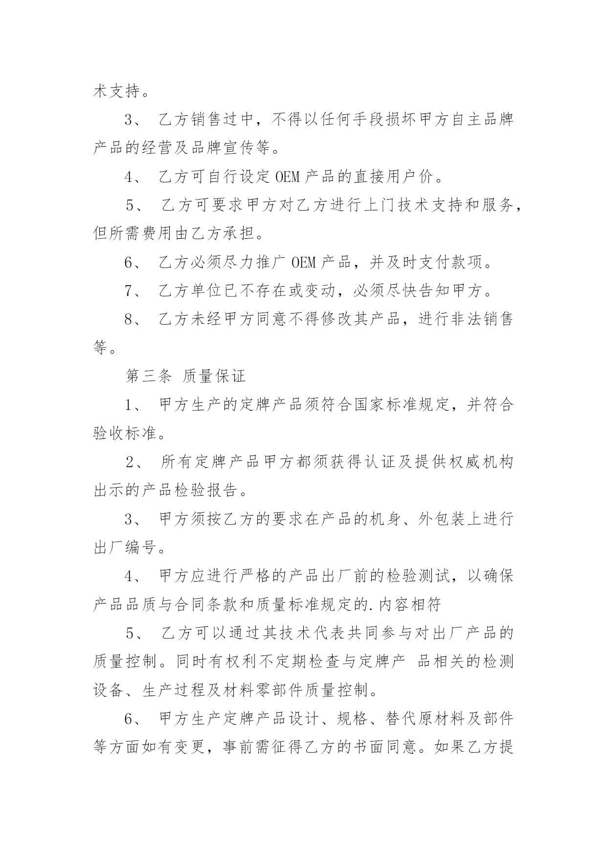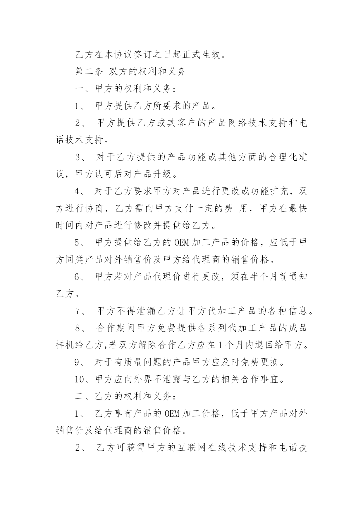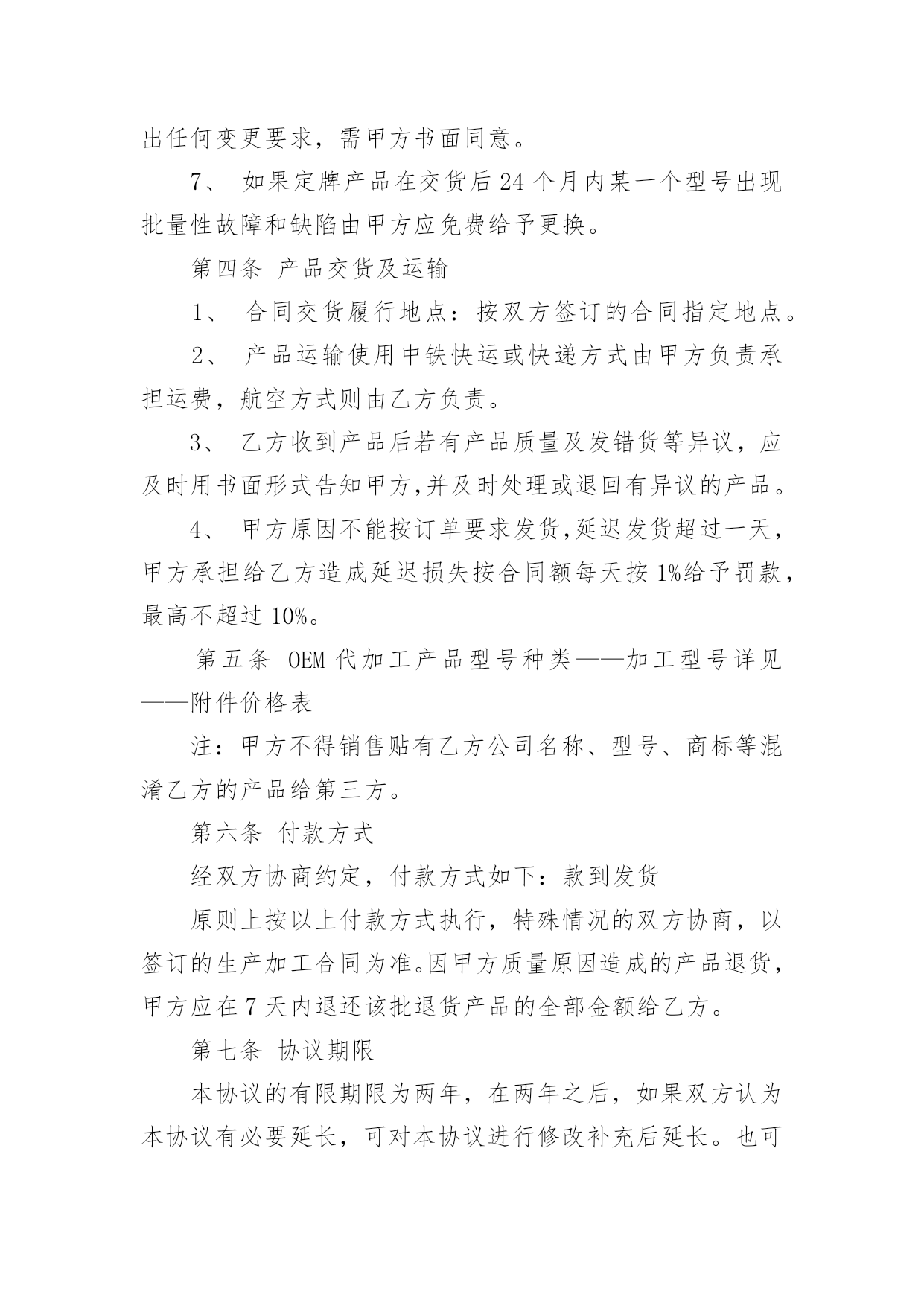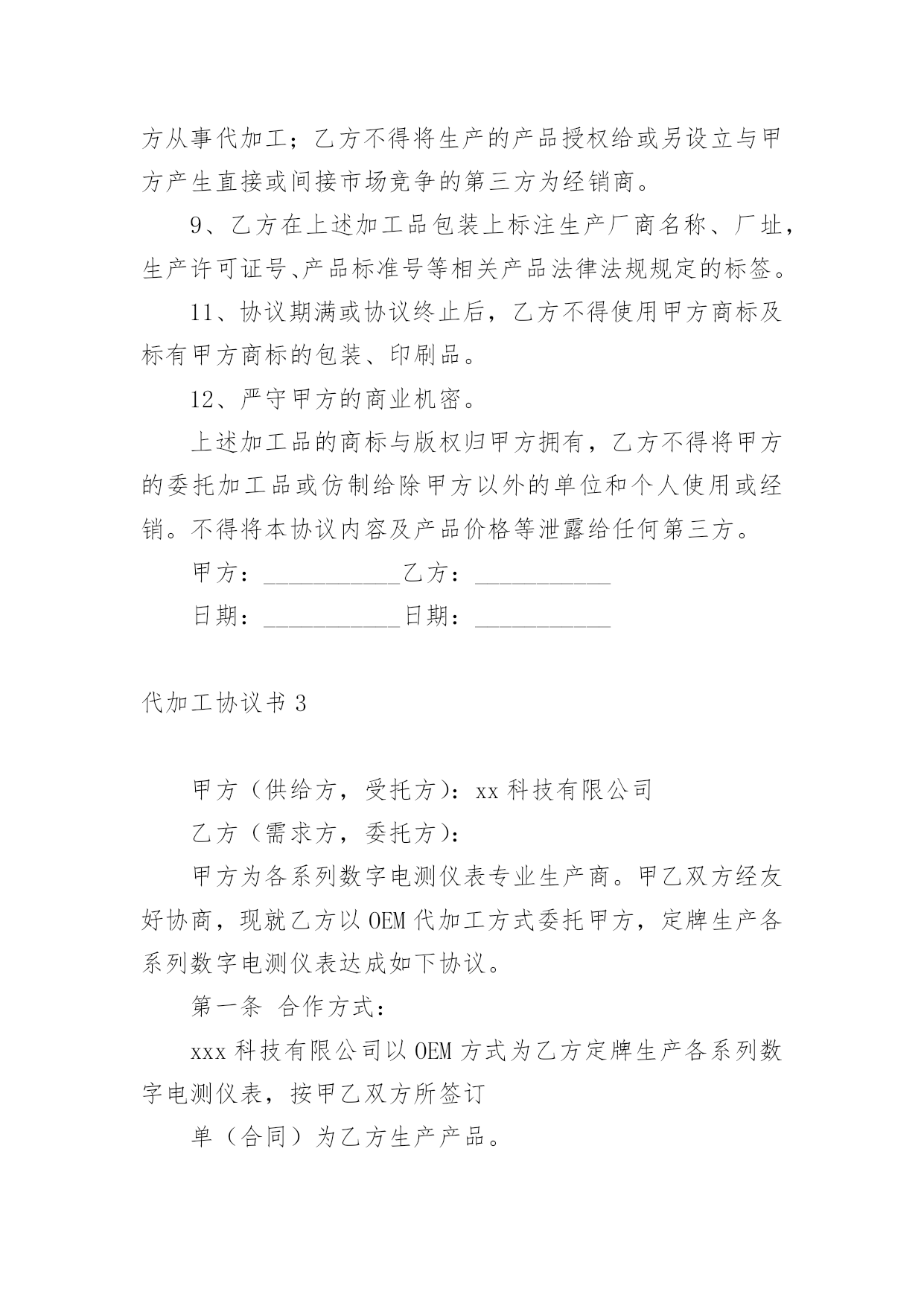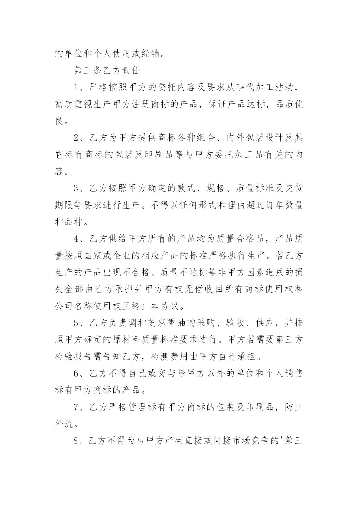代加工协议书在快速变化和不断变革的今天,我们都跟协议有着直接或间接的联系,签订协议可以保护当事人的合法权益。想写协议却不知道该请教谁?下面是小编帮大家整理的代加工协议书,仅供参考,大家一起来看看吧。代加工协议书1委托方(甲方):xxxx受委托方(乙方):xxxxx地址:地址:负责人:负责人:联系方式:联系方式:甲方因生产安排需要,委托乙方代加工产品,乙方同意完全按照甲方要求及供料生产。双方为维护自身权益,经自愿友好协商,就本代加工事宜达成如下协议,以便共同遵守。第一条代加工细则1、甲方委托乙方为其代加工产品,加工产品款式品种、标准要求、质量数量、交货期限、原料使用等由甲方提供为准,乙方同意接受甲方委托及要求进行代工生产。2、在每次生产前,甲方开立具体的委托加工订单,其一般条款由本合同规定,补充条款在订单中说明,经双方确认签字盖章或乙方实际着手试样生产时生效。3、委托加工订单的主要内容为加工的货物名称、数量、价格(含17%增值税)、交货期、交货地点、开具增值税发票的资料以及具体的特定要求、违约责任等,订单约定与本合同约定相异的,以订单为准。4、委托加工订单附属本合同,符合本合同中的'一般规定,为本合同不可缺少的附件。5、订单产品代加工价格确认,由甲方根据加工成本和利润,提出报价,经乙方签字盖章或实际着手试样生产时视为确认。6、甲乙双方根据每次不同型号的新产品,可就产品代加工价格进行再次协商确认。7、乙方优先安排工人完成甲方交代之生产任务,作到保质保量保时出货。8、甲方于订单代工产品验收无碍后与乙方结算该批合格产品的代工费用。9、甲方提供的原材料等由乙方来车送至乙方所在地,成品或者待检品由已方送到甲方。10、本合同期暂为月日到日。具体以甲方通知确定为准。第二条甲方责任1、按生产计划需要,分别下订单委托乙方为其代加工2、向乙方提供有关代加工产品所需的材料及信息等。包括款式、要求、数量、货期、原材料、模具、图样等。3、对乙方的代加工行为进行指导及检查监督,提出意见及建议。4、按照详告乙方的代工标准进行验收产品。凡不能达到检验标准的,甲方有权要求乙方重新生产或赔偿损失。5、严守由履行本合同而知悉的乙方相关商业秘密。6、按时支付代工费用。第三条乙方责任1、接受甲方每次订单代工的安排。签订单后日内先行试样,经甲方确认后进行正式生产。2、严格按照甲方的委托内容及要求从事代加工活动。3、妥善保管甲方提供的原材料、模具、包装物及其他资料等,否则需照价赔偿。4、节省用料,维持生产原料损耗率在%内。余料及其他资料在该次订单产品验收后,全部退还甲方。5、代工中出现疑问及时与甲方沟通,接受甲方的检查监督,并按照甲方的建议及意见进行及时调整。6、积极配合甲方的验收工作。凡不能达到检验标准的,有义务按照甲方要求重新生产或赔偿损失。7、严守由履行本合同而知悉的甲方相关商业秘密,不得将产品任何相关资料透露或转予第三方,不可授权第三方代为加工,亦不得利用甲方产品技术自行进行同类产品研发生产。第四条违约条款1、乙方未能按照甲方要求保质保量保时出货的,应承担违约责任,违约金为该订单产品总价值的%。2、甲方未能及时向乙方支付代工款的,甲方按照未付代工款每日%的标准支付逾期违约金。3、以上条款甲、乙双方必须遵守,凡违约者,按照本合同或加工订单约定条款处罚,未尽之处,双方可另行协商。4、甲、乙双方如有一方违约,除追究违约责任外,另一方有权终止本合同。且违约者需赔偿因其违约给对方造成的直接及关联损失。第五条其他1、因不可抗力因素:自然灾害、战争、国家政策,以及其他不可抗力因素而造成的违约,双方均不予以追究,相应损失各方自负。2、本合同包括订单等有关文件在履行期间,如发生争议,双方可协商解决,协商未果,任一方可向人民法院提起诉讼。3、本合同如有未尽事宜,双方可另行协商,在意见达成一致的基础上进行书面补充修改。4、本合同一式两份,甲、乙双方各执一份,签字盖章即生效,具有同等法律效力。甲方:乙方:签约人:签约人:xxxx年xx月xx日xxxx年xx月xx日代加工协议书2甲方:___________乙方:___________甲方委托乙方加工调和芝麻香油类产品,为维护甲乙双方的利益,经双方协商,就有关代加工事宜达成如下协议,以供双方共同遵守。第一条代加工内容甲方委托乙方加工商标为:______牌调和芝麻香油产品,加工数量、款式、标准等要求由甲方提供。品名、规格、内外包装标准由甲方提供。价格由双方协商确定,另在协议附件1上详述。第二条甲方责任1、无偿许可乙方在委托加工品上使用甲方______牌商标。2、按计划分批委托乙方为其加工甲方______牌调和芝麻香油;商标,玻璃瓶,纸箱等包装由甲方提供;若商标有一切法律纠纷与乙方无关。向乙方提供加工品款式、规格、质量标准、交货时间等。3、甲