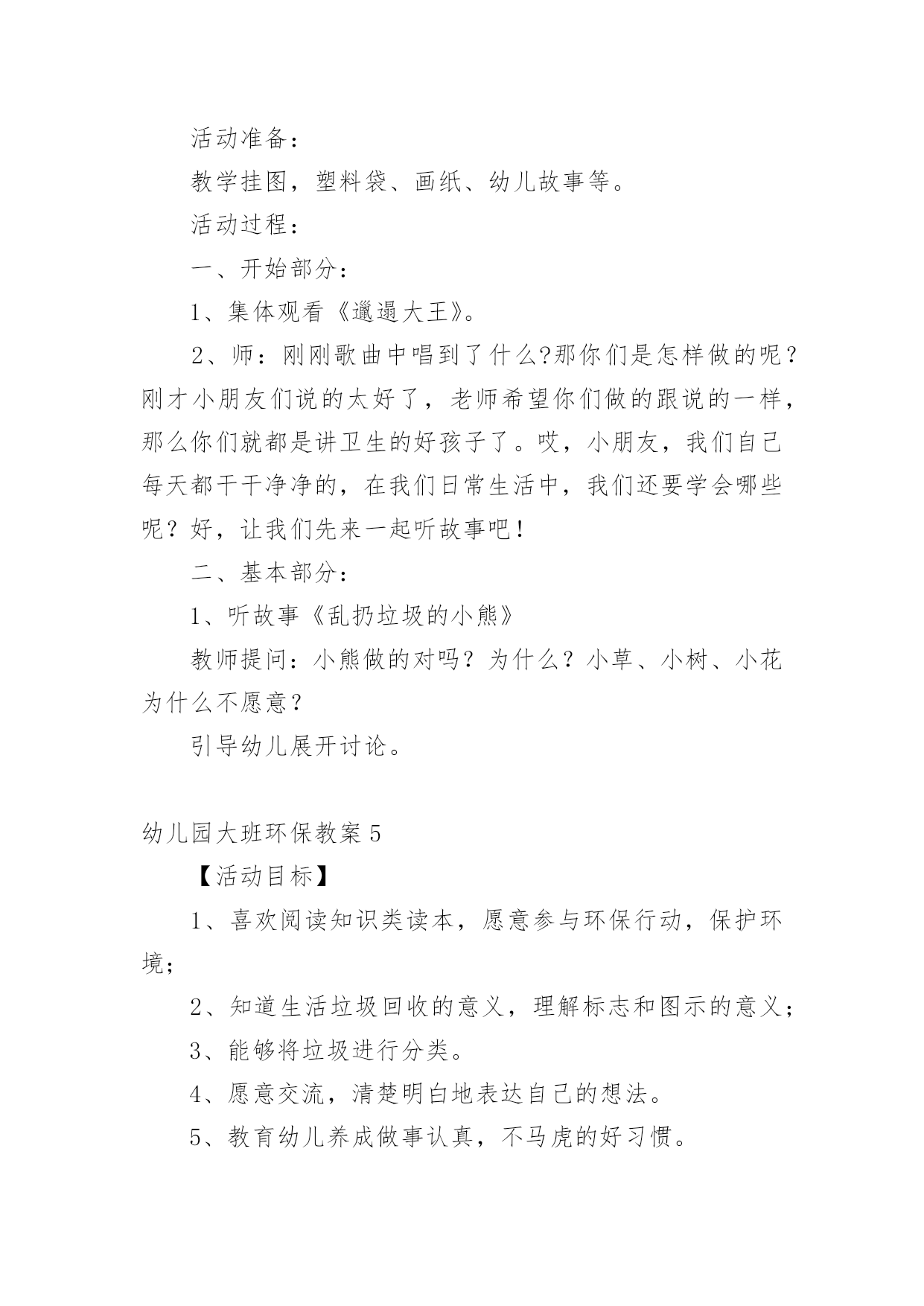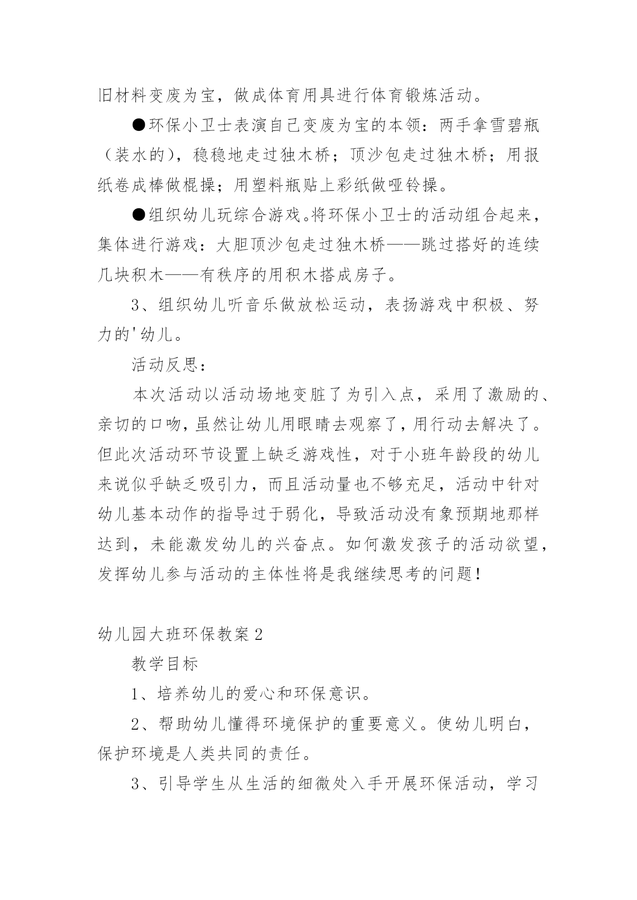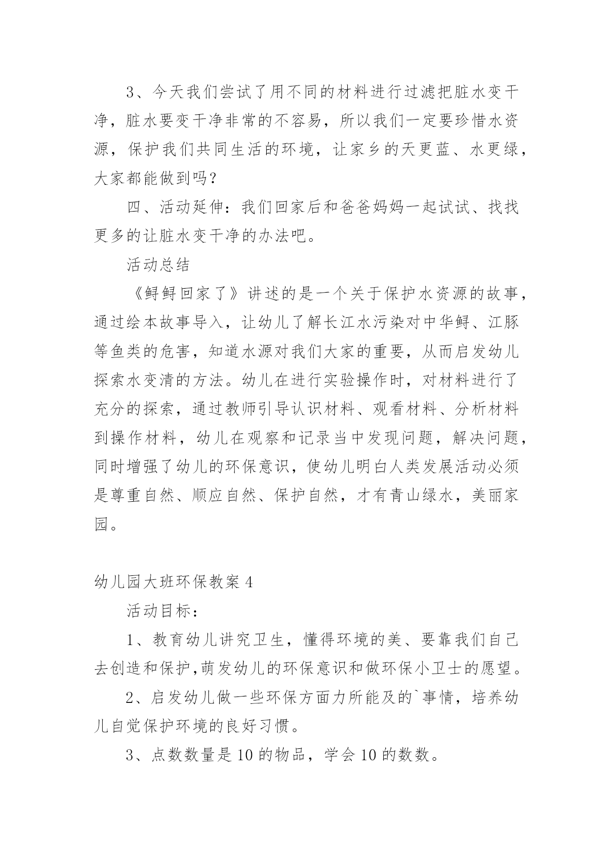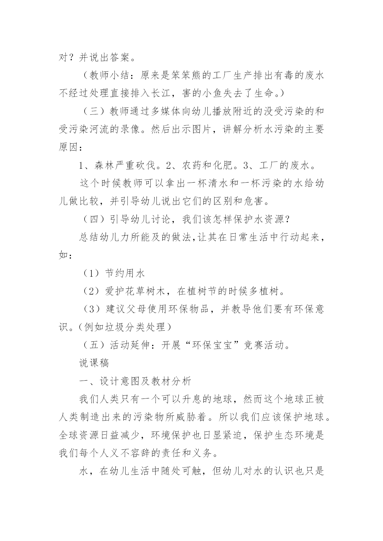 幼儿园大班环保教案作为一名辛苦耕耘的教育工作者,就难以避免地要准备教案,教案有利于教学水平的提高,有助于教研活动的开展。那么应当如何写教案呢?以下是小编为大家整理的幼儿园大班环保教案,仅供参考,欢迎大家阅读。幼儿园大班环保教案1活动目标:1、乐意参与环保小卫士的游戏活动,积极与同伴配合。2、发展爬、跳、平衡的技能。3、培养幼儿敏锐的观察能力。4、了解多运动对身体有好处。5、帮助幼儿了解身体结构,对以后的成长会具有一定的帮助。活动准备:1、沙包、多块积木、平衡木等散放在活动场地上。2、音乐磁带、录音机。活动过程:1、带领幼儿听音乐做准备活动。2、组织幼儿环保小卫士游戏。●环保小卫士到各处检查环境,看看场地上有哪些乱七八糟的东西。●建议环保小卫士经常将场地收拾干净。建议把某些废旧材料变废为宝,做成体育用具进行体育锻炼活动。●环保小卫士表演自己变废为宝的本领:两手拿雪碧瓶(装水的),稳稳地走过独木桥;顶沙包走过独木桥;用报纸卷成棒做棍操;用塑料瓶贴上彩纸做哑铃操。●组织幼儿玩综合游戏。将环保小卫士的活动组合起来,集体进行游戏:大胆顶沙包走过独木桥——跳过搭好的连续几块积木——有秩序的用积木搭成房子。3、组织幼儿听音乐做放松运动,表扬游戏中积极、努力的'幼儿。活动反思:本次活动以活动场地变脏了为引入点,采用了激励的、亲切的口吻,虽然让幼儿用眼睛去观察了,用行动去解决了。但此次活动环节设置上缺乏游戏性,对于小班年龄段的幼儿来说似乎缺乏吸引力,而且活动量也不够充足,活动中针对幼儿基本动作的指导过于弱化,导致活动没有象预期地那样达到,未能激发幼儿的兴奋点。如何激发孩子的活动欲望,发挥幼儿参与活动的主体性将是我继续思考的问题!幼儿园大班环保教案2教学目标1、培养幼儿的爱心和环保意识。2、帮助幼儿懂得环境保护的重要意义。使幼儿明白,保护环境是人类共同的责任。3、引导学生从生活的细微处入手开展环保活动,学习评价故事中的角色行为。教学方法1、教师通过观看图片来讲解环保的重要性,并带领幼儿互动。2、通过多媒体让幼儿更加直观的了解故事情节。活动准备1、准备多张污染水资源和原始生态环境的图片。2、准备一杯清水,一杯污染的水。3、利用多媒体播放故事课件。重点难点重点是引导幼儿理解图片和故事内容,培养幼儿环境保护的意识;难点是如何让幼儿知道水污染对人、动物和环境的伤害。活动过程(一)设计疑问。教师带领幼儿利用多媒体课件观看小鱼在长江里面自由自在的生活着,接着画面上小鱼由于喝了受工厂排除来的污水,剧烈的挣扎,最后泛白肚子。教师在这个时候可以向学生提出疑问:长江里面的小鱼是怎么了?为什么会死去?并带领幼儿找出杀害小鱼的主要因素。(二)听故事教师在带领幼儿看完多媒体课件后,给幼儿讲述黑猫警长查办笨笨熊工厂污染环境的故事。教师在讲完故事之后,向幼儿提问笨笨熊的做法对不对?并说出答案。(教师小结:原来是笨笨熊的工厂生产排出有毒的废水不经过处理直接排入长江,害的小鱼失去了生命。)(三)教师通过多媒体向幼儿播放附近的没受污染的和受污染河流的录像。然后出示图片,讲解分析水污染的主要原因:1、森林严重砍伐。2、农药和化肥。3、工厂的废水。这个时候教师可以拿出一杯清水和一杯污染的水给幼儿做比较,并引导幼儿说出它们的区别和危害。(四)引导幼儿讨论,我们该怎样保护水资源?总结幼儿力所能及的做法,让其在日常生活中行动起来,如:(1)节约用水(2)爱护花草树木,在植树节的时候多植树。(3)建议父母使用环保物品,并教导他们要有环保意识。(例如垃圾分类处理)(五)活动延伸:开展“环保宝宝”竞赛活动。说课稿一、设计意图及教材分析我们人类只有一个可以升息的地球,然而这个地球正被人类制造出来的污染物所威胁着。所以我们应该保护地球。全球资源日益减少,环境保护也日显紧迫,保护生态环境是我们每个人义不容辞的责任和义务。水,在幼儿生活中随处可触,但幼儿对水的认识也只是停留在表面,很少有幼儿进一步去理解水和人们的生活是息息相关的。因此,对“水”的深层次的探究已是一个迫不及待的工作了。故而,我为大班幼儿设计了一堂社会环保课————《保护水资源》。二、活动目标:本次活动制订的`目标。幼儿教育的任何一个目标都应该为幼儿的终生发展作准备,社会教育也不例外。根据幼儿的发展水平、经验、和需要我设计了以下几个目标,分别对幼儿知识、情感、能力方面进行积极的引导。1、知道水是人类、动物的好朋友,了解珍惜水资源的好处,初步产生环保意识。2、迁移生活经验,增强幼儿珍惜水资源的意识。3、通过看看、说说、听听发展幼儿语言表达能力、判断能力。我把活动目标一做为本次活动的重点和难点。三、活动准备:本次活动为了能让每个幼儿都能运用多种感官、多种方式提供条件,我为活动作了以下准备。1、2杯水和多媒体课件2、多张污染水资源和原始生态环境