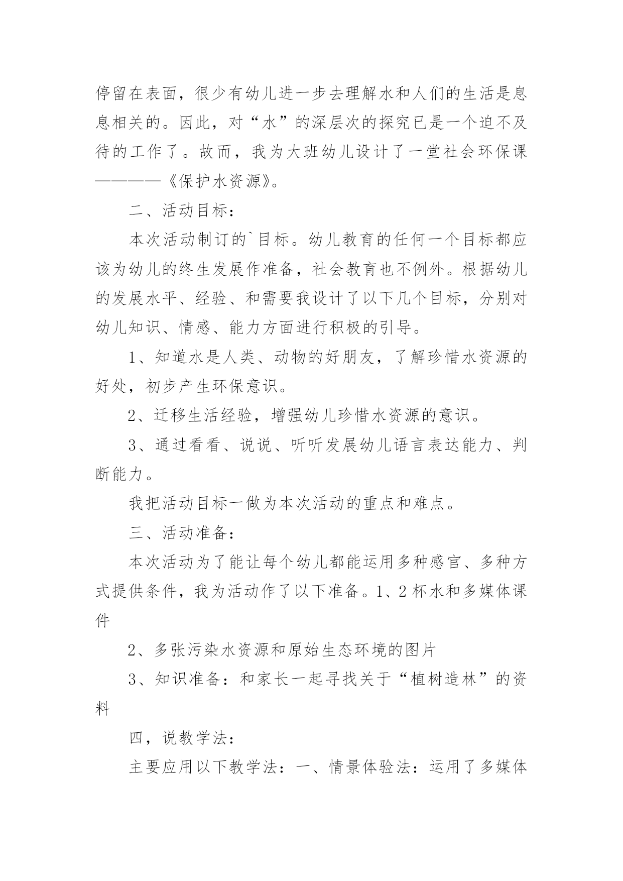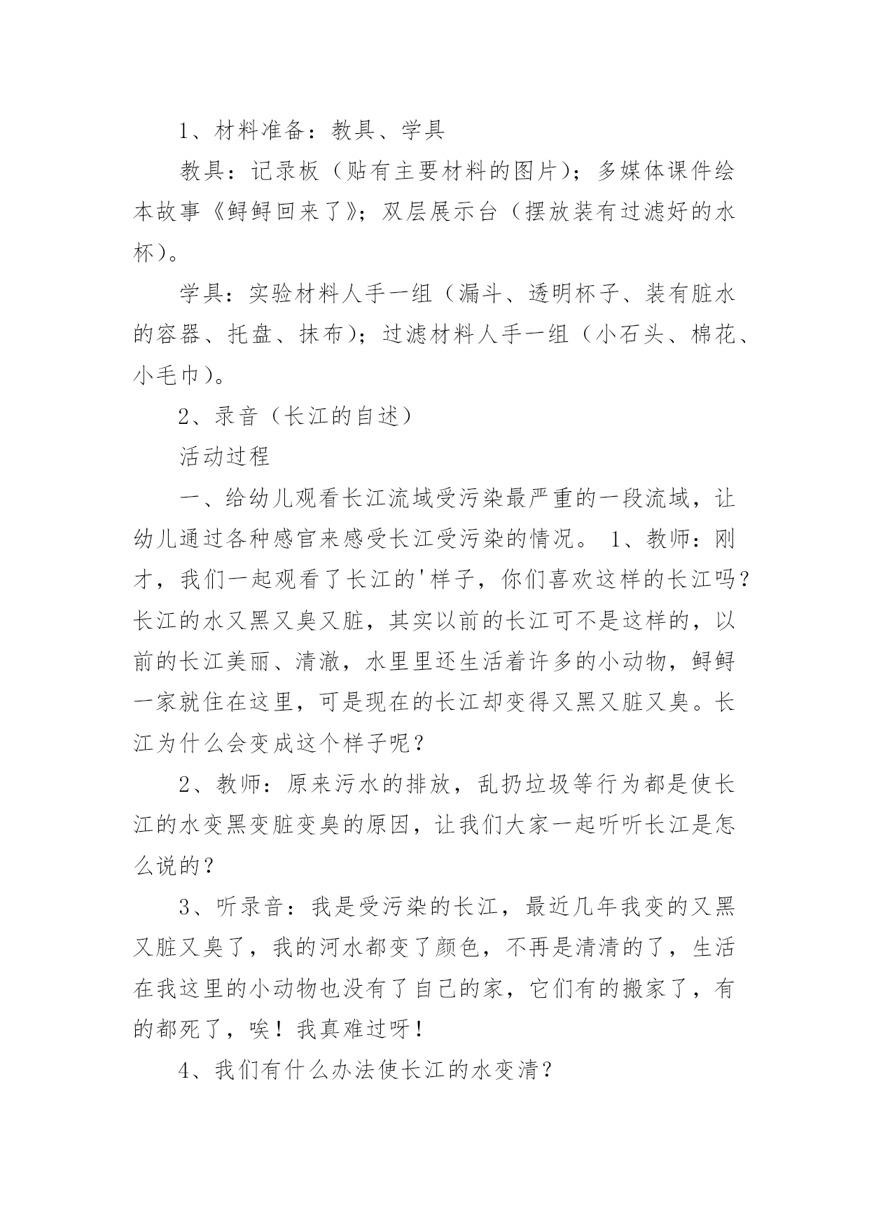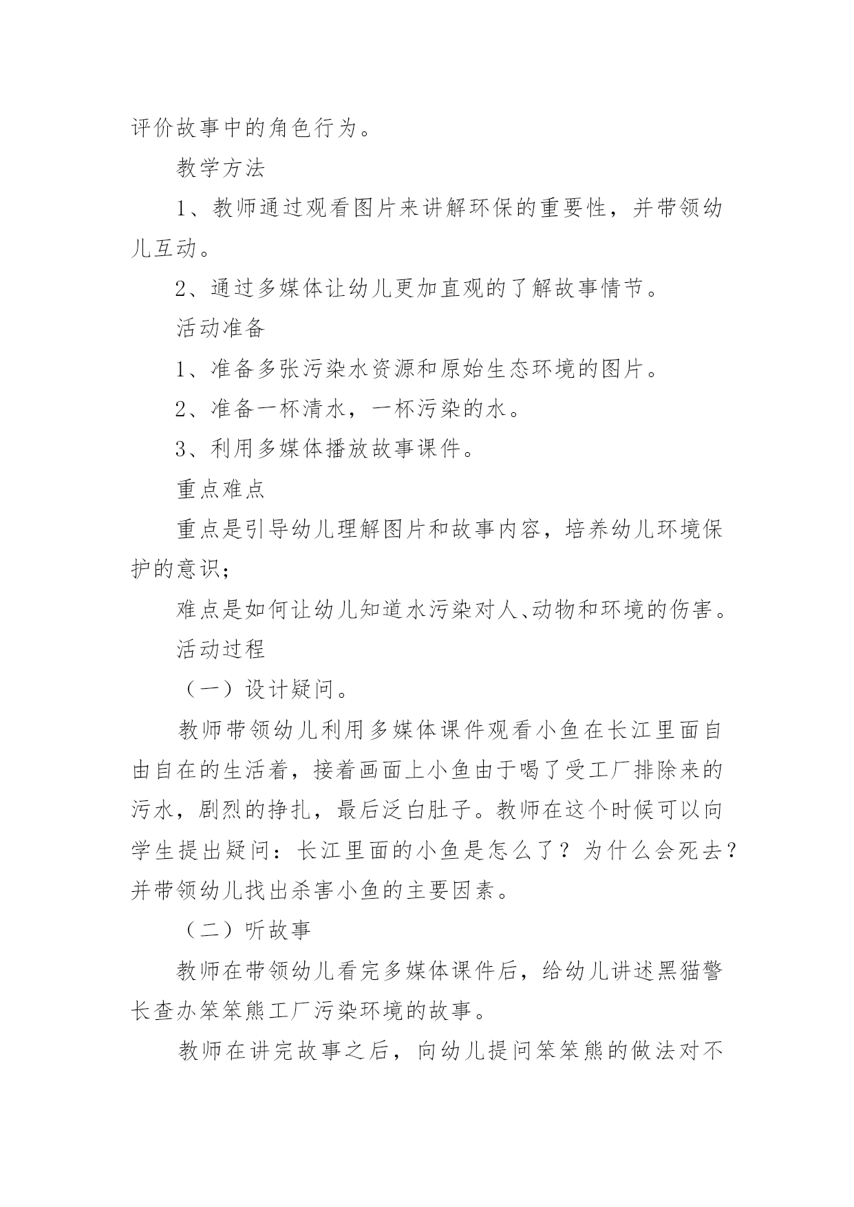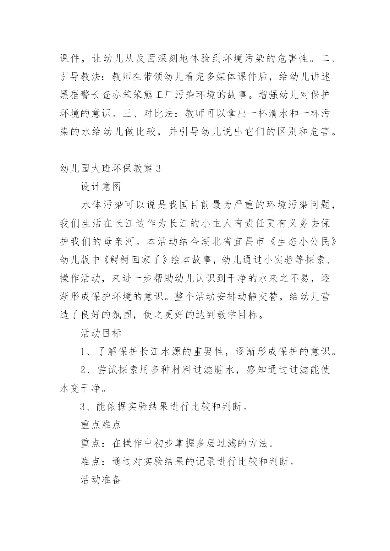 幼儿园大班环保教案作为一名辛苦耕耘的教育工作者,就难以避免地要准备教案,教案有利于教学水平的提高,有助于教研活动的开展。那么应当如何写教案呢?以下是小编为大家整理的幼儿园大班环保教案,仅供参考,欢迎大家阅读。幼儿园大班环保教案1活动目标:1、乐意参与环保小卫士的游戏活动,积极与同伴配合。2、发展爬、跳、平衡的技能。3、培养幼儿敏锐的观察能力。4、了解多运动对身体有好处。5、帮助幼儿了解身体结构,对以后的成长会具有一定的帮助。活动准备:1、沙包、多块积木、平衡木等散放在活动场地上。2、音乐磁带、录音机。活动过程:1、带领幼儿听音乐做准备活动。2、组织幼儿环保小卫士游戏。●环保小卫士到各处检查环境,看看场地上有哪些乱七八糟的东西。●建议环保小卫士经常将场地收拾干净。建议把某些废旧材料变废为宝,做成体育用具进行体育锻炼活动。●环保小卫士表演自己变废为宝的本领:两手拿雪碧瓶(装水的),稳稳地走过独木桥;顶沙包走过独木桥;用报纸卷成棒做棍操;用塑料瓶贴上彩纸做哑铃操。●组织幼儿玩综合游戏。将环保小卫士的活动组合起来,集体进行游戏:大胆顶沙包走过独木桥——跳过搭好的连续几块积木——有秩序的用积木搭成房子。3、组织幼儿听音乐做放松运动,表扬游戏中积极、努力的'幼儿。活动反思:本次活动以活动场地变脏了为引入点,采用了激励的、亲切的口吻,虽然让幼儿用眼睛去观察了,用行动去解决了。但此次活动环节设置上缺乏游戏性,对于小班年龄段的幼儿来说似乎缺乏吸引力,而且活动量也不够充足,活动中针对幼儿基本动作的指导过于弱化,导致活动没有象预期地那样达到,未能激发幼儿的兴奋点。如何激发孩子的活动欲望,发挥幼儿参与活动的主体性将是我继续思考的问题!幼儿园大班环保教案2教学目标1、培养幼儿的爱心和环保意识。2、帮助幼儿懂得环境保护的重要意义。使幼儿明白,保护环境是人类共同的责任。3、引导学生从生活的细微处入手开展环保活动,学习评价故事中的角色行为。教学方法1、教师通过观看图片来讲解环保的重要性,并带领幼儿互动。2、通过多媒体让幼儿更加直观的了解故事情节。活动准备1、准备多张污染水资源和原始生态环境的图片。2、准备一杯清水,一杯污染的水。3、利用多媒体播放故事课件。重点难点重点是引导幼儿理解图片和故事内容,培养幼儿环境保护的意识;难点是如何让幼儿知道水污染对人、动物和环境的伤害。活动过程(一)设计疑问。教师带领幼儿利用多媒体课件观看小鱼在长江里面自由自在的生活着,接着画面上小鱼由于喝了受工厂排除来的污水,剧烈的挣扎,最后泛白肚子。教师在这个时候可以向学生提出疑问:长江里面的小鱼是怎么了?为什么会死去?并带领幼儿找出杀害小鱼的主要因素。(二)听故事教师在带领幼儿看完多媒体课件后,给幼儿讲述黑猫警长查办笨笨熊工厂污染环境的故事。教师在讲完故事之后,向幼儿提问笨笨熊的做法对不对?并说出答案。(教师小结:原来是笨笨熊的工厂生产排出有毒的废水不经过处理直接排入长江,害的小鱼失去了生命。)(三)教师通过多媒体向幼儿播放附近的没受污染的和受污染河流的录像。然后出示图片,讲解分析水污染的主要原因:1、森林严重砍伐。2、农药和化肥。3、工厂的废水。这个时候教师可以拿出一杯清水和一杯污染的水给幼儿做比较,并引导幼儿说出它们的区别和危害。(四)引导幼儿讨论,我们该怎样保护水资源?总结幼儿力所能及的做法,让其在日常生活中行动起来,如:(1)节约用水(2)爱护花草树木,在植树节的时候多植树。(3)建议父母使用环保物品,并教导他们要有环保意识。(例如垃圾分类处理)(五)活动延伸:开展“环保宝宝”竞赛活动。说课稿一、设计意图及教材分析我们人类只有一个可以升息的地球,然而这个地球正被人类制造出来的污染物所威胁着。所以我们应该保护地球。全球资源日益减少,环境保护也日显紧迫,保护生态环境是我们每个人义不容辞的责任和义务。水,在幼儿生活中随处可触,但幼儿对水的认识也只是停留在表面,很少有幼儿进一步去理解水和人们的生活是息息相关的。因此,对“水”的深层次的探究已是一个迫不及待的工作了。故而,我为大班幼儿设计了一堂社会环保课————《保护水资源》。二、活动目标:本次活动制订的`目标。幼儿教育的任何一个目标都应该为幼儿的终生发展作准备,社会教育也不例外。根据幼儿的发展水平、经验、和需要我设计了以下几个目标,分别对幼儿知识、情感、能力方面进行积极的引导。1、知道水是人类、动物的好朋友,了解珍惜水资源的好处,初步产生环保意识。2、迁移生活经验,增强幼儿珍惜水资源的意识。3、通过看看、说说、听听发展幼儿语言表达能力、判断能力。我把活动目标一做为本次活动的重点和难点。三、活动准备:本次活动为了能让每个幼儿都能运用多种感官、多种方式提供条件,我为活动作了以下准备。1、2杯水和多媒体课件2、多张污染水资源和原始生态环境