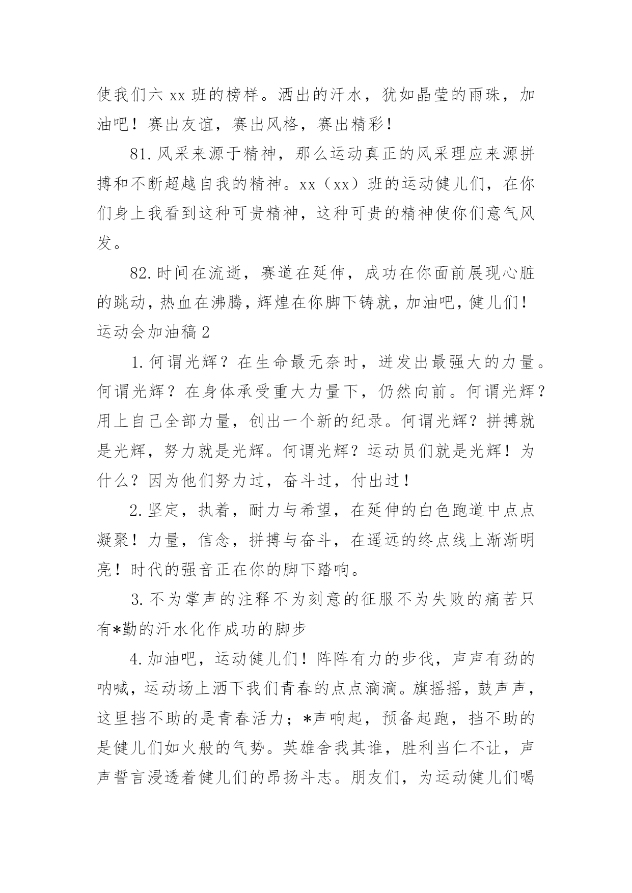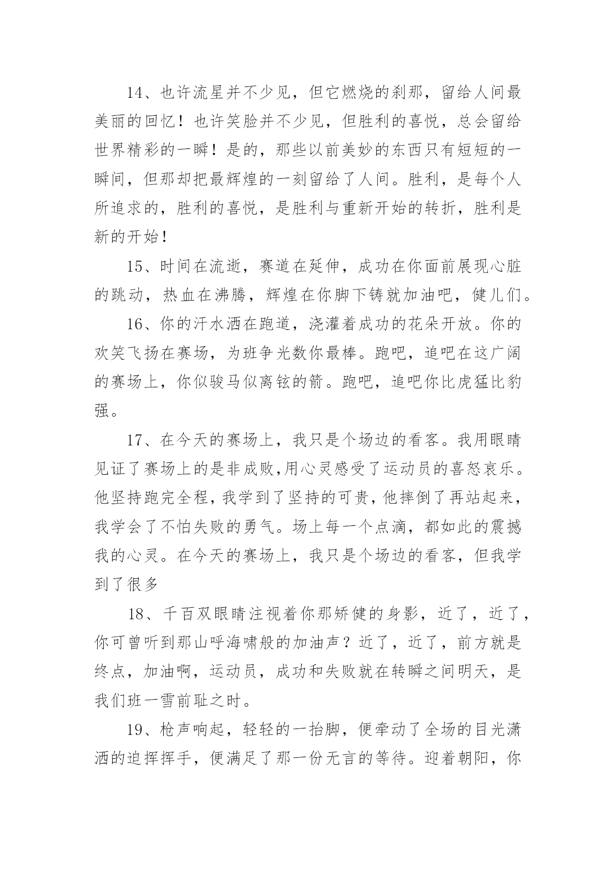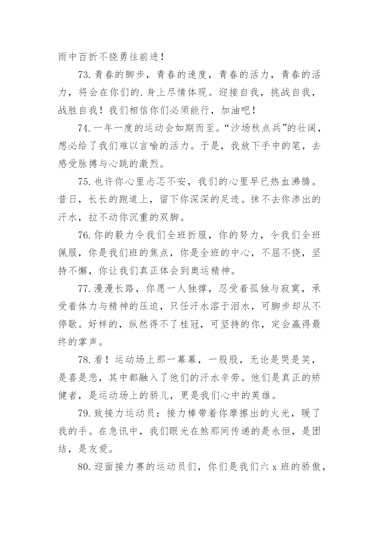 运动会加油稿运动会加油稿随着社会一步步向前发展,各种加油稿频频出现,适当使用加油稿可以给对方打气加油。写起加油稿来就毫无头绪?以下是小编帮大家整理的运动会加油稿,仅供参考,欢迎大家阅读。运动会加油稿168.不要掉泪,不要屈服,哪怕胜利永远只是个未知数。跌倒了,不要放下,爬起来,继续努力前进!因为如果放下,虽不会再摔跤,可是——永远不会前进半步!69.你是运动场的心脏,跳动梦想;你是漫长路的精神,激励辉煌;你们是将上下求索的人!风为你加油,云为你助兴,坚定,执着,耐力与期望,在延伸的白色跑道中点点凝聚!70.运动健将们,用你的实力,用你的精神,去开拓出,一片属于你的长跑天地!71.这是个非同寻常的日子。场上的学子们正在这个不一样寻常的舞台上尽情的展示自我的风采。而周围的一切一切的一切都在为之锦上添花。72.梦想毕竟不一样于现实,失败是生活的一部分,谁也无法选择,无法拒绝。人生要自我去拼搏,去奋斗,在风雨中百折不挠勇往前进!73.青春的脚步,青春的速度,青春的活力,青春的活力,将会在你们的.身上尽情体现。迎接自我,挑战自我,战胜自我!我们相信你们必须能行,加油吧!74.一年一度的运动会如期而至。“沙场秋点兵”的壮阔,想必给了我们难以言喻的活力。于是,我放下手中的笔,去感受脉搏与心跳的激烈。75.也许你心里忐忑不安,我们的心里早已热血沸腾。昔日,长长的跑道上,留下你深深的足迹。抹不去你渗出的汗水,拉不动你沉重的双脚。76.你的毅力令我们全班折服,你的努力,令我们全班佩服,你是我们班的焦点,你是全班的中心,不屈不挠,坚持不懈,你让我们真正体会到奥运精神。77.漫漫长路,你愿一人独撑,忍受着孤独与寂寞,承受着体力与精神的压迫,只任汗水溶于泪水,可脚步却从不停歇。好样的,纵然得不了桂冠,可坚持的你,定会赢得最终的掌声。78.看!运动场上那一幕幕,一股股,无论是哭是笑,是喜是悲,其中都融入了他们的汗水辛劳。他们是真正的矫健者,是运动场上的骄儿,更是我们心中的英雄。79.致接力运动员:接力棒带着你摩擦出的火光,暖了我的手。在急讯中,我们眼光在煞那间传递的是永恒,是团结,是友爱。80.迎面接力赛的运动员们,你们是我们六x班的骄傲,使我们六xx班的榜样。洒出的汗水,犹如晶莹的雨珠,加油吧!赛出友谊,赛出风格,赛出精彩!81.风采来源于精神,那么运动真正的风采理应来源拼搏和不断超越自我的精神。xx(xx)班的运动健儿们,在你们身上我看到这种可贵精神,这种可贵的精神使你们意气风发。82.时间在流逝,赛道在延伸,成功在你面前展现心脏的跳动,热血在沸腾,辉煌在你脚下铸就,加油吧,健儿们!运动会加油稿21.何谓光辉?在生命最无奈时,迸发出最强大的力量。何谓光辉?在身体承受重大力量下,仍然向前。何谓光辉?用上自己全部力量,创出一个新的纪录。何谓光辉?拼搏就是光辉,努力就是光辉。何谓光辉?运动员们就是光辉!为什么?因为他们努力过,奋斗过,付出过!2.坚定,执着,耐力与希望,在延伸的白色跑道中点点凝聚!力量,信念,拼搏与奋斗,在遥远的终点线上渐渐明亮!时代的强音正在你的脚下踏响。3.不为掌声的注释不为刻意的征服不为失败的痛苦只有*勤的汗水化作成功的脚步4.加油吧,运动健儿们!阵阵有力的步伐,声声有劲的呐喊,运动场上洒下我们青春的点点滴滴。旗摇摇,鼓声声,这里挡不助的是青春活力;*声响起,预备起跑,挡不助的是健儿们如火般的气势。英雄舍我其谁,胜利当仁不让,声声誓言浸透着健儿们的昂扬斗志。朋友们,为运动健儿们喝*,为运动喝*吧!场上精*纷呈,空气里的每一个分子浸透着自信。我要高喊一声:这里无限精*!5.时间在流逝,赛道在延伸,成功在你面前展现心脏的跳动,热血在沸腾,辉煌在你脚下铸就。加油吧,健儿们!6.奔跑,秋风为你送爽,红旗为你飘扬,掌声为你响起,呐喊为你喝*,加油,飞奔的身影就是飞翔的鸟儿,矫捷,快速,奔向终点,胜利是属于你们,最甜最美的笑容是属于你们。7.我们的运动健儿,摩拳擦掌,跃跃欲试,要在运动场上一显身手,互论短长。运动场上,显露竞争精神,展现俺辈英雄本*;运动场下,友谊第一,比赛第二;增进感情,健身才可以健康。运动健儿最漂亮!8.踏着春天的气息,迈着轻盈的脚步,我们迎来了心仪已久的运动会。这里就是展示自我的舞台。我们9.枪声响起,你们的征程开始在脚下,你们飞逝在跑道上的背景,将迎来只属于你们的掌声。10.不为鲜花的`围绕,不为刹那的荣耀,只有执着的信念,化作不停的奔跑,心中燃烧着梦想,脚下不停的步伐11.你们挥舞着充满力量的双臂看着实心球化成美丽的弧线我着实在心里佩服你们你们抛出了自己的最佳水平!12.轻轻的抬起头,不需要任何的话语,让自信在脸上荡漾,不要为失利而苦恼,只需告诉自己,我曾努力过,我无怨无悔13.人生如梦,充满幻想与渴望,人生是河,以