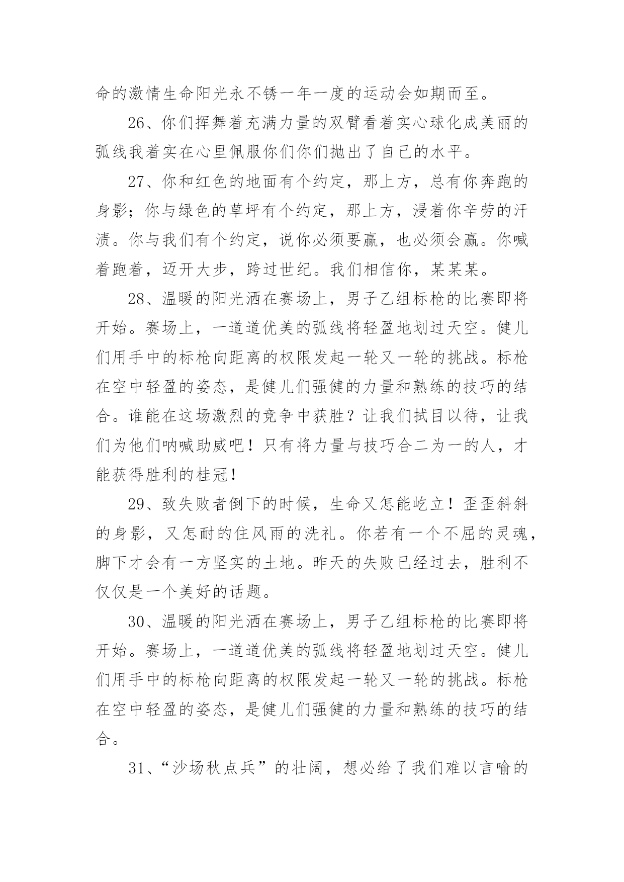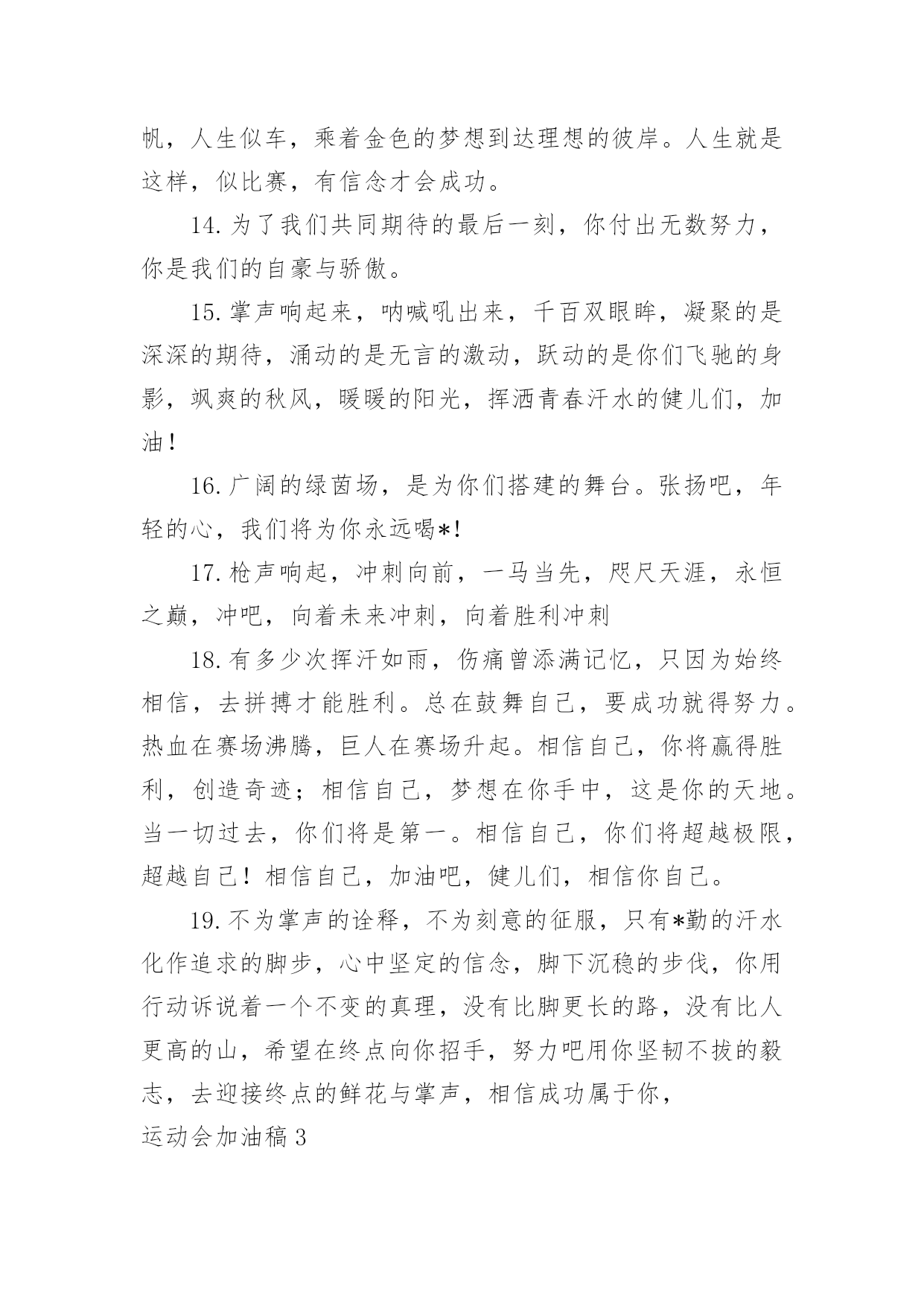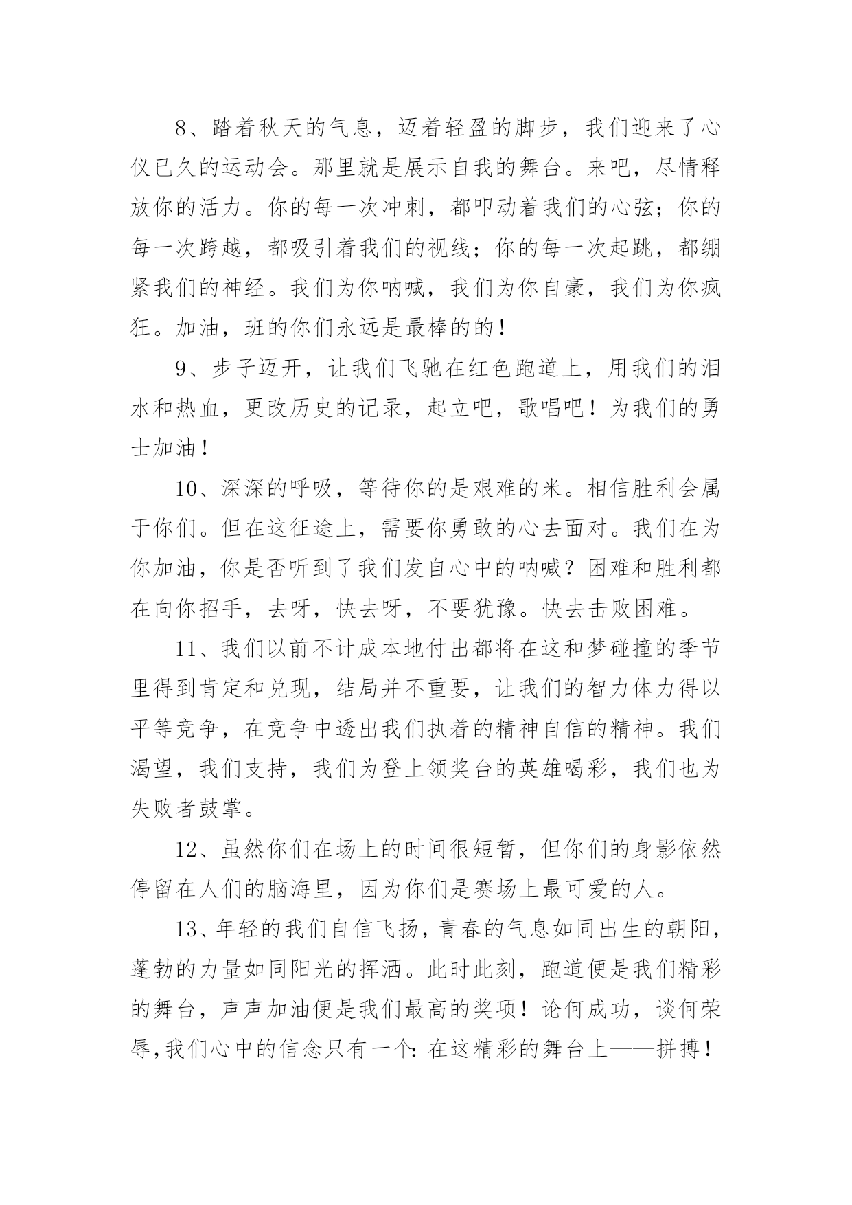 运动会加油稿运动会加油稿随着社会一步步向前发展,各种加油稿频频出现,适当使用加油稿可以给对方打气加油。写起加油稿来就毫无头绪?以下是小编帮大家整理的运动会加油稿,仅供参考,欢迎大家阅读。运动会加油稿168.不要掉泪,不要屈服,哪怕胜利永远只是个未知数。跌倒了,不要放下,爬起来,继续努力前进!因为如果放下,虽不会再摔跤,可是——永远不会前进半步!69.你是运动场的心脏,跳动梦想;你是漫长路的精神,激励辉煌;你们是将上下求索的人!风为你加油,云为你助兴,坚定,执着,耐力与期望,在延伸的白色跑道中点点凝聚!70.运动健将们,用你的实力,用你的精神,去开拓出,一片属于你的长跑天地!71.这是个非同寻常的日子。场上的学子们正在这个不一样寻常的舞台上尽情的展示自我的风采。而周围的一切一切的一切都在为之锦上添花。72.梦想毕竟不一样于现实,失败是生活的一部分,谁也无法选择,无法拒绝。人生要自我去拼搏,去奋斗,在风雨中百折不挠勇往前进!73.青春的脚步,青春的速度,青春的活力,青春的活力,将会在你们的.身上尽情体现。迎接自我,挑战自我,战胜自我!我们相信你们必须能行,加油吧!74.一年一度的运动会如期而至。“沙场秋点兵”的壮阔,想必给了我们难以言喻的活力。于是,我放下手中的笔,去感受脉搏与心跳的激烈。75.也许你心里忐忑不安,我们的心里早已热血沸腾。昔日,长长的跑道上,留下你深深的足迹。抹不去你渗出的汗水,拉不动你沉重的双脚。76.你的毅力令我们全班折服,你的努力,令我们全班佩服,你是我们班的焦点,你是全班的中心,不屈不挠,坚持不懈,你让我们真正体会到奥运精神。77.漫漫长路,你愿一人独撑,忍受着孤独与寂寞,承受着体力与精神的压迫,只任汗水溶于泪水,可脚步却从不停歇。好样的,纵然得不了桂冠,可坚持的你,定会赢得最终的掌声。78.看!运动场上那一幕幕,一股股,无论是哭是笑,是喜是悲,其中都融入了他们的汗水辛劳。他们是真正的矫健者,是运动场上的骄儿,更是我们心中的英雄。79.致接力运动员:接力棒带着你摩擦出的火光,暖了我的手。在急讯中,我们眼光在煞那间传递的是永恒,是团结,是友爱。80.迎面接力赛的运动员们,你们是我们六x班的骄傲,使我们六xx班的榜样。洒出的汗水,犹如晶莹的雨珠,加油吧!赛出友谊,赛出风格,赛出精彩!81.风采来源于精神,那么运动真正的风采理应来源拼搏和不断超越自我的精神。xx(xx)班的运动健儿们,在你们身上我看到这种可贵精神,这种可贵的精神使你们意气风发。82.时间在流逝,赛道在延伸,成功在你面前展现心脏的跳动,热血在沸腾,辉煌在你脚下铸就,加油吧,健儿们!运动会加油稿21.何谓光辉?在生命最无奈时,迸发出最强大的力量。何谓光辉?在身体承受重大力量下,仍然向前。何谓光辉?用上自己全部力量,创出一个新的纪录。何谓光辉?拼搏就是光辉,努力就是光辉。何谓光辉?运动员们就是光辉!为什么?因为他们努力过,奋斗过,付出过!2.坚定,执着,耐力与希望,在延伸的白色跑道中点点凝聚!力量,信念,拼搏与奋斗,在遥远的终点线上渐渐明亮!时代的强音正在你的脚下踏响。3.不为掌声的注释不为刻意的征服不为失败的痛苦只有*勤的汗水化作成功的脚步4.加油吧,运动健儿们!阵阵有力的步伐,声声有劲的呐喊,运动场上洒下我们青春的点点滴滴。旗摇摇,鼓声声,这里挡不助的是青春活力;*声响起,预备起跑,挡不助的是健儿们如火般的气势。英雄舍我其谁,胜利当仁不让,声声誓言浸透着健儿们的昂扬斗志。朋友们,为运动健儿们喝*,为运动喝*吧!场上精*纷呈,空气里的每一个分子浸透着自信。我要高喊一声:这里无限精*!5.时间在流逝,赛道在延伸,成功在你面前展现心脏的跳动,热血在沸腾,辉煌在你脚下铸就。加油吧,健儿们!6.奔跑,秋风为你送爽,红旗为你飘扬,掌声为你响起,呐喊为你喝*,加油,飞奔的身影就是飞翔的鸟儿,矫捷,快速,奔向终点,胜利是属于你们,最甜最美的笑容是属于你们。7.我们的运动健儿,摩拳擦掌,跃跃欲试,要在运动场上一显身手,互论短长。运动场上,显露竞争精神,展现俺辈英雄本*;运动场下,友谊第一,比赛第二;增进感情,健身才可以健康。运动健儿最漂亮!8.踏着春天的气息,迈着轻盈的脚步,我们迎来了心仪已久的运动会。这里就是展示自我的舞台。我们9.枪声响起,你们的征程开始在脚下,你们飞逝在跑道上的背景,将迎来只属于你们的掌声。10.不为鲜花的`围绕,不为刹那的荣耀,只有执着的信念,化作不停的奔跑,心中燃烧着梦想,脚下不停的步伐11.你们挥舞着充满力量的双臂看着实心球化成美丽的弧线我着实在心里佩服你们你们抛出了自己的最佳水平!12.轻轻的抬起头,不需要任何的话语,让自信在脸上荡漾,不要为失利而苦恼,只需告诉自己,我曾努力过,我无怨无悔13.人生如梦,充满幻想与渴望,人生是河,以