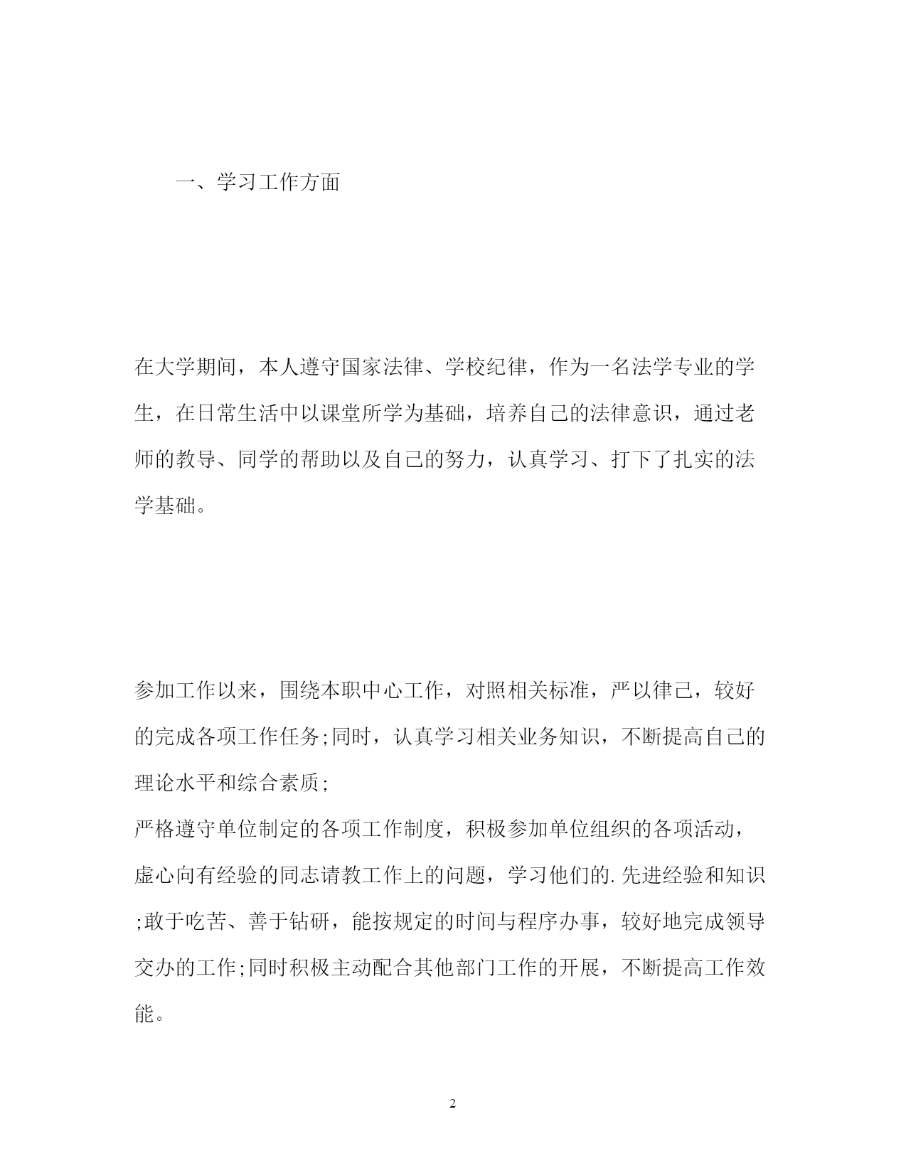 此资料由网络收集而来,如有侵权请告知上传者立即删除。资料共分享,我们负责传递知识。PAGEPAGE4公务员工作个人自我鉴定公务员工作个人自我鉴定我叫,女,于19XX年x月出生于XX省XX县,X族。xxxx年x月进入XXXX学校法学专业学习,xxxx年xx月毕业,学制四年,大学本科学历,共青团员。毕业至今在XXX单位任职。20xx年2月,本人参加了XX省公务员考试,报考了XX职位,有幸以优异的成绩成为拟录用人员,现在我即将开始人生的另一段旅程,并逐步完成从事业单位到机关公务员的这种环境和角色的双重转变和适应。为了能更好的走向工作岗位,让领导对我有更深的了解,现对自己以往的学习、工作、思想、生活情况做如下小结。一、学习工作方面在大学期间,本人遵守国家法律、学校纪律,作为一名法学专业的学生,在日常生活中以课堂所学为基础,培养自己的法律意识,通过老师的教导、同学的帮助以及自己的努力,认真学习、打下了扎实的法学基础。参加工作以来,围绕本职中心工作,对照相关标准,严以律己,较好的完成各项工作任务;同时,认真学习相关业务知识,不断提高自己的理论水平和综合素质;严格遵守单位制定的各项工作制度,积极参加单位组织的各项活动,虚心向有经验的同志请教工作上的问题,学习他们的.先进经验和知识;敢于吃苦、善于钻研,能按规定的时间与程序办事,较好地完成领导交办的工作;同时积极主动配合其他部门工作的开展,不断提高工作效能。二、思想政治方面在思想上,本人认真学习xxx理论、领会党的路线方针政策精神,利用电视、电脑、报纸、杂志等媒体关注国内国际形势,学习党的基本知识和有关政治思想文件、书籍,深刻领会胡总书记的讲话精神,并把它作为思想的纲领,行动的指南;积极参加党支部组织的各种政治学习及教育活动;时刻牢记为人民服务的宗旨,明白自己所肩负的责任;积极参与基层建设;积极向党组织靠拢,不满足于入党积极分子培训所获得的党的基本知识,在工作、学习和生活中增强自身的党性原则,按照新党章规定的党员标准来要求自己,虚心向身边的党员学习。三、生活作风方面在生活作风上,发扬艰苦朴素、勤俭耐劳、乐于助人的优良传统,始终做到老老实实做人,勤勤恳恳做事,勤劳简朴的生活,严格要求自己;遵章守纪、团结同事、务真求实、乐观上进,始终保持严谨认真的工作态度和一丝不苟的工作作风,勤勤恳恳,任劳任怨。总结自己多年来的学习工作、生活情况,尽管有了一定的进步和成绩,但在一些方面还存在着不足。比如我刚刚踏出校园,步入社会。社会工作经验上还存在着一定的欠缺。这有待于在今后的工作中加以磨砺。在新的工作岗位上,我一定要继续加强学习,严格要求自己,在实践中不断提高自己的工作能力、应变能力、人际交往沟通能力等,力争做一名合格的司法工作人员,为我国法治事业发展和壮大做出自己应有的贡献。