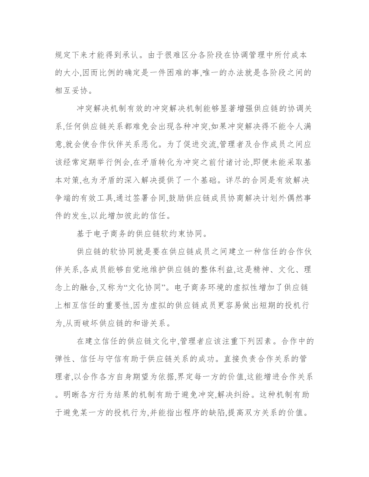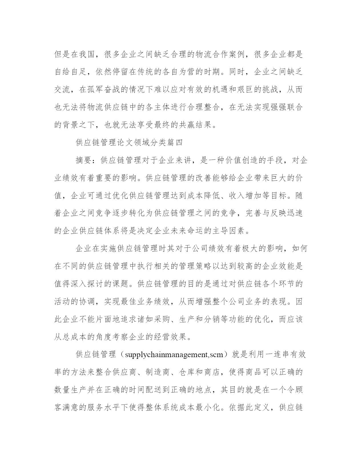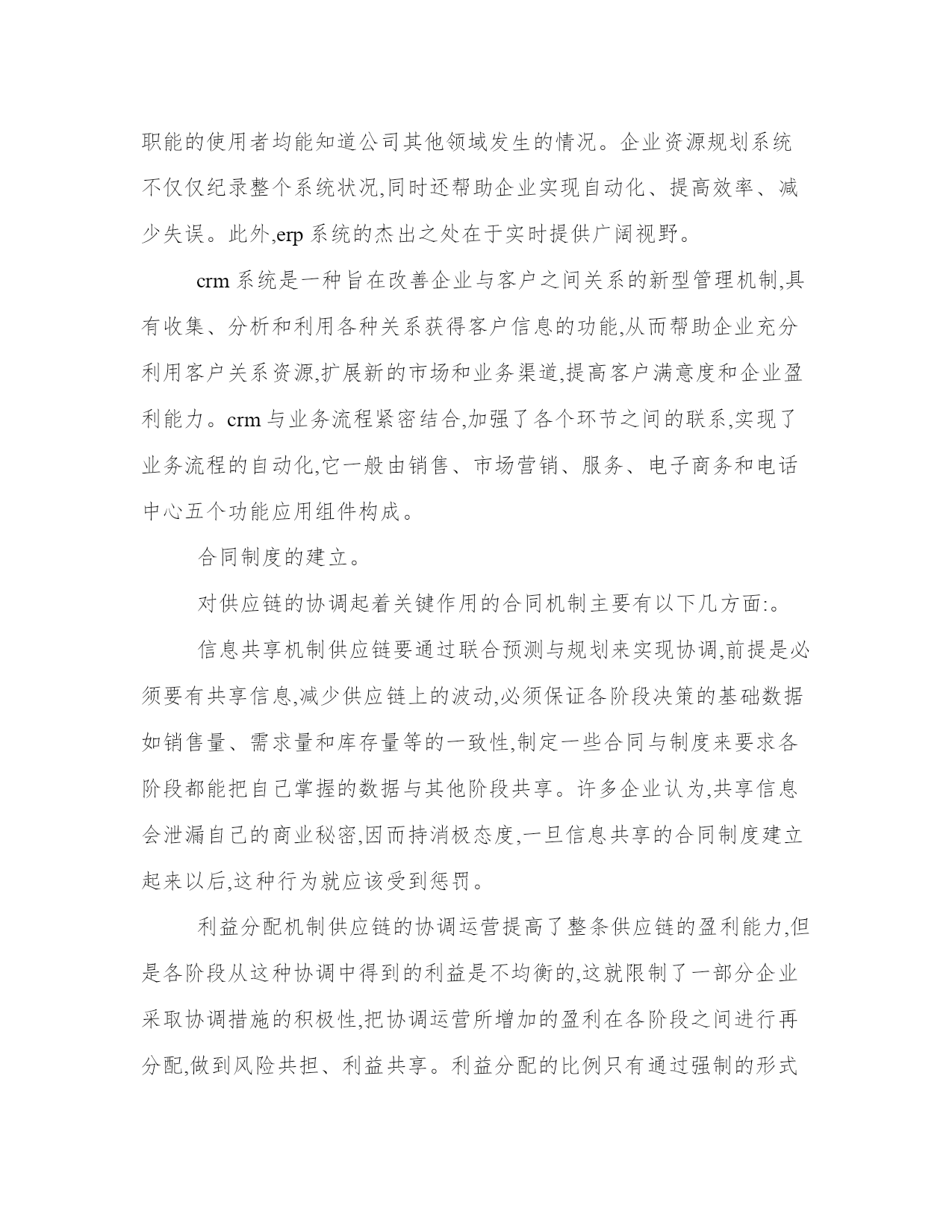 最新供应链管理论文领域分类供应链管理论文(汇总13篇)人的记忆力会随着岁月的流逝而衰退,写作可以弥补记忆的不足,将曾经的人生经历和感悟记录下来,也便于保存一份美好的回忆。范文怎么写才能发挥它最大的作用呢?以下是我为大家搜集的优质范文,仅供参考,一起来看看吧供应链管理论文领域分类篇一内容摘要:随着电子商务不断深入的分析和发展,供应链管理逐渐引起重视。本文就电子商务环境下的供应链协同管理策略进行了探讨。作为网络经济的必然产物,电子商务掀起了经济领域的一场革命。面对电子商务大潮,众多企业最关心的是如何通过电子商务解决企业的供应链管理问题。供应链是指从产品开发到售后服务过程中形成的各个环节纵向一体化网络,是对整个供应链的各参与组织或部门之间的物流、资金流和信息流进行计划、协调和控制等,其目的是通过优化提高所有相关过程的速度和确定性,使所有相关过程的净增加值最大化,并提高组织效率和效益。供应链管理是基于供应链网络上的各组织或部门具有一个共同的战略目标基础上的管理,它将整个供应链看成一个有机整体,体现了系统管理的思想。电子商务为供应链的协调提供了机遇,同时也使供应链的协同管理面临挑战,关于在供应链内建立协调合作关系,有两种观点:观点一认为,供应链各方以各种正式合同来保证合作,一旦合同拟定下来,各方只从自身利益出发以信任的方式开展合作;观点二认为,由于供应链各方存在一系列相互作用的关系,信任和合作的关系建立在时间的基础上,积极的相互作用加强了对方合作的信任。在实际情况中,上述两种观点各有偏颇,不可能设计出一种能够涵盖未来发生的所有偶然事件的合同。因此,彼此尚不信任的双方不得不靠建立信任关系,来解决合同内尚未涵盖的问题。在多数有效率的合作关系中,两种方案兼而有之。故应从两个方面来完善供应链的协同管理,一是从供应链的硬环境建设方面,一是从软约束方面,两方面相辅相成,共同实现供应链的协调运行。基于电子商务的供应链硬环境协同。供应链协同管理的硬环境建设包括两方面,一是硬件基础设施的建设,一是供应链成员必须遵守的硬性合同、制度。由于这两方面都具有一旦建立就保持稳定或具有强制性、灵活性较差等特点,所以把两方面共同努力达到的供应链协调称之为供应链,即硬协同管理。硬协同是供应链最主要的协调管理工具,在供应链管理的初级阶段也是最有效工具,要想实现供应链的最优化目标,是必不可少的。硬件基础设施建设。硬件基础设施建设主要是为供应链协调提供技术支持,保证供应链上信息流、物流和商流等畅通。供应链上各企业的基础设施必须跟上电子商务发展的步伐,能为供应链各阶段之间的同步行动创造条件。电子商务要求的基础设施首先就是网络设施,供应链上必须完善自己的网络基础设施,在企业内部建立起intranet(企业内部网)和在企业之间建立外部网络(extranet)。使内部供应链与外部供应链连成一个整体,只有这样,供应链上的信息才能同步传输,信息在出现的同时就能在供应链上得到共享。供应链上的生产和物流设施必须满足电子商务的需要,电子商务时代的运输更多的是趋向于第三方物流,那么传统供应链企业包揽一切运输任务的状况就得改变,许多不必要的物流设施完全可以省去。供应链上的各企业之间的设施不匹配会导致供应链不协调,必须进行优化。另外,供应链上企业的管理系统必须能满足供应链协调运营的需要,管理系统要能有效的把企业各功能模块集成起来。目前,供应链管理的工具很多,应用范围各不相同,应用最广的主要是两种系统,一是企业资源规划系统(erp系统),一是客户关系管理系统(crm系统)。两种系统基本涵盖了供应链的整个管理范围,能够满足电子商务环境下供应链管理的需要。erp系统掌握了整个企业的原材料、订货、生产安排、成品库存及其他信息,跨越了企业职能之间的界限,涵盖财务、物流、生产、订单完成、人力资源和供应商管理等功能模块,这些模块相互关联,因而每一职能的使用者均能知道公司其他领域发生的情况。企业资源规划系统不仅仅纪录整个系统状况,同时还帮助企业实现自动化、提高效率、减少失误。此外,erp系统的杰出之处在于实时提供广阔视野。crm系统是一种旨在改善企业与客户之间关系的新型管理机制,具有收集、分析和利用各种关系获得客户信息的功能,从而帮助企业充分利用客户关系资源,扩展新的市场和业务渠道,提高客户满意度和企业盈利能力。crm与业务流程紧密结合,加强了各个环节之间的联系,实现了业务流程的自动化,它一般由销售、市场营销、服务、电子商务和电话中心五个功能应用组件构成。合同制度的建立。对供应链的协调起着关键作用的合同机制主要有以下几方面:。信息共享机制供应链要通过联合预测与规划来实现协调,前提是必须要有共享信息,减少供应链上的波动,必须保证各阶段决策的基础数据如销售量、需求量和库存量等的一