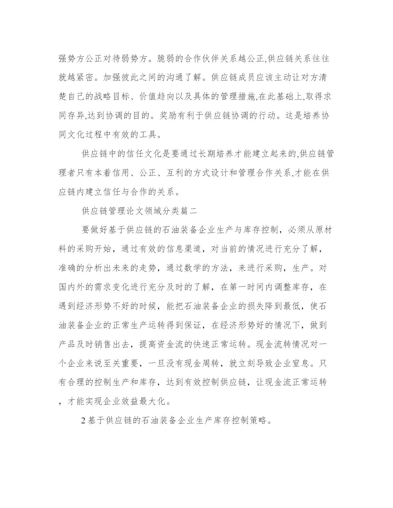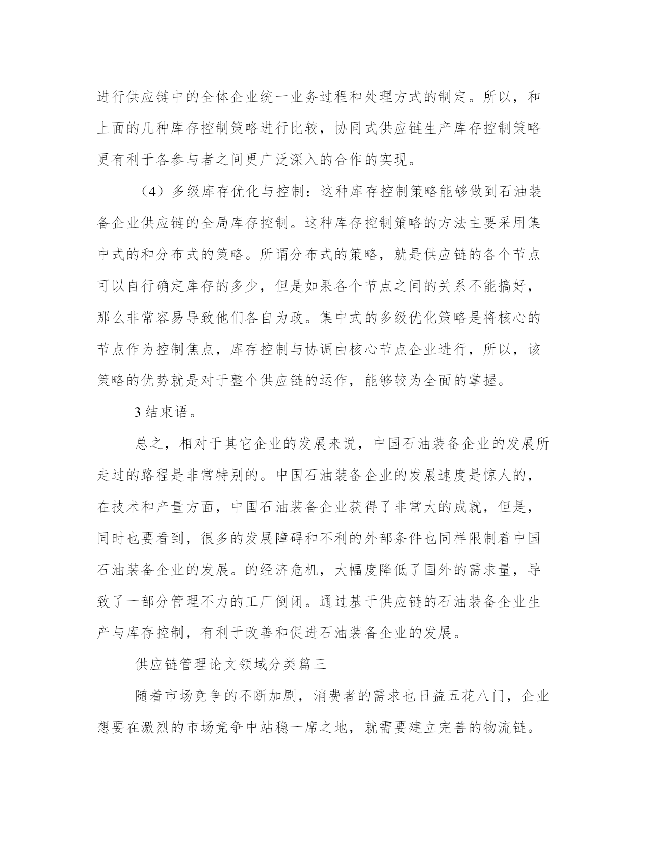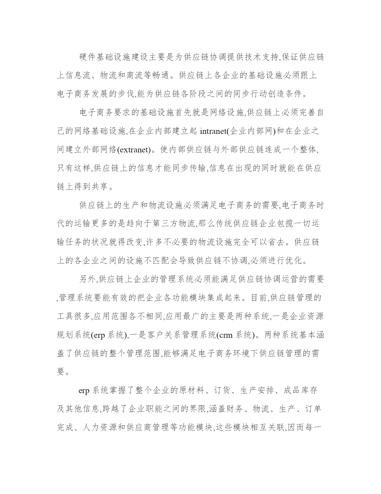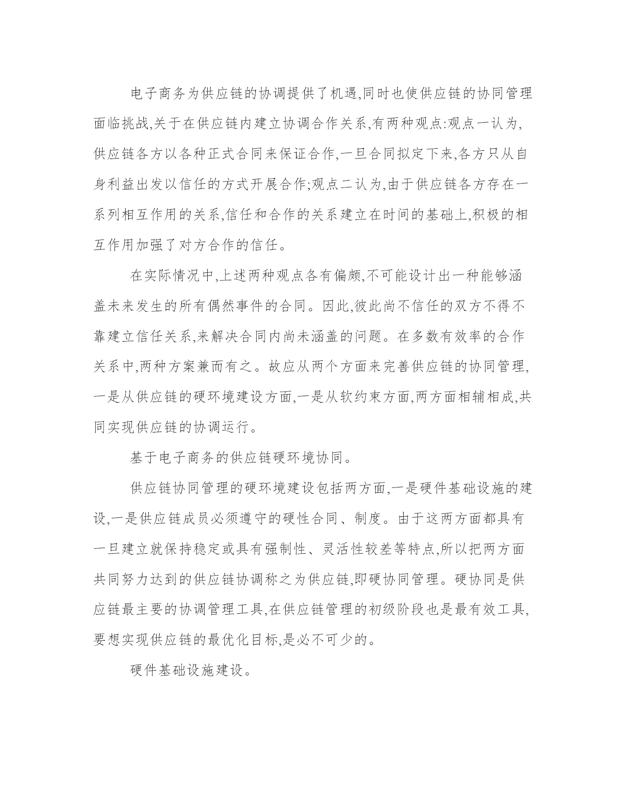 最新供应链管理论文领域分类供应链管理论文(汇总13篇)人的记忆力会随着岁月的流逝而衰退,写作可以弥补记忆的不足,将曾经的人生经历和感悟记录下来,也便于保存一份美好的回忆。范文怎么写才能发挥它最大的作用呢?以下是我为大家搜集的优质范文,仅供参考,一起来看看吧供应链管理论文领域分类篇一内容摘要:随着电子商务不断深入的分析和发展,供应链管理逐渐引起重视。本文就电子商务环境下的供应链协同管理策略进行了探讨。作为网络经济的必然产物,电子商务掀起了经济领域的一场革命。面对电子商务大潮,众多企业最关心的是如何通过电子商务解决企业的供应链管理问题。供应链是指从产品开发到售后服务过程中形成的各个环节纵向一体化网络,是对整个供应链的各参与组织或部门之间的物流、资金流和信息流进行计划、协调和控制等,其目的是通过优化提高所有相关过程的速度和确定性,使所有相关过程的净增加值最大化,并提高组织效率和效益。供应链管理是基于供应链网络上的各组织或部门具有一个共同的战略目标基础上的管理,它将整个供应链看成一个有机整体,体现了系统管理的思想。电子商务为供应链的协调提供了机遇,同时也使供应链的协同管理面临挑战,关于在供应链内建立协调合作关系,有两种观点:观点一认为,供应链各方以各种正式合同来保证合作,一旦合同拟定下来,各方只从自身利益出发以信任的方式开展合作;观点二认为,由于供应链各方存在一系列相互作用的关系,信任和合作的关系建立在时间的基础上,积极的相互作用加强了对方合作的信任。在实际情况中,上述两种观点各有偏颇,不可能设计出一种能够涵盖未来发生的所有偶然事件的合同。因此,彼此尚不信任的双方不得不靠建立信任关系,来解决合同内尚未涵盖的问题。在多数有效率的合作关系中,两种方案兼而有之。故应从两个方面来完善供应链的协同管理,一是从供应链的硬环境建设方面,一是从软约束方面,两方面相辅相成,共同实现供应链的协调运行。基于电子商务的供应链硬环境协同。供应链协同管理的硬环境建设包括两方面,一是硬件基础设施的建设,一是供应链成员必须遵守的硬性合同、制度。由于这两方面都具有一旦建立就保持稳定或具有强制性、灵活性较差等特点,所以把两方面共同努力达到的供应链协调称之为供应链,即硬协同管理。硬协同是供应链最主要的协调管理工具,在供应链管理的初级阶段也是最有效工具,要想实现供应链的最优化目标,是必不可少的。硬件基础设施建设。硬件基础设施建设主要是为供应链协调提供技术支持,保证供应链上信息流、物流和商流等畅通。供应链上各企业的基础设施必须跟上电子商务发展的步伐,能为供应链各阶段之间的同步行动创造条件。电子商务要求的基础设施首先就是网络设施,供应链上必须完善自己的网络基础设施,在企业内部建立起intranet(企业内部网)和在企业之间建立外部网络(extranet)。使内部供应链与外部供应链连成一个整体,只有这样,供应链上的信息才能同步传输,信息在出现的同时就能在供应链上得到共享。供应链上的生产和物流设施必须满足电子商务的需要,电子商务时代的运输更多的是趋向于第三方物流,那么传统供应链企业包揽一切运输任务的状况就得改变,许多不必要的物流设施完全可以省去。供应链上的各企业之间的设施不匹配会导致供应链不协调,必须进行优化。另外,供应链上企业的管理系统必须能满足供应链协调运营的需要,管理系统要能有效的把企业各功能模块集成起来。目前,供应链管理的工具很多,应用范围各不相同,应用最广的主要是两种系统,一是企业资源规划系统(erp系统),一是客户关系管理系统(crm系统)。两种系统基本涵盖了供应链的整个管理范围,能够满足电子商务环境下供应链管理的需要。erp系统掌握了整个企业的原材料、订货、生产安排、成品库存及其他信息,跨越了企业职能之间的界限,涵盖财务、物流、生产、订单完成、人力资源和供应商管理等功能模块,这些模块相互关联,因而每一职能的使用者均能知道公司其他领域发生的情况。企业资源规划系统不仅仅纪录整个系统状况,同时还帮助企业实现自动化、提高效率、减少失误。此外,erp系统的杰出之处在于实时提供广阔视野。crm系统是一种旨在改善企业与客户之间关系的新型管理机制,具有收集、分析和利用各种关系获得客户信息的功能,从而帮助企业充分利用客户关系资源,扩展新的市场和业务渠道,提高客户满意度和企业盈利能力。crm与业务流程紧密结合,加强了各个环节之间的联系,实现了业务流程的自动化,它一般由销售、市场营销、服务、电子商务和电话中心五个功能应用组件构成。合同制度的建立。对供应链的协调起着关键作用的合同机制主要有以下几方面:。信息共享机制供应链要通过联合预测与规划来实现协调,前提是必须要有共享信息,减少供应链上的波动,必须保证各阶段决策的基础数据如销售量、需求量和库存量等的一