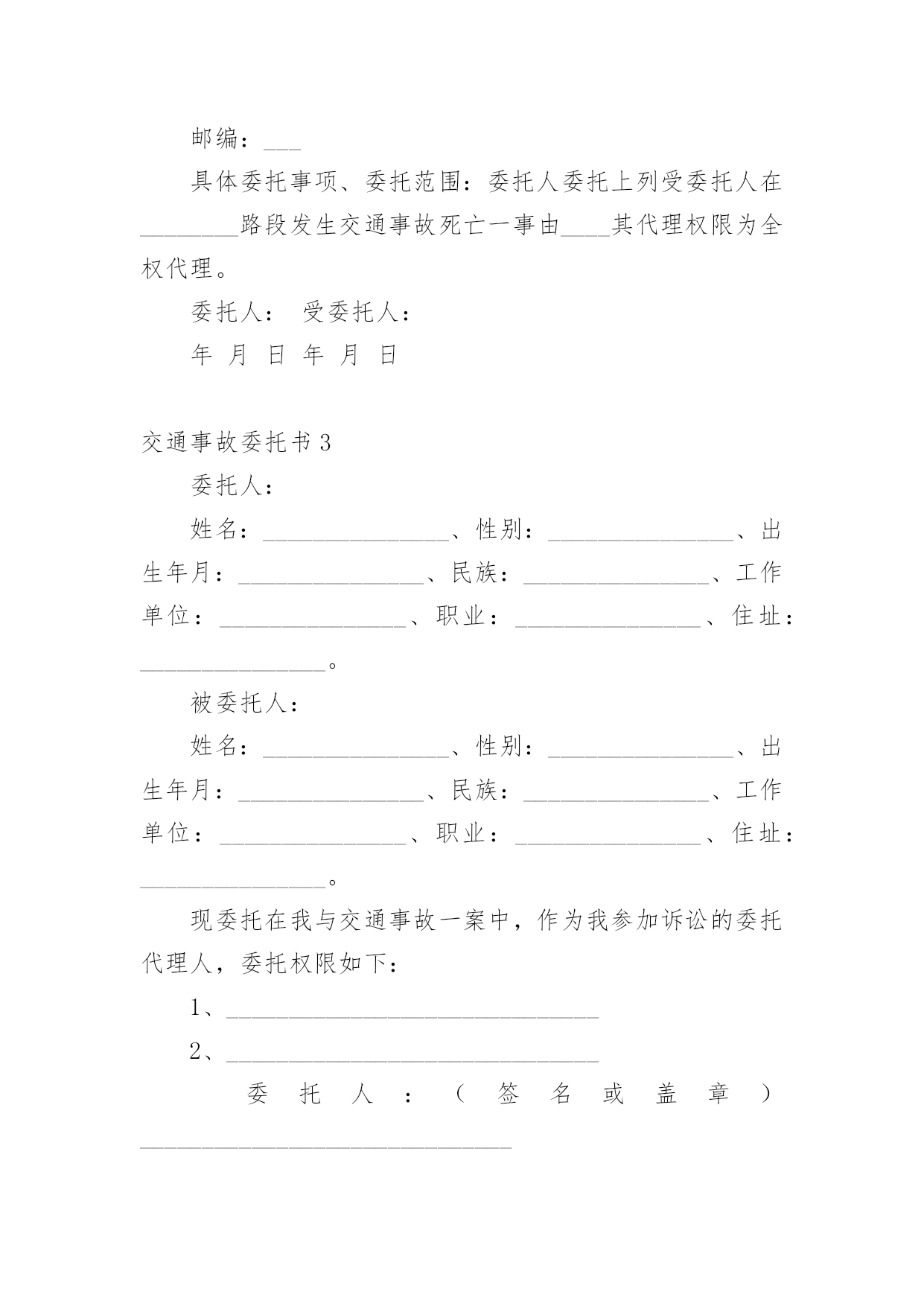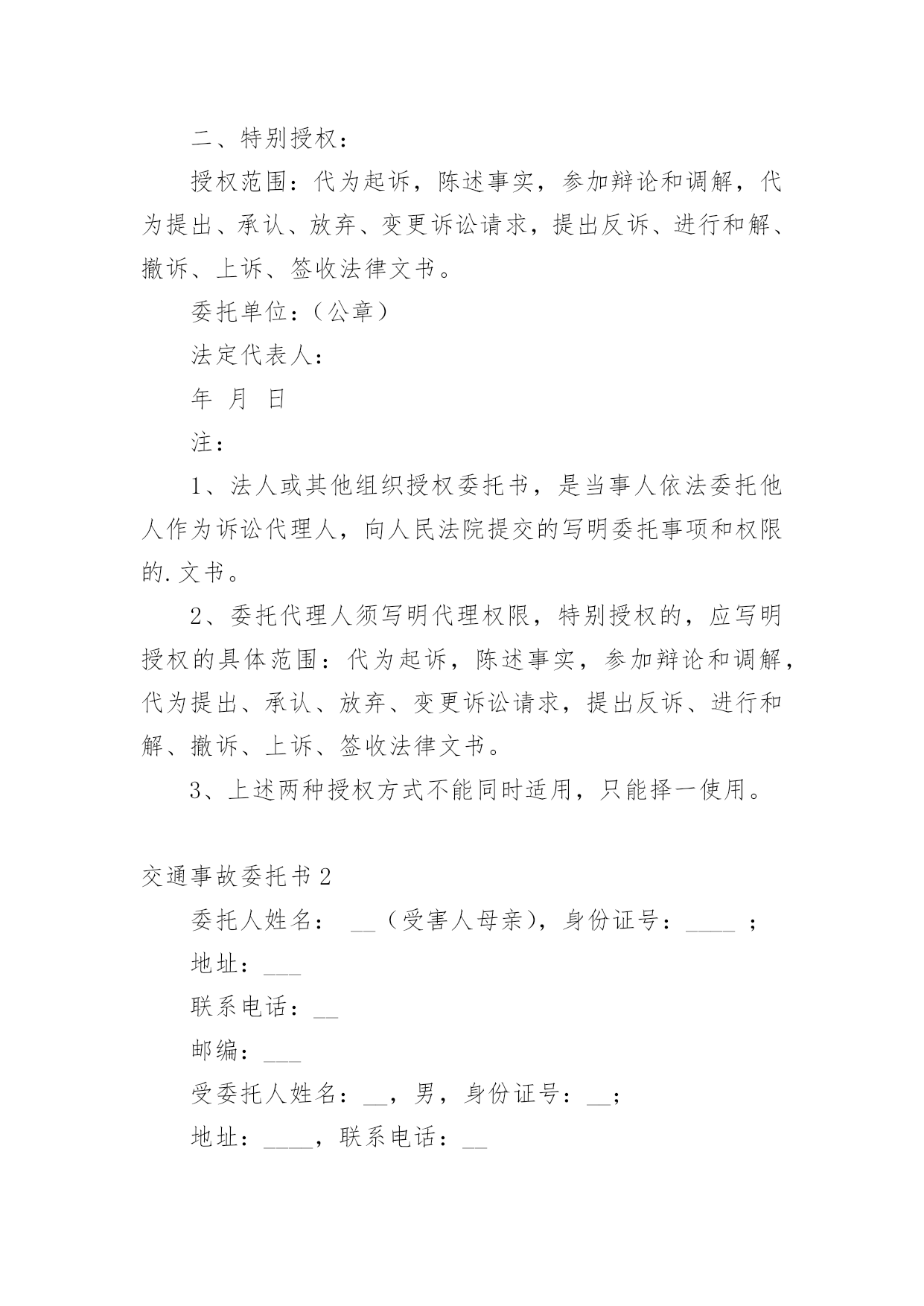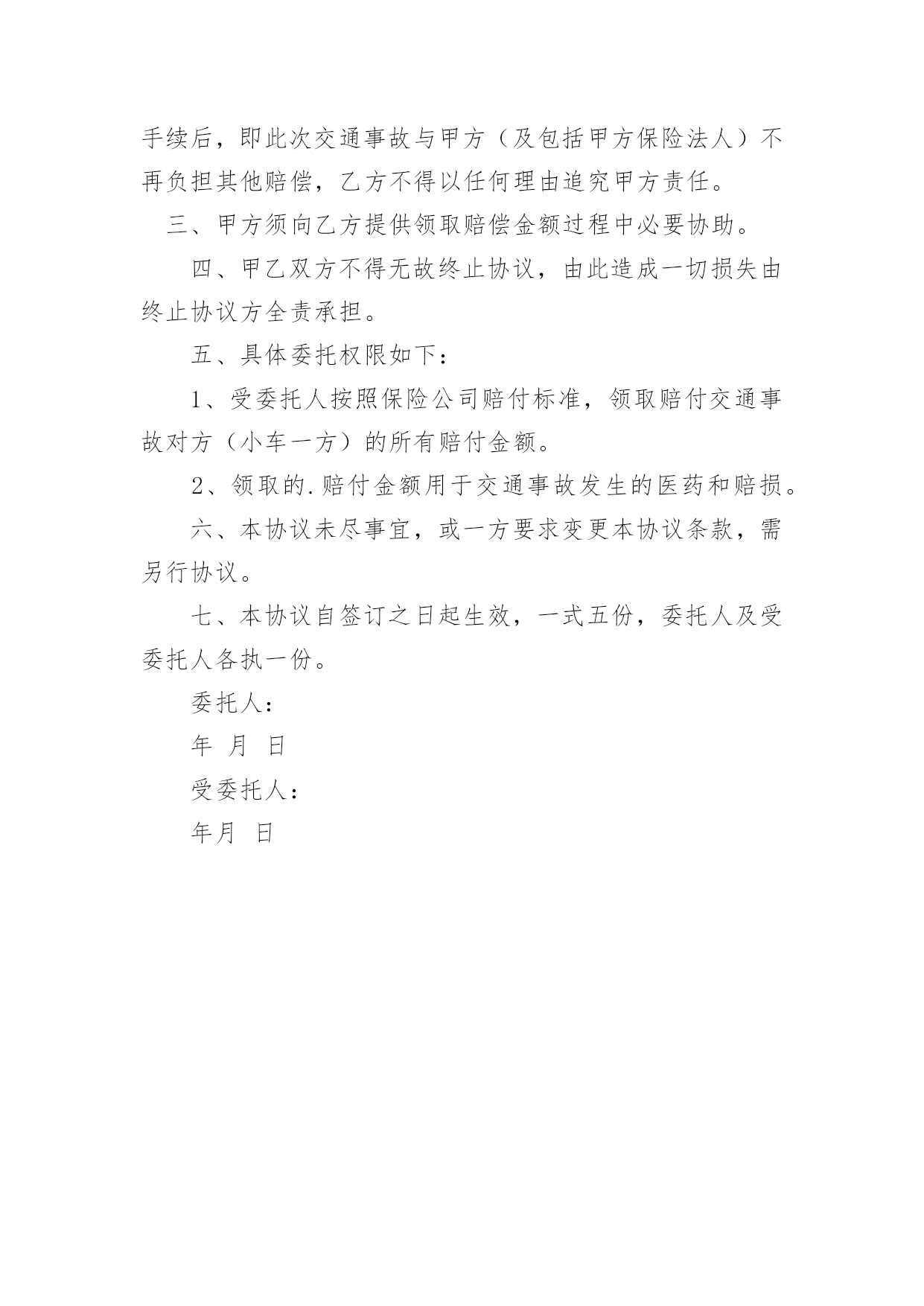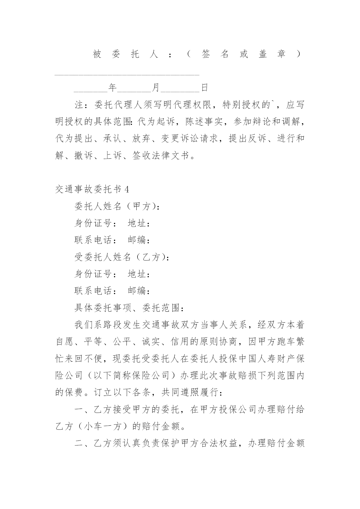 交通事故委托书(通用)交通事故委托书委托书委托他人代表自己行使自己的合法权益时,委托人不得以任何理由反悔委托事项。在日新月异的现代社会中,需要在处理事务上使用委托书的次数愈发增多,那么一般委托书是怎么写的呢?以下是小编为大家整理的交通事故委托书,希望能够帮助到大家。交通事故委托书1委托单位名称:住所地:法定代表人或主要负责人姓名:职务:受委托人姓名:性别:年龄:工作单位:职务:住址:电话:现委托___在我单位与____交通事故一案中,作为我方参诉讼的委托代理人,委托权限如下:一、一般授权二、特别授权:授权范围:代为起诉,陈述事实,参加辩论和调解,代为提出、承认、放弃、变更诉讼请求,提出反诉、进行和解、撤诉、上诉、签收法律文书。委托单位:(公章)法定代表人:年月日注:1、法人或其他组织授权委托书,是当事人依法委托他人作为诉讼代理人,向人民法院提交的写明委托事项和权限的.文书。2、委托代理人须写明代理权限,特别授权的,应写明授权的具体范围:代为起诉,陈述事实,参加辩论和调解,代为提出、承认、放弃、变更诉讼请求,提出反诉、进行和解、撤诉、上诉、签收法律文书。3、上述两种授权方式不能同时适用,只能择一使用。交通事故委托书2委托人姓名:__(受害人母亲),身份证号:____;地址:___联系电话:__邮编:___受委托人姓名:__,男,身份证号:__;地址:____,联系电话:__邮编:___具体委托事项、委托范围:委托人委托上列受委托人在________路段发生交通事故死亡一事由____其代理权限为全权代理。委托人:受委托人:年月日年月日交通事故委托书3委托人:姓名:_______________、性别:_______________、出生年月:_______________、民族:_______________、工作单位:_______________、职业:_______________、住址:_______________。被委托人:姓名:_______________、性别:_______________、出生年月:_______________、民族:_______________、工作单位:_______________、职业:_______________、住址:_______________。现委托在我与交通事故一案中,作为我参加诉讼的委托代理人,委托权限如下:1、______________________________2、______________________________委托人:(签名或盖章)______________________________被委托人:(签名或盖章)_____________________________________年_______月________日注:委托代理人须写明代理权限,特别授权的`,应写明授权的具体范围:代为起诉,陈述事实,参加辩论和调解,代为提出、承认、放弃、变更诉讼请求,提出反诉、进行和解、撤诉、上诉、签收法律文书。交通事故委托书4委托人姓名(甲方):身份证号:地址:联系电话:邮编:受委托人姓名(乙方):身份证号:地址:联系电话:邮编:具体委托事项、委托范围:我们系路段发生交通事故双方当事人关系,经双方本着自愿、平等、公平、诚实、信用的原则协商,因甲方跑车繁忙来回不便,现委托受委托人在委托人投保中国人寿财产保险公司(以下简称保险公司)办理此次事故赔损下列范围内的保费。订立以下各条,共同遵照履行:一、乙方接受甲方的委托,在甲方投保公司办理赔付给乙方(小车一方)的赔付金额。二、乙方须认真负责保护甲方合法权益,办理赔付金额手续后,即此次交通事故与甲方(及包括甲方保险法人)不再负担其他赔偿,乙方不得以任何理由追究甲方责任。三、甲方须向乙方提供领取赔偿金额过程中必要协助。四、甲乙双方不得无故终止协议,由此造成一切损失由终止协议方全责承担。五、具体委托权限如下:1、受委托人按照保险公司赔付标准,领取赔付交通事故对方(小车一方)的所有赔付金额。2、领取的.赔付金额用于交通事故发生的医药和赔损。六、本协议未尽事宜,或一方要求变更本协议条款,需另行协议。七、本协议自签订之日起生效,一式五份,委托人及受委托人各执一份。委托人:年月日受委托人:年月日