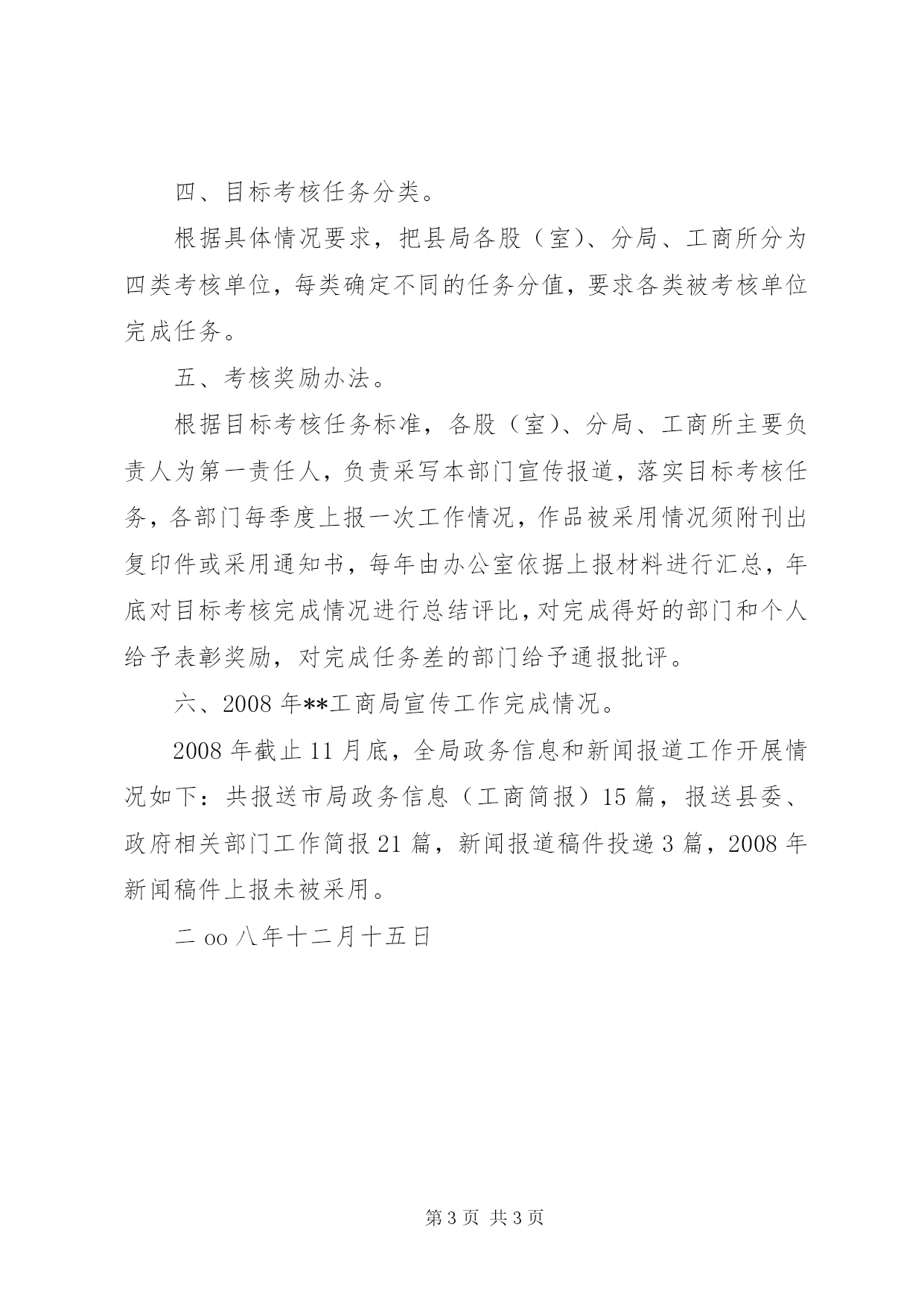 第PAGE\*Arabic\*MERGEFORMAT3页共NUMPAGES\*MERGEFORMAT3页工商局宣传工作总结为了进一步加强**县工商局对外宣传工作力度,提高我局新闻报道、政务信息宣传的质量和水平,通过宣传工作扩大**工商局的影响,使地方党委、政府、社会各界和广大人民群众更真实地了解我局工作的开展情况,促进管理职能到位,树立良好的工商队伍精神风貌。局党组非常重视宣传工作的开展,现在把**工商局2008年宣传工作作如下总结。一、统一思想、提高认识。为深入贯彻党的路线、方针、政策,加大工商行政管理法律法规的宣传,以应对日益繁重的市场监管、行政执法任务以及新形势的要求,进一步统一思想、提高认识,加大我局对外宣传力度,对于反映工商行政管理工作实际情况,争取社会各界和广大人民群众的理解和支持,推动工商事业的向前发展,将发挥越来越重要的作用。我局宣传工作坚持以马列主义、毛泽东思想、邓小平理论和“三个代表”重要思想为指导,坚持党性、坚持解放思想、实事求是的原则,真实地反映社会主义市场经济秩序管理工作中各个方面的内容,为改革开放和社会主义现代化建设营造良好的氛围。二、明确宣传工作任务。认真贯彻团结稳定、正面宣传为主的方针,弘扬团结奋进,激昂向上的精神,唱响主旋律,着力宣传工商工作中涌现出的先进集体、先进个人、先进事迹。通过宣传报道典型的人和事,达到鼓励先进、鞭策后进,创造良好的舆论环境,全面翔实地反映我局工商工作的开展情况。坚持依法行政,推进职能到位,圆满地完成工商行政管理各项工作任务。三、建立量化目标考核管理制度。为充分调动我局人员积极性,鼓励大家积极采写具有时代特色,反映工商工作开展情况和表现工商干部队伍精神风貌的政务信息,新闻报道,把宣传工作抓出成效,在市局考核的基础上,我局建立了量化目标考核管理制度,并不断加以完善,使制度建设逐步科学化、规范化。(一)目标考核对象。县局各股(室)、工商分局、工商所。(二)目标考核范围。宣传目标考核的政务信息、新闻稿件,以反映工商行政管理工作中的典型事迹为主要内容,无论稿件来源于系统内部干部职工,还是来源于新闻单位及社会各界,只要是正面反映工商行政管理工作情况,并被党委、政府、各级新闻单位和上级主管部门采用的宣传报道(含图片新闻),均属对外宣传考核的范围。(三)目标考核计分办法。各类宣传报道稿件,按照被采用的报刊级别、篇次,规定给予不同的分值。四、目标考核任务分类。根据具体情况要求,把县局各股(室)、分局、工商所分为四类考核单位,每类确定不同的任务分值,要求各类被考核单位完成任务。五、考核奖励办法。根据目标考核任务标准,各股(室)、分局、工商所主要负责人为第一责任人,负责采写本部门宣传报道,落实目标考核任务,各部门每季度上报一次工作情况,作品被采用情况须附刊出复印件或采用通知书,每年由办公室依据上报材料进行汇总,年底对目标考核完成情况进行总结评比,对完成得好的部门和个人给予表彰奖励,对完成任务差的部门给予通报批评。六、2008年**工商局宣传工作完成情况。2008年截止11月底,全局政务信息和新闻报道工作开展情况如下:共报送市局政务信息(工商简报)15篇,报送县委、政府相关部门工作简报21篇,新闻报道稿件投递3篇,2008年新闻稿件上报未被采用。二oo八年十二月十五日