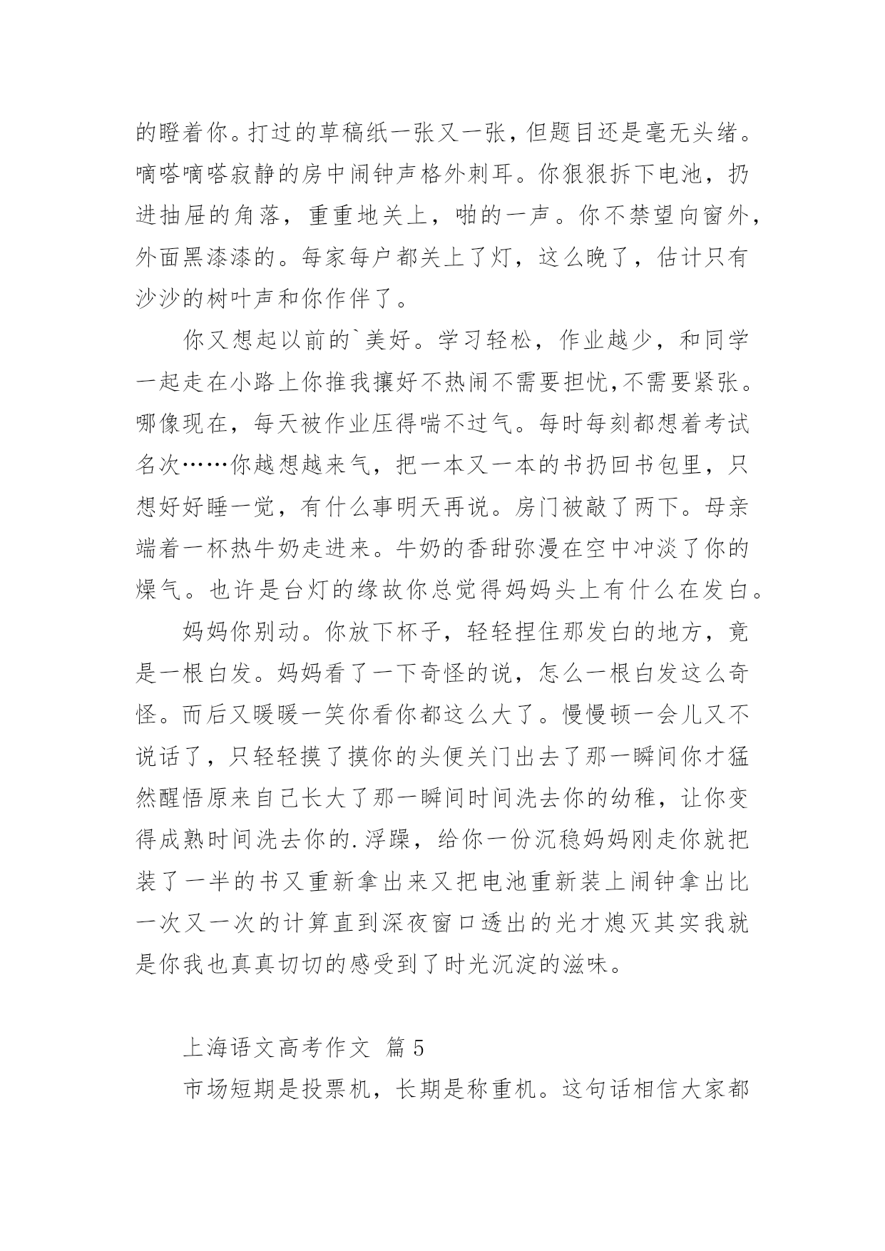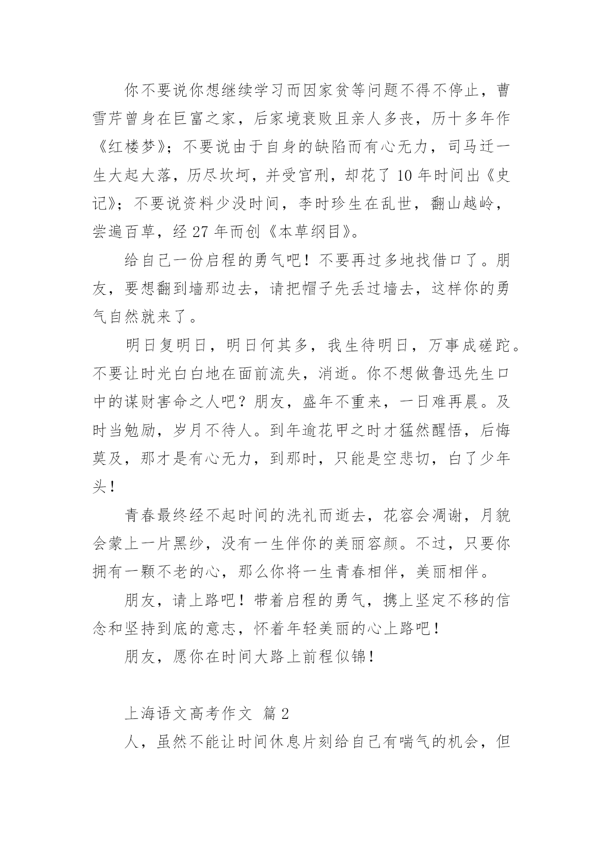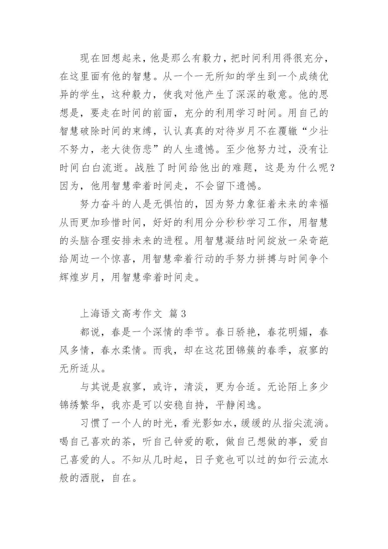 上海语文高考作文2021年上海语文高考作文(精选15篇)在日常学习、工作抑或是生活中,大家都跟作文打过交道吧,作文要求篇章结构完整,一定要避免无结尾作文的出现。相信很多朋友都对写作文感到非常苦恼吧,下面是小编收集整理的2021年上海语文高考作文,仅供参考,希望能够帮助到大家。上海语文高考作文篇1高尔基曾说过:世界上最快而又最慢,最长而又最短,最平凡而又最珍贵,最容易被忽视而又最令人后悔的.,就是时间。朋友,你想让青春无悔吗?你想让生活潇洒吗?你想让美丽永伴吗那么,请君走在时间前面。早上铃响后,不在磨磨磳磳,一咕碌爬起,出门时比平时早了几分钟,哦,你成功了,如果这成为习惯的话;午饭时,平时晚食的你这次提早离席,哪怕只比一个人早,那么你成功了,如果这不是偶然的话。没错,对事情的执着加上坚持到底的精神就是走在时间前面了。社会主义的.奠基人马克思不管政府对其的压迫,不管生活的窘迫,始终如一,终于创作出巨著《资本论》;太阳中心学说的奠基人哥白尼30年如一日,甚至用他的生命去坚持走在时间的前面,还需要一种敢于启程的勇气。你不要说你想继续学习而因家贫等问题不得不停止,曹雪芹曾身在巨富之家,后家境衰败且亲人多丧,历十多年作《红楼梦》;不要说由于自身的缺陷而有心无力,司马迁一生大起大落,历尽坎坷,并受宫刑,却花了10年时间出《史记》;不要说资料少没时间,李时珍生在乱世,翻山越岭,尝遍百草,经27年而创《本草纲目》。给自己一份启程的勇气吧!不要再过多地找借口了。朋友,要想翻到墙那边去,请把帽子先丢过墙去,这样你的勇气自然就来了。明日复明日,明日何其多,我生待明日,万事成磋跎。不要让时光白白地在面前流失,消逝。你不想做鲁迅先生口中的谋财害命之人吧?朋友,盛年不重来,一日难再晨。及时当勉励,岁月不待人。到年逾花甲之时才猛然醒悟,后悔莫及,那才是有心无力,到那时,只能是空悲切,白了少年头!青春最终经不起时间的洗礼而逝去,花容会凋谢,月貌会蒙上一片黑纱,没有一生伴你的美丽容颜。不过,只要你拥有一颗不老的心,那么你将一生青春相伴,美丽相伴。朋友,请上路吧!带着启程的勇气,携上坚定不移的信念和坚持到底的意志,怀着年轻美丽的心上路吧!朋友,愿你在时间大路上前程似锦!上海语文高考作文篇2人,虽然不能让时间休息片刻给自己有喘气的机会,但是抽象的时间是可以由人的智慧来驾驭。时钟的分秒针,它们是做的机械运动是由人们的智慧牵引他们滋生的转动来为人们显现每天二十四小时的数据。其实,用智慧来牵着时间走,在现实生活中屡见不鲜了,安排好时间,做有用功,提高人的运动时间能力。冥冥之中自有安排,把时间用智慧狠狠地凝结,给人生更多的辉煌。捍卫时间,要有对时间的紧迫感充分利用每一秒钟,使在最短的时间内收获最大化。时间不等人,我们的'前辈时常告诫我们光阴似箭,日月如梭。应该多看些实事,凡事多动脑。人最聪明是有智慧,所以,一定要发奋图强,学习工作贵在勤劳与坚持。就比如,我们一个就读生同学,从外面打工回来,以前,他是个整天游手好闲,无所事事的人。后来,出去跑生意吃了没有文化的亏,他便立志要努力学习。不就插班到我们班当了插班。刚来的时候,他很郁闷,因为他连二十多个英文字母都不会背诵,给人看尽了笑话。可是他给在自己定了计划,每天学习多少内容。我们去玩篮球,他坚决不参加,一个劲的用功学习很少与同学朋友嬉耍。日积月累下来,他的学习越来越好,还时常给我们提什么“紧迫感”。初中生的我们怎么在乎得了那么多,就是与其在这黑暗的教室看书,背诵单词,还不如去玩玩体育。还玩得不亦乐乎。还记得他最习惯的就是早上起来看书,说要与时间赛跑。但是我们真的接受不了他这种所谓的“革命激情”。太难接受那种与时间赛跑的学习方法。现在回想起来,他是那么有毅力,把时间利用得很充分,在这里面有他的智慧。从一个一无所知的学生到一个成绩优异的学生,这种毅力,使我对他产生了深深的敬意。他的思想是,要走在时间的前面,充分的利用学习时间。用自己的智慧破除时间的束缚,认认真真的对待岁月不在覆辙“少壮不努力,老大徒伤悲”的人生遗憾。至少他努力过,没有让时间白白流逝。战胜了时间给他出的难题,这是为什么呢?因为,他用智慧牵着时间走,不会留下遗憾。努力奋斗的人是无惧怕的,因为努力象征着未来的幸福从而更加珍惜时间,好好的利用分分秒秒学习工作,用智慧的头脑合理安排未来的进程。用智慧凝结时间绽放一朵奇葩给周边一个惊喜,用智慧牵着行动的手努力拼搏与时间争个辉煌岁月,用智慧牵着时间走。上海语文高考作文篇3都说,春是一个深情的季节。春日骄艳,春花明媚,春风多情,春水柔情。而我,却在这花团锦簇的春季,寂寥的无所适从。与其说是寂寥,或许,清淡,更为合适。无论陌上多少锦绣繁华,我亦是可以安稳自持,平静闲逸。习惯了一个人的时光,看光影如水,缓缓的从指尖流淌。喝自己喜欢的