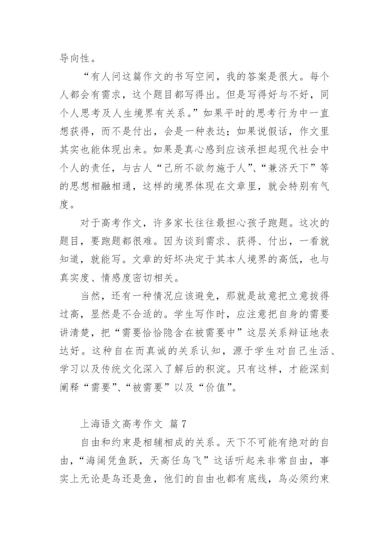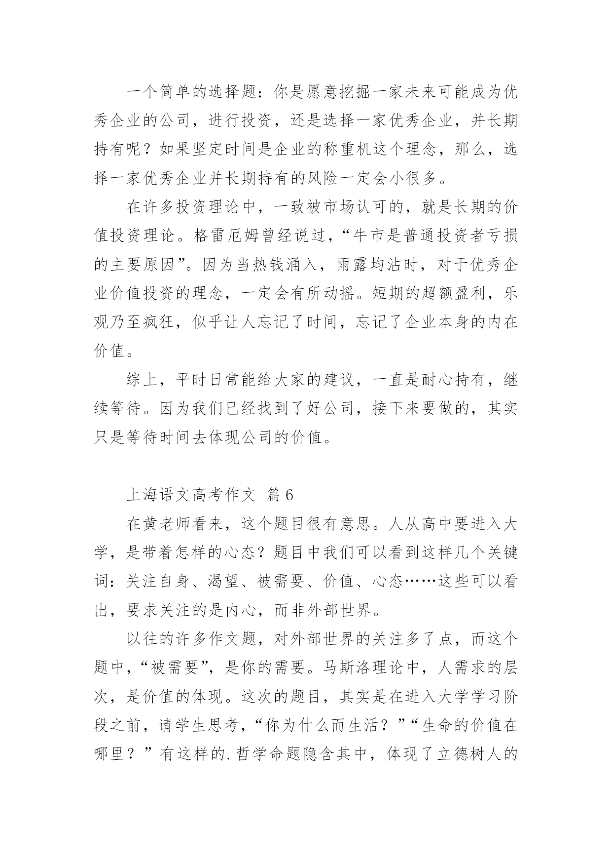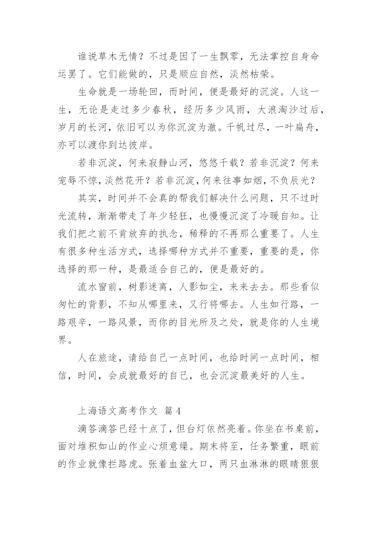 上海语文高考作文2021年上海语文高考作文(精选15篇)在日常学习、工作抑或是生活中,大家都跟作文打过交道吧,作文要求篇章结构完整,一定要避免无结尾作文的出现。相信很多朋友都对写作文感到非常苦恼吧,下面是小编收集整理的2021年上海语文高考作文,仅供参考,希望能够帮助到大家。上海语文高考作文篇1高尔基曾说过:世界上最快而又最慢,最长而又最短,最平凡而又最珍贵,最容易被忽视而又最令人后悔的.,就是时间。朋友,你想让青春无悔吗?你想让生活潇洒吗?你想让美丽永伴吗那么,请君走在时间前面。早上铃响后,不在磨磨磳磳,一咕碌爬起,出门时比平时早了几分钟,哦,你成功了,如果这成为习惯的话;午饭时,平时晚食的你这次提早离席,哪怕只比一个人早,那么你成功了,如果这不是偶然的话。没错,对事情的执着加上坚持到底的精神就是走在时间前面了。社会主义的.奠基人马克思不管政府对其的压迫,不管生活的窘迫,始终如一,终于创作出巨著《资本论》;太阳中心学说的奠基人哥白尼30年如一日,甚至用他的生命去坚持走在时间的前面,还需要一种敢于启程的勇气。你不要说你想继续学习而因家贫等问题不得不停止,曹雪芹曾身在巨富之家,后家境衰败且亲人多丧,历十多年作《红楼梦》;不要说由于自身的缺陷而有心无力,司马迁一生大起大落,历尽坎坷,并受宫刑,却花了10年时间出《史记》;不要说资料少没时间,李时珍生在乱世,翻山越岭,尝遍百草,经27年而创《本草纲目》。给自己一份启程的勇气吧!不要再过多地找借口了。朋友,要想翻到墙那边去,请把帽子先丢过墙去,这样你的勇气自然就来了。明日复明日,明日何其多,我生待明日,万事成磋跎。不要让时光白白地在面前流失,消逝。你不想做鲁迅先生口中的谋财害命之人吧?朋友,盛年不重来,一日难再晨。及时当勉励,岁月不待人。到年逾花甲之时才猛然醒悟,后悔莫及,那才是有心无力,到那时,只能是空悲切,白了少年头!青春最终经不起时间的洗礼而逝去,花容会凋谢,月貌会蒙上一片黑纱,没有一生伴你的美丽容颜。不过,只要你拥有一颗不老的心,那么你将一生青春相伴,美丽相伴。朋友,请上路吧!带着启程的勇气,携上坚定不移的信念和坚持到底的意志,怀着年轻美丽的心上路吧!朋友,愿你在时间大路上前程似锦!上海语文高考作文篇2人,虽然不能让时间休息片刻给自己有喘气的机会,但是抽象的时间是可以由人的智慧来驾驭。时钟的分秒针,它们是做的机械运动是由人们的智慧牵引他们滋生的转动来为人们显现每天二十四小时的数据。其实,用智慧来牵着时间走,在现实生活中屡见不鲜了,安排好时间,做有用功,提高人的运动时间能力。冥冥之中自有安排,把时间用智慧狠狠地凝结,给人生更多的辉煌。捍卫时间,要有对时间的紧迫感充分利用每一秒钟,使在最短的时间内收获最大化。时间不等人,我们的'前辈时常告诫我们光阴似箭,日月如梭。应该多看些实事,凡事多动脑。人最聪明是有智慧,所以,一定要发奋图强,学习工作贵在勤劳与坚持。就比如,我们一个就读生同学,从外面打工回来,以前,他是个整天游手好闲,无所事事的人。后来,出去跑生意吃了没有文化的亏,他便立志要努力学习。不就插班到我们班当了插班。刚来的时候,他很郁闷,因为他连二十多个英文字母都不会背诵,给人看尽了笑话。可是他给在自己定了计划,每天学习多少内容。我们去玩篮球,他坚决不参加,一个劲的用功学习很少与同学朋友嬉耍。日积月累下来,他的学习越来越好,还时常给我们提什么“紧迫感”。初中生的我们怎么在乎得了那么多,就是与其在这黑暗的教室看书,背诵单词,还不如去玩玩体育。还玩得不亦乐乎。还记得他最习惯的就是早上起来看书,说要与时间赛跑。但是我们真的接受不了他这种所谓的“革命激情”。太难接受那种与时间赛跑的学习方法。现在回想起来,他是那么有毅力,把时间利用得很充分,在这里面有他的智慧。从一个一无所知的学生到一个成绩优异的学生,这种毅力,使我对他产生了深深的敬意。他的思想是,要走在时间的前面,充分的利用学习时间。用自己的智慧破除时间的束缚,认认真真的对待岁月不在覆辙“少壮不努力,老大徒伤悲”的人生遗憾。至少他努力过,没有让时间白白流逝。战胜了时间给他出的难题,这是为什么呢?因为,他用智慧牵着时间走,不会留下遗憾。努力奋斗的人是无惧怕的,因为努力象征着未来的幸福从而更加珍惜时间,好好的利用分分秒秒学习工作,用智慧的头脑合理安排未来的进程。用智慧凝结时间绽放一朵奇葩给周边一个惊喜,用智慧牵着行动的手努力拼搏与时间争个辉煌岁月,用智慧牵着时间走。上海语文高考作文篇3都说,春是一个深情的季节。春日骄艳,春花明媚,春风多情,春水柔情。而我,却在这花团锦簇的春季,寂寥的无所适从。与其说是寂寥,或许,清淡,更为合适。无论陌上多少锦绣繁华,我亦是可以安稳自持,平静闲逸。习惯了一个人的时光,看光影如水,缓缓的从指尖流淌。喝自己喜欢的