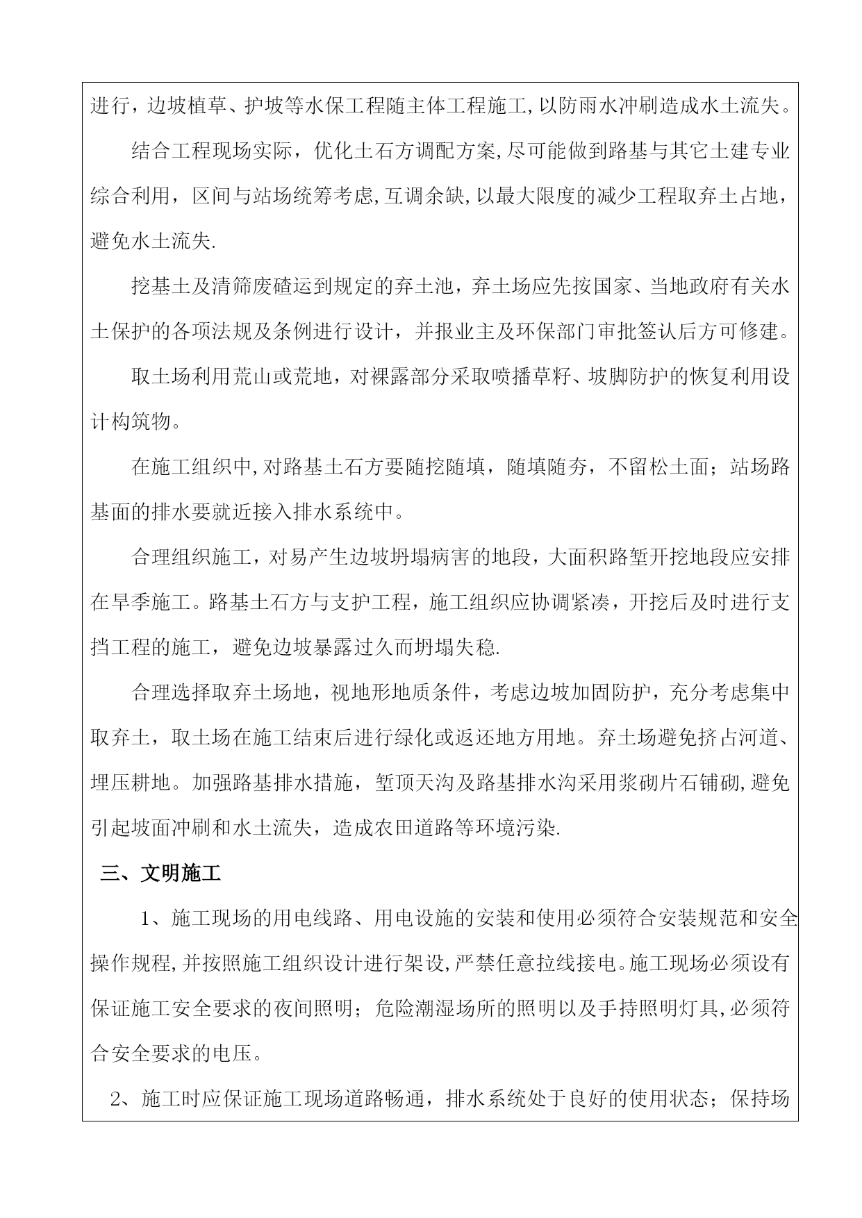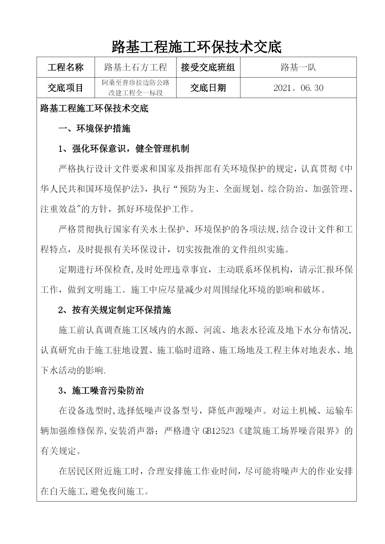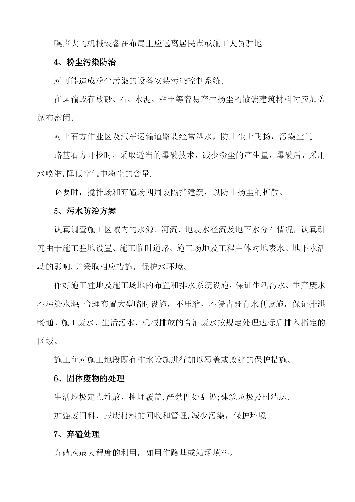 路基工程施工环保技术交底【实用文档】doc文档可直接使用可编辑,欢迎下载路基工程施工环保技术交底工程名称路基土石方工程接受交底班组路基一队交底项目阿桑至普珍拉边防公路改建工程全一标段交底日期2021。06.30路基工程施工环保技术交底一、环境保护措施1、强化环保意识,健全管理机制严格执行设计文件要求和国家及指挥部有关环境保护的规定,认真贯彻《中华人民共和国环境保护法》,执行“预防为主、全面规划、综合防治、加强管理、注重效益"的方针,抓好环境保护工作。严格贯彻执行国家有关水土保护、环境保护的各项法规,结合设计文件和工程特点,及时提报有关环保设计,切实按批准的文件组织实施。定期进行环保检查,及时处理违章事宜,主动联系环保机构,请示汇报环保工作,做到文明施工。施工中应尽量减少对周围绿化环境的影响和破坏。2、按有关规定制定环保措施施工前认真调查施工区域内的水源、河流、地表水径流及地下水分布情况,认真研究由于施工驻地设置、施工临时道路、施工场地及工程主体对地表水、地下水活动的影响.3、施工噪音污染防治在设备选型时,选择低噪声设备型号,降低声源噪声。对运土机械、运输车辆加强维修保养,安装消声器;严格遵守GB12523《建筑施工场界噪音限界》的有关规定。在居民区附近施工时,合理安排施工作业时间,尽可能将噪声大的作业安排在白天施工,避免夜间施工。噪声大的机械设备在布局上应远离居民点或施工人员驻地.4、粉尘污染防治对可能造成粉尘污染的设备安装污染控制系统。在运输或存放砂、石、水泥、粘土等容易产生扬尘的散装建筑材料时应加盖蓬布密闭。对土石方作业区及汽车运输道路要经常洒水,防止尘土飞扬,污染空气。路基石方开挖时,采取适当的爆破技术,减少粉尘的产生量,爆破后,采用水喷淋,降低空气中粉尘的含量.必要时,搅拌场和弃碴场四周设隔挡建筑,以防止扬尘的扩散。5、污水防治方案认真调查施工区域内的水源、河流、地表水径流及地下水分布情况,认真研究由于施工驻地设置、施工临时道路、施工场地及工程主体对地表水、地下水活动的影响,并采取相应措施,保护水环境。作好施工驻地及施工场地的布置和排水系统设施,保证生活污水、生产废水不污染水源;合理布置大型临时设施,不压缩、不侵占既有水利设施,保证排洪畅通。施工废水、生活污水、机械排放的含油废水按规定处理达标后排入指定的区域。施工前对施工地段既有排水设施进行加以覆盖或改建的保护措施。6、固体废物的处理生活垃圾定点堆放,掩埋覆盖,严禁四处乱扔;建筑垃圾及时清运.加强废旧料、报废材料的回收和管理,减少污染,保护环境.7、弃碴处理弃碴应最大程度的利用,如用作路基或站场填料。弃碴场尽量少占或不占耕地,弃碴场周围施做挡碴墙,碴顶和碴场周围设排水沟,以防弃碴流失。8、大气污染处理方案加强机械设备的维修保养和达标活动,减少机械废气、排烟对空气环境的污染。加强施工生活、生产保暖设备管理维修和使用,减少烟尘排放,净化空气环境。对汽油等易挥发品的存放要密闭,并尽量缩短开启时间。二、水土保持措施1、水土保持组织措施严格遵守《中华人民共和国水土保持法》、《中华人民共和国水土保持法实施条例》及地方政府有关法规、条例。保护生态,做好水土保持工作,实行“三同时”制度,加强对施工人员水土保持的教育和管理,严格按设计施工,严禁随意取土、弃碴以及对非施工用地范围的地表植被造成破坏。为保护生态环境,防止水土流失,施工时应做到全面规划,合理布局,化害为利,为当地居民创造和保持一个清洁的生活和生产环境.施工中严格按设计施工,尽量减少植被破坏,废弃的砂、石、土必须运至规定的地点堆放。工程竣工后,取土场、生活、生产用地等,必须进行复耕或植树种草,同时修建好排水系统,防止水土流失.在农田区施工时,对既有的排灌系统加以保护,必要时修建临时水渠、水管等,保证排灌系统的完整性。2、路基工程环保路基施工前优先安排排水设施施工,先修筑排水沟,路堑开挖自上而下分层进行,边坡植草、护坡等水保工程随主体工程施工,以防雨水冲刷造成水土流失。结合工程现场实际,优化土石方调配方案,尽可能做到路基与其它土建专业综合利用,区间与站场统筹考虑,互调余缺,以最大限度的减少工程取弃土占地,避免水土流失.挖基土及清筛废碴运到规定的弃土池,弃土场应先按国家、当地政府有关水土保护的各项法规及条例进行设计,并报业主及环保部门审批签认后方可修建。取土场利用荒山或荒地,对裸露部分采取喷播草籽、坡脚防护的恢复利用设计构筑物。在施工组织中,对路基土石方要随挖随填,随填随夯,不留松土面;站场路基面的排水要就近接入排水系统中。合理组织施工,对易产生边坡坍塌病害的地段,大面积路堑开挖地段应安排在旱季施工。路基土石方与支护工程,施工组织应协调紧