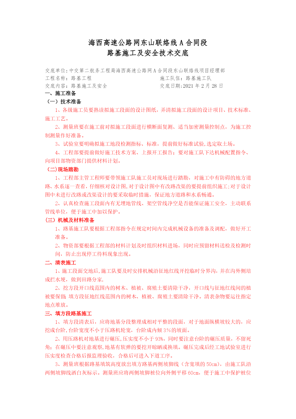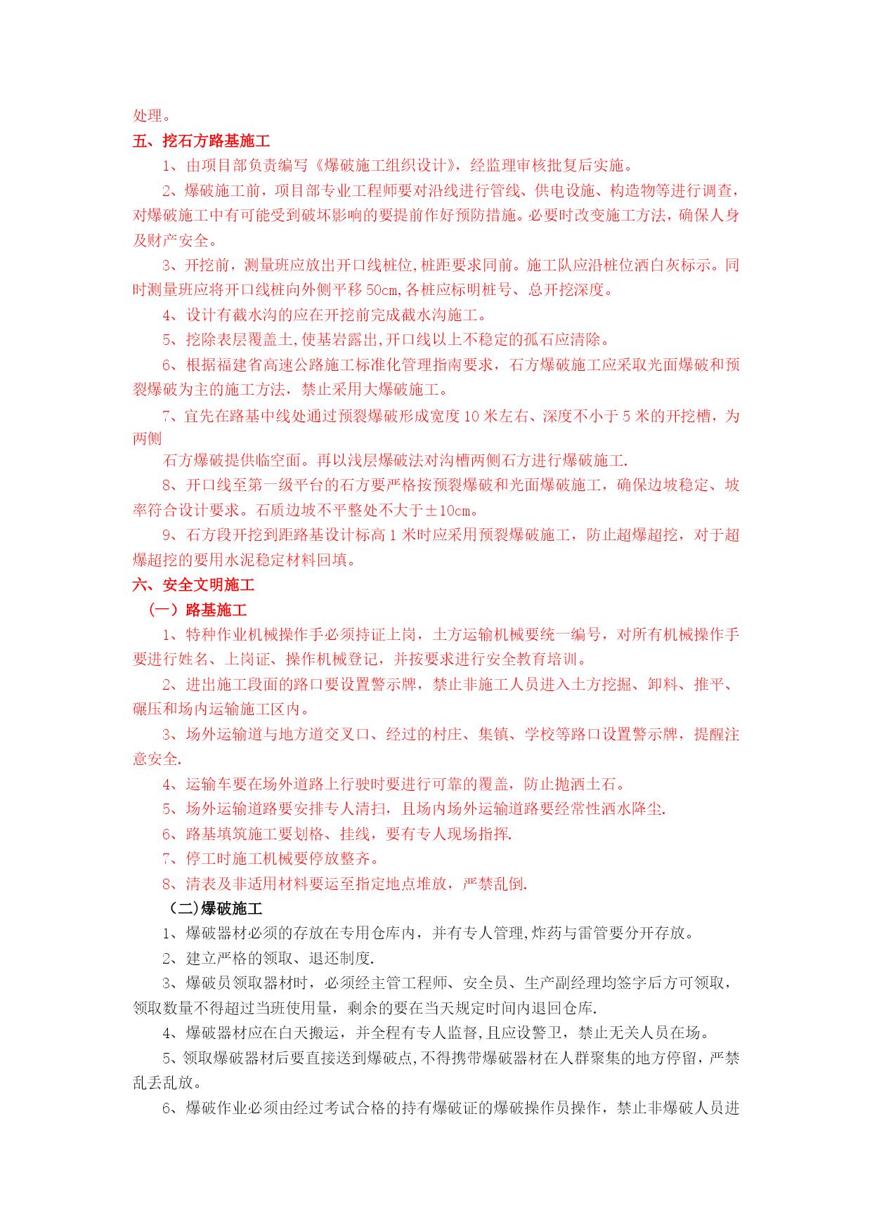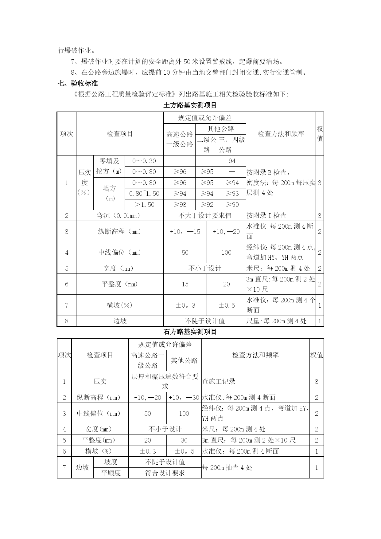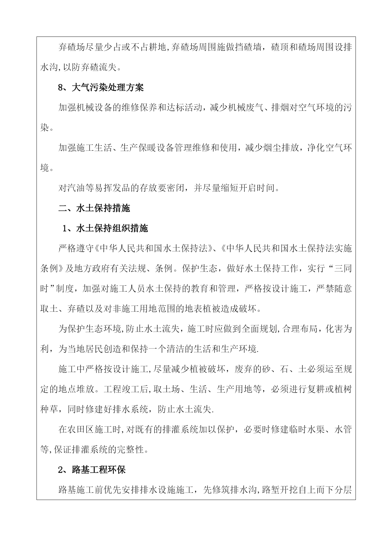 路基工程施工环保技术交底【实用文档】doc文档可直接使用可编辑,欢迎下载路基工程施工环保技术交底工程名称路基土石方工程接受交底班组路基一队交底项目阿桑至普珍拉边防公路改建工程全一标段交底日期2021。06.30路基工程施工环保技术交底一、环境保护措施1、强化环保意识,健全管理机制严格执行设计文件要求和国家及指挥部有关环境保护的规定,认真贯彻《中华人民共和国环境保护法》,执行“预防为主、全面规划、综合防治、加强管理、注重效益"的方针,抓好环境保护工作。严格贯彻执行国家有关水土保护、环境保护的各项法规,结合设计文件和工程特点,及时提报有关环保设计,切实按批准的文件组织实施。定期进行环保检查,及时处理违章事宜,主动联系环保机构,请示汇报环保工作,做到文明施工。施工中应尽量减少对周围绿化环境的影响和破坏。2、按有关规定制定环保措施施工前认真调查施工区域内的水源、河流、地表水径流及地下水分布情况,认真研究由于施工驻地设置、施工临时道路、施工场地及工程主体对地表水、地下水活动的影响.3、施工噪音污染防治在设备选型时,选择低噪声设备型号,降低声源噪声。对运土机械、运输车辆加强维修保养,安装消声器;严格遵守GB12523《建筑施工场界噪音限界》的有关规定。在居民区附近施工时,合理安排施工作业时间,尽可能将噪声大的作业安排在白天施工,避免夜间施工。噪声大的机械设备在布局上应远离居民点或施工人员驻地.4、粉尘污染防治对可能造成粉尘污染的设备安装污染控制系统。在运输或存放砂、石、水泥、粘土等容易产生扬尘的散装建筑材料时应加盖蓬布密闭。对土石方作业区及汽车运输道路要经常洒水,防止尘土飞扬,污染空气。路基石方开挖时,采取适当的爆破技术,减少粉尘的产生量,爆破后,采用水喷淋,降低空气中粉尘的含量.必要时,搅拌场和弃碴场四周设隔挡建筑,以防止扬尘的扩散。5、污水防治方案认真调查施工区域内的水源、河流、地表水径流及地下水分布情况,认真研究由于施工驻地设置、施工临时道路、施工场地及工程主体对地表水、地下水活动的影响,并采取相应措施,保护水环境。作好施工驻地及施工场地的布置和排水系统设施,保证生活污水、生产废水不污染水源;合理布置大型临时设施,不压缩、不侵占既有水利设施,保证排洪畅通。施工废水、生活污水、机械排放的含油废水按规定处理达标后排入指定的区域。施工前对施工地段既有排水设施进行加以覆盖或改建的保护措施。6、固体废物的处理生活垃圾定点堆放,掩埋覆盖,严禁四处乱扔;建筑垃圾及时清运.加强废旧料、报废材料的回收和管理,减少污染,保护环境.7、弃碴处理弃碴应最大程度的利用,如用作路基或站场填料。弃碴场尽量少占或不占耕地,弃碴场周围施做挡碴墙,碴顶和碴场周围设排水沟,以防弃碴流失。8、大气污染处理方案加强机械设备的维修保养和达标活动,减少机械废气、排烟对空气环境的污染。加强施工生活、生产保暖设备管理维修和使用,减少烟尘排放,净化空气环境。对汽油等易挥发品的存放要密闭,并尽量缩短开启时间。二、水土保持措施1、水土保持组织措施严格遵守《中华人民共和国水土保持法》、《中华人民共和国水土保持法实施条例》及地方政府有关法规、条例。保护生态,做好水土保持工作,实行“三同时”制度,加强对施工人员水土保持的教育和管理,严格按设计施工,严禁随意取土、弃碴以及对非施工用地范围的地表植被造成破坏。为保护生态环境,防止水土流失,施工时应做到全面规划,合理布局,化害为利,为当地居民创造和保持一个清洁的生活和生产环境.施工中严格按设计施工,尽量减少植被破坏,废弃的砂、石、土必须运至规定的地点堆放。工程竣工后,取土场、生活、生产用地等,必须进行复耕或植树种草,同时修建好排水系统,防止水土流失.在农田区施工时,对既有的排灌系统加以保护,必要时修建临时水渠、水管等,保证排灌系统的完整性。2、路基工程环保路基施工前优先安排排水设施施工,先修筑排水沟,路堑开挖自上而下分层进行,边坡植草、护坡等水保工程随主体工程施工,以防雨水冲刷造成水土流失。结合工程现场实际,优化土石方调配方案,尽可能做到路基与其它土建专业综合利用,区间与站场统筹考虑,互调余缺,以最大限度的减少工程取弃土占地,避免水土流失.挖基土及清筛废碴运到规定的弃土池,弃土场应先按国家、当地政府有关水土保护的各项法规及条例进行设计,并报业主及环保部门审批签认后方可修建。取土场利用荒山或荒地,对裸露部分采取喷播草籽、坡脚防护的恢复利用设计构筑物。在施工组织中,对路基土石方要随挖随填,随填随夯,不留松土面;站场路基面的排水要就近接入排水系统中。合理组织施工,对易产生边坡坍塌病害的地段,大面积路堑开挖地段应安排在旱季施工。路基土石方与支护工程,施工组织应协调紧