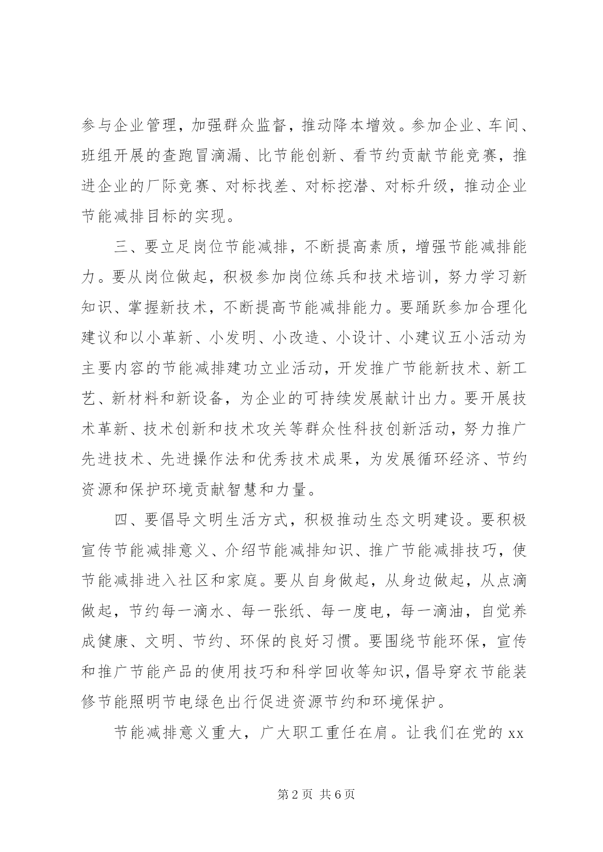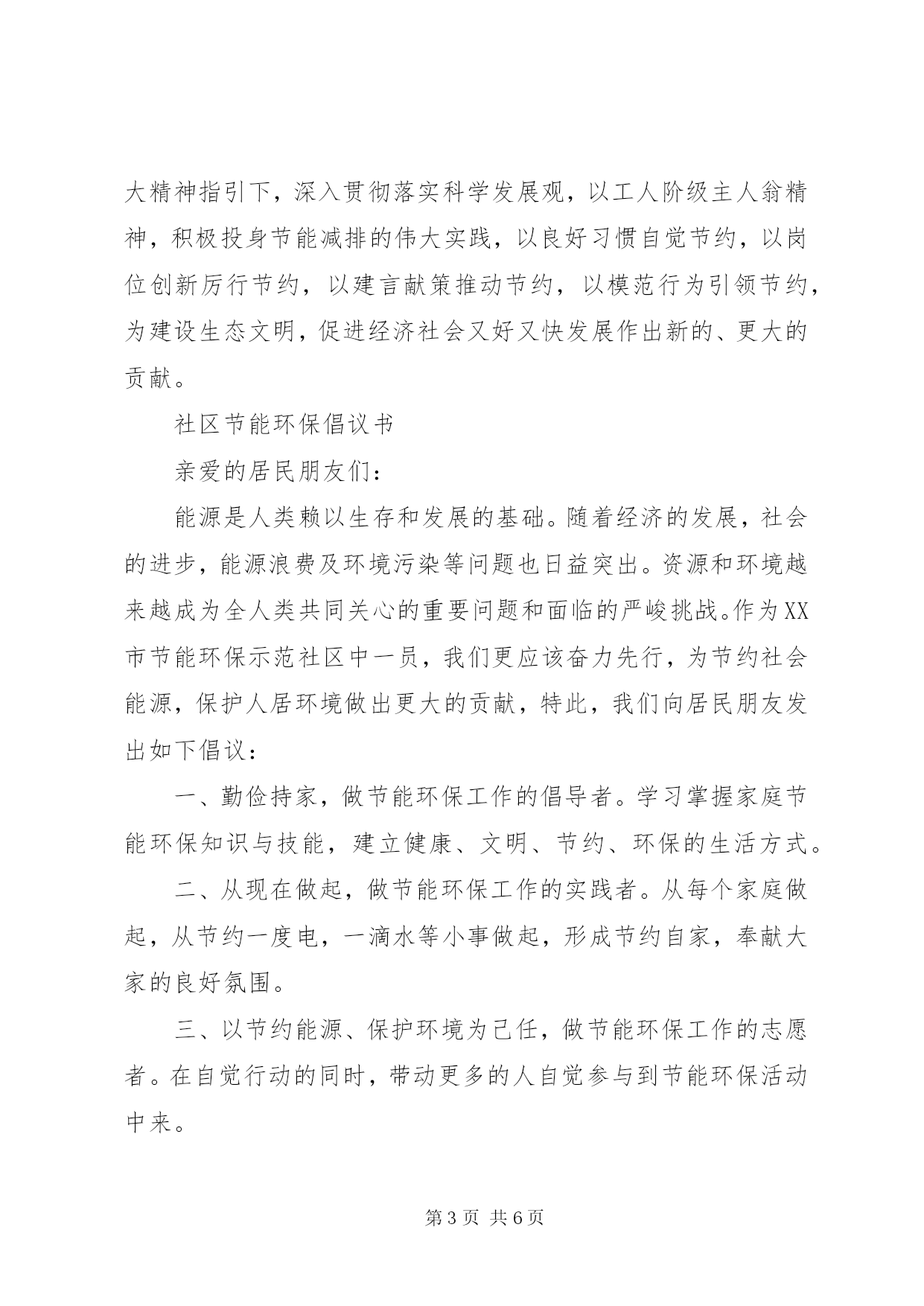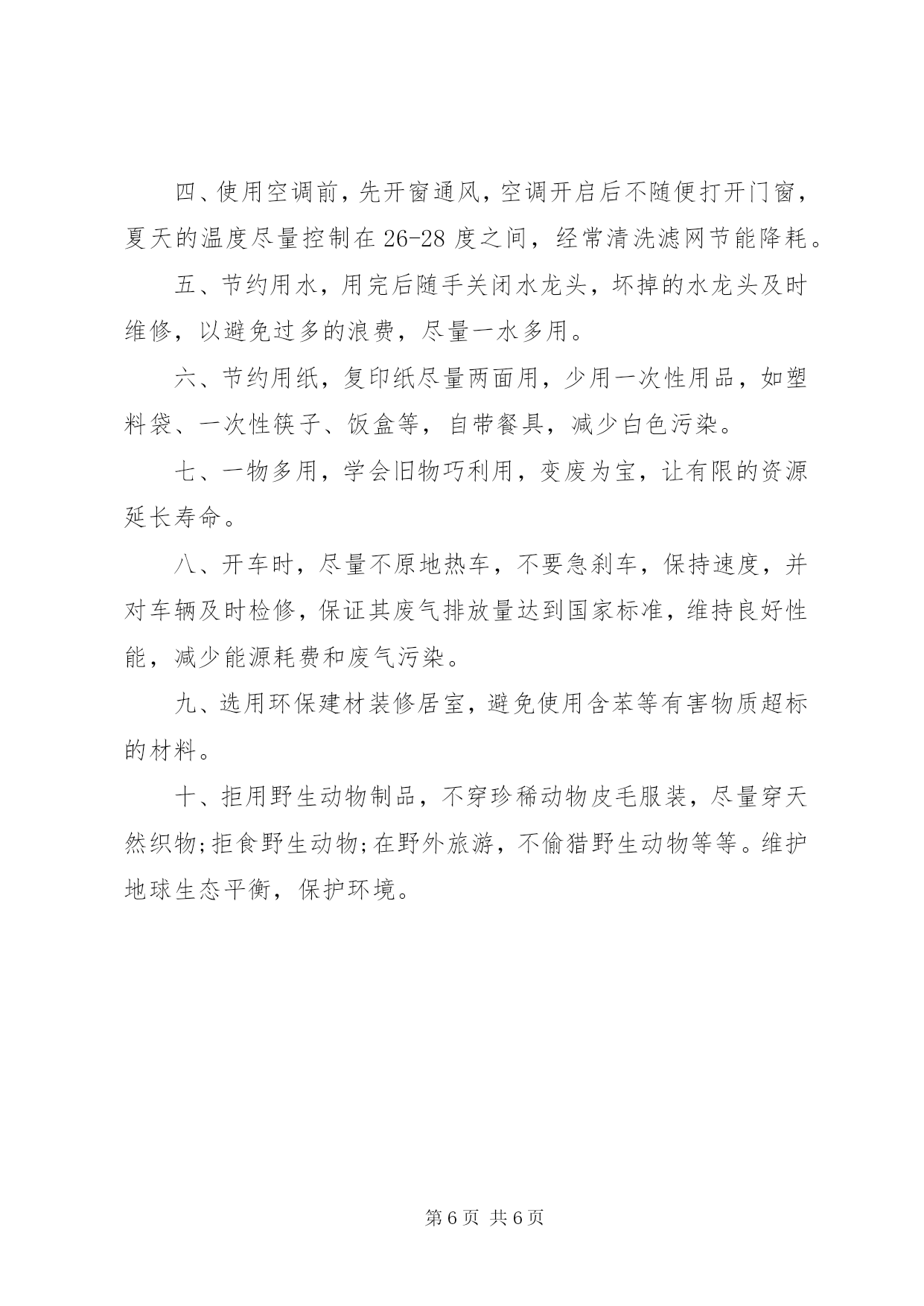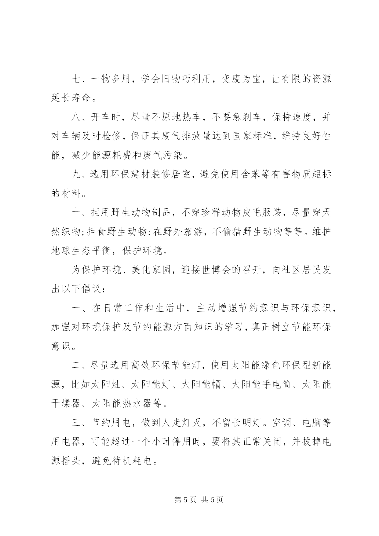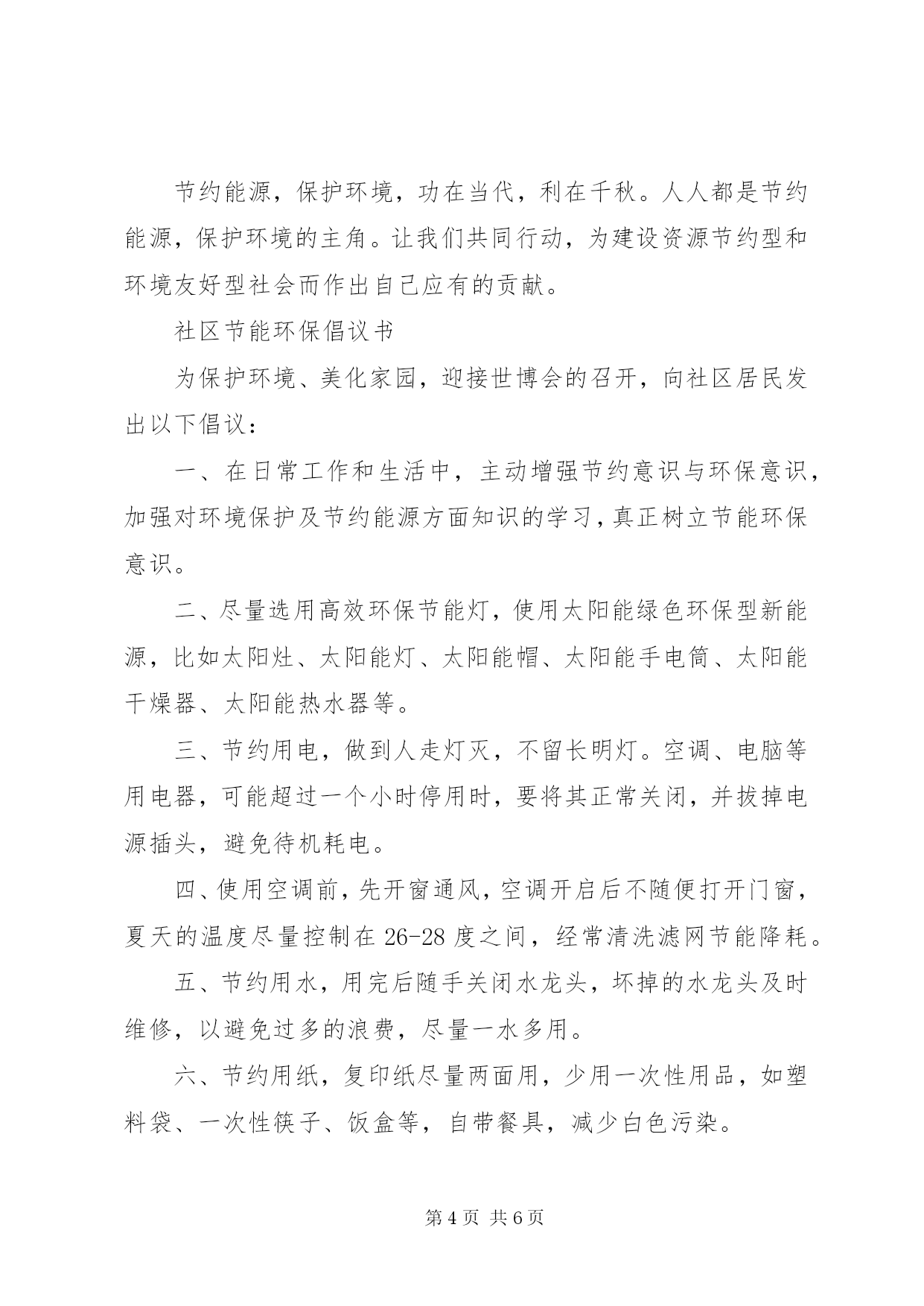 第PAGE\*Arabic\*MERGEFORMAT6页共NUMPAGES\*MERGEFORMAT6页社区节能环保倡议书社区节能环保倡议书全市居民们:坚持节约资源和保护环境是我国的基本国策,关系人民群众切身利益和中华民族的生存和发展。建设生态文明,是全面建设小康社会的必然要求。为了深入贯彻党的xx大精神,响应全总和市总工会发出的我为节能减排做贡献的号召,广泛开展职工节能减排活动,我代表各行各业的劳动模范向全市职工发出倡议如下:一、要以党的xx大精神为指导,牢固树立生态文明观。党的xx大提出,必须把建设资源节约型、环境友好型社会放在工业化、现代化发展战略的突出位置,落实到每个单位、每个家庭。企业是节能减排的主体,职工是节能减排的主力军。我们要进一步认识能源资源节约和生态环境保护的重大意义,不断增强节能减排的紧迫感、使命感和责任感,牢固树立生态文明观和节能环保理念,使节能减排成为我们的自觉行动,人人争做节能标兵、减排楷模。二、要围绕节能减排重点,广泛开展立功竞赛活动。要围绕XX省节能减排的要求,积极开展群众性节能减排竞赛活动。落实节能减排措施,查找薄弱环节,堵塞漏洞,挖掘潜力,最大限度地减少能源消耗和污染排放。要围绕企业节能减排目标,积极参与企业管理,加强群众监督,推动降本增效。参加企业、车间、班组开展的查跑冒滴漏、比节能创新、看节约贡献节能竞赛,推进企业的厂际竞赛、对标找差、对标挖潜、对标升级,推动企业节能减排目标的实现。三、要立足岗位节能减排,不断提高素质,增强节能减排能力。要从岗位做起,积极参加岗位练兵和技术培训,努力学习新知识、掌握新技术,不断提高节能减排能力。要踊跃参加合理化建议和以小革新、小发明、小改造、小设计、小建议五小活动为主要内容的节能减排建功立业活动,开发推广节能新技术、新工艺、新材料和新设备,为企业的可持续发展献计出力。要开展技术革新、技术创新和技术攻关等群众性科技创新活动,努力推广先进技术、先进操作法和优秀技术成果,为发展循环经济、节约资源和保护环境贡献智慧和力量。四、要倡导文明生活方式,积极推动生态文明建设。要积极宣传节能减排意义、介绍节能减排知识、推广节能减排技巧,使节能减排进入社区和家庭。要从自身做起,从身边做起,从点滴做起,节约每一滴水、每一张纸、每一度电,每一滴油,自觉养成健康、文明、节约、环保的良好习惯。要围绕节能环保,宣传和推广节能产品的使用技巧和科学回收等知识,倡导穿衣节能装修节能照明节电绿色出行促进资源节约和环境保护。节能减排意义重大,广大职工重任在肩。让我们在党的xx大精神指引下,深入贯彻落实科学发展观,以工人阶级主人翁精神,积极投身节能减排的伟大实践,以良好习惯自觉节约,以岗位创新厉行节约,以建言献策推动节约,以模范行为引领节约,为建设生态文明,促进经济社会又好又快发展作出新的、更大的贡献。社区节能环保倡议书亲爱的居民朋友们:能源是人类赖以生存和发展的基础。随着经济的发展,社会的进步,能源浪费及环境污染等问题也日益突出。资源和环境越来越成为全人类共同关心的重要问题和面临的严峻挑战。作为XX市节能环保示范社区中一员,我们更应该奋力先行,为节约社会能源,保护人居环境做出更大的贡献,特此,我们向居民朋友发出如下倡议:一、勤俭持家,做节能环保工作的倡导者。学习掌握家庭节能环保知识与技能,建立健康、文明、节约、环保的生活方式。二、从现在做起,做节能环保工作的实践者。从每个家庭做起,从节约一度电,一滴水等小事做起,形成节约自家,奉献大家的良好氛围。三、以节约能源、保护环境为己任,做节能环保工作的志愿者。在自觉行动的同时,带动更多的人自觉参与到节能环保活动中来。节约能源,保护环境,功在当代,利在千秋。人人都是节约能源,保护环境的主角。让我们共同行动,为建设资源节约型和环境友好型社会而作出自己应有的贡献。社区节能环保倡议书为保护环境、美化家园,迎接世博会的召开,向社区居民发出以下倡议:一、在日常工作和生活中,主动增强节约意识与环保意识,加强对环境保护及节约能源方面知识的学习,真正树立节能环保意识。二、尽量选用高效环保节能灯,使用太阳能绿色环保型新能源,比如太阳灶、太阳能灯、太阳能帽、太阳能手电筒、太阳能干燥器、太阳能热水器等。三、节约用电,做到人走灯灭,不留长明灯。空调、电脑等用电器,可能超过一个小时停用时,要将其正常关闭,并拔掉电源插头,避免待机耗电。四、使用空调前,先开窗通风,空调开启后不随便打开门窗,夏天的温度尽量控制在26-28度之间,经常清洗滤网节能降耗。五、节约用水,用完后随手关闭水龙头,坏掉的水龙头及时维修,以避免过多的浪费,尽量一水多用。六、节约用纸,复印纸尽量两面用,少用一次性用品,如塑料袋、一次性筷子、饭盒等,自带餐具,减少白色污染。七、一物多用,学会旧