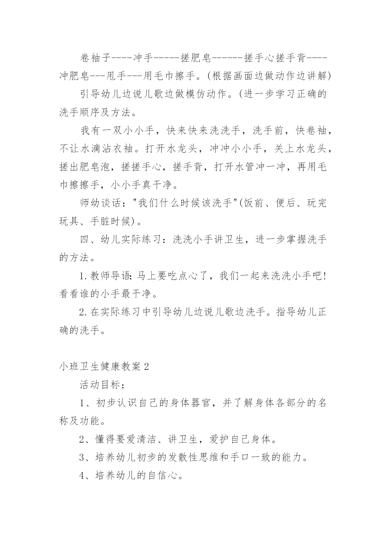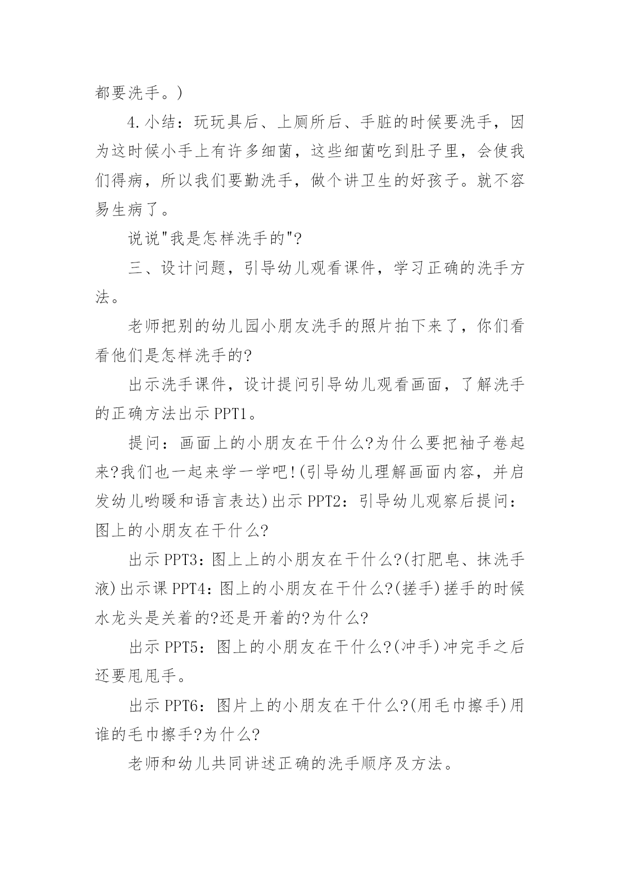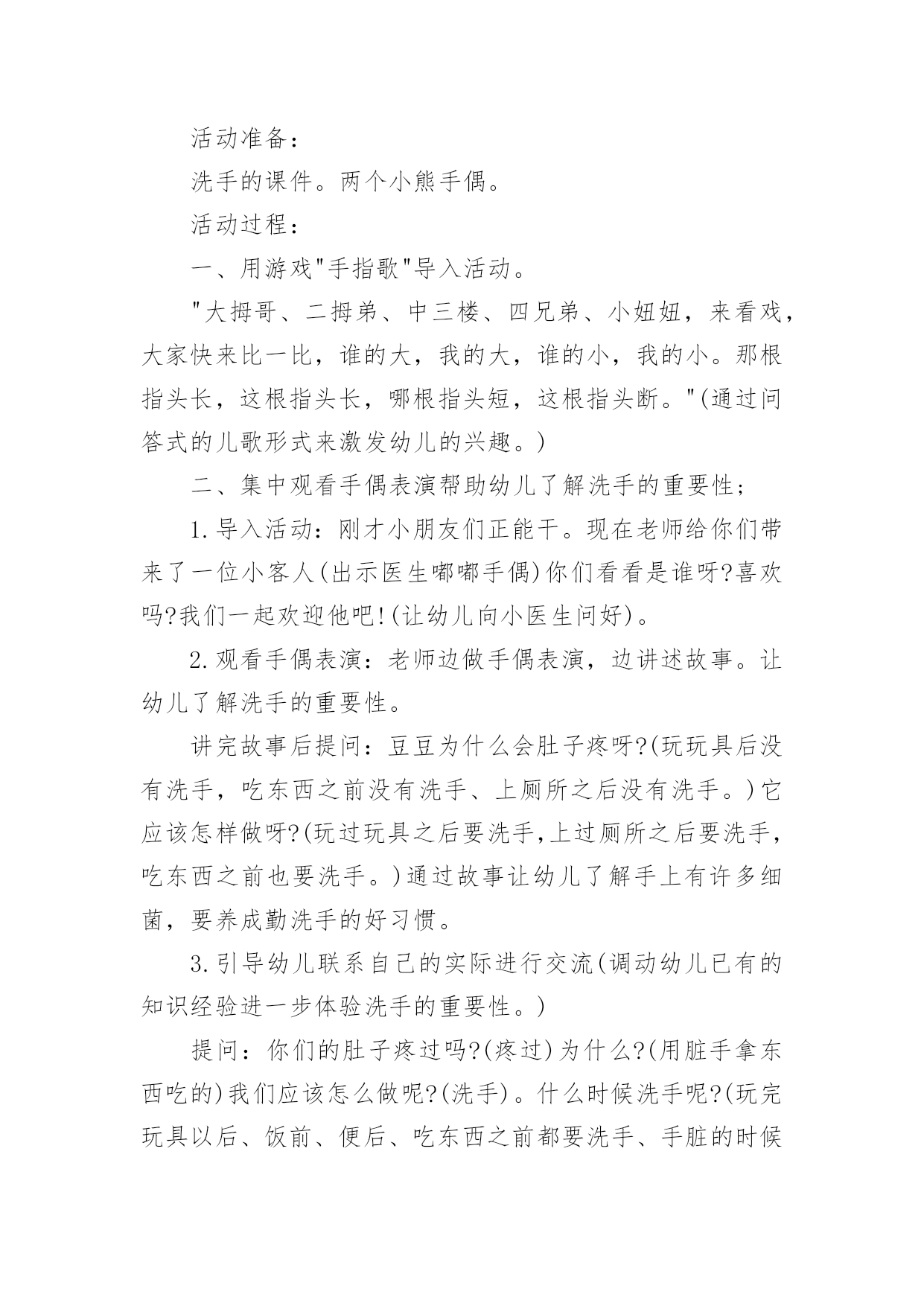 小班卫生健康教案作为一名人民教师,就难以避免地要准备教案,通过教案准备可以更好地根据具体情况对教学进程做适当的必要的调整。来参考自己需要的教案吧!下面是小编为大家收集的小班卫生健康教案,欢迎大家分享。小班卫生健康教案1设计意图:小班的孩子对自己的小手的各部分名称及用途都有了初步的认知,但许多孩子还不知道怎样正确地洗手,只是匆匆的湿一下手甚至袖口都已经潮湿了半截,地上也"发了水"。整天摸摸这、摸摸那,手上沾满各种细菌,培养幼儿养成良好的生活习惯,让幼儿具备基本的生活自理能力,是对幼儿进行健康教育的重要内容,也是幼儿身心健康的基础。活动目标:1.知道洗手的重要性。2.掌握洗手的正确方法。3.教育幼儿养成清洁卫生的良好习惯。4.培养良好的卫生习惯。5.初步了解健康的小常识。活动重点难点:活动重点:学习正确的洗手方法。活动难点:培养幼儿养成良好的`清洁卫生的好习惯。活动准备:洗手的课件。两个小熊手偶。活动过程:一、用游戏"手指歌"导入活动。"大拇哥、二拇弟、中三楼、四兄弟、小妞妞,来看戏,大家快来比一比,谁的大,我的大,谁的小,我的小。那根指头长,这根指头长,哪根指头短,这根指头断。"(通过问答式的儿歌形式来激发幼儿的兴趣。)二、集中观看手偶表演帮助幼儿了解洗手的重要性;1.导入活动:刚才小朋友们正能干。现在老师给你们带来了一位小客人(出示医生嘟嘟手偶)你们看看是谁呀?喜欢吗?我们一起欢迎他吧!(让幼儿向小医生问好)。2.观看手偶表演:老师边做手偶表演,边讲述故事。让幼儿了解洗手的重要性。讲完故事后提问:豆豆为什么会肚子疼呀?(玩玩具后没有洗手,吃东西之前没有洗手、上厕所之后没有洗手。)它应该怎样做呀?(玩过玩具之后要洗手,上过厕所之后要洗手,吃东西之前也要洗手。)通过故事让幼儿了解手上有许多细菌,要养成勤洗手的好习惯。3.引导幼儿联系自己的实际进行交流(调动幼儿已有的知识经验进一步体验洗手的重要性。)提问:你们的肚子疼过吗?(疼过)为什么?(用脏手拿东西吃的)我们应该怎么做呢?(洗手)。什么时候洗手呢?(玩完玩具以后、饭前、便后、吃东西之前都要洗手、手脏的时候都要洗手。)4.小结:玩玩具后、上厕所后、手脏的时候要洗手,因为这时候小手上有许多细菌,这些细菌吃到肚子里,会使我们得病,所以我们要勤洗手,做个讲卫生的好孩子。就不容易生病了。说说"我是怎样洗手的"?三、设计问题,引导幼儿观看课件,学习正确的洗手方法。老师把别的幼儿园小朋友洗手的照片拍下来了,你们看看他们是怎样洗手的?出示洗手课件,设计提问引导幼儿观看画面,了解洗手的正确方法出示PPT1。提问:画面上的小朋友在干什么?为什么要把袖子卷起来?我们也一起来学一学吧!(引导幼儿理解画面内容,并启发幼儿哟暖和语言表达)出示PPT2:引导幼儿观察后提问:图上的小朋友在干什么?出示PPT3:图上上的小朋友在干什么?(打肥皂、抹洗手液)出示课PPT4:图上的小朋友在干什么?(搓手)搓手的时候水龙头是关着的?还是开着的?为什么?出示PPT5:图上的小朋友在干什么?(冲手)冲完手之后还要甩甩手。出示PPT6:图片上的小朋友在干什么?(用毛巾擦手)用谁的毛巾擦手?为什么?老师和幼儿共同讲述正确的洗手顺序及方法。卷袖子----冲手-----搓肥皂------搓手心搓手背----冲肥皂---甩手---用毛巾擦手。(根据画面边做动作边讲解)引导幼儿边说儿歌边做模仿动作。(进一步学习正确的洗手顺序及方法。我有一双小小手,快来快来洗洗手,洗手前,快卷袖,不让水滴沾衣袖。打开水龙头,冲冲小小手,关上水龙头,搓出肥皂泡,搓搓手心,搓手背,打开水管冲一冲,再用毛巾擦擦手,小小手真干净。师幼谈话:"我们什么时候该洗手"(饭前、便后、玩完玩具、手脏时候)。四、幼儿实际练习:洗洗小手讲卫生,进一步掌握洗手的方法。1.教师导语:马上要吃点心了,我们一起来洗洗小手吧!看看谁的小手最干净。2.在实际练习中引导幼儿边说儿歌边洗手。指导幼儿正确的洗手。小班卫生健康教案2活动目标:1、初步认识自己的身体器官,并了解身体各部分的名称及功能。2、懂得要爱清洁、讲卫生,爱护自己身体。3、培养幼儿初步的发散性思维和手口一致的能力。4、培养幼儿的自信心。5、初步了解健康的小常识。活动准备:水果及小卡片。活动过程:一、师幼谈话引入课题今天我们的活动室来了一个水果客人老师,它们藏在魔术盒里,我们一起把它们请出来。二、认识身体各部分你们看到了什么?苹果请问你们是用什么能看见苹果的?眼睛你的眼睛在哪里,小朋友用小手摸摸你的小眼睛。我们的眼睛可以做什么?(看老师,看爸爸妈妈)还可以干什么?(看书)我们闻一闻苹果是什么味道?香香的请问你们是用什么闻出苹果的香味的?鼻子指指看我们的鼻子在哪里?鼻子有什么用途?我们摸一摸苹果表面是什么样的?光滑的请问你