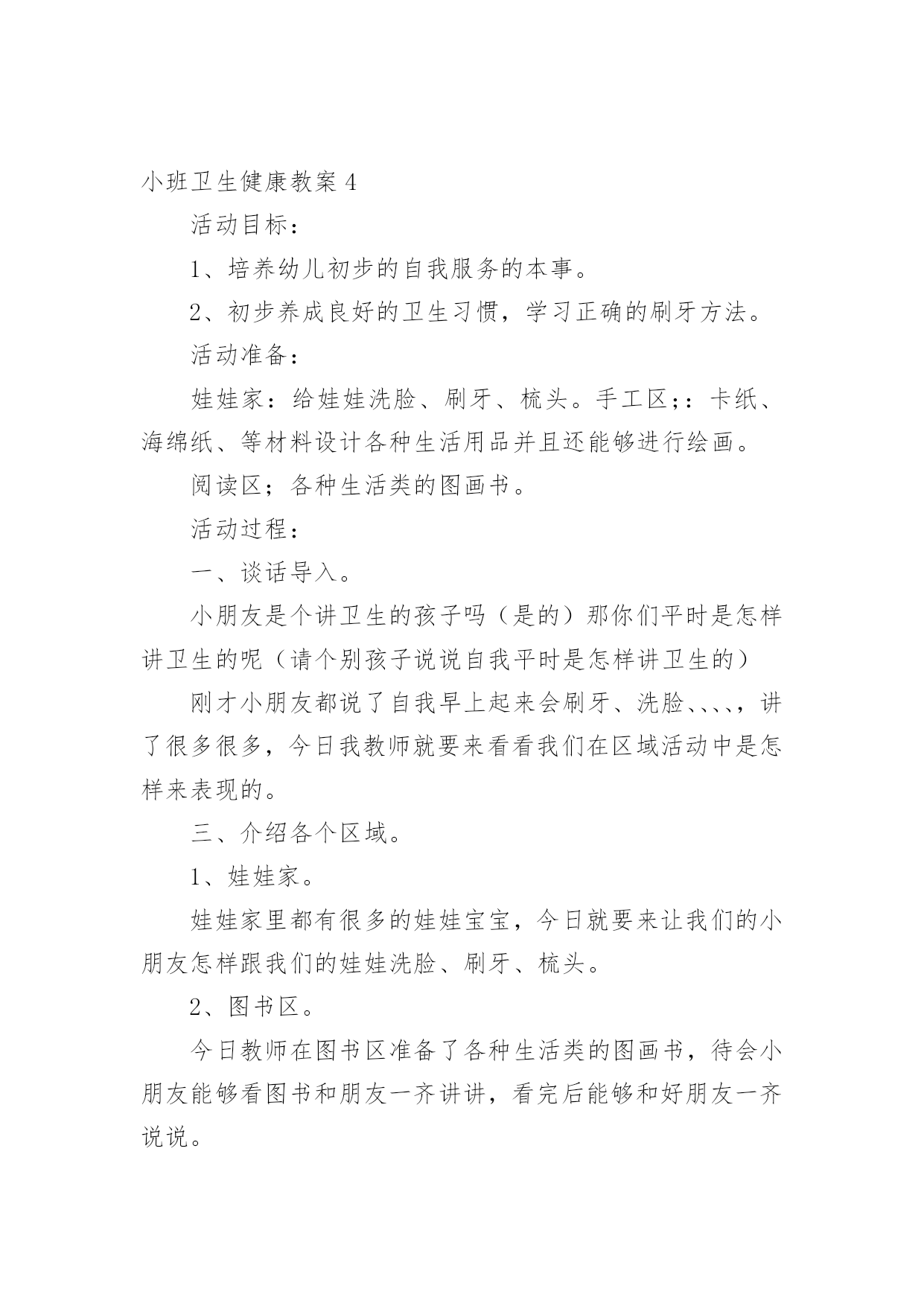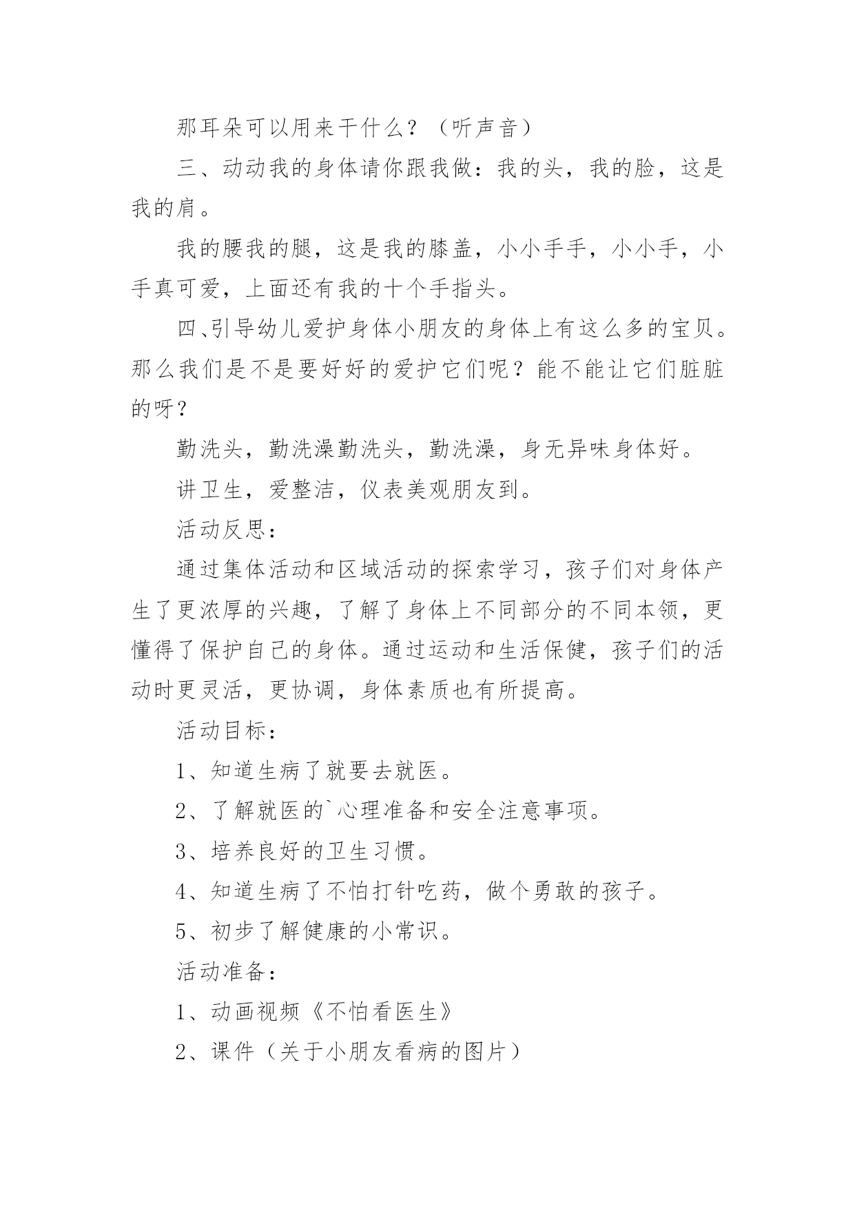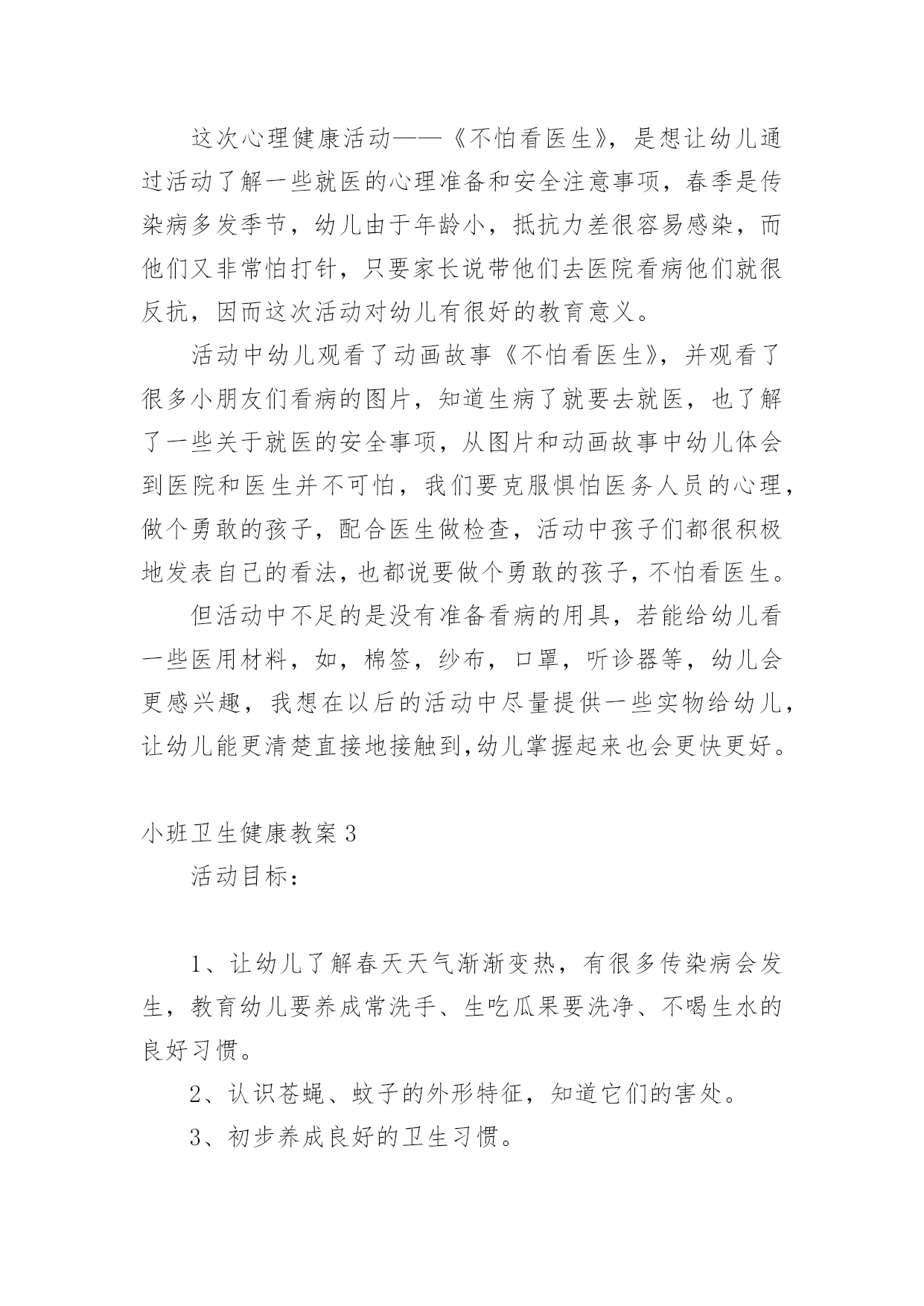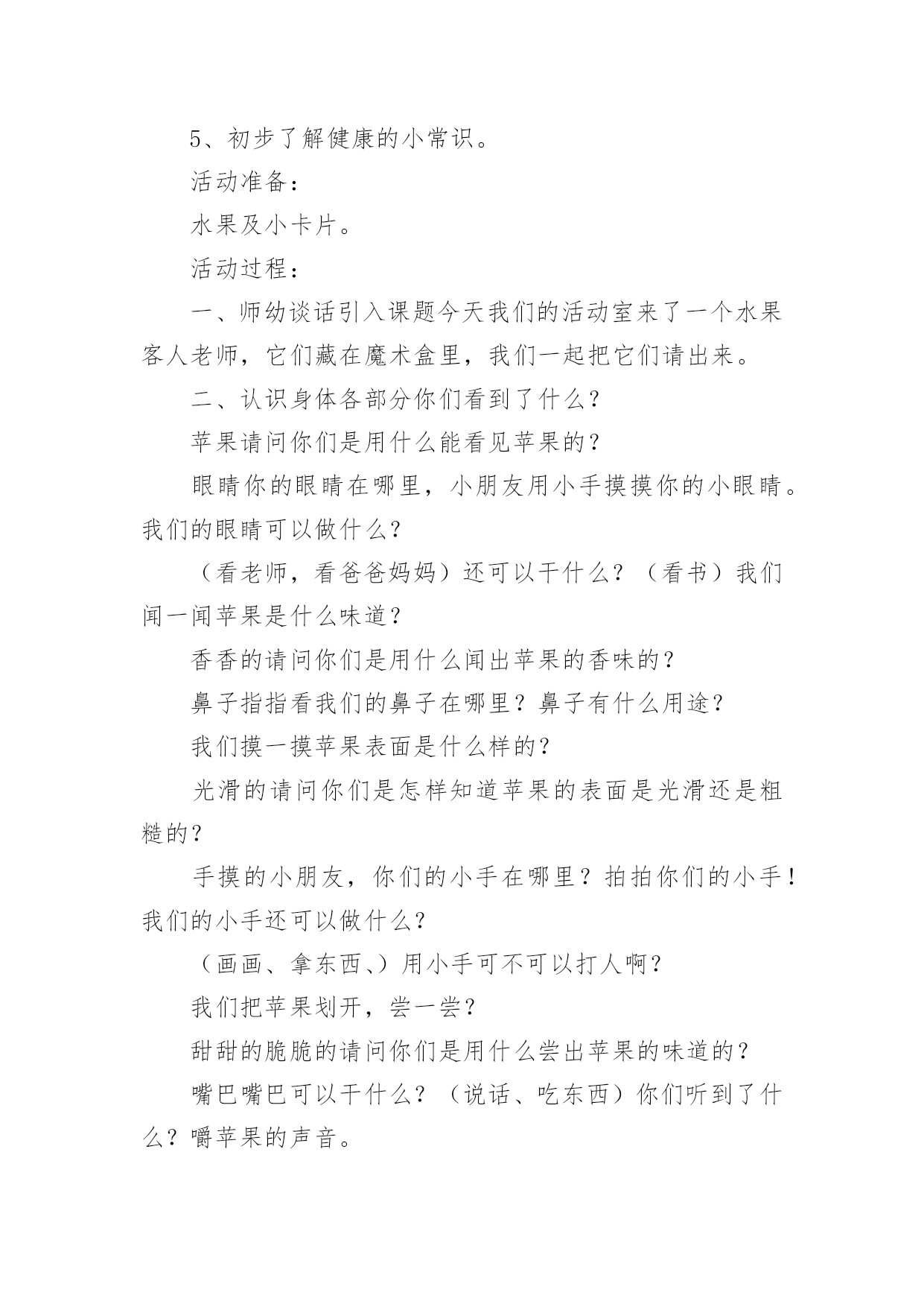 小班卫生健康教案作为一名人民教师,就难以避免地要准备教案,通过教案准备可以更好地根据具体情况对教学进程做适当的必要的调整。来参考自己需要的教案吧!下面是小编为大家收集的小班卫生健康教案,欢迎大家分享。小班卫生健康教案1设计意图:小班的孩子对自己的小手的各部分名称及用途都有了初步的认知,但许多孩子还不知道怎样正确地洗手,只是匆匆的湿一下手甚至袖口都已经潮湿了半截,地上也"发了水"。整天摸摸这、摸摸那,手上沾满各种细菌,培养幼儿养成良好的生活习惯,让幼儿具备基本的生活自理能力,是对幼儿进行健康教育的重要内容,也是幼儿身心健康的基础。活动目标:1.知道洗手的重要性。2.掌握洗手的正确方法。3.教育幼儿养成清洁卫生的良好习惯。4.培养良好的卫生习惯。5.初步了解健康的小常识。活动重点难点:活动重点:学习正确的洗手方法。活动难点:培养幼儿养成良好的`清洁卫生的好习惯。活动准备:洗手的课件。两个小熊手偶。活动过程:一、用游戏"手指歌"导入活动。"大拇哥、二拇弟、中三楼、四兄弟、小妞妞,来看戏,大家快来比一比,谁的大,我的大,谁的小,我的小。那根指头长,这根指头长,哪根指头短,这根指头断。"(通过问答式的儿歌形式来激发幼儿的兴趣。)二、集中观看手偶表演帮助幼儿了解洗手的重要性;1.导入活动:刚才小朋友们正能干。现在老师给你们带来了一位小客人(出示医生嘟嘟手偶)你们看看是谁呀?喜欢吗?我们一起欢迎他吧!(让幼儿向小医生问好)。2.观看手偶表演:老师边做手偶表演,边讲述故事。让幼儿了解洗手的重要性。讲完故事后提问:豆豆为什么会肚子疼呀?(玩玩具后没有洗手,吃东西之前没有洗手、上厕所之后没有洗手。)它应该怎样做呀?(玩过玩具之后要洗手,上过厕所之后要洗手,吃东西之前也要洗手。)通过故事让幼儿了解手上有许多细菌,要养成勤洗手的好习惯。3.引导幼儿联系自己的实际进行交流(调动幼儿已有的知识经验进一步体验洗手的重要性。)提问:你们的肚子疼过吗?(疼过)为什么?(用脏手拿东西吃的)我们应该怎么做呢?(洗手)。什么时候洗手呢?(玩完玩具以后、饭前、便后、吃东西之前都要洗手、手脏的时候都要洗手。)4.小结:玩玩具后、上厕所后、手脏的时候要洗手,因为这时候小手上有许多细菌,这些细菌吃到肚子里,会使我们得病,所以我们要勤洗手,做个讲卫生的好孩子。就不容易生病了。说说"我是怎样洗手的"?三、设计问题,引导幼儿观看课件,学习正确的洗手方法。老师把别的幼儿园小朋友洗手的照片拍下来了,你们看看他们是怎样洗手的?出示洗手课件,设计提问引导幼儿观看画面,了解洗手的正确方法出示PPT1。提问:画面上的小朋友在干什么?为什么要把袖子卷起来?我们也一起来学一学吧!(引导幼儿理解画面内容,并启发幼儿哟暖和语言表达)出示PPT2:引导幼儿观察后提问:图上的小朋友在干什么?出示PPT3:图上上的小朋友在干什么?(打肥皂、抹洗手液)出示课PPT4:图上的小朋友在干什么?(搓手)搓手的时候水龙头是关着的?还是开着的?为什么?出示PPT5:图上的小朋友在干什么?(冲手)冲完手之后还要甩甩手。出示PPT6:图片上的小朋友在干什么?(用毛巾擦手)用谁的毛巾擦手?为什么?老师和幼儿共同讲述正确的洗手顺序及方法。卷袖子----冲手-----搓肥皂------搓手心搓手背----冲肥皂---甩手---用毛巾擦手。(根据画面边做动作边讲解)引导幼儿边说儿歌边做模仿动作。(进一步学习正确的洗手顺序及方法。我有一双小小手,快来快来洗洗手,洗手前,快卷袖,不让水滴沾衣袖。打开水龙头,冲冲小小手,关上水龙头,搓出肥皂泡,搓搓手心,搓手背,打开水管冲一冲,再用毛巾擦擦手,小小手真干净。师幼谈话:"我们什么时候该洗手"(饭前、便后、玩完玩具、手脏时候)。四、幼儿实际练习:洗洗小手讲卫生,进一步掌握洗手的方法。1.教师导语:马上要吃点心了,我们一起来洗洗小手吧!看看谁的小手最干净。2.在实际练习中引导幼儿边说儿歌边洗手。指导幼儿正确的洗手。小班卫生健康教案2活动目标:1、初步认识自己的身体器官,并了解身体各部分的名称及功能。2、懂得要爱清洁、讲卫生,爱护自己身体。3、培养幼儿初步的发散性思维和手口一致的能力。4、培养幼儿的自信心。5、初步了解健康的小常识。活动准备:水果及小卡片。活动过程:一、师幼谈话引入课题今天我们的活动室来了一个水果客人老师,它们藏在魔术盒里,我们一起把它们请出来。二、认识身体各部分你们看到了什么?苹果请问你们是用什么能看见苹果的?眼睛你的眼睛在哪里,小朋友用小手摸摸你的小眼睛。我们的眼睛可以做什么?(看老师,看爸爸妈妈)还可以干什么?(看书)我们闻一闻苹果是什么味道?香香的请问你们是用什么闻出苹果的香味的?鼻子指指看我们的鼻子在哪里?鼻子有什么用途?我们摸一摸苹果表面是什么样的?光滑的请问你