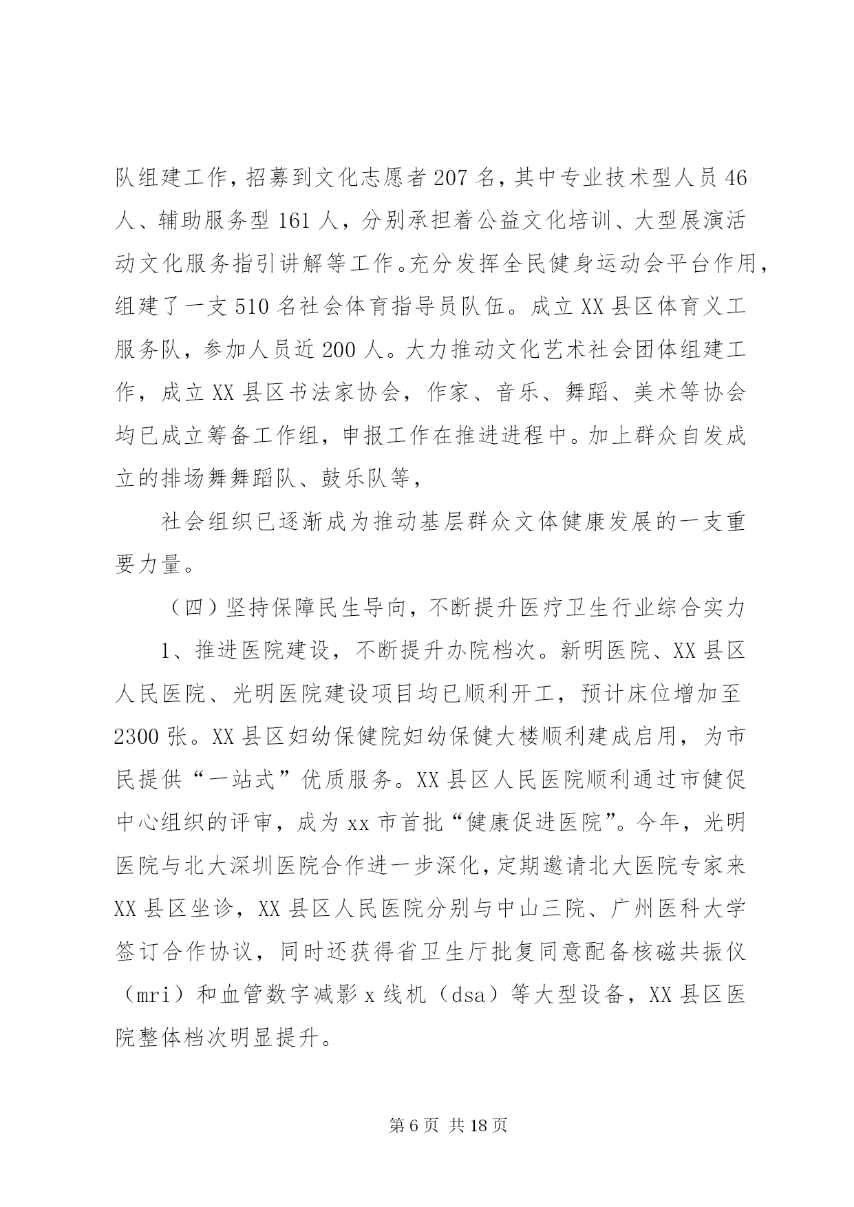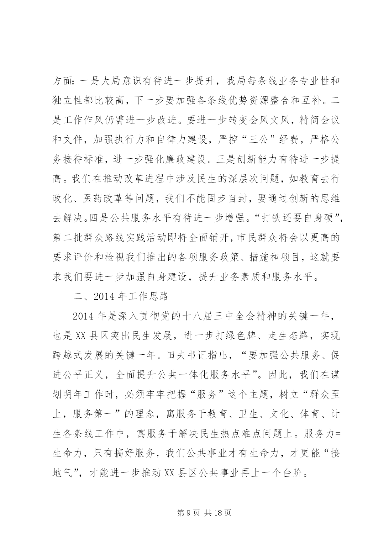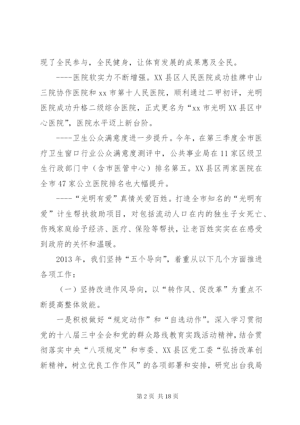 第PAGE\*Arabic\*MERGEFORMAT18页共NUMPAGES\*MERGEFORMAT18页区公共事业局工作报告材料20xx年,在xx区党工委、管委会的正确领导和各相关兄弟部门大力支持下,我们紧扣XX县区“创新提速年”、“转型提质年”、“作风提效年”中心工作,一手抓民生建设这个硬实力作支撑,一手抓改革创新这个软实力作提升,全年XX县区教育、卫生、文化、体育、计生等民生事业快速发展,取得了新的成绩。一、20xx年工作回顾盘点一年来的工作,xx区公共事业亮点纷呈,表现在:----教育体制改革加快推进。进一步理顺教育管理体制,撤销两办事处教办,XX县区成立教育督导室,实现“一级办学一级管理”,这与十八届三中全会提出的“深入推进管办评分离”的要求是完全一致的。----试点午餐配送成效明显。为东周小学、爱华小学和凤凰小学等三所学校1300余名学生提供午餐配送、免费午休托管服务,大大减轻了家长中午往返接送孩子的负担,学生可以有更多的时间看书和休息。----文博会分会场取得历史性突破。实现建区以来文博会分会场零的突破,首创XX县区乃至文博会历史上“文化+休闲”主题特色分会场,交易额近11亿元。----举办首届光明XX县区全民健身运动会。共有机关、社区、企业等单位105支队伍4000多名运动员报名参赛,真正体现了全民参与,全民健身,让体育发展的成果惠及全民。----医院软实力不断增强。XX县区人民医院成功挂牌中山三院协作医院和xx市第十人民医院,顺利通过二甲初评,光明医院成功升格二级综合医院,正式更名为“xx市光明XX县区中心医院”,医院水平迈上新台阶。----卫生公众满意度进一步提升。今年,在第三季度全市医疗卫生窗口行业公众满意度测评中,公共事业局在11家区级卫生行政部门中(含市医管中心)排名第五。XX县区两家医院在全市47家公立医院排名也大幅提升。----“光明有爱”真情关爱百姓。打造全市知名的“光明有爱”计生帮扶救助项目,对包括流动人口在内的独生子女死亡、伤残家庭给予经济、医疗、保险等帮扶,让老百姓实实在在感受到政府的关怀和温暖。2013年,我们坚持“五个导向”,着重从以下几个方面推进各项工作:(一)坚持改进作风导向,以“转作风、促改革”为重点不断提高整体效能。一是积极做好“规定动作”和“自选动作”。深入学习贯彻党的十八届三中全会和党的群众路线教育实践活动精神,结合贯彻落实中央“八项规定”和市委、XX县区党工委“弘扬改革创新精神,树立优良工作作风”的各项部署和安排,研究出台我局“促改革、转作风”总体工作方案,主动研究和做好“自选动作”,制定教育、卫生、文化、体育、计生等各条线48项改革创新和便民惠民项目,明确了时间安排、责任落实、方法步骤和工作要求。二是积极做好“减法”和“加法”。积极做好“减法”,即:减少会议、减少评比、减少接待,比上年同期分别减少38%、35%和27%。严格按照国家、省、市各级厉行节约的文件精神和要求,健全和完善我局财务管理制度和接待审批制度,严禁铺张浪费,严控接待标准,进一步规范“三公”经费支出。增加更多时间深入到基层、企业和群众中,加强调查研究,有的放矢地解决群众最迫切的现实问题。(二)坚持均衡发展导向,加快推进教育事业“一体化”发展一是坚持公办和民办均衡发展相结合,教育质量不断提升。加大对民办学校、幼儿园的扶持力度,设立民办教育与学前教育发展专项资金,全年共投入民办教育、学前教育资金3842万元,同比增长近一倍。提高民办学校教师、幼儿教师待遇,全年共发放1416名民办学校教师、1196名幼儿教师长期从教津贴644万元。实施义务教育公办学位积分入学,深化公民办学校结对帮扶力度,发放教育券6067张,折合财政投入1589.5万元。完成21所普惠性幼儿园建设。二是坚持科学规划和民生保障相促进,办学环境不断优化。进一步加大政府财政投入,不断完善学校服务半径。今年教育系统列入2013年光明XX县区政府投资计划项目共20个,总投资约有9.5亿元;其中,在建项目共有12个,总投资近8.8亿元。实验学校初中部投入使用,高级中学二期改造项目完成总工程量90%以上,光明中学高中部扩建项目、李松蓢小学拆建项目动工,今年新增学位共2320个,今年公办初中和小学76.6%的学位留给非户籍学生,比全市标准56%提高了20个百分点。开展校园文化进社区194次,全面推进公民办中小学服务窗口建设,其中小学服务窗口13个,初中11个,高中2个,网上服务窗口8个,进一步推动学校从关门办学向着服务社区、服务群众转型。三是坚持素质教育和特色教育相融合,教育成果更加突出。启动名校长、名师工程,成功创建XX县区名校长工作室1个,名师工作室1个。XX县区先后有4所学校5个项目获得xx市第一批、第二批素质教育特色学校创