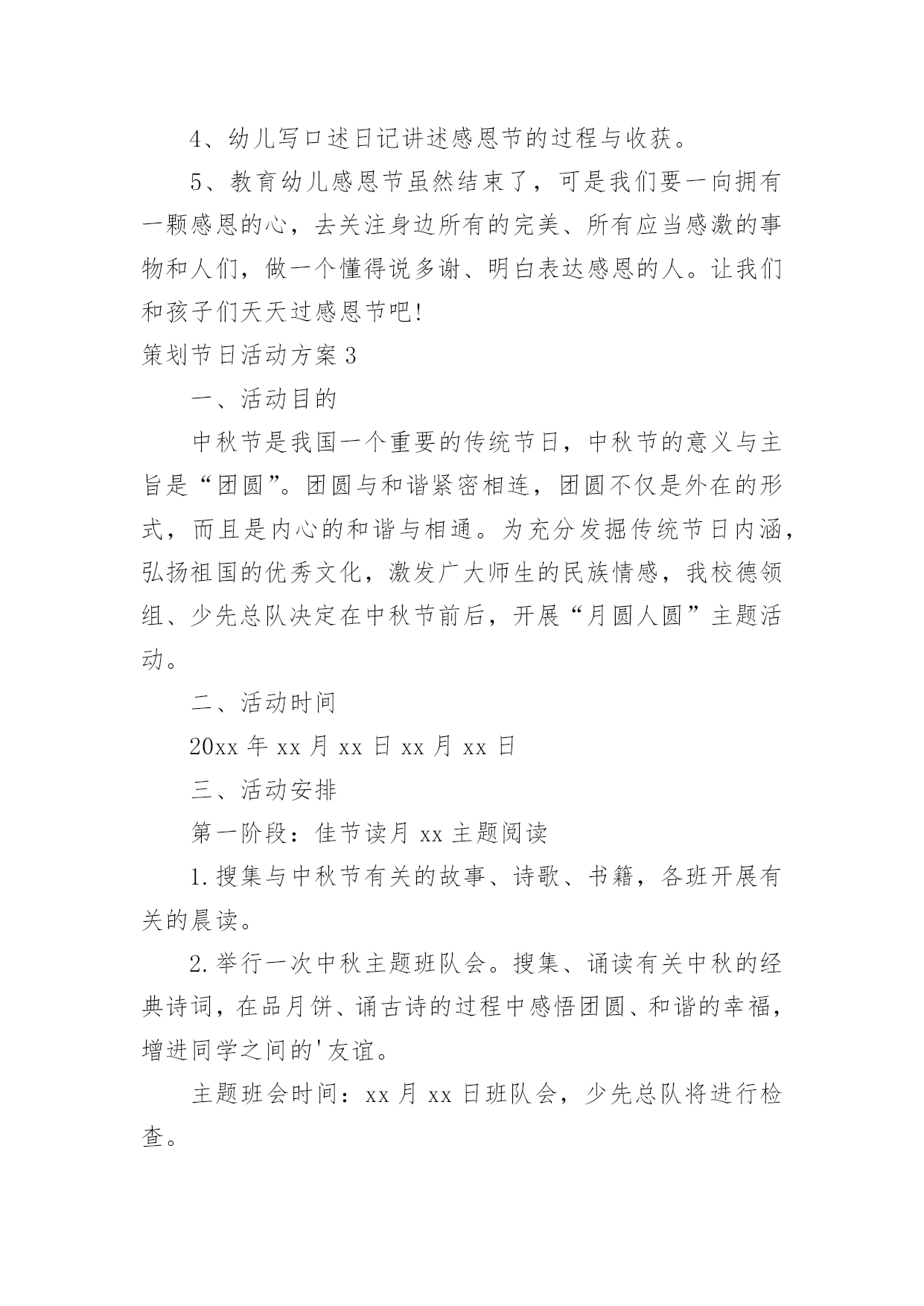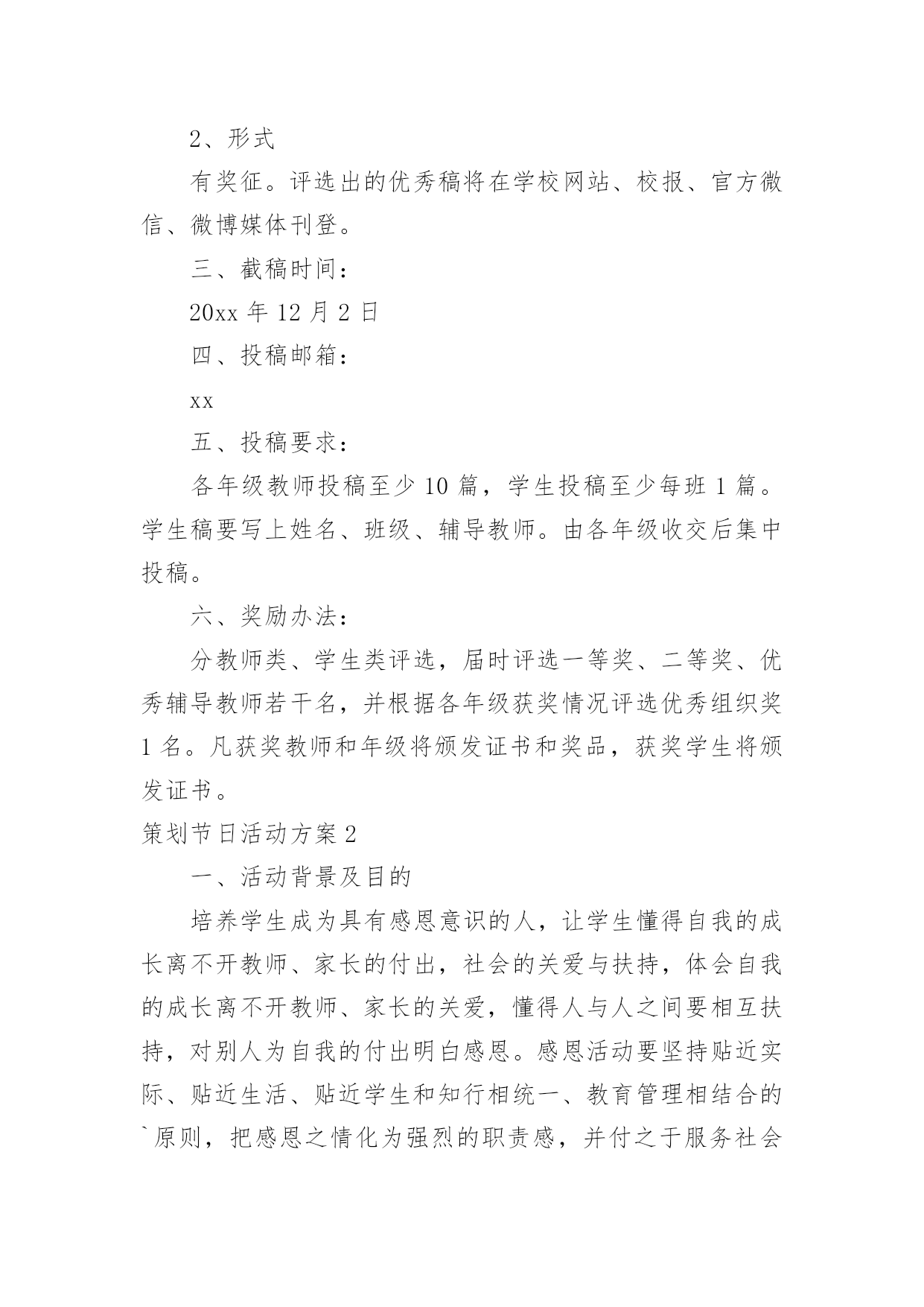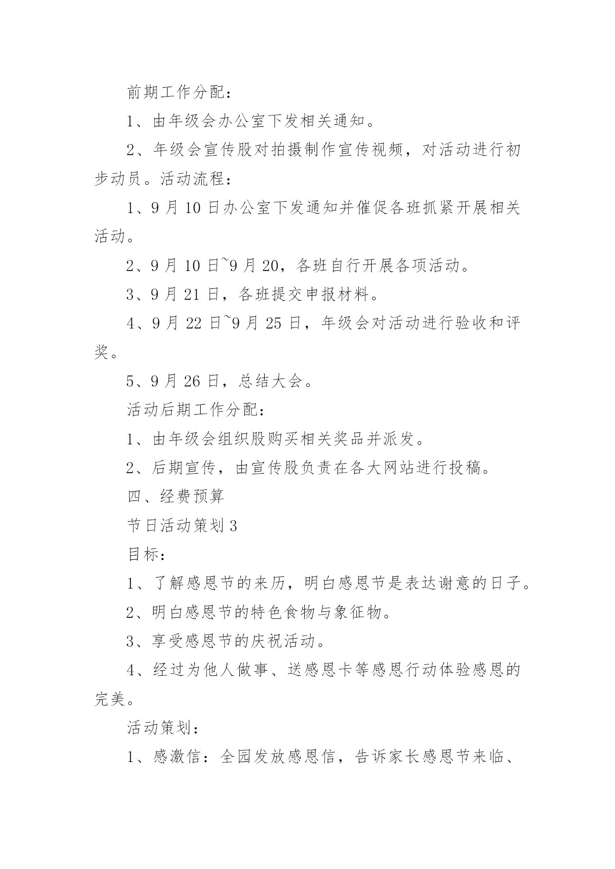 策划节日活动方案策划节日活动方案为了确保事情或工作扎实开展,常常需要提前制定一份优秀的方案,方案一般包括指导思想、主要目标、工作重点、实施步骤、政策措施、具体要求等项目。那要怎么制定科学的方案呢?以下是小编为大家收集的策划节日活动方案,仅供参考,希望能够帮助到大家。策划节日活动方案1即将过去的一年,我们的师生、家人、朋友或许志得意满,更上一层楼,也可能历经坎坷,遭遇暂时的挑战,这都是现实生活的赋予。但无论怎样每个人都会有值得回味的事和温暖瞬间。新的`一年,也会有新的愿望和期待。让我们一起在20xx回味述说中,再启程20xx。一、活动宗旨讲述温暖故事记录难忘历程展现师生风采祝福明年更好二、活动内容与形式1、内容以“我的20xx”为主题,题目自拟,字数、形式不限,或讲述发生在我们师生、亲人、朋友身边的事,或赞美学校的发展、家乡的巨变、祖国的变迁,或瞻望未、祝福明天更出彩。2、形式有奖征。评选出的优秀稿将在学校网站、校报、官方微信、微博媒体刊登。三、截稿时间:20xx年12月2日四、投稿邮箱:xx五、投稿要求:各年级教师投稿至少10篇,学生投稿至少每班1篇。学生稿要写上姓名、班级、辅导教师。由各年级收交后集中投稿。六、奖励办法:分教师类、学生类评选,届时评选一等奖、二等奖、优秀辅导教师若干名,并根据各年级获奖情况评选优秀组织奖1名。凡获奖教师和年级将颁发证书和奖品,获奖学生将颁发证书。策划节日活动方案2一、活动背景及目的培养学生成为具有感恩意识的人,让学生懂得自我的成长离不开教师、家长的付出,社会的关爱与扶持,体会自我的成长离不开教师、家长的关爱,懂得人与人之间要相互扶持,对别人为自我的付出明白感恩。感恩活动要坚持贴近实际、贴近生活、贴近学生和知行相统一、教育管理相结合的`原则,把感恩之情化为强烈的职责感,并付之于服务社会的实际行动,培养关心他人、服务社会、忠于祖国、道德高尚的有用之才。二、活动时间,对象活动时间:x年九月活动对象:湖南大学电气院12级所有同学(以班为单位)工作安排总负责人:组长:组员:湖南大学电气院12级所有同学三、组织形式:1、以班级为单位在以下活动中选取一个或多个开展并向年级会供给材料申报优秀主题活动。(1)制作类似“请同学帮教师擦黑板”这样的便签条,并向相关部门申请帖在教室里。(2)写贺卡,向自我是亲人教师或者朋友互寄贺卡。(3)请在本周之内做几件感恩他人(父母、教师、朋友、同学等)的事件,把事情的全过程记录下来,并写份心得,在全班开展感恩事迹比赛,凸显“感恩他人,升华自我”主题。(4)、开展“感恩主题教育活动”主题班会。2、由年级会对上报的材料进行评奖评优。3、活动设一二三等奖,一等奖一个,二等奖两个,三等奖三个。具体资料:前期工作分配:1、由年级会办公室下发相关通知。2、年级会宣传股对拍摄制作宣传视频,对活动进行初步动员。活动流程:1、9月10日办公室下发通知并催促各班抓紧开展相关活动。2、9月10日~9月20,各班自行开展各项活动。3、9月21日,各班提交申报材料。4、9月22日~9月25日,年级会对活动进行验收和评奖。5、9月26日,总结大会。活动后期工作分配:1、由年级会组织股购买相关奖品并派发。2、后期宣传,由宣传股负责在各大网站进行投稿。四、经费预算节日活动策划3目标:1、了解感恩节的来历,明白感恩节是表达谢意的日子。2、明白感恩节的特色食物与象征物。3、享受感恩节的庆祝活动。4、经过为他人做事、送感恩卡等感恩行动体验感恩的完美。活动策划:1、感激信:全园发放感恩信,告诉家长感恩节来临、我们要做什么、以及对家长的感激。2、大厅:a.制作大火鸡,标识语:happythanksgivingday感恩节欢乐;b.摆放每班制作的小人(风格各异,幼儿参与,和幼儿一样高,站立起来)(各班负责)3、班级:a.各班级制作感恩节海报贴到醒目处b.装饰班级环境,如手印火鸡、爆米花吊饰、羽毛等c.感恩节的相关教育,如感恩节故事欣赏、感恩节标志性词汇学习d.制作感恩贺卡4、感恩周:a.每一天的晨间接待教师化装成印第安人B.感恩行动:周一宝贝为您捶捶背;周二宝贝为您洗洗脚;周三宝贝给您端杯水;周四宝贝送您一个吻;周五宝贝秀一下。当天活动前的准备:a.全体师幼学习《感恩的心》手语表演b.请家长帮忙准备水果小吃以及一串爆米花项链c.准备暖场音乐以及《感恩的心》《tenlittleIndians》音乐,主持词d.制作“金摇篮美食部落”标志,并准备大布盖上(用于揭幕仪式);准备剪彩的相关物品。e.班级的其他两位教师负责将孩子们带来的水果、小吃在各层楼道摆好(每班两个桌子,包装拆开、切成适宜大小),保证卫生并准备牙签,纸杯,纸巾等。教育幼儿学会谦让、适量品尝。F.告知食堂做少许小点心用于当日品餐活动当日活动流程:A,早上开始抱