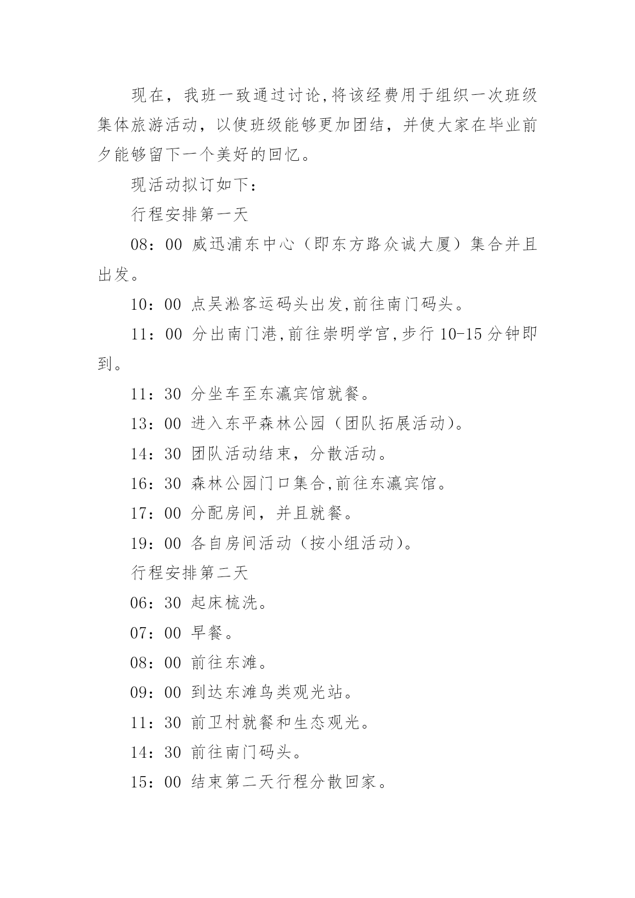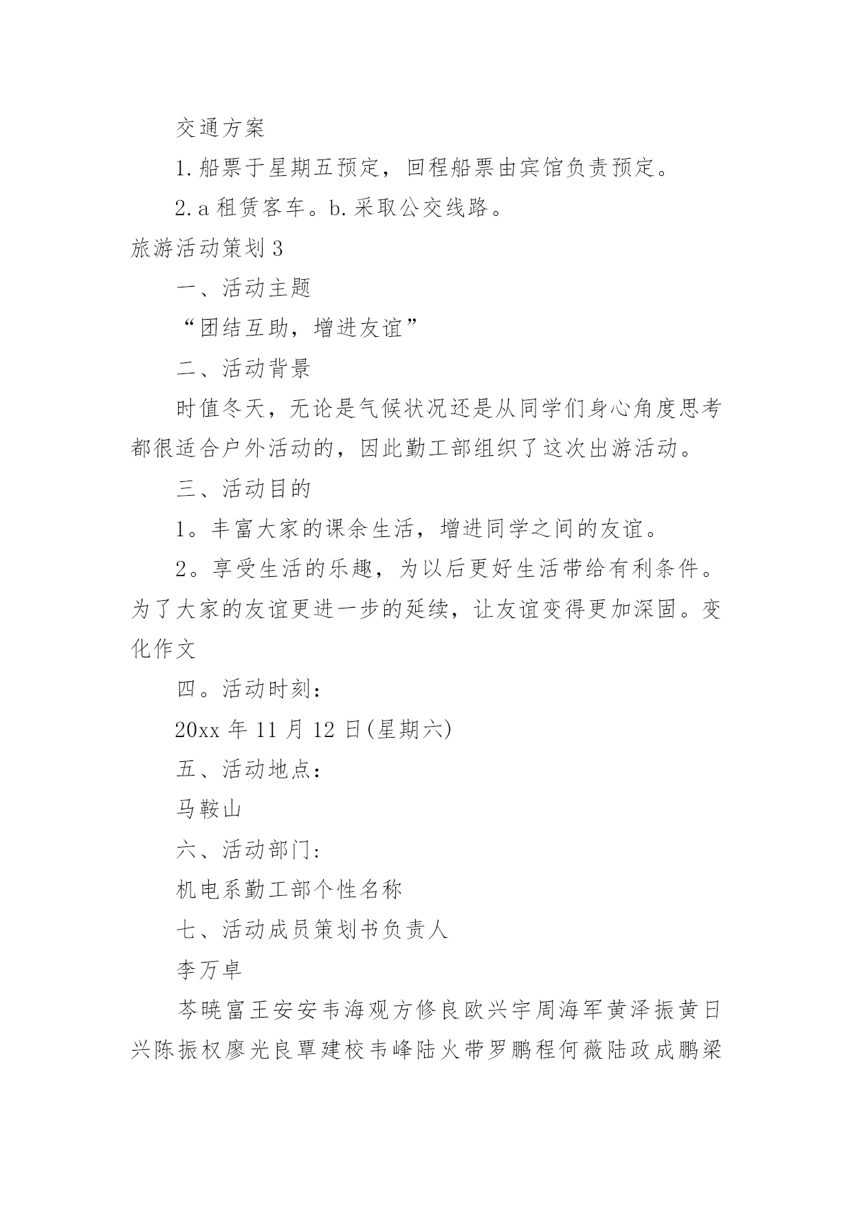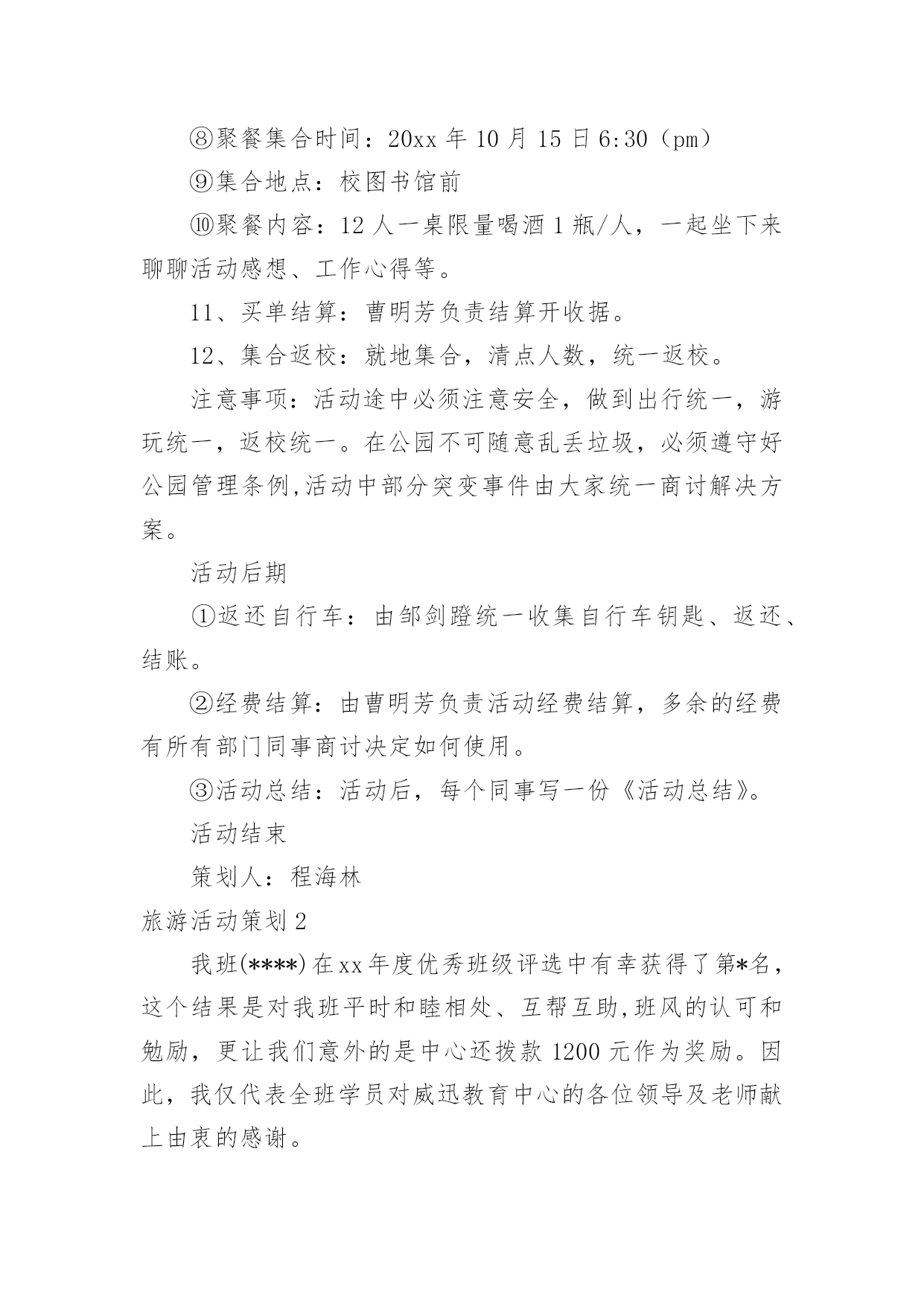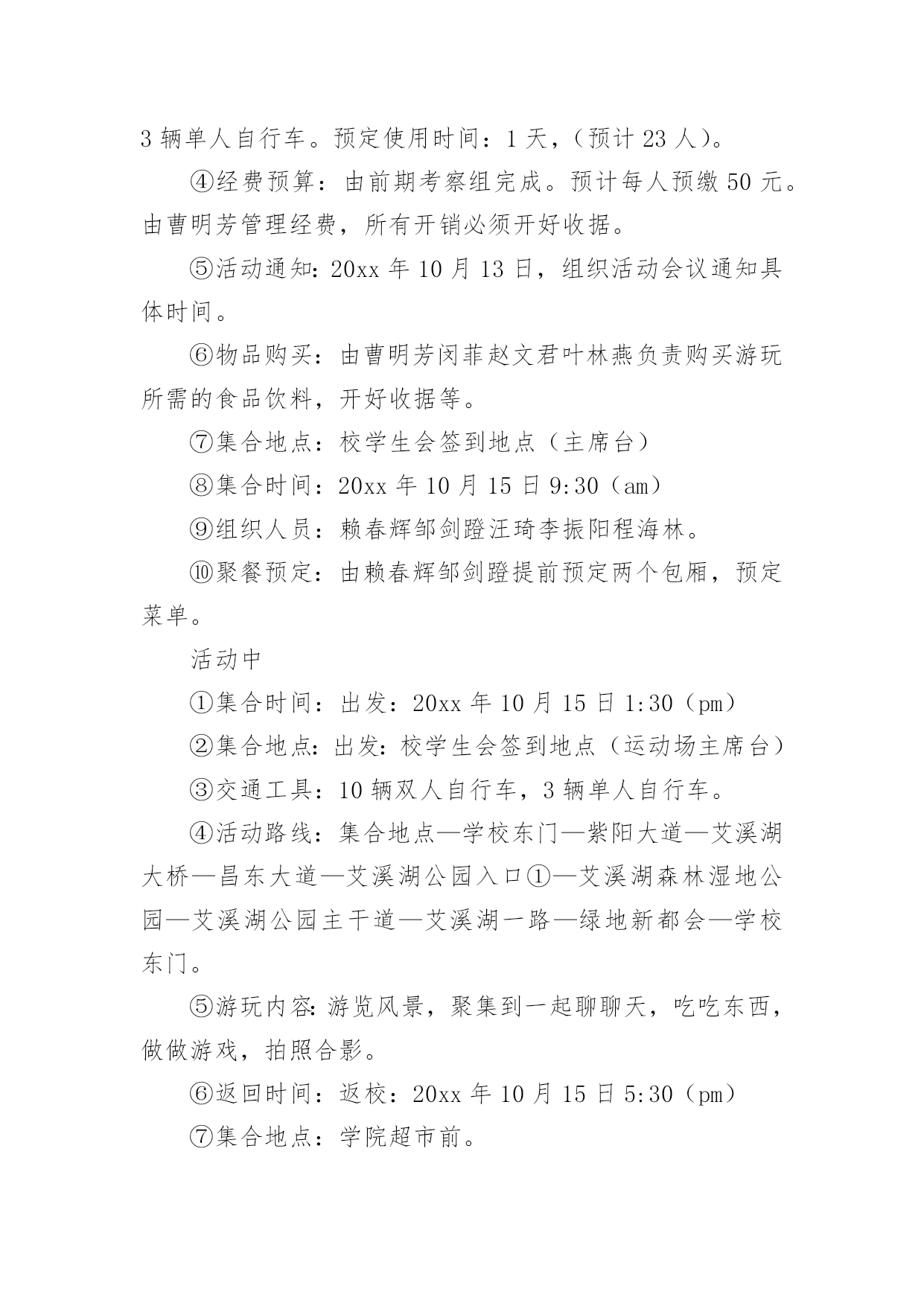 旅游活动策划旅游活动策划旅游活动策划1一、活动概述1、活动名称:校学生会—纪检部“郊外秋游”活动。2、活动时间:20xx年10月15日。3、活动地点:南昌市艾溪湖森林湿地公园。4、参与人员:校学生会—纪检部,所有部门同事(有事无法参加活动的必须提前5天请好假)。5、活动目的:部门同事一起通过外出游玩的方式,进一步增强部门同事之间的感情,增进部门同事间的交流与沟通。有助于同事之间工作协调性的培养。6、活动宗旨:快乐游玩,快乐交流,快乐工作,快乐学习。二、活动内容活动前期①活动策划:由所有部门同事共同商讨活动的具体流程,统一意见后由程海林统一稿件,统一编辑,统一打印。②前期考察:由个别同事组织考察,考察:活动路线,活动时间,活动地点,聚餐地点,活动经费。(已完成)③交通工具:由邹剑蹬负责提前预定:10辆双人自行车,3辆单人自行车。预定使用时间:1天,(预计23人)。④经费预算:由前期考察组完成。预计每人预缴50元。由曹明芳管理经费,所有开销必须开好收据。⑤活动通知:20xx年10月13日,组织活动会议通知具体时间。⑥物品购买:由曹明芳闵菲赵文君叶林燕负责购买游玩所需的食品饮料,开好收据等。⑦集合地点:校学生会签到地点(主席台)⑧集合时间:20xx年10月15日9:30(am)⑨组织人员:赖春辉邹剑蹬汪琦李振阳程海林。⑩聚餐预定:由赖春辉邹剑蹬提前预定两个包厢,预定菜单。活动中①集合时间:出发:20xx年10月15日1:30(pm)②集合地点:出发:校学生会签到地点(运动场主席台)③交通工具:10辆双人自行车,3辆单人自行车。④活动路线:集合地点—学校东门—紫阳大道—艾溪湖大桥—昌东大道—艾溪湖公园入口①—艾溪湖森林湿地公园—艾溪湖公园主干道—艾溪湖一路—绿地新都会—学校东门。⑤游玩内容:游览风景,聚集到一起聊聊天,吃吃东西,做做游戏,拍照合影。⑥返回时间:返校:20xx年10月15日5:30(pm)⑦集合地点:学院超市前。⑧聚餐集合时间:20xx年10月15日6:30(pm)⑨集合地点:校图书馆前⑩聚餐内容:12人一桌限量喝酒1瓶/人,一起坐下来聊聊活动感想、工作心得等。11、买单结算:曹明芳负责结算开收据。12、集合返校:就地集合,清点人数,统一返校。注意事项:活动途中必须注意安全,做到出行统一,游玩统一,返校统一。在公园不可随意乱丢垃圾,必须遵守好公园管理条例,活动中部分突变事件由大家统一商讨解决方案。活动后期①返还自行车:由邹剑蹬统一收集自行车钥匙、返还、结账。②经费结算:由曹明芳负责活动经费结算,多余的经费有所有部门同事商讨决定如何使用。③活动总结:活动后,每个同事写一份《活动总结》。活动结束策划人:程海林旅游活动策划2我班(****)在xx年度优秀班级评选中有幸获得了第*名,这个结果是对我班平时和睦相处、互帮互助,班风的认可和勉励,更让我们意外的是中心还拨款1200元作为奖励。因此,我仅代表全班学员对威迅教育中心的各位领导及老师献上由衷的感谢。现在,我班一致通过讨论,将该经费用于组织一次班级集体旅游活动,以使班级能够更加团结,并使大家在毕业前夕能够留下一个美好的回忆。现活动拟订如下:行程安排第一天08:00威迅浦东中心(即东方路众诚大厦)集合并且出发。10:00点吴淞客运码头出发,前往南门码头。11:00分出南门港,前往崇明学宫,步行10-15分钟即到。11:30分坐车至东瀛宾馆就餐。13:00进入东平森林公园(团队拓展活动)。14:30团队活动结束,分散活动。16:30森林公园门口集合,前往东瀛宾馆。17:00分配房间,并且就餐。19:00各自房间活动(按小组活动)。行程安排第二天06:30起床梳洗。07:00早餐。08:00前往东滩。09:00到达东滩鸟类观光站。11:30前卫村就餐和生态观光。14:30前往南门码头。15:00结束第二天行程分散回家。交通方案1.船票于星期五预定,回程船票由宾馆负责预定。2.a租赁客车。b.采取公交线路。旅游活动策划3一、活动主题“团结互助,增进友谊”二、活动背景时值冬天,无论是气候状况还是从同学们身心角度思考都很适合户外活动的,因此勤工部组织了这次出游活动。三、活动目的1。丰富大家的课余生活,增进同学之间的友谊。2。享受生活的乐趣,为以后更好生活带给有利条件。为了大家的友谊更进一步的延续,让友谊变得更加深固。变化作文四。活动时刻:20xx年11月12日(星期六)五、活动地点:马鞍山六、活动部门:机电系勤工部个性名称七、活动成员策划书负责人李万卓芩暁富王安安韦海观方修良欧兴宇周海军黄泽振黄日兴陈振权廖光良覃建校韦峰陆火带罗鹏程何薇陆政成鹏梁玲蓝柳敏吴宜娟八、活动流程1、上午8:00在学校门口集合,预计10分之后集合完毕出发。2、上午8:10坐98路公交车到市人民医院东,再坐70路