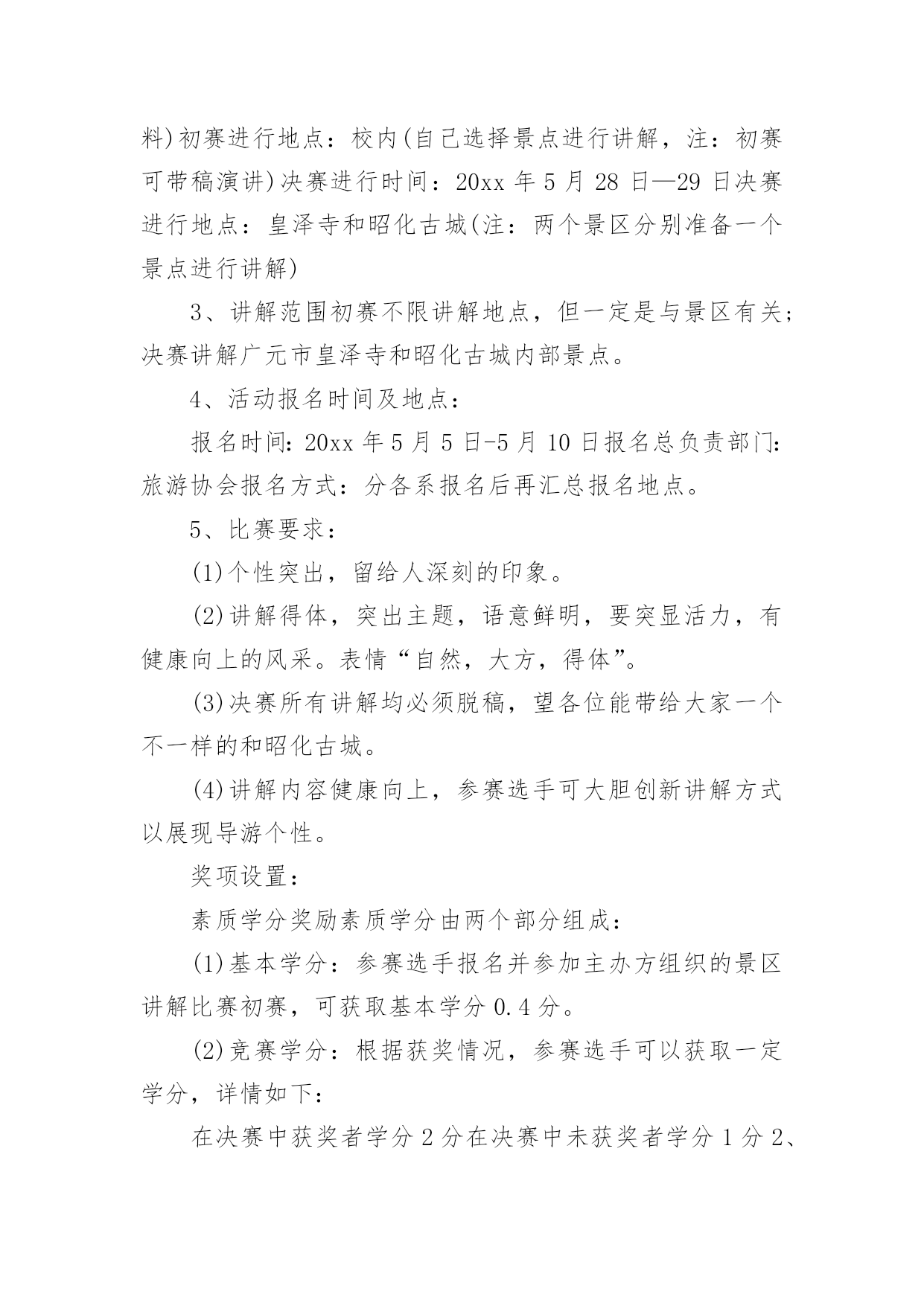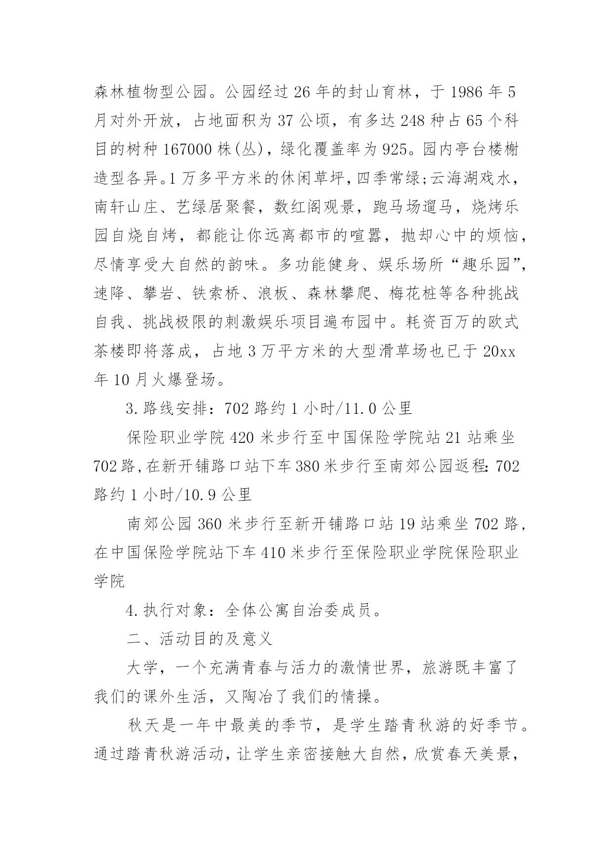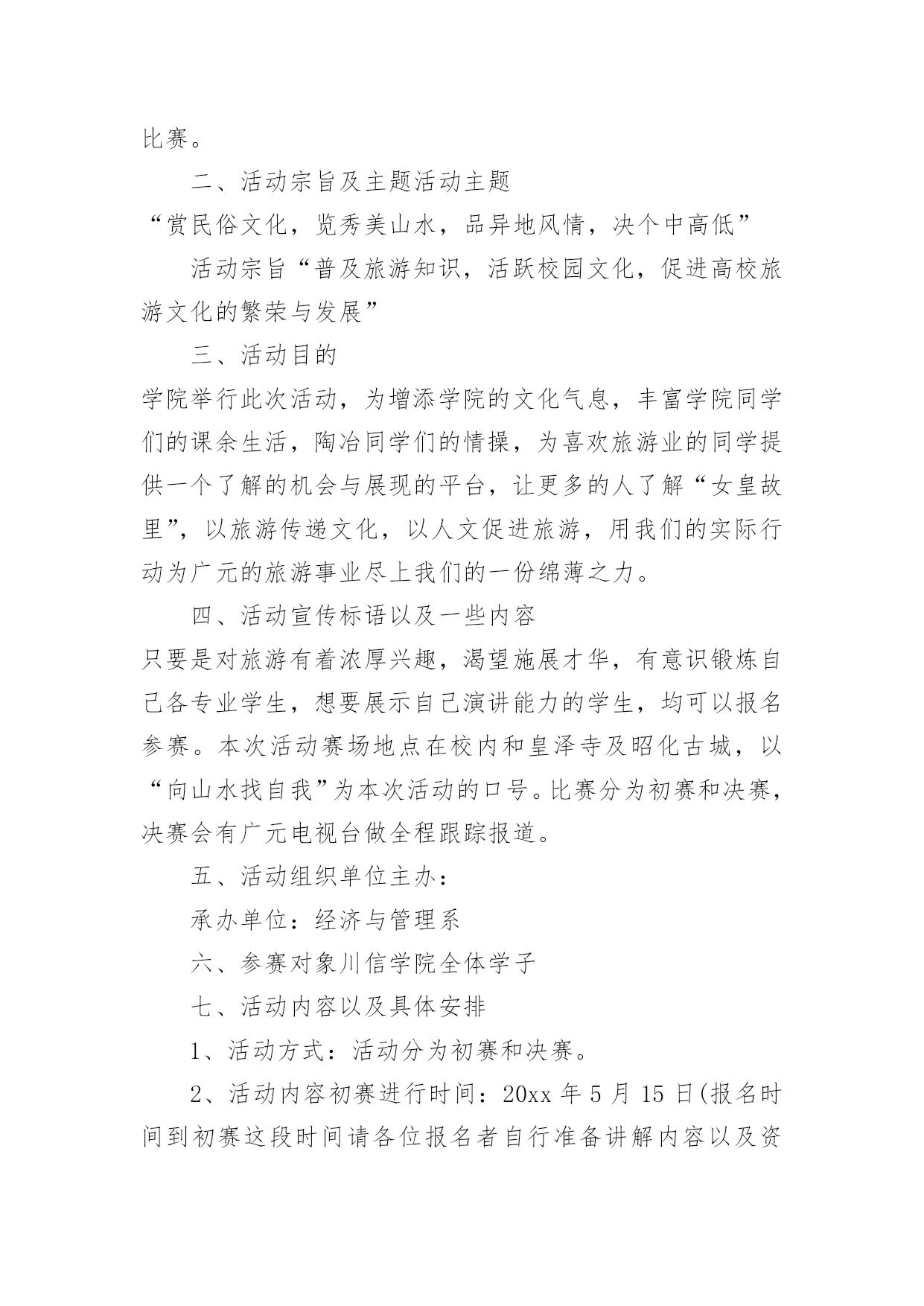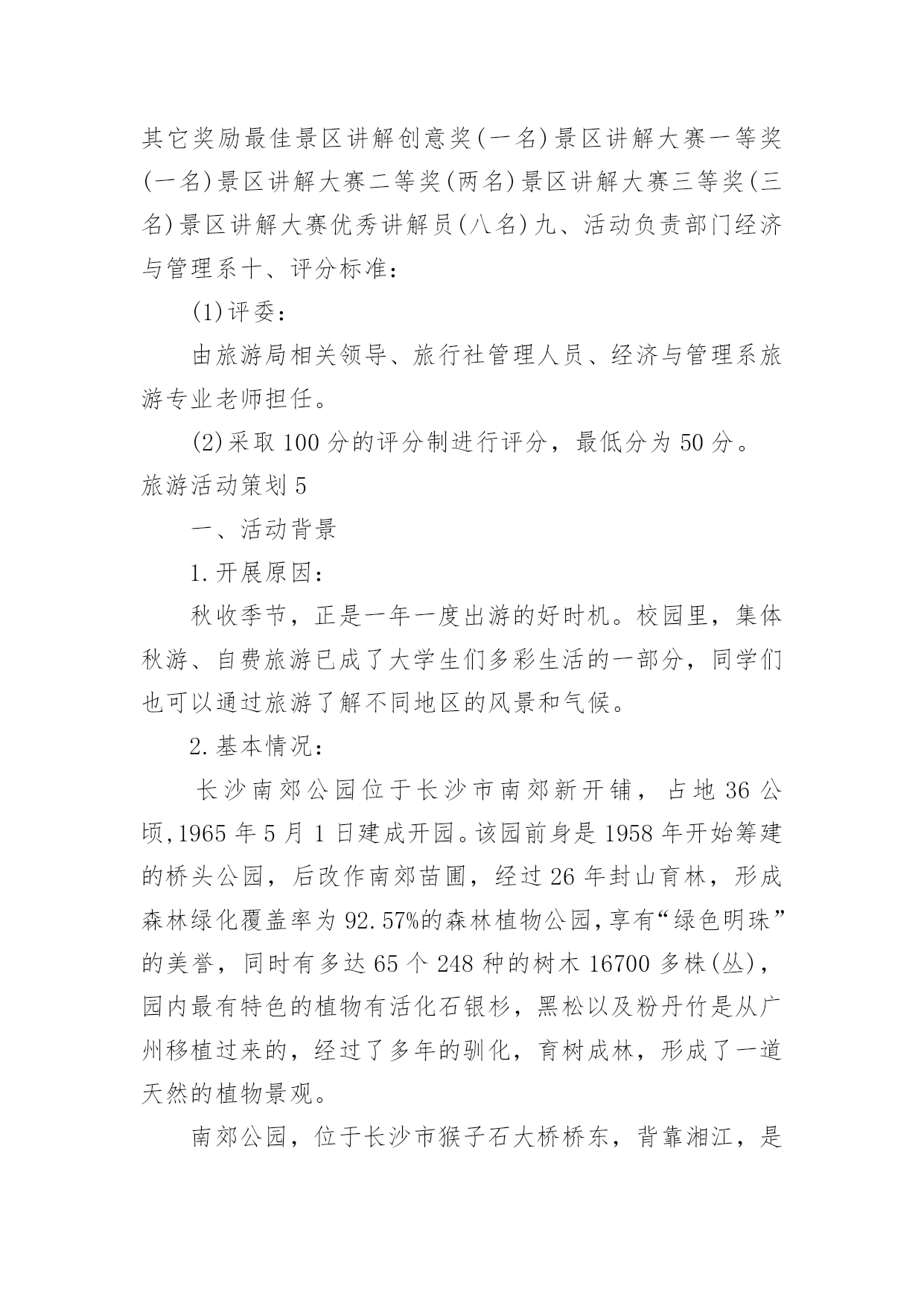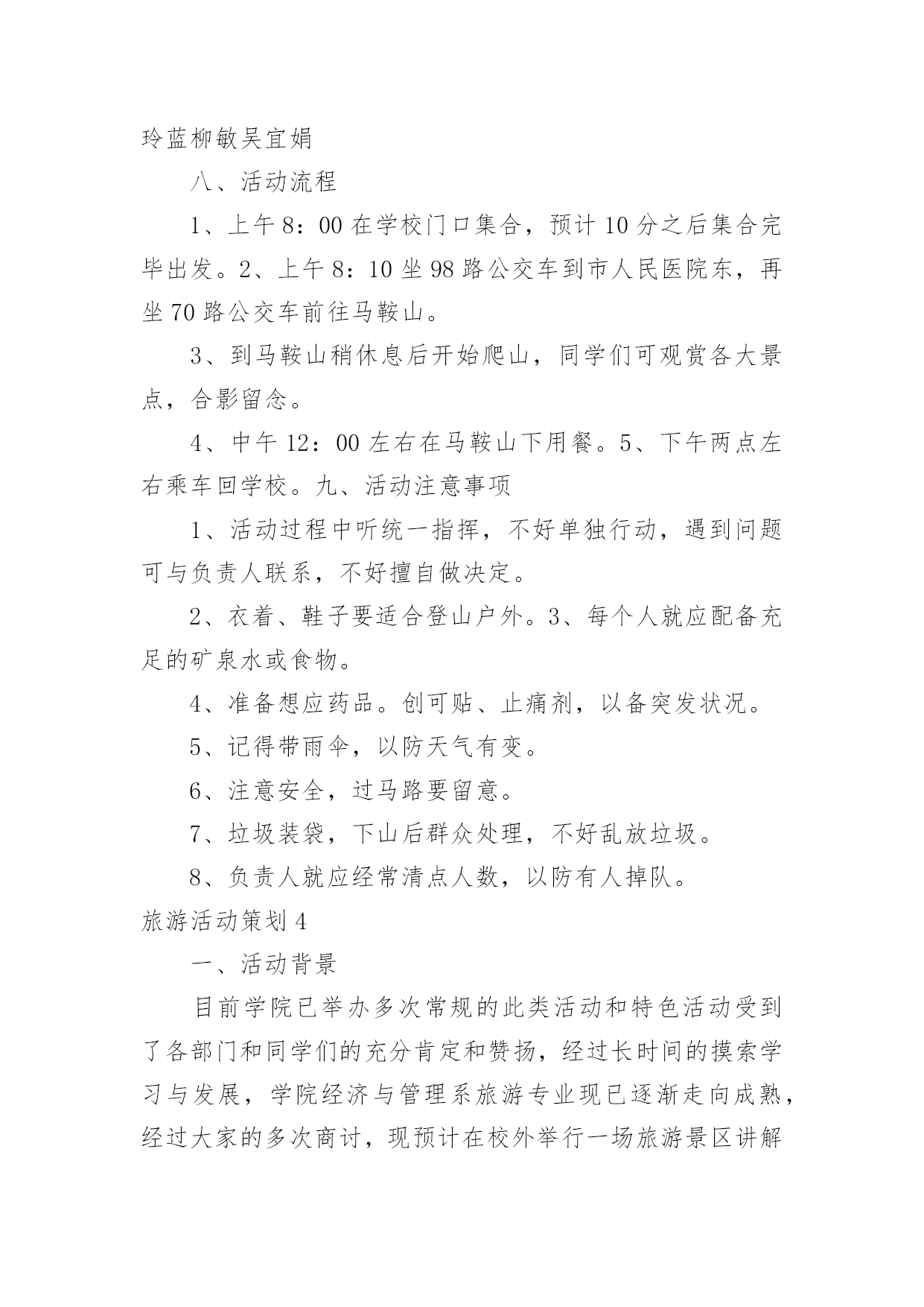 旅游活动策划旅游活动策划旅游活动策划1一、活动概述1、活动名称:校学生会—纪检部“郊外秋游”活动。2、活动时间:20xx年10月15日。3、活动地点:南昌市艾溪湖森林湿地公园。4、参与人员:校学生会—纪检部,所有部门同事(有事无法参加活动的必须提前5天请好假)。5、活动目的:部门同事一起通过外出游玩的方式,进一步增强部门同事之间的感情,增进部门同事间的交流与沟通。有助于同事之间工作协调性的培养。6、活动宗旨:快乐游玩,快乐交流,快乐工作,快乐学习。二、活动内容活动前期①活动策划:由所有部门同事共同商讨活动的具体流程,统一意见后由程海林统一稿件,统一编辑,统一打印。②前期考察:由个别同事组织考察,考察:活动路线,活动时间,活动地点,聚餐地点,活动经费。(已完成)③交通工具:由邹剑蹬负责提前预定:10辆双人自行车,3辆单人自行车。预定使用时间:1天,(预计23人)。④经费预算:由前期考察组完成。预计每人预缴50元。由曹明芳管理经费,所有开销必须开好收据。⑤活动通知:20xx年10月13日,组织活动会议通知具体时间。⑥物品购买:由曹明芳闵菲赵文君叶林燕负责购买游玩所需的食品饮料,开好收据等。⑦集合地点:校学生会签到地点(主席台)⑧集合时间:20xx年10月15日9:30(am)⑨组织人员:赖春辉邹剑蹬汪琦李振阳程海林。⑩聚餐预定:由赖春辉邹剑蹬提前预定两个包厢,预定菜单。活动中①集合时间:出发:20xx年10月15日1:30(pm)②集合地点:出发:校学生会签到地点(运动场主席台)③交通工具:10辆双人自行车,3辆单人自行车。④活动路线:集合地点—学校东门—紫阳大道—艾溪湖大桥—昌东大道—艾溪湖公园入口①—艾溪湖森林湿地公园—艾溪湖公园主干道—艾溪湖一路—绿地新都会—学校东门。⑤游玩内容:游览风景,聚集到一起聊聊天,吃吃东西,做做游戏,拍照合影。⑥返回时间:返校:20xx年10月15日5:30(pm)⑦集合地点:学院超市前。⑧聚餐集合时间:20xx年10月15日6:30(pm)⑨集合地点:校图书馆前⑩聚餐内容:12人一桌限量喝酒1瓶/人,一起坐下来聊聊活动感想、工作心得等。11、买单结算:曹明芳负责结算开收据。12、集合返校:就地集合,清点人数,统一返校。注意事项:活动途中必须注意安全,做到出行统一,游玩统一,返校统一。在公园不可随意乱丢垃圾,必须遵守好公园管理条例,活动中部分突变事件由大家统一商讨解决方案。活动后期①返还自行车:由邹剑蹬统一收集自行车钥匙、返还、结账。②经费结算:由曹明芳负责活动经费结算,多余的经费有所有部门同事商讨决定如何使用。③活动总结:活动后,每个同事写一份《活动总结》。活动结束策划人:程海林旅游活动策划2我班(****)在xx年度优秀班级评选中有幸获得了第*名,这个结果是对我班平时和睦相处、互帮互助,班风的认可和勉励,更让我们意外的是中心还拨款1200元作为奖励。因此,我仅代表全班学员对威迅教育中心的各位领导及老师献上由衷的感谢。现在,我班一致通过讨论,将该经费用于组织一次班级集体旅游活动,以使班级能够更加团结,并使大家在毕业前夕能够留下一个美好的回忆。现活动拟订如下:行程安排第一天08:00威迅浦东中心(即东方路众诚大厦)集合并且出发。10:00点吴淞客运码头出发,前往南门码头。11:00分出南门港,前往崇明学宫,步行10-15分钟即到。11:30分坐车至东瀛宾馆就餐。13:00进入东平森林公园(团队拓展活动)。14:30团队活动结束,分散活动。16:30森林公园门口集合,前往东瀛宾馆。17:00分配房间,并且就餐。19:00各自房间活动(按小组活动)。行程安排第二天06:30起床梳洗。07:00早餐。08:00前往东滩。09:00到达东滩鸟类观光站。11:30前卫村就餐和生态观光。14:30前往南门码头。15:00结束第二天行程分散回家。交通方案1.船票于星期五预定,回程船票由宾馆负责预定。2.a租赁客车。b.采取公交线路。旅游活动策划3一、活动主题“团结互助,增进友谊”二、活动背景时值冬天,无论是气候状况还是从同学们身心角度思考都很适合户外活动的,因此勤工部组织了这次出游活动。三、活动目的1。丰富大家的课余生活,增进同学之间的友谊。2。享受生活的乐趣,为以后更好生活带给有利条件。为了大家的友谊更进一步的延续,让友谊变得更加深固。变化作文四。活动时刻:20xx年11月12日(星期六)五、活动地点:马鞍山六、活动部门:机电系勤工部个性名称七、活动成员策划书负责人李万卓芩暁富王安安韦海观方修良欧兴宇周海军黄泽振黄日兴陈振权廖光良覃建校韦峰陆火带罗鹏程何薇陆政成鹏梁玲蓝柳敏吴宜娟八、活动流程1、上午8:00在学校门口集合,预计10分之后集合完毕出发。2、上午8:10坐98路公交车到市人民医院东,再坐70路