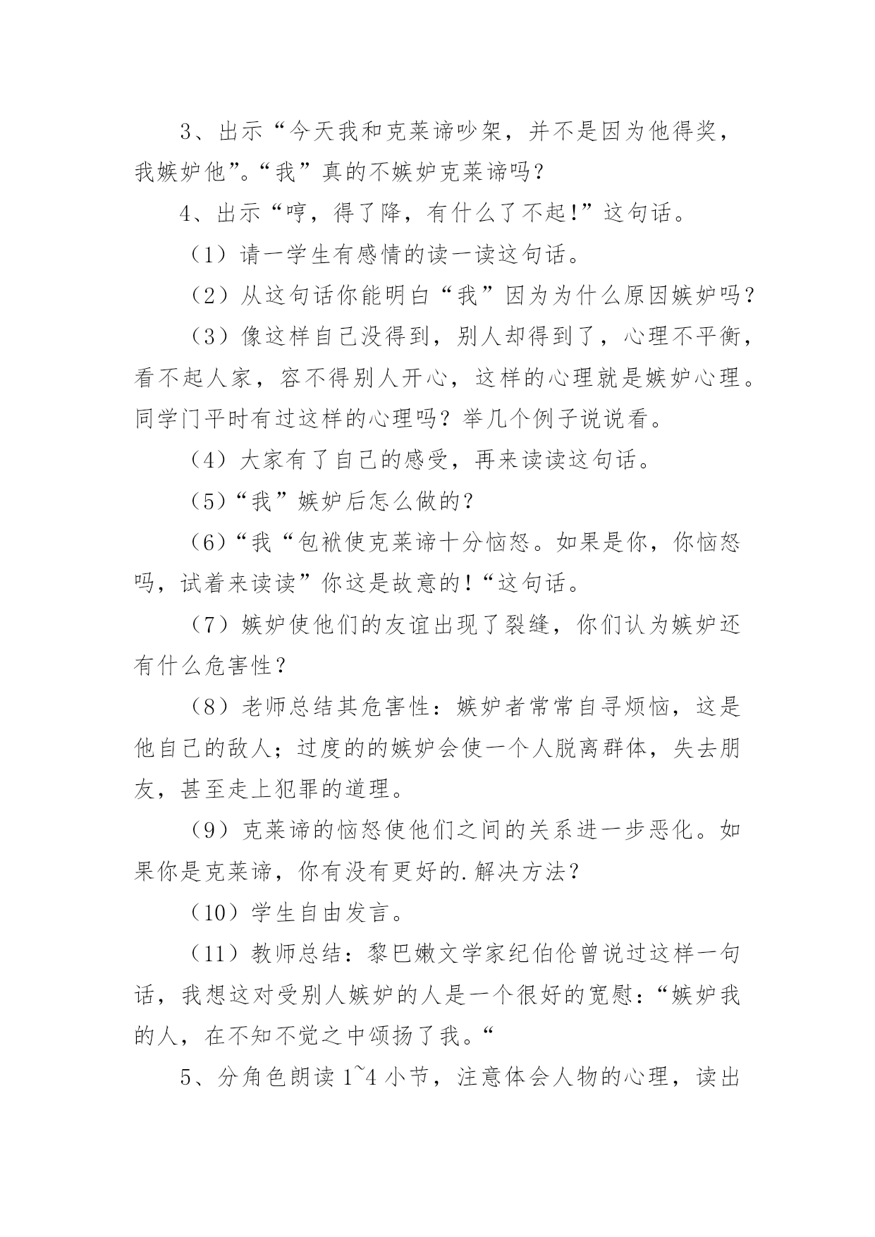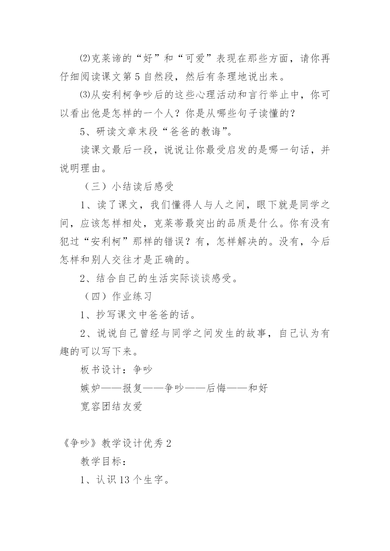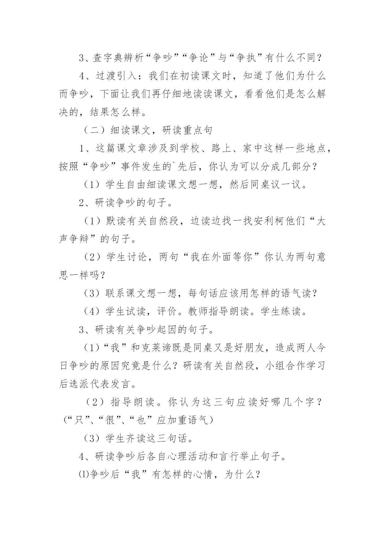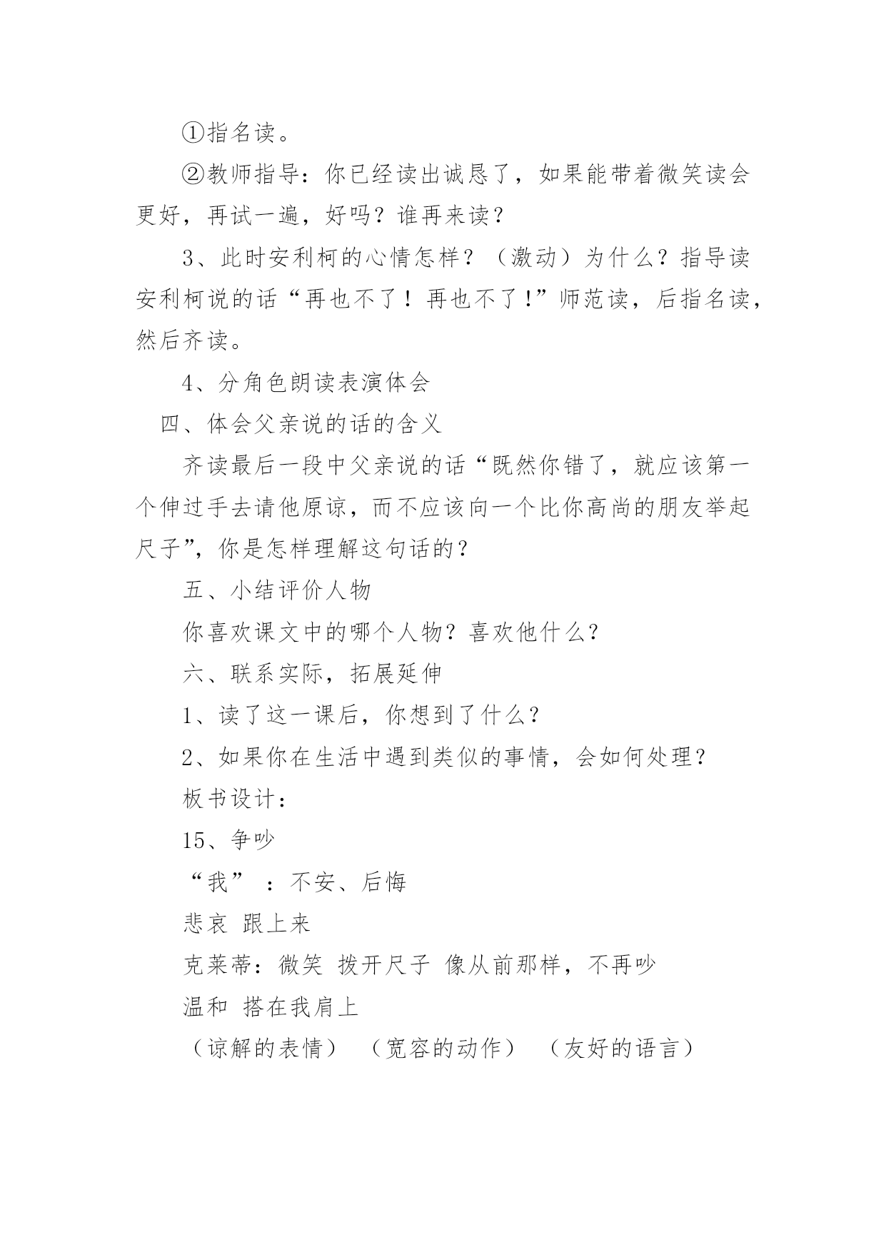 《争吵》教学设计优秀作为一位无私奉献的人民教师,时常需要用到教学设计,教学设计是一个系统设计并实现学习目标的过程,它遵循学习效果最优的原则吗,是课件开发质量高低的关键所在。那么教学设计应该怎么写才合适呢?以下是小编整理的《争吵》教学设计优秀,欢迎阅读与收藏。《争吵》教学设计优秀1一、教学目标1、认知目标:认识、学会本文的生字新词,辨识“争吵”“争论”“争执”的不同意义;读懂“我”和克莱蒂争吵的起因、争吵后各自的表现。2、技能目标:感情朗读课文中的有关段落。3、情感目标:懂得人与人之间要团结友爱、相互宽容的道理。二、教学重点、难点、揣摩品味课文中的关键句子、关键词语。三、教学准备多媒体课件四、教学过程(一)复习引入1、指名认读生字。2、挑选自己喜欢的生字,找找朋友。3、查字典辨析“争吵”“争论”与“争执”有什么不同?4、过渡引入:我们在初读课文时,知道了他们为什么而争吵,下面让我们再仔细地读读课文,看看他们是怎么解决的,结果怎么样。(二)细读课文,研读重点句1、这篇课文章涉及到学校、路上、家中这样一些地点,按照“争吵”事件发生的`先后,你认为可以分成几部分?(1)学生自由细读课文想一想,然后同桌议一议。2、研读争吵的句子。(1)默读有关自然段,边读边找一找安利柯他们“大声争辩”的句子。(2)学生讨论,两句“我在外面等你”你认为两句意思一样吗?(3)联系课文想一想,每句话应该用怎样的语气读?(4)学生试读,评价。教师指导朗读。学生练读。3、研读有关争吵起因的句子。(1)“我”和克莱谛既是同桌又是好朋友,造成两人今日争吵的原因究竟是什么?研读有关自然段,小组合作学习后选派代表发言。(2)指导朗读。你认为这三句应读好哪几个字?(“只”、“很”、“也”应加重语气)(3)学生齐读这三句话。4、研读争吵后各自心理活动和言行举止句子。⑴争吵后“我”有怎样的心情,为什么?⑵克莱谛的“好”和“可爱”表现在那些方面,请你再仔细阅读课文第5自然段,然后有条理地说出来。⑶从安利柯争吵后的这些心理活动和言行举止中,你可以看出他是怎样的一个人?你是从哪些句子读懂的?5、研读文章末段“爸爸的教诲”。读课文最后一段,说说让你最受启发的是哪一句话,并说明理由。(三)小结读后感受1、读了课文,我们懂得人与人之间,眼下就是同学之间,应该怎样相处,克莱蒂最突出的品质是什么。你有没有犯过“安利柯”那样的错误?有,怎样解决的。没有,今后怎样和别人交往才是正确的。2、结合自己的生活实际谈谈感受。(四)作业练习1、抄写课文中爸爸的话。2、说说自己曾经与同学之间发生的故事,自己认为有趣的可以写下来。板书设计:争吵嫉妒——报复——争吵——后悔——和好宽容团结友爱《争吵》教学设计优秀2教学目标:1、认识13个生字。2、正确、流利,有感情地朗读课文。3、了解课文内容,懂得同学之间、朋友之间应该相互宽容、团结友爱。教学过程:一、“人”字新解,导入新课。1、板书“人”字。2、谈话:我们在写“人”字时,因为有了撇和捺的团结友爱,互相配合,相互支撑,才使“人”字撇和捺的书写那样,也必须团结友爱,互相帮助。但是,在生活中,人与人之间难免一些争吵,你遇到这样的情况,会怎样做呢?二、初读课文,整体感知1、检查生字词。用小黑板出示字词,先让学生根据自己的预习情况,把自己认为易错的字指出来,提醒大家注意。嫉妒原谅服侍承认防御高尚哼戒尺胳膊肘缘故指名读。齐读。2、检查课文朗读情况。指名开火车读,一人读一段。读后交流:说一说课文中主要讲了哪几个人,他们之间发生了什么事。三、直击“原因”,深化感知。1、通过刚才的学习,大家知道他们为什么发生争吵吗?2、课文哪几个小姐是将争吵原因的?找出来读一读。3、出示“今天我和克莱谛吵架,并不是因为他得奖,我嫉妒他”。“我”真的不嫉妒克莱谛吗?4、出示“哼,得了降,有什么了不起!”这句话。(1)请一学生有感情的读一读这句话。(2)从这句话你能明白“我”因为为什么原因嫉妒吗?(3)像这样自己没得到,别人却得到了,心理不平衡,看不起人家,容不得别人开心,这样的心理就是嫉妒心理。同学门平时有过这样的心理吗?举几个例子说说看。(4)大家有了自己的感受,再来读读这句话。(5)“我”嫉妒后怎么做的?(6)“我“包袱使克莱谛十分恼怒。如果是你,你恼怒吗,试着来读读”你这是故意的!“这句话。(7)嫉妒使他们的友谊出现了裂缝,你们认为嫉妒还有什么危害性?(8)老师总结其危害性:嫉妒者常常自寻烦恼,这是他自己的敌人;过度的的嫉妒会使一个人脱离群体,失去朋友,甚至走上犯罪的道理。(9)克莱谛的恼怒使他们之间的关系进一步恶化。如果你是克莱谛,你有没有更好的.解决方法?(10)学生自由发言。(11)教师总结:黎巴嫩文学家纪伯伦曾说过这样一句话,我想这对受别人嫉妒的人是一个很好的宽慰:“嫉妒我的