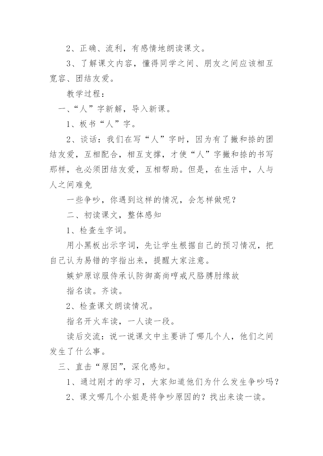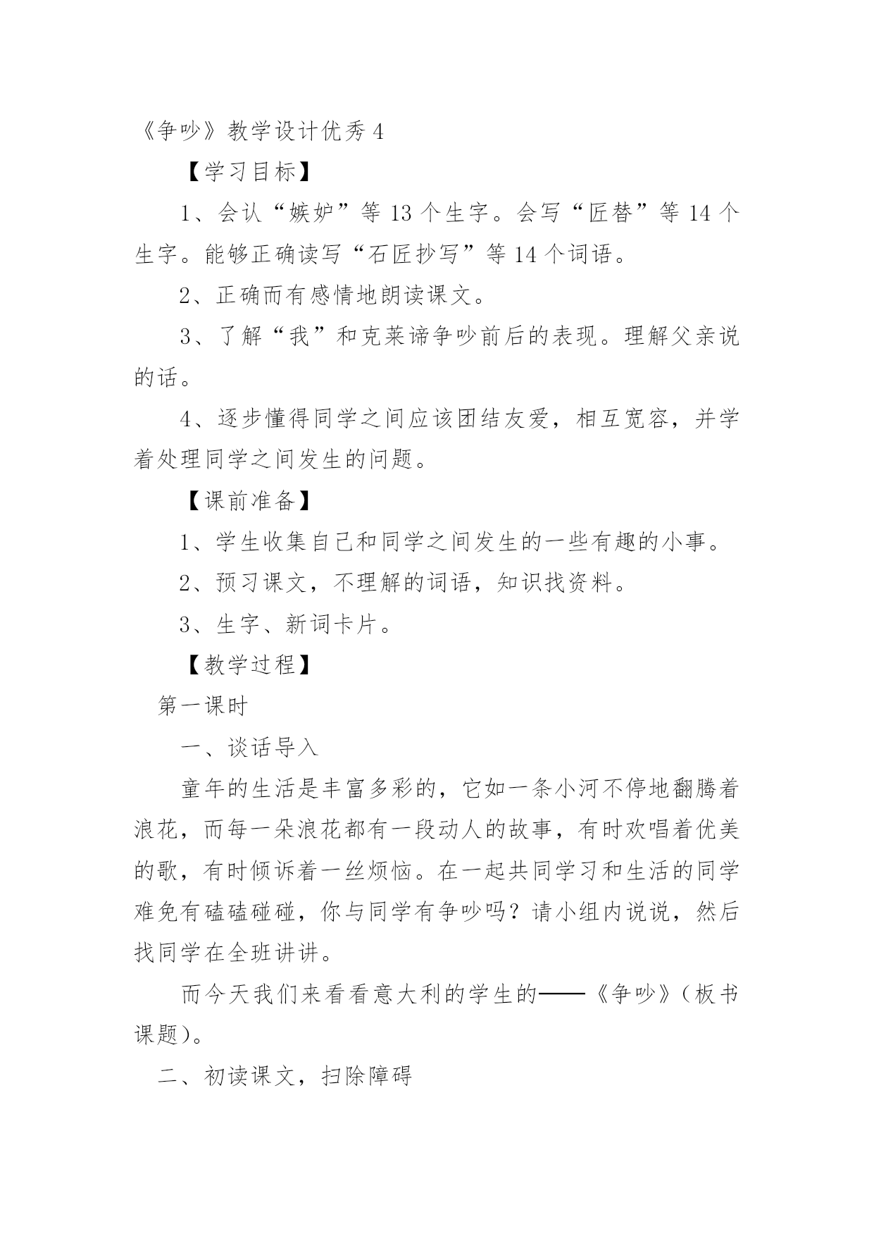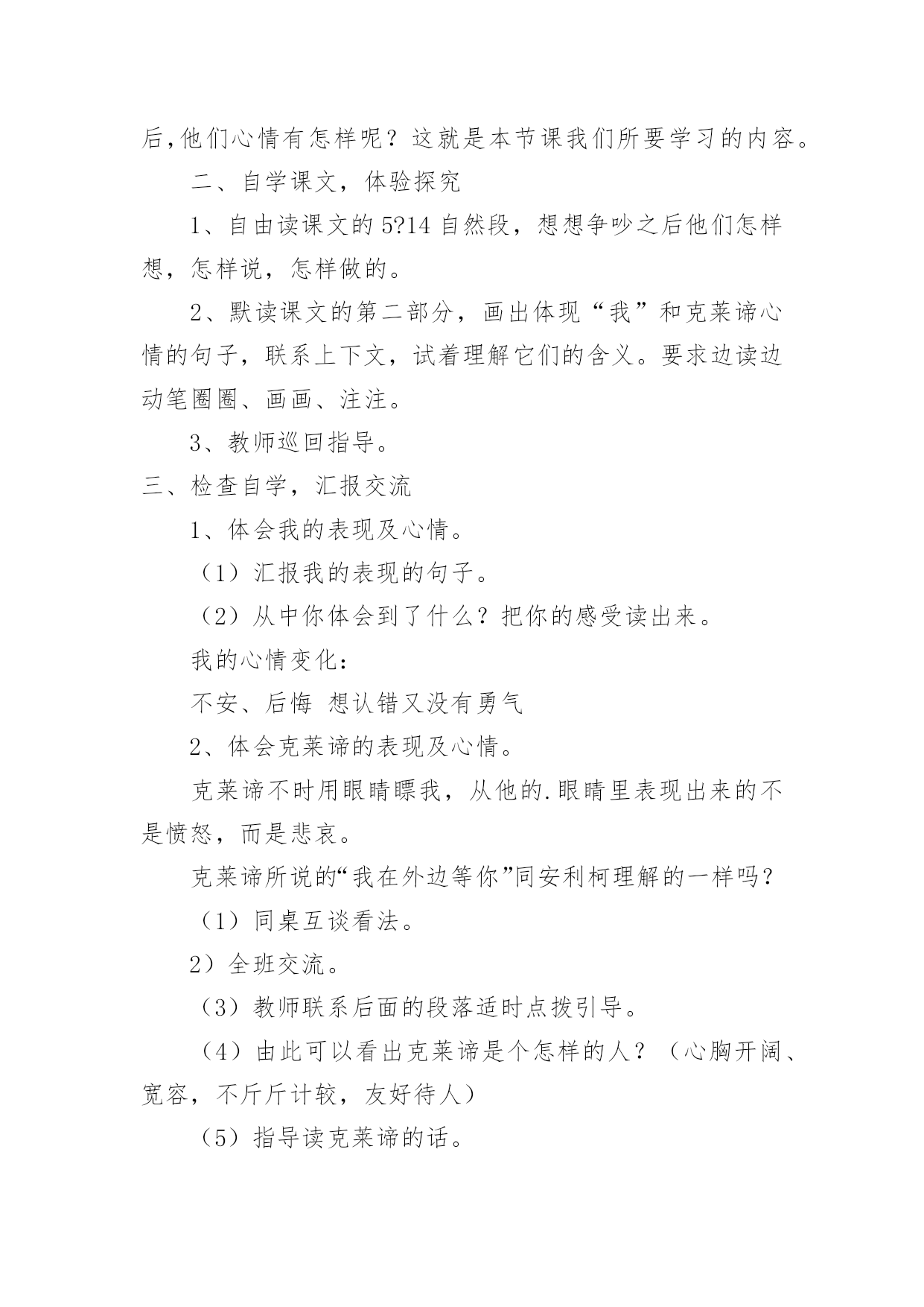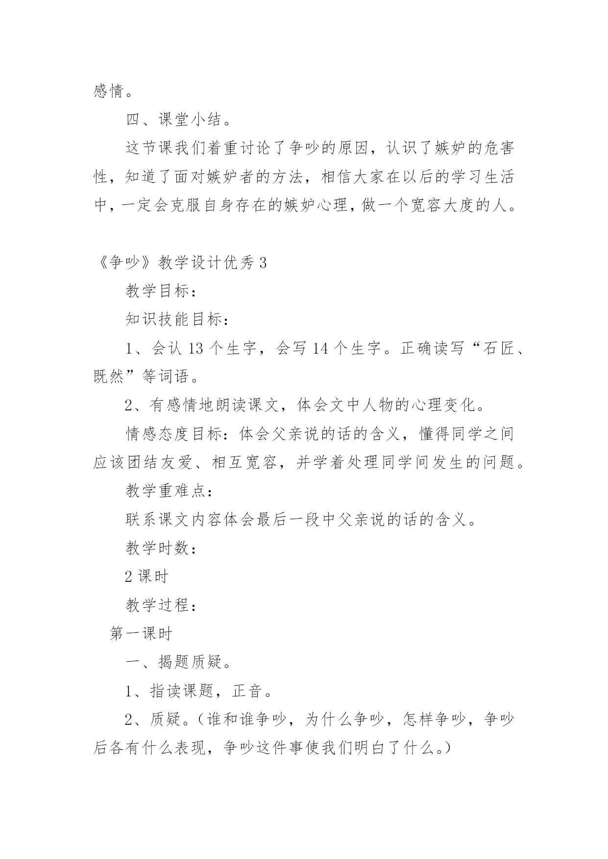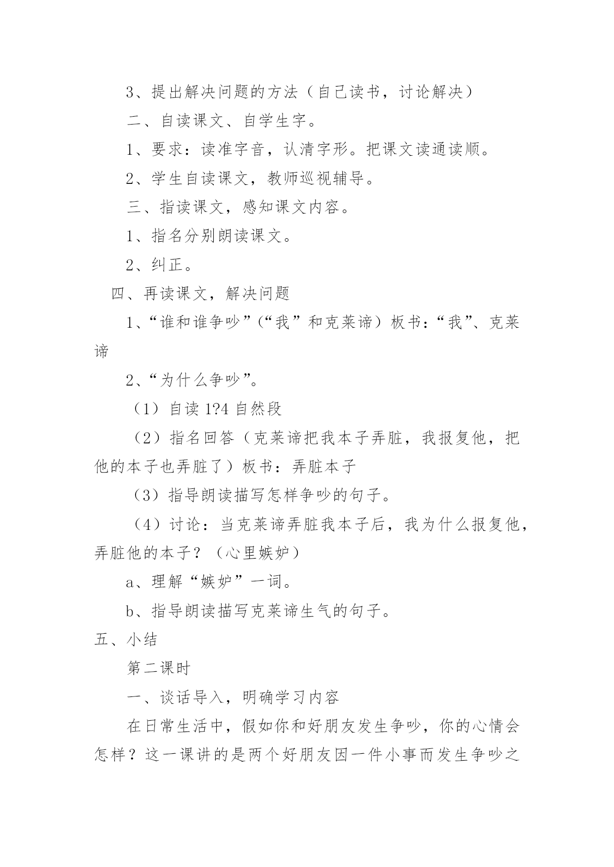 《争吵》教学设计优秀作为一位无私奉献的人民教师,时常需要用到教学设计,教学设计是一个系统设计并实现学习目标的过程,它遵循学习效果最优的原则吗,是课件开发质量高低的关键所在。那么教学设计应该怎么写才合适呢?以下是小编整理的《争吵》教学设计优秀,欢迎阅读与收藏。《争吵》教学设计优秀1一、教学目标1、认知目标:认识、学会本文的生字新词,辨识“争吵”“争论”“争执”的不同意义;读懂“我”和克莱蒂争吵的起因、争吵后各自的表现。2、技能目标:感情朗读课文中的有关段落。3、情感目标:懂得人与人之间要团结友爱、相互宽容的道理。二、教学重点、难点、揣摩品味课文中的关键句子、关键词语。三、教学准备多媒体课件四、教学过程(一)复习引入1、指名认读生字。2、挑选自己喜欢的生字,找找朋友。3、查字典辨析“争吵”“争论”与“争执”有什么不同?4、过渡引入:我们在初读课文时,知道了他们为什么而争吵,下面让我们再仔细地读读课文,看看他们是怎么解决的,结果怎么样。(二)细读课文,研读重点句1、这篇课文章涉及到学校、路上、家中这样一些地点,按照“争吵”事件发生的`先后,你认为可以分成几部分?(1)学生自由细读课文想一想,然后同桌议一议。2、研读争吵的句子。(1)默读有关自然段,边读边找一找安利柯他们“大声争辩”的句子。(2)学生讨论,两句“我在外面等你”你认为两句意思一样吗?(3)联系课文想一想,每句话应该用怎样的语气读?(4)学生试读,评价。教师指导朗读。学生练读。3、研读有关争吵起因的句子。(1)“我”和克莱谛既是同桌又是好朋友,造成两人今日争吵的原因究竟是什么?研读有关自然段,小组合作学习后选派代表发言。(2)指导朗读。你认为这三句应读好哪几个字?(“只”、“很”、“也”应加重语气)(3)学生齐读这三句话。4、研读争吵后各自心理活动和言行举止句子。⑴争吵后“我”有怎样的心情,为什么?⑵克莱谛的“好”和“可爱”表现在那些方面,请你再仔细阅读课文第5自然段,然后有条理地说出来。⑶从安利柯争吵后的这些心理活动和言行举止中,你可以看出他是怎样的一个人?你是从哪些句子读懂的?5、研读文章末段“爸爸的教诲”。读课文最后一段,说说让你最受启发的是哪一句话,并说明理由。(三)小结读后感受1、读了课文,我们懂得人与人之间,眼下就是同学之间,应该怎样相处,克莱蒂最突出的品质是什么。你有没有犯过“安利柯”那样的错误?有,怎样解决的。没有,今后怎样和别人交往才是正确的。2、结合自己的生活实际谈谈感受。(四)作业练习1、抄写课文中爸爸的话。2、说说自己曾经与同学之间发生的故事,自己认为有趣的可以写下来。板书设计:争吵嫉妒——报复——争吵——后悔——和好宽容团结友爱《争吵》教学设计优秀2教学目标:1、认识13个生字。2、正确、流利,有感情地朗读课文。3、了解课文内容,懂得同学之间、朋友之间应该相互宽容、团结友爱。教学过程:一、“人”字新解,导入新课。1、板书“人”字。2、谈话:我们在写“人”字时,因为有了撇和捺的团结友爱,互相配合,相互支撑,才使“人”字撇和捺的书写那样,也必须团结友爱,互相帮助。但是,在生活中,人与人之间难免一些争吵,你遇到这样的情况,会怎样做呢?二、初读课文,整体感知1、检查生字词。用小黑板出示字词,先让学生根据自己的预习情况,把自己认为易错的字指出来,提醒大家注意。嫉妒原谅服侍承认防御高尚哼戒尺胳膊肘缘故指名读。齐读。2、检查课文朗读情况。指名开火车读,一人读一段。读后交流:说一说课文中主要讲了哪几个人,他们之间发生了什么事。三、直击“原因”,深化感知。1、通过刚才的学习,大家知道他们为什么发生争吵吗?2、课文哪几个小姐是将争吵原因的?找出来读一读。3、出示“今天我和克莱谛吵架,并不是因为他得奖,我嫉妒他”。“我”真的不嫉妒克莱谛吗?4、出示“哼,得了降,有什么了不起!”这句话。(1)请一学生有感情的读一读这句话。(2)从这句话你能明白“我”因为为什么原因嫉妒吗?(3)像这样自己没得到,别人却得到了,心理不平衡,看不起人家,容不得别人开心,这样的心理就是嫉妒心理。同学门平时有过这样的心理吗?举几个例子说说看。(4)大家有了自己的感受,再来读读这句话。(5)“我”嫉妒后怎么做的?(6)“我“包袱使克莱谛十分恼怒。如果是你,你恼怒吗,试着来读读”你这是故意的!“这句话。(7)嫉妒使他们的友谊出现了裂缝,你们认为嫉妒还有什么危害性?(8)老师总结其危害性:嫉妒者常常自寻烦恼,这是他自己的敌人;过度的的嫉妒会使一个人脱离群体,失去朋友,甚至走上犯罪的道理。(9)克莱谛的恼怒使他们之间的关系进一步恶化。如果你是克莱谛,你有没有更好的.解决方法?(10)学生自由发言。(11)教师总结:黎巴嫩文学家纪伯伦曾说过这样一句话,我想这对受别人嫉妒的人是一个很好的宽慰:“嫉妒我的