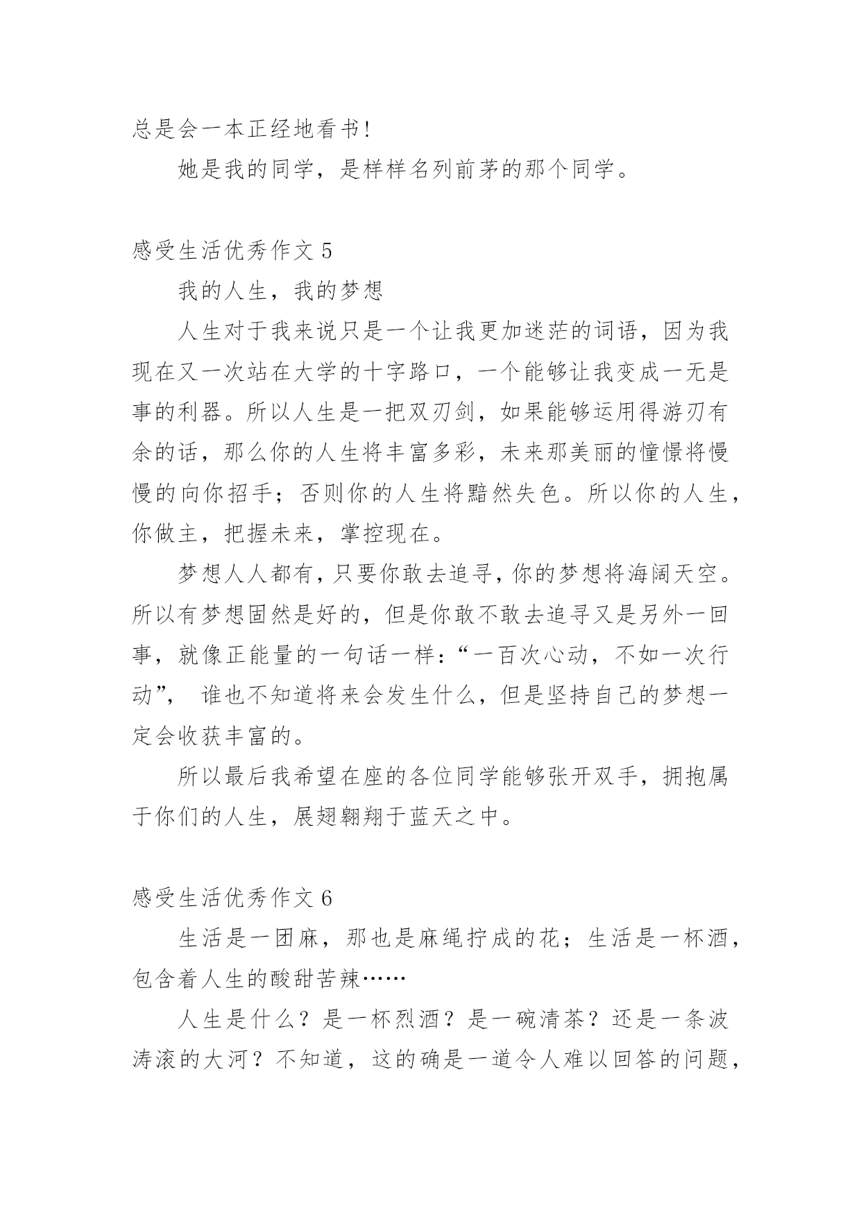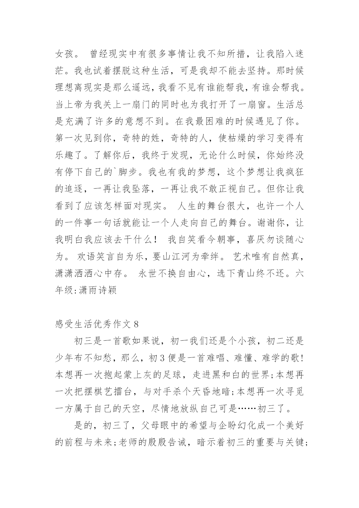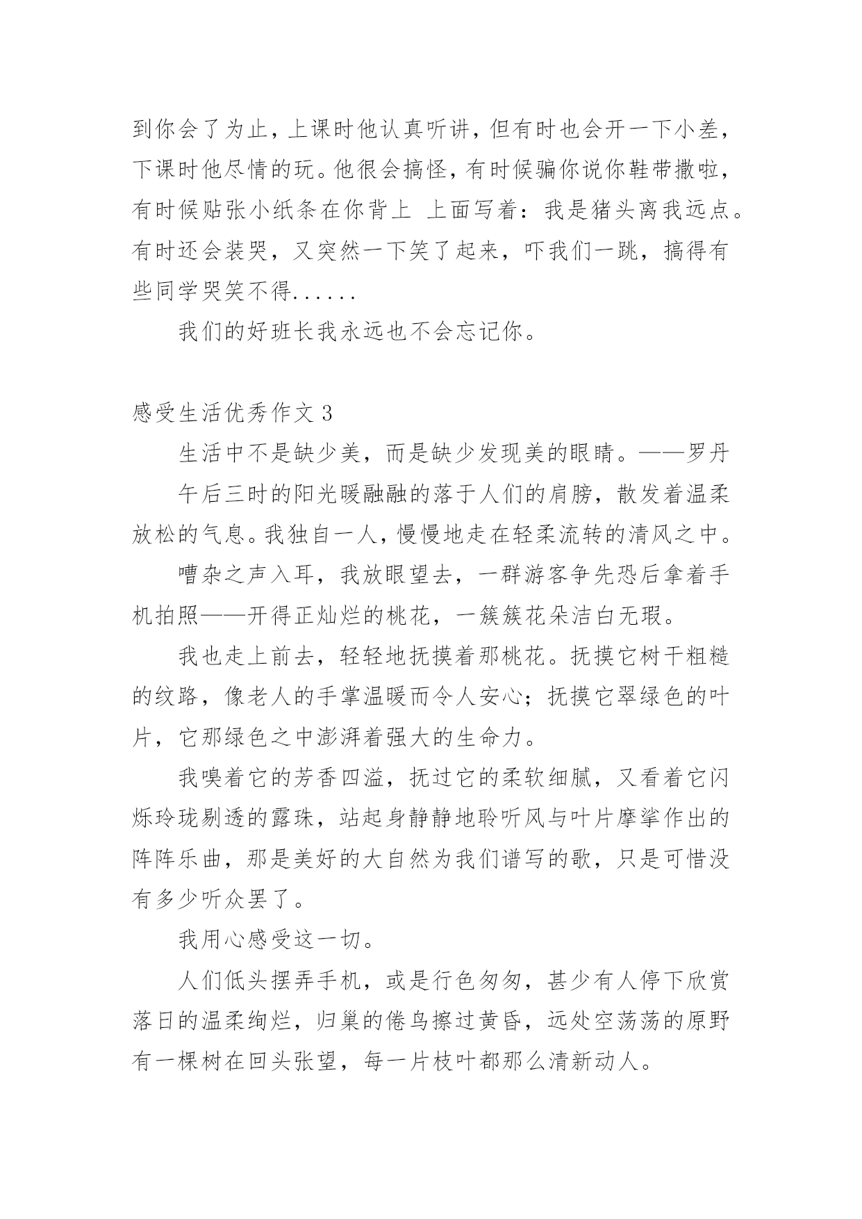 感受生活优秀作文感受生活优秀作文8篇无论在学习、工作或是生活中,大家最不陌生的就是作文了吧,借助作文可以提高我们的语言组织能力。作文的注意事项有许多,你确定会写吗?下面是小编为大家收集的感受生活优秀作文,仅供参考,希望能够帮助到大家。感受生活优秀作文1当我们降临到这个世上从出生到成长,从中年到衰亡生活带给我们的足生命的起点与终结当我们在沙滩上玩委玲粉金色的童年生活带给我们的是大海的宽容和柔和当我们在苹丛中汉步伴着多彩的青春生活带给我们的是青苹的天真与无那当我们路程过丰走向录辉垃的时候生活带给我们的是人生的成功与收获当我们步及蹒跚乘看小舟去钓鱼生活带给我们的足鱼儿的悠闲与欢乐仰望名山的徽峨俯看湖水的清漱玲听动人的旋律——是优美的生活亲情带来注暖友情带来真诚从中感受到的是幸福的生活品尝失放的痛苦体脸奋斗的艰辛实现远大的理想是苦尽甘来的生活。这便是生活!感受生活优秀作文2光阴似箭,日月如梭。一眨眼三个年头过去了,我已经在小学待了三年了,在这三年中我结识了许多朋友。令我印象最深的还是五年级的班长-------杜昌昊。他,胖胖的,个子不高,大概1米50左右;一双炯炯有神的眼睛,大而挺的鼻子,有点像牛鼻子,一张宽阔的嘴巴,吃东西方便多了,还有一对芭蕉耳。他经常穿着一件t-shirt.一条七分裤和一双板鞋,简单的穿着体现出他的朴实、稳重。他的成绩非常好,人人都羡慕,老师也很喜欢他,他不仅成绩好而且人也很好。有爱心、善良是他的特点,他非常喜欢助人为乐,在学习上有不懂的他都会一一帮你解答,教到你会了为止,上课时他认真听讲,但有时也会开一下小差,下课时他尽情的玩。他很会搞怪,有时候骗你说你鞋带撒啦,有时候贴张小纸条在你背上上面写着:我是猪头离我远点。有时还会装哭,又突然一下笑了起来,吓我们一跳,搞得有些同学哭笑不得......我们的好班长我永远也不会忘记你。感受生活优秀作文3生活中不是缺少美,而是缺少发现美的眼睛。——罗丹午后三时的阳光暖融融的落于人们的肩膀,散发着温柔放松的气息。我独自一人,慢慢地走在轻柔流转的清风之中。嘈杂之声入耳,我放眼望去,一群游客争先恐后拿着手机拍照——开得正灿烂的桃花,一簇簇花朵洁白无瑕。我也走上前去,轻轻地抚摸着那桃花。抚摸它树干粗糙的纹路,像老人的手掌温暖而令人安心;抚摸它翠绿色的叶片,它那绿色之中澎湃着强大的生命力。我嗅着它的芳香四溢,抚过它的柔软细腻,又看着它闪烁玲珑剔透的露珠,站起身静静地聆听风与叶片摩挲作出的阵阵乐曲,那是美好的大自然为我们谱写的歌,只是可惜没有多少听众罢了。我用心感受这一切。人们低头摆弄手机,或是行色匆匆,甚少有人停下欣赏落日的温柔绚烂,归巢的倦鸟擦过黄昏,远处空荡荡的原野有一棵树在回头张望,每一片枝叶都那么清新动人。云霞西逝,拖出绵长的流苏,浓厚的云翱翔于天空。夕阳如画,风吻晚霞,却少有人来欣赏。如果我们能够用心感受生活,那么这整个世界将对你温柔以待。感受生活优秀作文4我有一个非常要好的同学,她在每次考试中都能排第一,还在班级里当副班长,样样都好。她总会去帮助一些困难的同学。比如,有些同学请假没来上学,来上学时作业写不出她会去帮助完成作业。仿佛一位老师在教学生一般。记得有一次,我的作业没有写好,她是语文组长,就要收作业了,我还没有一点头绪,差我一本了,原本以为她去交作业本了,没有等我,可谁也没想到,她竟然放下作业本,向我走来,问我:“好了吗?我要去交了,如果你实在写不出来的话!我可以来教教你!”“谢谢!”她教我说可以怎样写,并给我举了几个例子。讲完,我有了头绪也构思好了,写得也快,不一会儿,就写好了。虽然,这只是件小小的事,但这也体现出了她爱学习,爱帮助困难的同学。她也是我学习的榜样!运动会上,她管理同学,让她们没有半点声音。在60米跑和垒球比赛中她也名列前茅,如果,班级里有同学伤心,她会跑去安慰她,不再让她哭。有几个同学吵架,把桌子里的书扔了出来,她也会走上前去捡起来,放在桌子上,并劝阻同学们不要吵。增进了同学们之间的友谊。当然,她自己也从不和同学打闹,总是会一本正经地看书!她是我的同学,是样样名列前茅的那个同学。感受生活优秀作文5我的人生,我的梦想人生对于我来说只是一个让我更加迷茫的词语,因为我现在又一次站在大学的十字路口,一个能够让我变成一无是事的利器。所以人生是一把双刃剑,如果能够运用得游刃有余的话,那么你的人生将丰富多彩,未来那美丽的憧憬将慢慢的向你招手;否则你的人生将黯然失色。所以你的人生,你做主,把握未来,掌控现在。梦想人人都有,只要你敢去追寻,你的梦想将海阔天空。所以有梦想固然是好的,但是你敢不敢去追寻又是另外一回事,就像正能量的一句话一样:“一百次心动,不如一次行动”,谁也不知道将来会发生什么,但是坚持自己的梦想一定会收获丰富的。所以最后我希望在座的各位同学能够张开