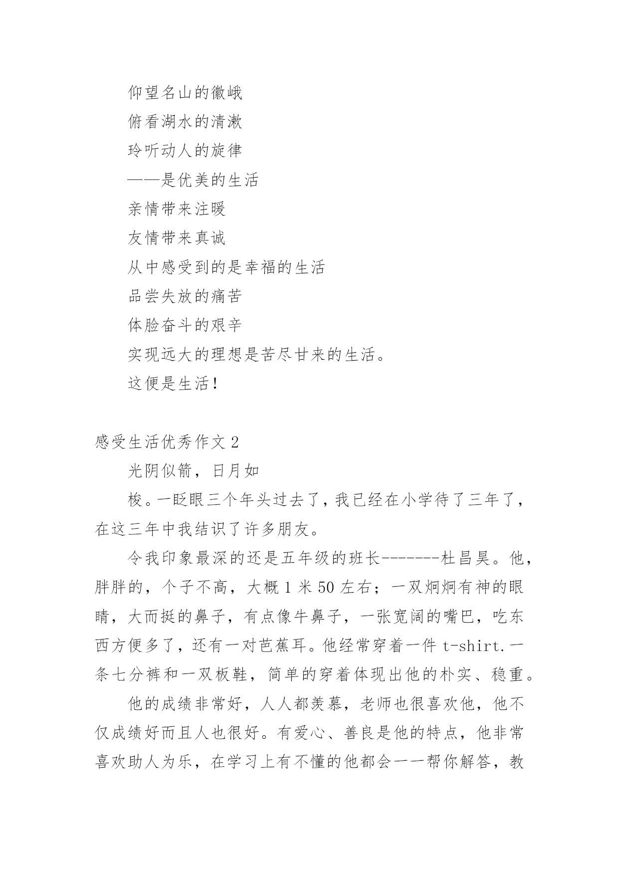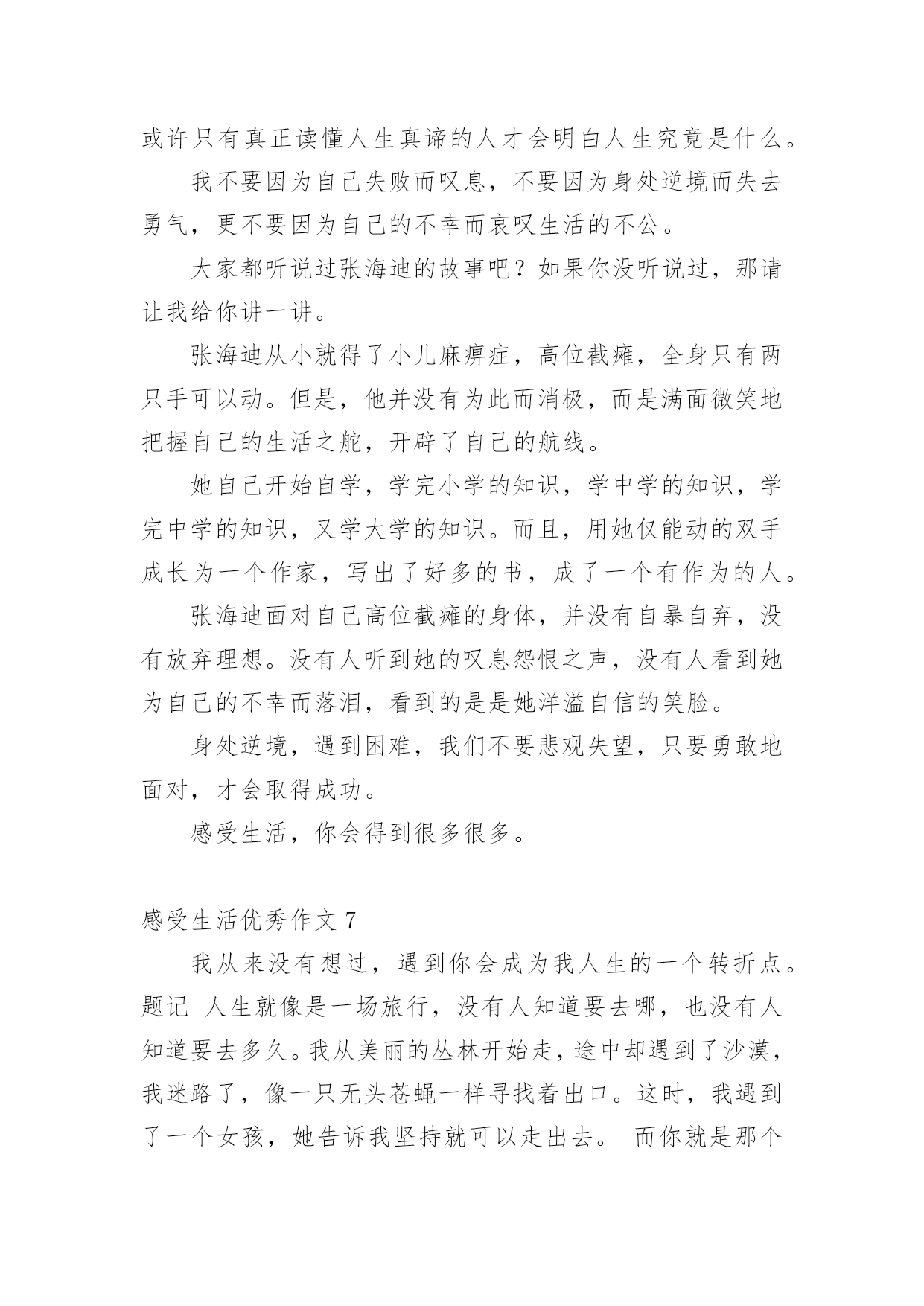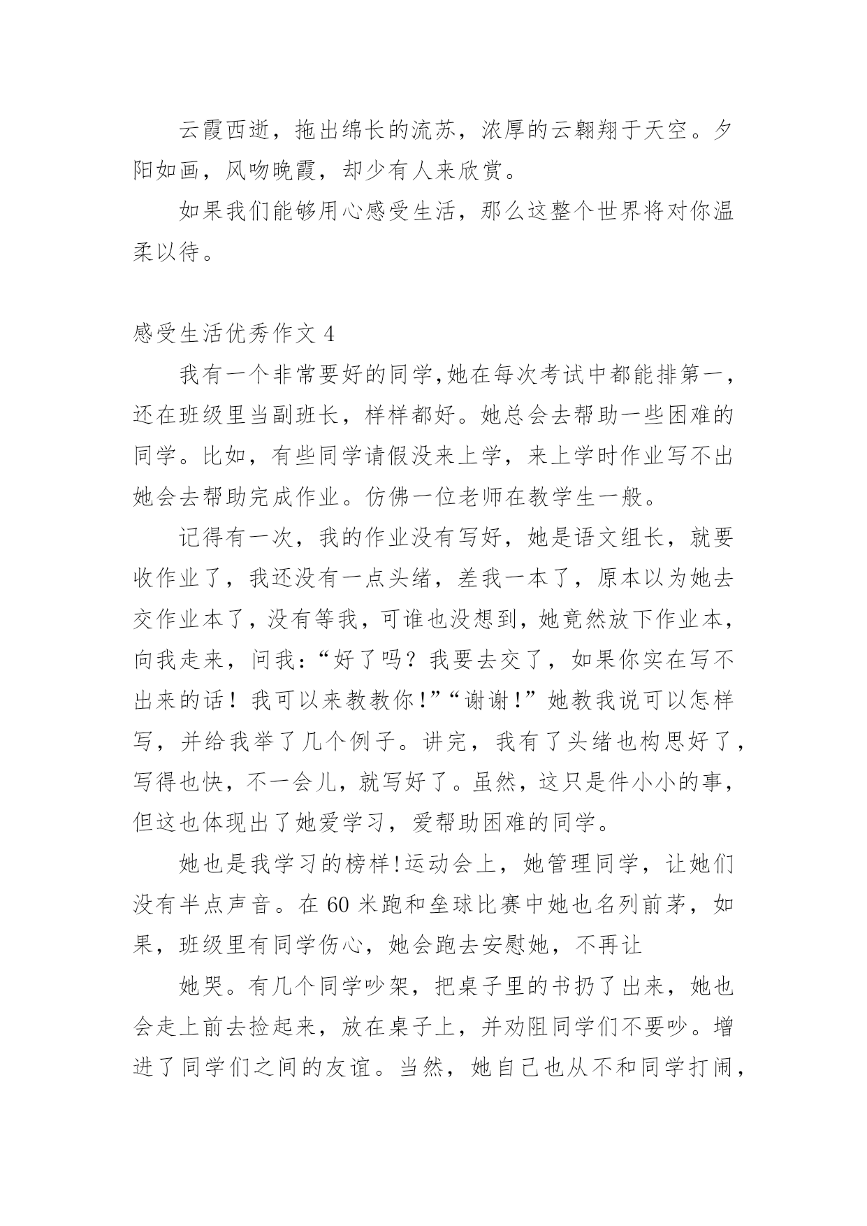 感受生活优秀作文感受生活优秀作文8篇无论在学习、工作或是生活中,大家最不陌生的就是作文了吧,借助作文可以提高我们的语言组织能力。作文的注意事项有许多,你确定会写吗?下面是小编为大家收集的感受生活优秀作文,仅供参考,希望能够帮助到大家。感受生活优秀作文1当我们降临到这个世上从出生到成长,从中年到衰亡生活带给我们的足生命的起点与终结当我们在沙滩上玩委玲粉金色的童年生活带给我们的是大海的宽容和柔和当我们在苹丛中汉步伴着多彩的青春生活带给我们的是青苹的天真与无那当我们路程过丰走向录辉垃的时候生活带给我们的是人生的成功与收获当我们步及蹒跚乘看小舟去钓鱼生活带给我们的足鱼儿的悠闲与欢乐仰望名山的徽峨俯看湖水的清漱玲听动人的旋律——是优美的生活亲情带来注暖友情带来真诚从中感受到的是幸福的生活品尝失放的痛苦体脸奋斗的艰辛实现远大的理想是苦尽甘来的生活。这便是生活!感受生活优秀作文2光阴似箭,日月如梭。一眨眼三个年头过去了,我已经在小学待了三年了,在这三年中我结识了许多朋友。令我印象最深的还是五年级的班长-------杜昌昊。他,胖胖的,个子不高,大概1米50左右;一双炯炯有神的眼睛,大而挺的鼻子,有点像牛鼻子,一张宽阔的嘴巴,吃东西方便多了,还有一对芭蕉耳。他经常穿着一件t-shirt.一条七分裤和一双板鞋,简单的穿着体现出他的朴实、稳重。他的成绩非常好,人人都羡慕,老师也很喜欢他,他不仅成绩好而且人也很好。有爱心、善良是他的特点,他非常喜欢助人为乐,在学习上有不懂的他都会一一帮你解答,教到你会了为止,上课时他认真听讲,但有时也会开一下小差,下课时他尽情的玩。他很会搞怪,有时候骗你说你鞋带撒啦,有时候贴张小纸条在你背上上面写着:我是猪头离我远点。有时还会装哭,又突然一下笑了起来,吓我们一跳,搞得有些同学哭笑不得......我们的好班长我永远也不会忘记你。感受生活优秀作文3生活中不是缺少美,而是缺少发现美的眼睛。——罗丹午后三时的阳光暖融融的落于人们的肩膀,散发着温柔放松的气息。我独自一人,慢慢地走在轻柔流转的清风之中。嘈杂之声入耳,我放眼望去,一群游客争先恐后拿着手机拍照——开得正灿烂的桃花,一簇簇花朵洁白无瑕。我也走上前去,轻轻地抚摸着那桃花。抚摸它树干粗糙的纹路,像老人的手掌温暖而令人安心;抚摸它翠绿色的叶片,它那绿色之中澎湃着强大的生命力。我嗅着它的芳香四溢,抚过它的柔软细腻,又看着它闪烁玲珑剔透的露珠,站起身静静地聆听风与叶片摩挲作出的阵阵乐曲,那是美好的大自然为我们谱写的歌,只是可惜没有多少听众罢了。我用心感受这一切。人们低头摆弄手机,或是行色匆匆,甚少有人停下欣赏落日的温柔绚烂,归巢的倦鸟擦过黄昏,远处空荡荡的原野有一棵树在回头张望,每一片枝叶都那么清新动人。云霞西逝,拖出绵长的流苏,浓厚的云翱翔于天空。夕阳如画,风吻晚霞,却少有人来欣赏。如果我们能够用心感受生活,那么这整个世界将对你温柔以待。感受生活优秀作文4我有一个非常要好的同学,她在每次考试中都能排第一,还在班级里当副班长,样样都好。她总会去帮助一些困难的同学。比如,有些同学请假没来上学,来上学时作业写不出她会去帮助完成作业。仿佛一位老师在教学生一般。记得有一次,我的作业没有写好,她是语文组长,就要收作业了,我还没有一点头绪,差我一本了,原本以为她去交作业本了,没有等我,可谁也没想到,她竟然放下作业本,向我走来,问我:“好了吗?我要去交了,如果你实在写不出来的话!我可以来教教你!”“谢谢!”她教我说可以怎样写,并给我举了几个例子。讲完,我有了头绪也构思好了,写得也快,不一会儿,就写好了。虽然,这只是件小小的事,但这也体现出了她爱学习,爱帮助困难的同学。她也是我学习的榜样!运动会上,她管理同学,让她们没有半点声音。在60米跑和垒球比赛中她也名列前茅,如果,班级里有同学伤心,她会跑去安慰她,不再让她哭。有几个同学吵架,把桌子里的书扔了出来,她也会走上前去捡起来,放在桌子上,并劝阻同学们不要吵。增进了同学们之间的友谊。当然,她自己也从不和同学打闹,总是会一本正经地看书!她是我的同学,是样样名列前茅的那个同学。感受生活优秀作文5我的人生,我的梦想人生对于我来说只是一个让我更加迷茫的词语,因为我现在又一次站在大学的十字路口,一个能够让我变成一无是事的利器。所以人生是一把双刃剑,如果能够运用得游刃有余的话,那么你的人生将丰富多彩,未来那美丽的憧憬将慢慢的向你招手;否则你的人生将黯然失色。所以你的人生,你做主,把握未来,掌控现在。梦想人人都有,只要你敢去追寻,你的梦想将海阔天空。所以有梦想固然是好的,但是你敢不敢去追寻又是另外一回事,就像正能量的一句话一样:“一百次心动,不如一次行动”,谁也不知道将来会发生什么,但是坚持自己的梦想一定会收获丰富的。所以最后我希望在座的各位同学能够张开