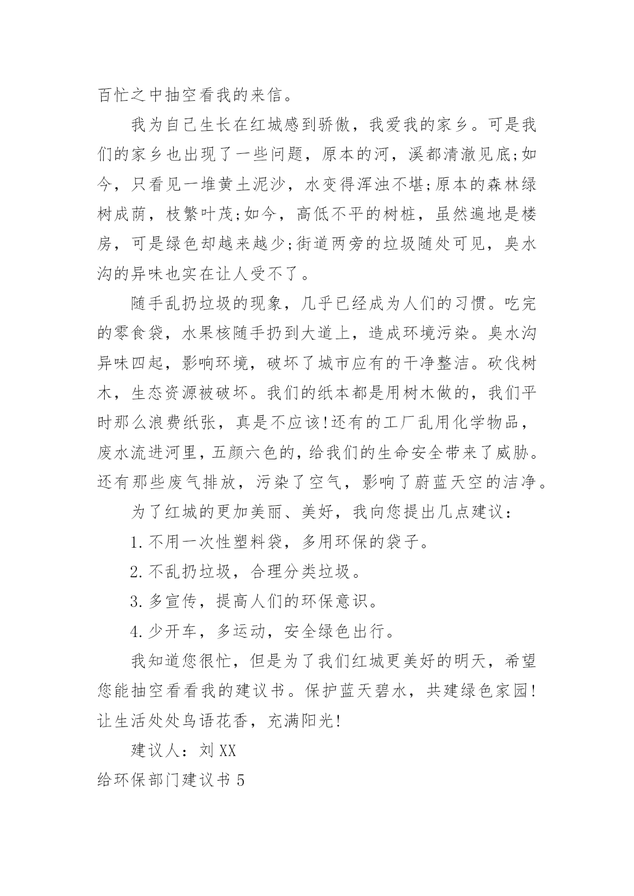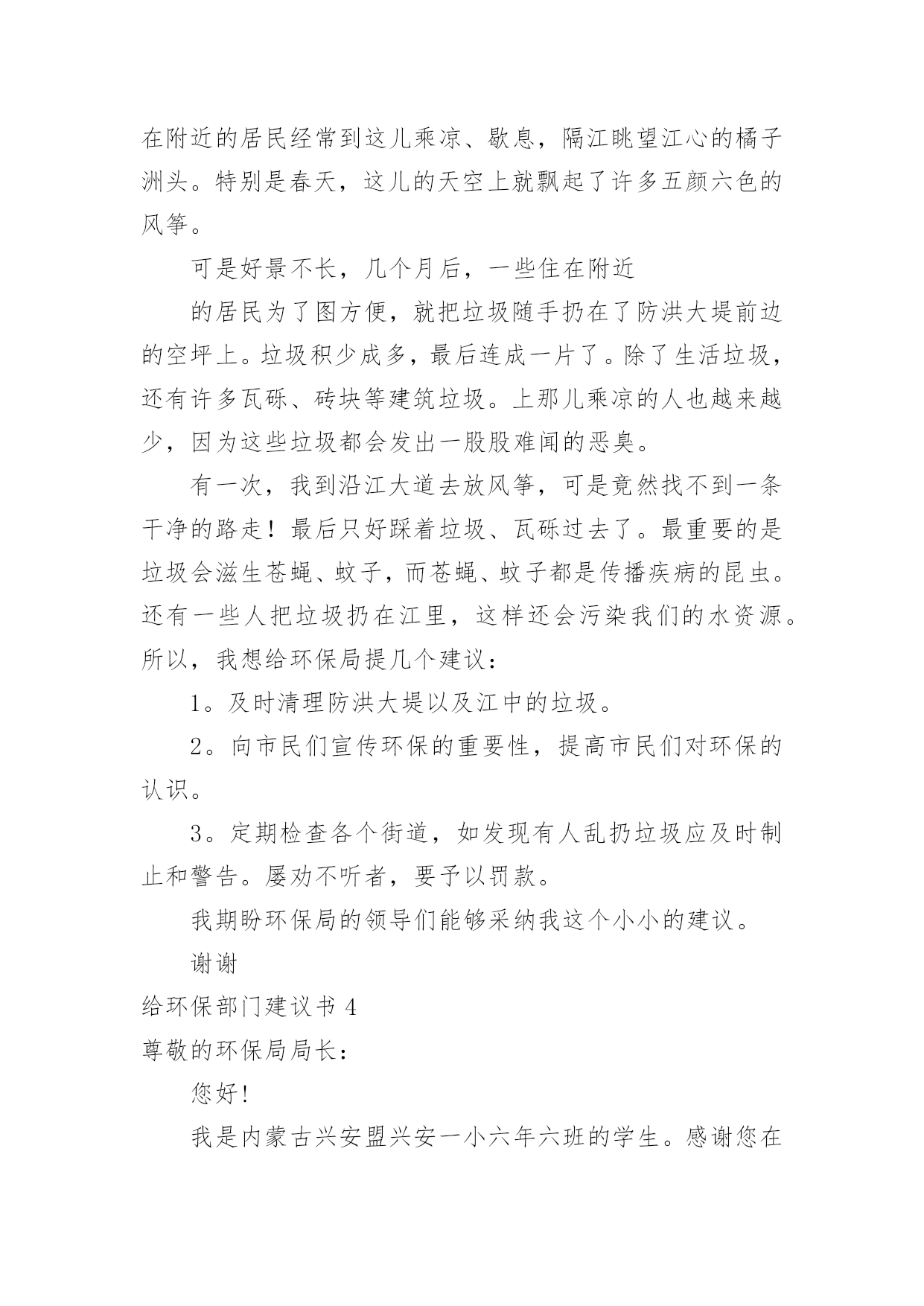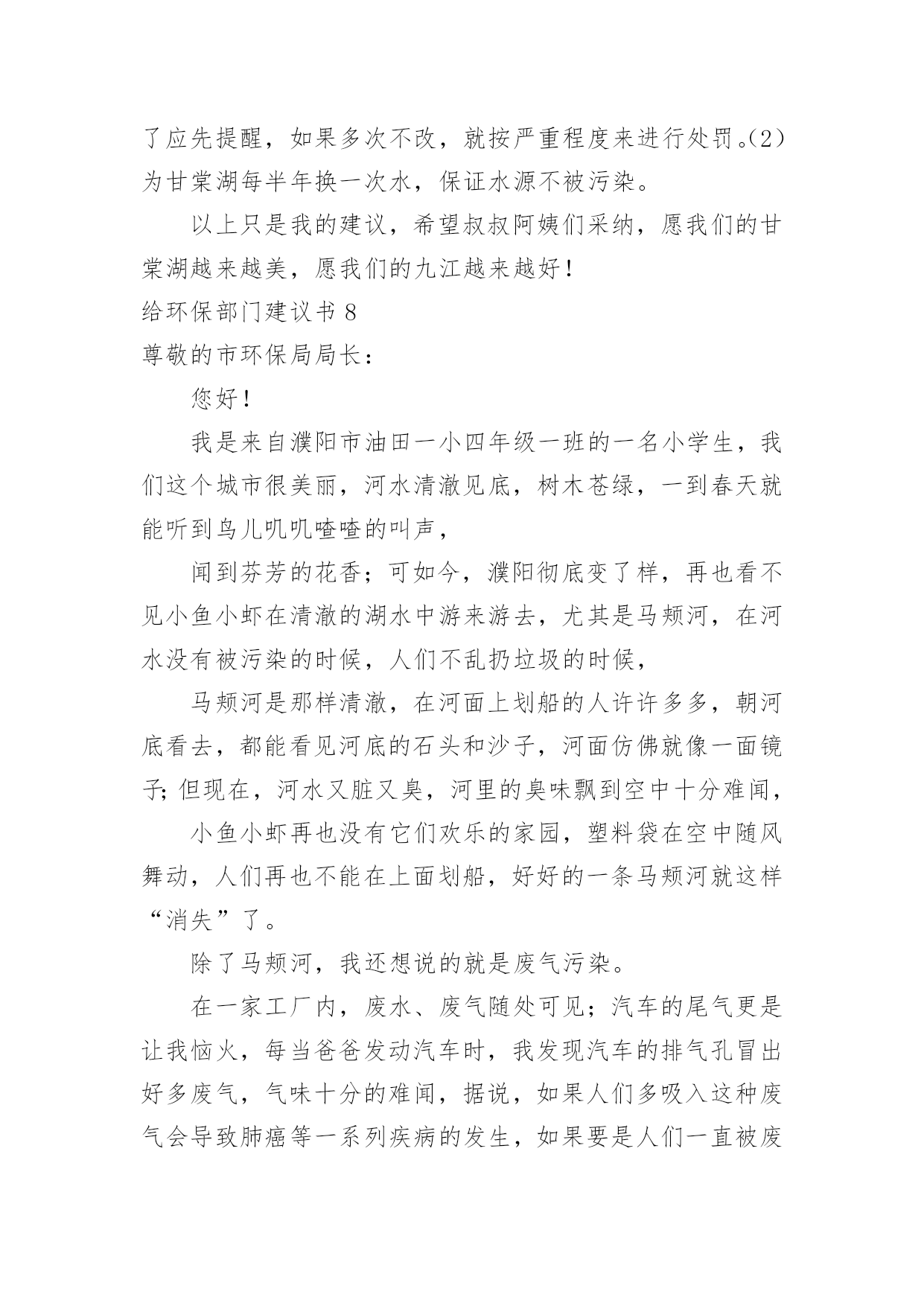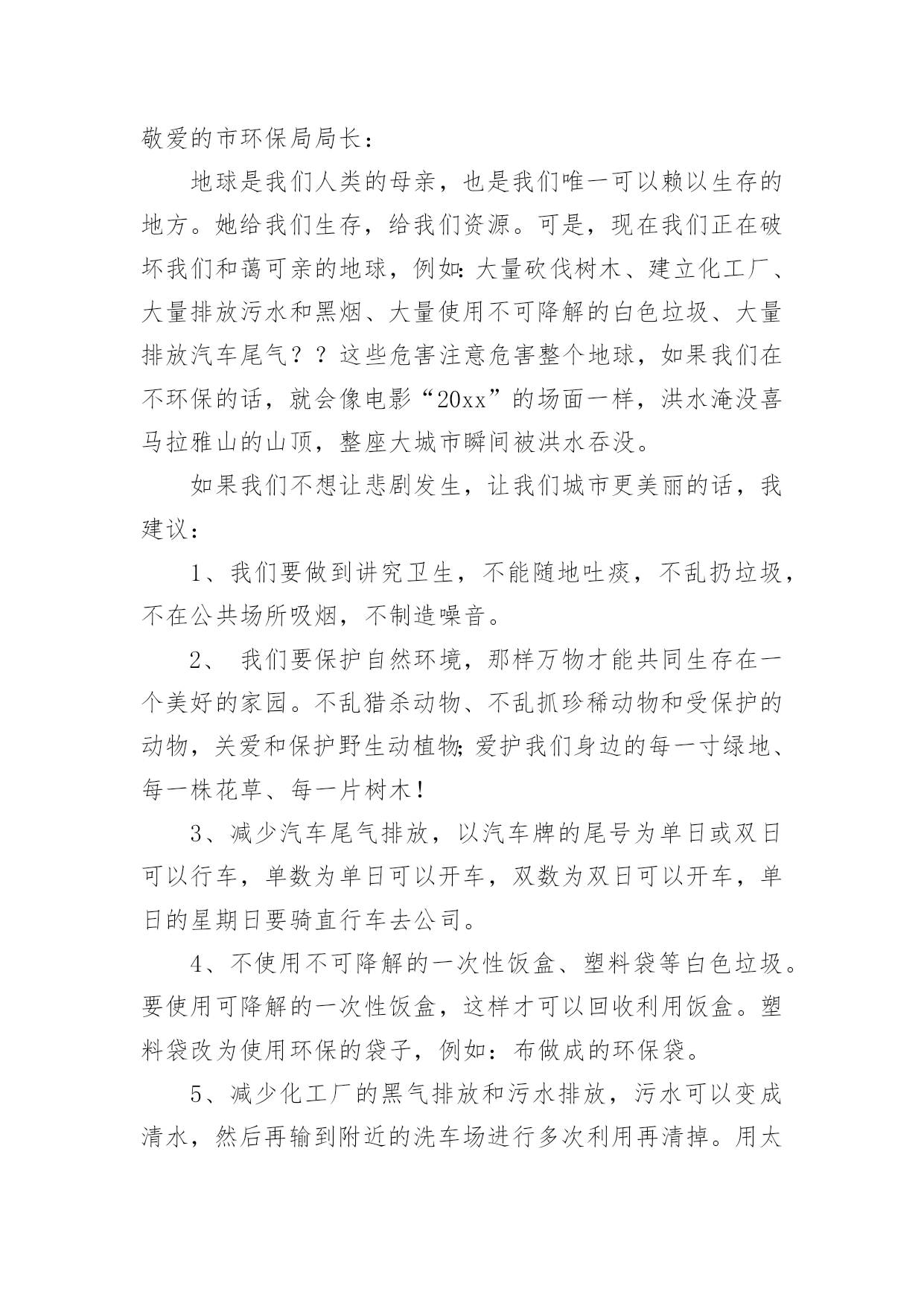 给环保部门建议书给环保部门建议书随着社会一步步向前发展,建议书应用范围愈来愈广泛,在写作上,建议书有一定的书写规范。你写建议书时总是没有新意?以下是小编整理的给环保部门建议书,欢迎大家借鉴与参考,希望对大家有所帮助。给环保部门建议书1环保部门的领导:你们好!看到今天白茫茫,雾蒙蒙的天空,我忍不住提笔给你们写这封信,因为这是雾霾,是粉尘,给人类吸入会危害人类健康。因为这个,我们不能去室外活动,只能躲在教室,可这也避免不了呀,难道让我们整天带上口罩?地球是我们的家,正如《只有一个地球》上所说的,在至少以地球为中心的40万亿千米以内,没有第二个适合人类居住的星球,也就是我们无法搬家。可见,地球对我们来说是多么珍贵。可我依然看见很多很多破坏我们宝贵的家的行为。一个个水龙头在那儿一滴一滴地滴着水,开水龙头的人却不知去向。桌上的饭菜没吃几口,就被随手扔进了泔水桶,却无法从他们的脸上找到丝毫的愧疚。一个个塑料袋被随意取用,却不知道这些材料无法被降解,将永远留在地球上几百万年。这些,都充分说明,太多的人不知道保护环境的重要性,我们需要加强这方面的教育和处罚措施。1、净化空气。教育所有的人,尽可能低碳出行,能坐公共交通的,就尽可能坐公共交通,少开车,将会少很多废气排放。同时还可以号召每天都是植树节,人人重视绿化,有植物的存在,不仅能制造氧气,还能净化空气。这样我们的天空才会早日重现一碧如洗的一天。2、监督所有企业的废水废物排放,对那些随意把废水毒水排入我们的河流的人,要坚决处罚,罚到他们再也不敢这么做。3、从小孩做起,在学校里就开始宣传,节省每一滴水,每一粒饭菜,这样到了他们长大,自然也会教育他们的下一代,代代传承下去。4、逐步杜绝塑料袋的试用,提供试用购物篮、包、纸袋这些包装用品。最后,地球如果毁灭了,谁也活不了,我们一定要记住“亡羊补牢,为时未晚”,从现在开始,保护环境,保护我们的家园。此致敬礼建议人:xxx给环保部门建议书2亲爱的同学们:你知道么,雾霾天气极易诱发呼吸道疾病,尤其是对老人、孩子、心脏病和肺病患者等敏感人群,可诱发哮喘、气管炎、肺炎等多种炎症,甚至对健康人也会造成轻微的气道灼伤,出现咳嗽、痰量增多的症状。此外,雾霾天对人体心脑血管疾病的影响也很严重,可能诱发心绞痛、心肌梗塞、心力衰竭等,使慢性支气管炎出现肺源性心脏病,抵抗力较差的糖尿病患者极有可能出现肺部及气管感染从而加重病情。保护自己,拒绝伤害;关爱他人,传递真心。【防护建议】1、尽量减少在雾霾天气中的停留时间,在必要的情况下,要戴上口罩加以防范。2、雾霾天气情况下,最好改为室内锻炼或者更改活动时间,尽量减少室外活动。3、保持良好的心态,保证睡眠,多吃水果蔬菜和清淡的食物,提高自身免疫力。4、提醒家人、朋友关注自己的症状(中老年人注意监测血压和血糖的变化),如果有胸闷、气短、心慌等不适症状,一定要及时就医。5、雾霾天气要少开窗,最好等太阳出来再开窗。沭阳银河学校政教处2013年12月5日给环保部门建议书3尊敬的环保局领导们:你们好!我是一名普通的小学生,我想给你们提提建议。在湘江边有一道雄伟的防洪大堤。在防洪大堤建好之后,住在附近的居民经常到这儿乘凉、歇息,隔江眺望江心的橘子洲头。特别是春天,这儿的天空上就飘起了许多五颜六色的风筝。可是好景不长,几个月后,一些住在附近的居民为了图方便,就把垃圾随手扔在了防洪大堤前边的空坪上。垃圾积少成多,最后连成一片了。除了生活垃圾,还有许多瓦砾、砖块等建筑垃圾。上那儿乘凉的人也越来越少,因为这些垃圾都会发出一股股难闻的恶臭。有一次,我到沿江大道去放风筝,可是竟然找不到一条干净的路走!最后只好踩着垃圾、瓦砾过去了。最重要的是垃圾会滋生苍蝇、蚊子,而苍蝇、蚊子都是传播疾病的昆虫。还有一些人把垃圾扔在江里,这样还会污染我们的水资源。所以,我想给环保局提几个建议:1。及时清理防洪大堤以及江中的垃圾。2。向市民们宣传环保的重要性,提高市民们对环保的认识。3。定期检查各个街道,如发现有人乱扔垃圾应及时制止和警告。屡劝不听者,要予以罚款。我期盼环保局的领导们能够采纳我这个小小的建议。谢谢给环保部门建议书4尊敬的环保局局长:您好!我是内蒙古兴安盟兴安一小六年六班的学生。感谢您在百忙之中抽空看我的来信。我为自己生长在红城感到骄傲,我爱我的家乡。可是我们的家乡也出现了一些问题,原本的河,溪都清澈见底;如今,只看见一堆黄土泥沙,水变得浑浊不堪;原本的森林绿树成荫,枝繁叶茂;如今,高低不平的树桩,虽然遍地是楼房,可是绿色却越来越少;街道两旁的垃圾随处可见,臭水沟的异味也实在让人受不了。随手乱扔垃圾的现象,几乎已经成为人们的习惯。吃完的零食袋,水果核随手扔到大道上,造成环境污染。臭水沟异味四起,影响环境,破坏了城市应有的干净整洁。砍伐树木,生态资源被破坏。我