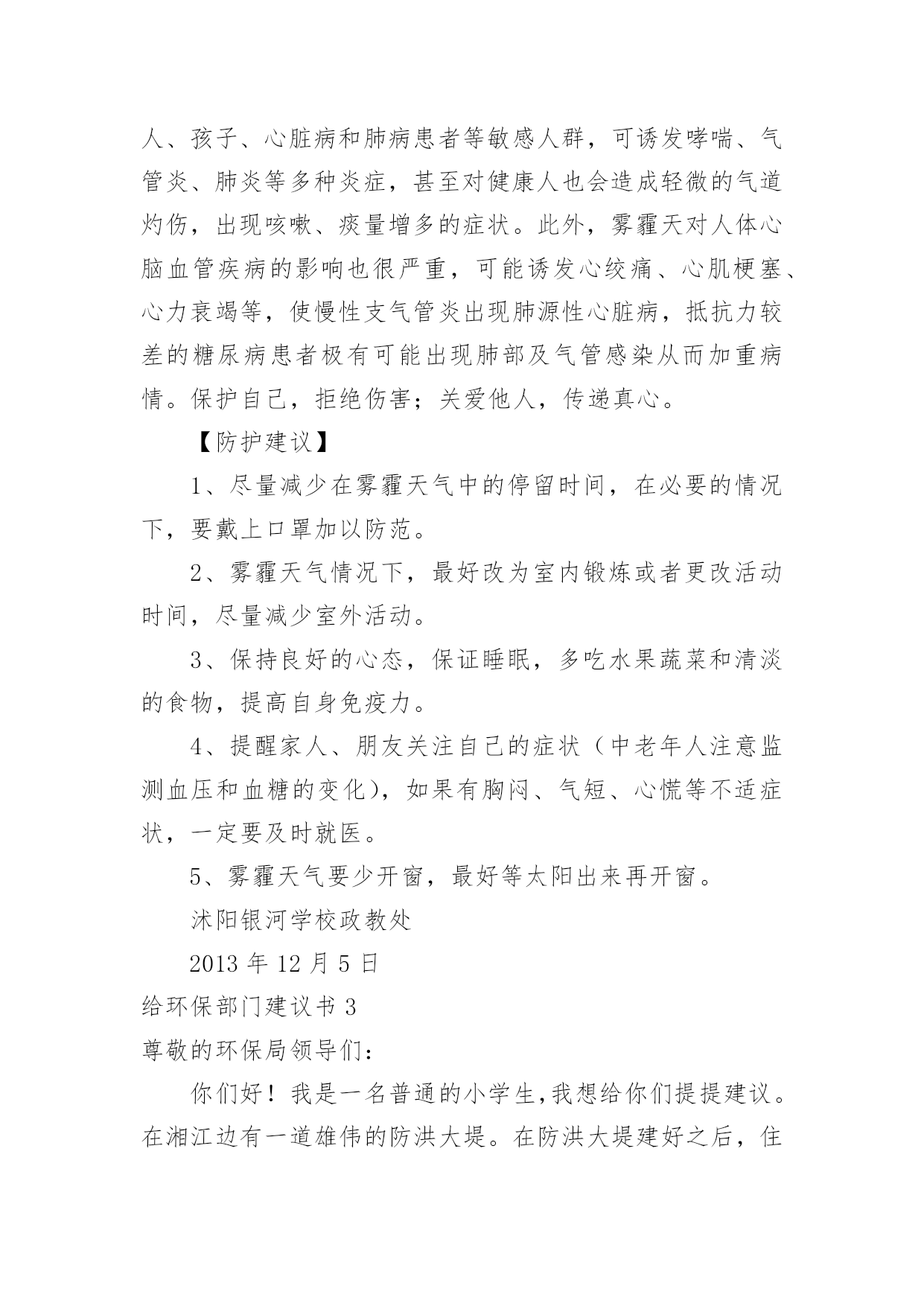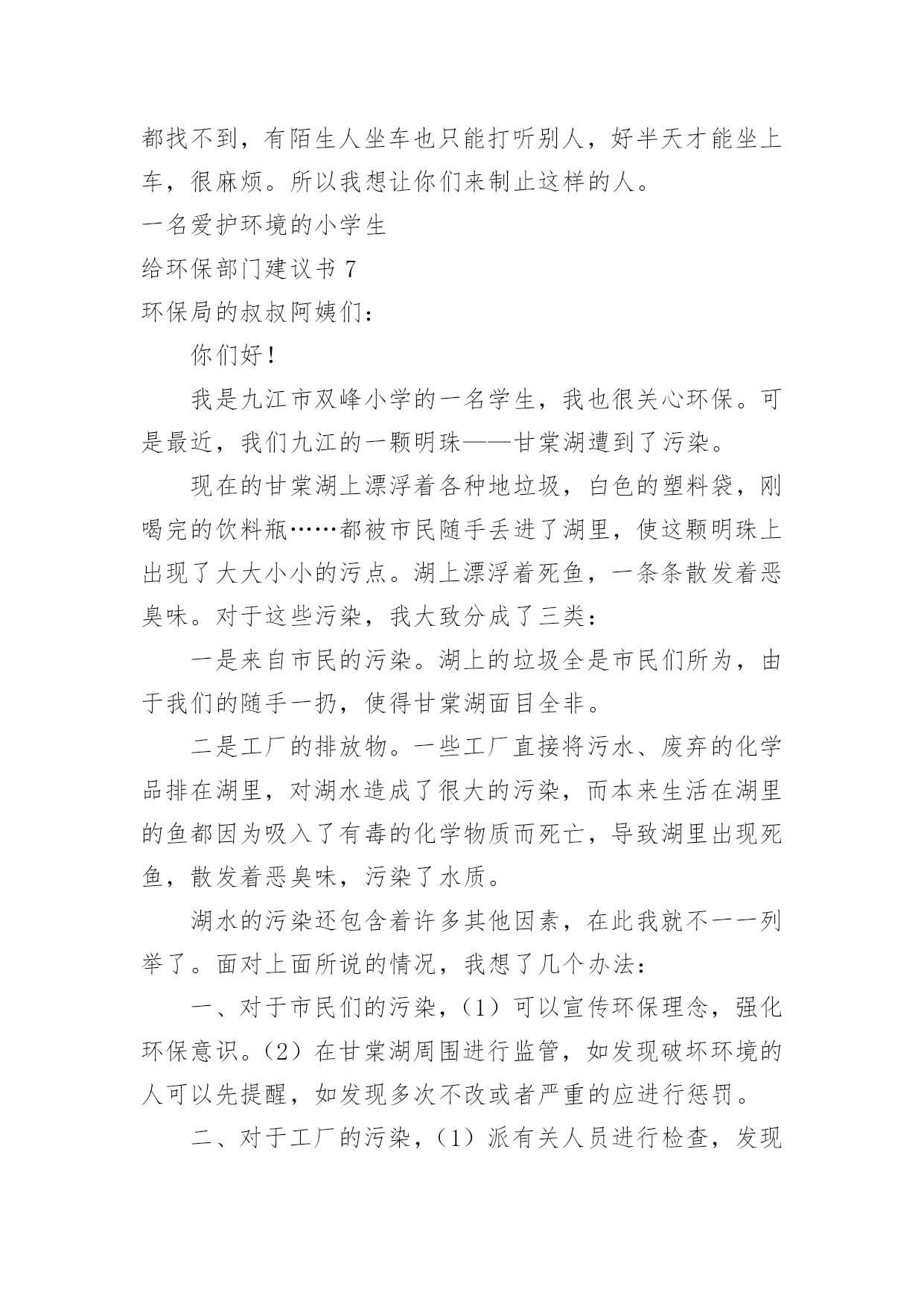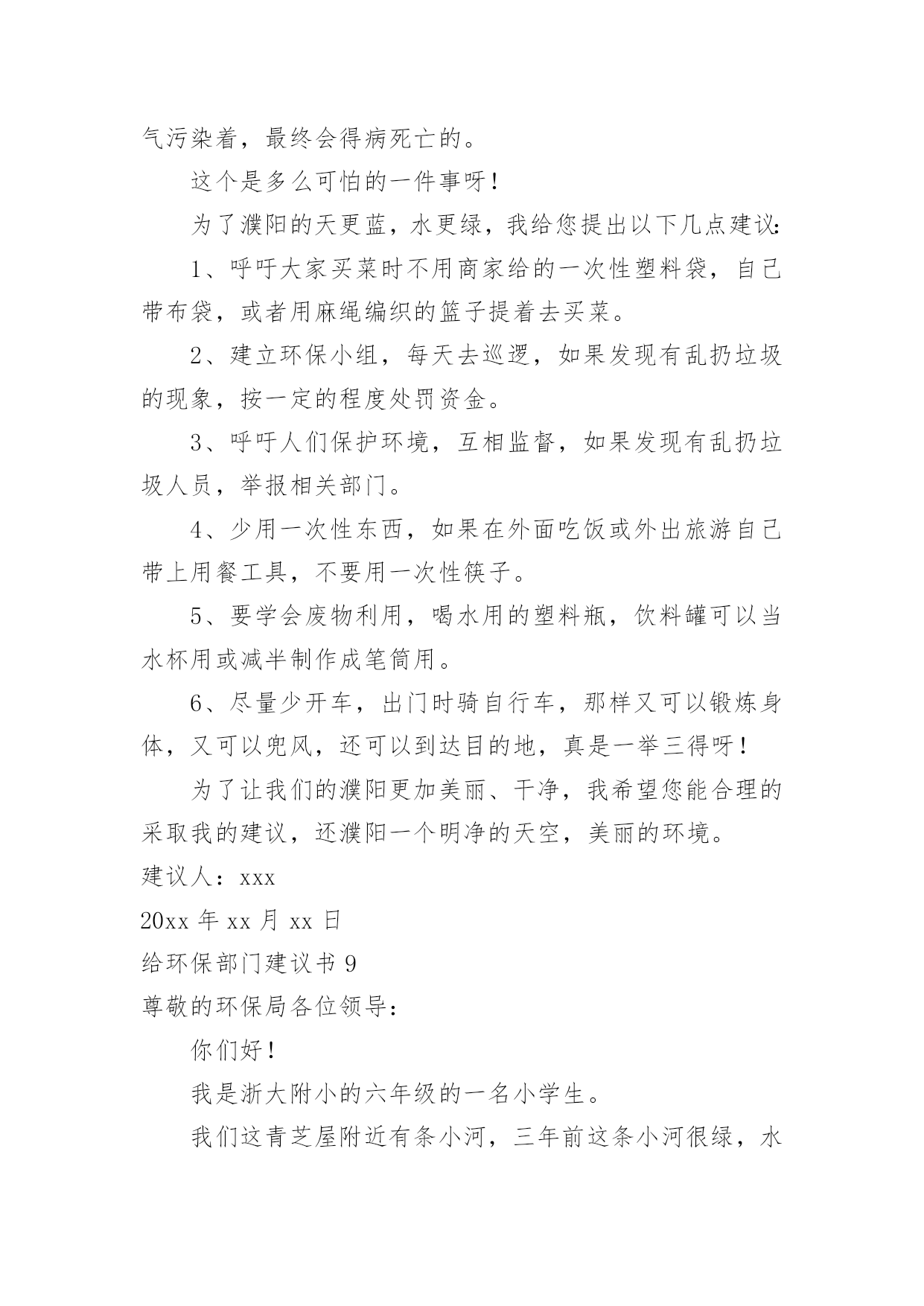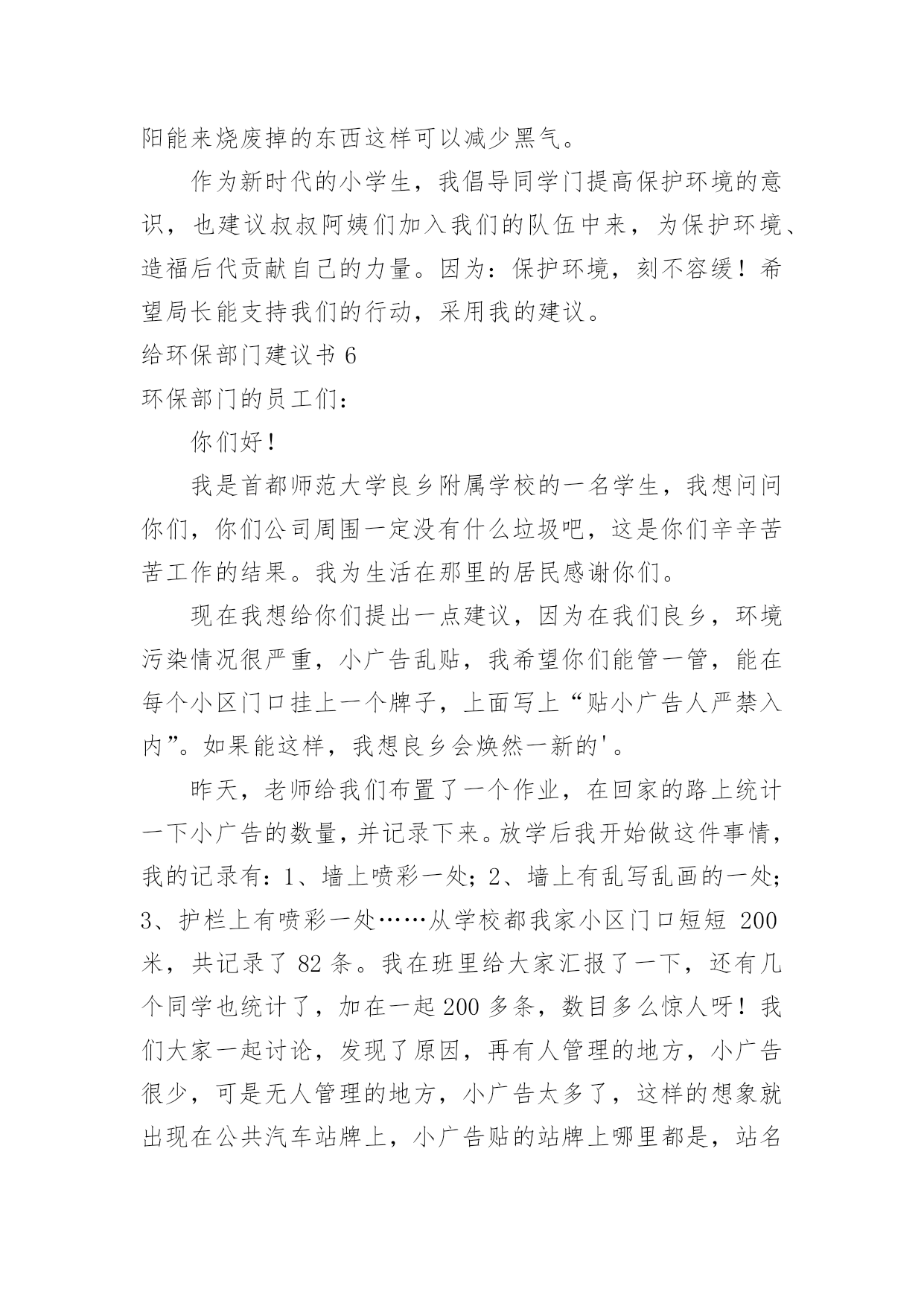 给环保部门建议书给环保部门建议书随着社会一步步向前发展,建议书应用范围愈来愈广泛,在写作上,建议书有一定的书写规范。你写建议书时总是没有新意?以下是小编整理的给环保部门建议书,欢迎大家借鉴与参考,希望对大家有所帮助。给环保部门建议书1环保部门的领导:你们好!看到今天白茫茫,雾蒙蒙的天空,我忍不住提笔给你们写这封信,因为这是雾霾,是粉尘,给人类吸入会危害人类健康。因为这个,我们不能去室外活动,只能躲在教室,可这也避免不了呀,难道让我们整天带上口罩?地球是我们的家,正如《只有一个地球》上所说的,在至少以地球为中心的40万亿千米以内,没有第二个适合人类居住的星球,也就是我们无法搬家。可见,地球对我们来说是多么珍贵。可我依然看见很多很多破坏我们宝贵的家的行为。一个个水龙头在那儿一滴一滴地滴着水,开水龙头的人却不知去向。桌上的饭菜没吃几口,就被随手扔进了泔水桶,却无法从他们的脸上找到丝毫的愧疚。一个个塑料袋被随意取用,却不知道这些材料无法被降解,将永远留在地球上几百万年。这些,都充分说明,太多的人不知道保护环境的重要性,我们需要加强这方面的教育和处罚措施。1、净化空气。教育所有的人,尽可能低碳出行,能坐公共交通的,就尽可能坐公共交通,少开车,将会少很多废气排放。同时还可以号召每天都是植树节,人人重视绿化,有植物的存在,不仅能制造氧气,还能净化空气。这样我们的天空才会早日重现一碧如洗的一天。2、监督所有企业的废水废物排放,对那些随意把废水毒水排入我们的河流的人,要坚决处罚,罚到他们再也不敢这么做。3、从小孩做起,在学校里就开始宣传,节省每一滴水,每一粒饭菜,这样到了他们长大,自然也会教育他们的下一代,代代传承下去。4、逐步杜绝塑料袋的试用,提供试用购物篮、包、纸袋这些包装用品。最后,地球如果毁灭了,谁也活不了,我们一定要记住“亡羊补牢,为时未晚”,从现在开始,保护环境,保护我们的家园。此致敬礼建议人:xxx给环保部门建议书2亲爱的同学们:你知道么,雾霾天气极易诱发呼吸道疾病,尤其是对老人、孩子、心脏病和肺病患者等敏感人群,可诱发哮喘、气管炎、肺炎等多种炎症,甚至对健康人也会造成轻微的气道灼伤,出现咳嗽、痰量增多的症状。此外,雾霾天对人体心脑血管疾病的影响也很严重,可能诱发心绞痛、心肌梗塞、心力衰竭等,使慢性支气管炎出现肺源性心脏病,抵抗力较差的糖尿病患者极有可能出现肺部及气管感染从而加重病情。保护自己,拒绝伤害;关爱他人,传递真心。【防护建议】1、尽量减少在雾霾天气中的停留时间,在必要的情况下,要戴上口罩加以防范。2、雾霾天气情况下,最好改为室内锻炼或者更改活动时间,尽量减少室外活动。3、保持良好的心态,保证睡眠,多吃水果蔬菜和清淡的食物,提高自身免疫力。4、提醒家人、朋友关注自己的症状(中老年人注意监测血压和血糖的变化),如果有胸闷、气短、心慌等不适症状,一定要及时就医。5、雾霾天气要少开窗,最好等太阳出来再开窗。沭阳银河学校政教处2013年12月5日给环保部门建议书3尊敬的环保局领导们:你们好!我是一名普通的小学生,我想给你们提提建议。在湘江边有一道雄伟的防洪大堤。在防洪大堤建好之后,住在附近的居民经常到这儿乘凉、歇息,隔江眺望江心的橘子洲头。特别是春天,这儿的天空上就飘起了许多五颜六色的风筝。可是好景不长,几个月后,一些住在附近的居民为了图方便,就把垃圾随手扔在了防洪大堤前边的空坪上。垃圾积少成多,最后连成一片了。除了生活垃圾,还有许多瓦砾、砖块等建筑垃圾。上那儿乘凉的人也越来越少,因为这些垃圾都会发出一股股难闻的恶臭。有一次,我到沿江大道去放风筝,可是竟然找不到一条干净的路走!最后只好踩着垃圾、瓦砾过去了。最重要的是垃圾会滋生苍蝇、蚊子,而苍蝇、蚊子都是传播疾病的昆虫。还有一些人把垃圾扔在江里,这样还会污染我们的水资源。所以,我想给环保局提几个建议:1。及时清理防洪大堤以及江中的垃圾。2。向市民们宣传环保的重要性,提高市民们对环保的认识。3。定期检查各个街道,如发现有人乱扔垃圾应及时制止和警告。屡劝不听者,要予以罚款。我期盼环保局的领导们能够采纳我这个小小的建议。谢谢给环保部门建议书4尊敬的环保局局长:您好!我是内蒙古兴安盟兴安一小六年六班的学生。感谢您在百忙之中抽空看我的来信。我为自己生长在红城感到骄傲,我爱我的家乡。可是我们的家乡也出现了一些问题,原本的河,溪都清澈见底;如今,只看见一堆黄土泥沙,水变得浑浊不堪;原本的森林绿树成荫,枝繁叶茂;如今,高低不平的树桩,虽然遍地是楼房,可是绿色却越来越少;街道两旁的垃圾随处可见,臭水沟的异味也实在让人受不了。随手乱扔垃圾的现象,几乎已经成为人们的习惯。吃完的零食袋,水果核随手扔到大道上,造成环境污染。臭水沟异味四起,影响环境,破坏了城市应有的干净整洁。砍伐树木,生态资源被破坏。我