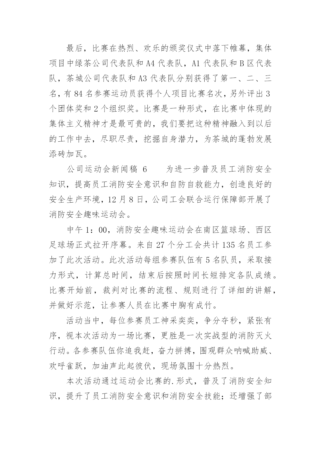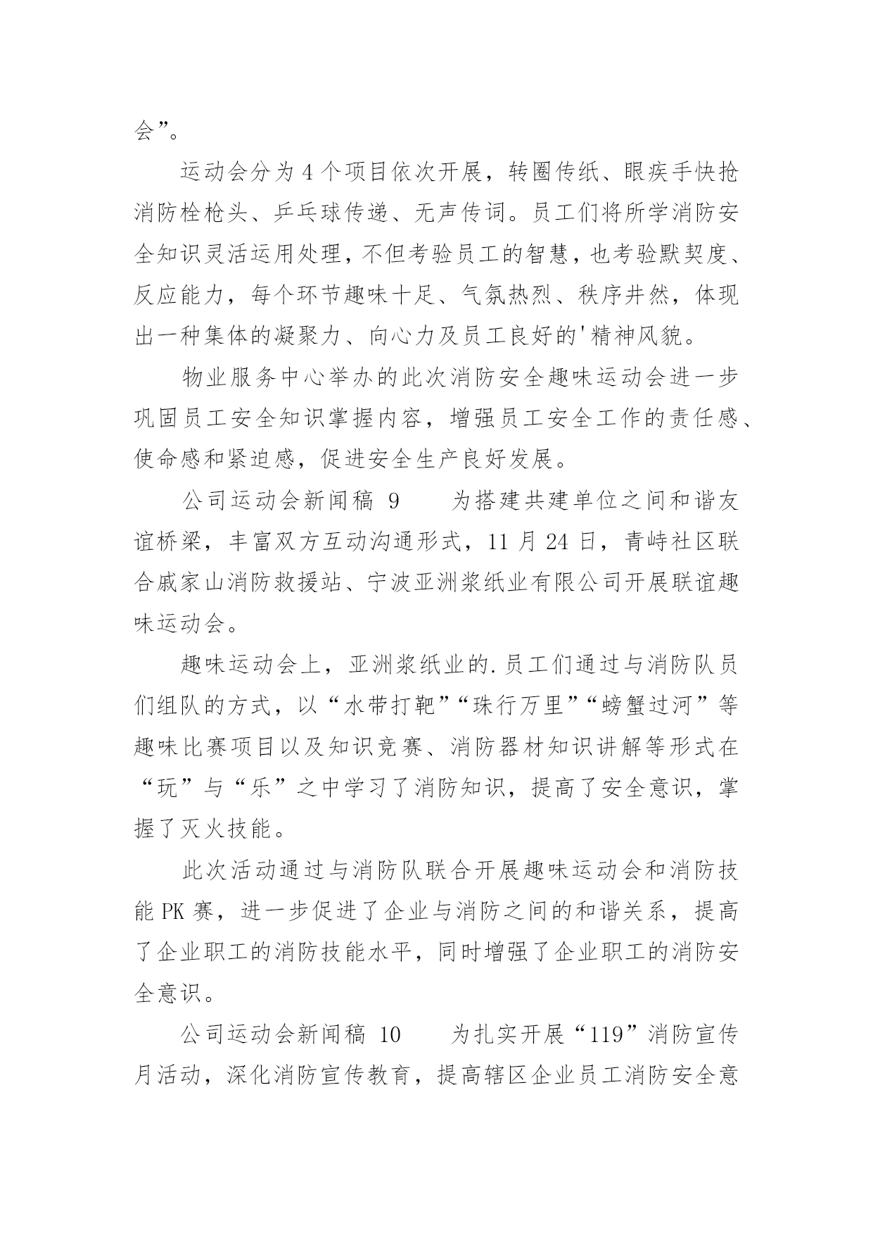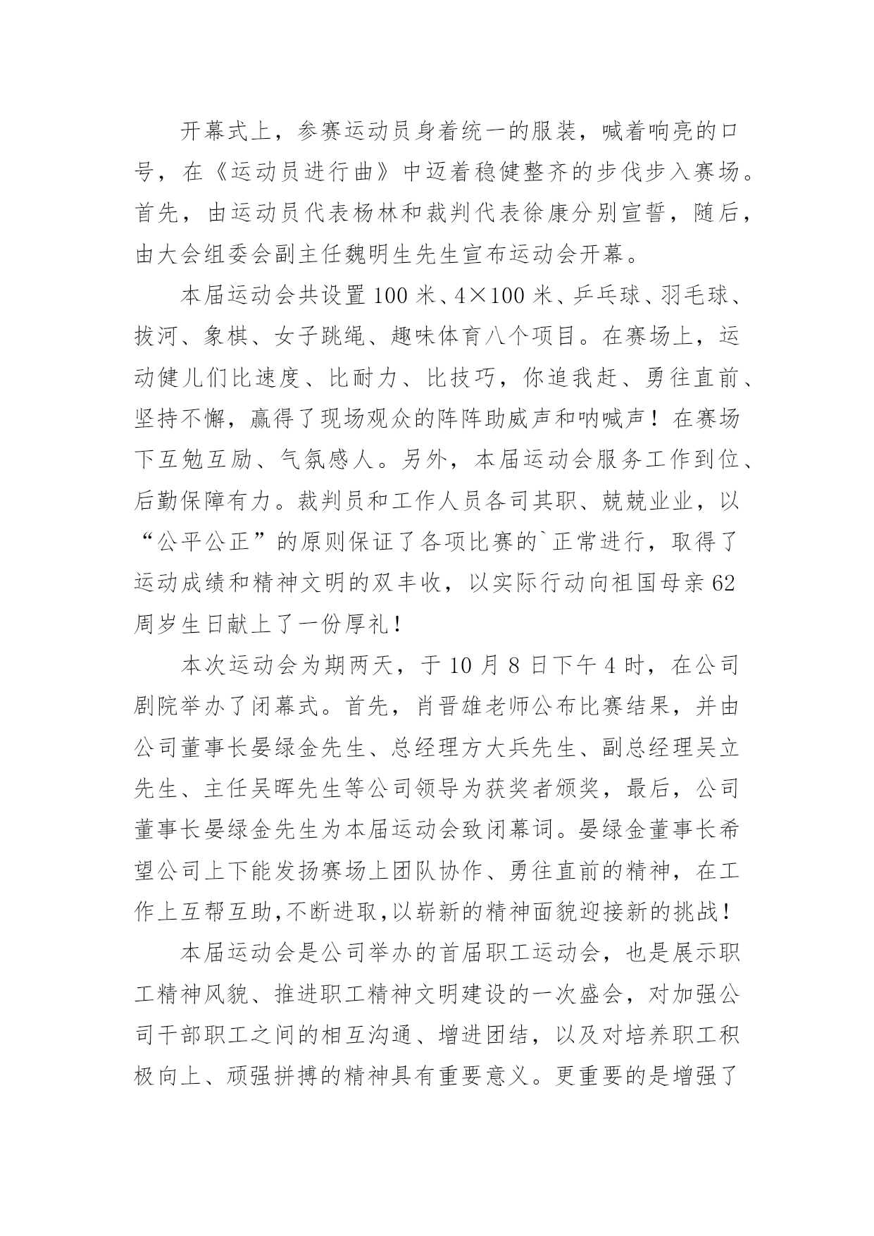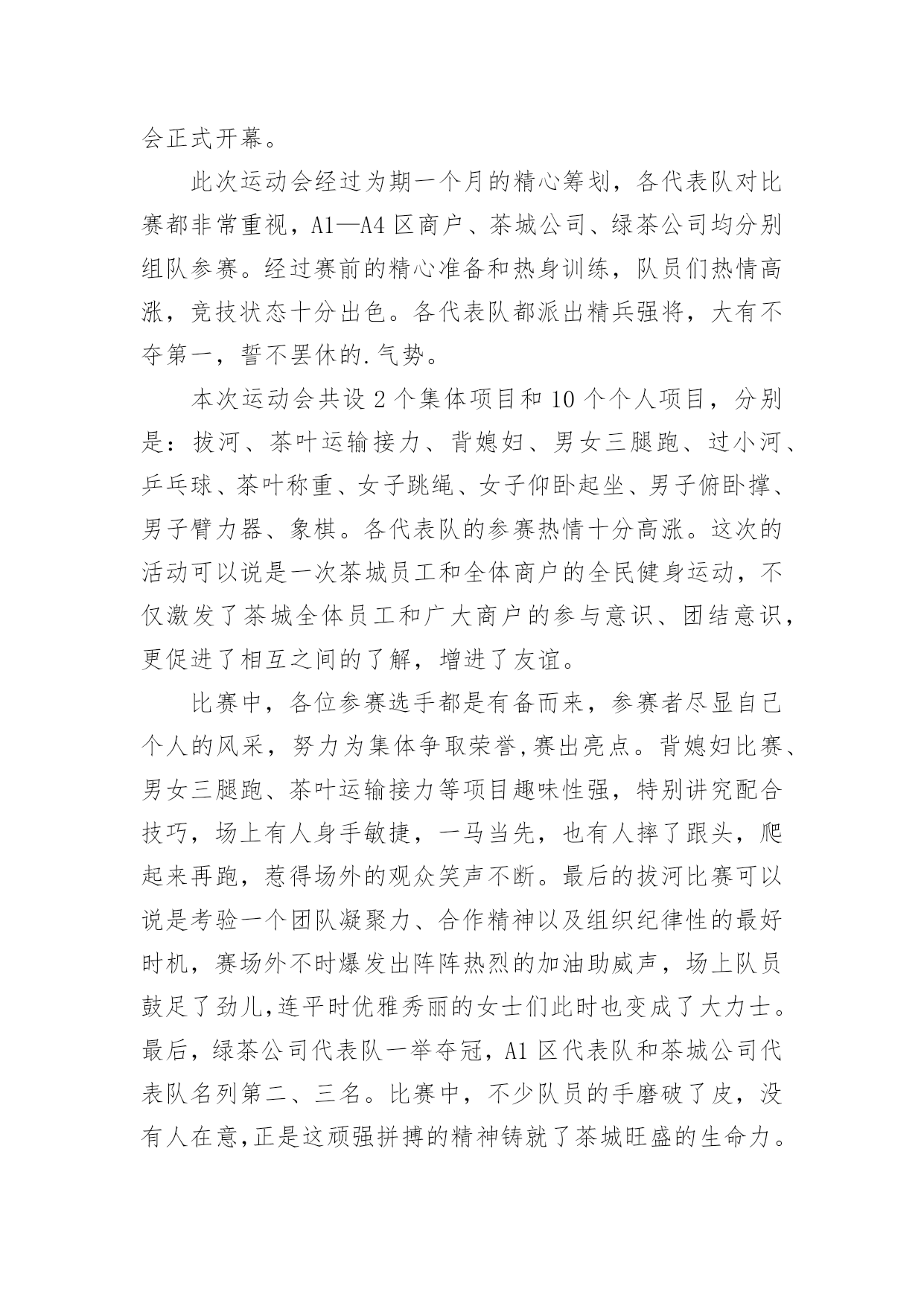 公司运动会新闻稿公司运动会新闻稿(精选10篇)在人们越来越重视发展的今天,新闻稿出现的次数越来越多,新闻作为一种以叙事为主的文体,它的基本要素和我们语文界常用的记叙文的六要素是一致的。那么新闻稿一般是怎么写的呢?下面是小编帮大家整理的公司运动会新闻稿,仅供参考,欢迎大家阅读。公司运动会新闻稿120xx年9月20日,在大连理工大学运动场上召开了冰山集团第十三届职工体育运动会,心中满是兴奋。运动会终于开始了,精彩、简短的开幕式给我留下了深刻的印象。“武冷”方队第二个入场,我们身穿黄色外套,在蓝天白云下显得格外引人注目,昂首挺胸,精神抖擞。我们踏着整齐的步伐,一步一步的走过主席台,用行动证明了这段时间的艰苦训练是值得的。当听到集团总经理致开幕词时说到“感谢远道而来的武冷”,心中是无比的激动与自豪。我永远忘不了赛场上那一个个飒爽的英姿,那一个个矫健的步伐,那一张张不服输的笑脸,那一声声的呐喊,正是我们取得较好成绩的'条件。在4x400男子接力赛、4x100男女混合接力赛中,我们武冷健儿像离弦的箭一般,他们毫不畏惧,接力棒在他们手中传递着集体的力量!艰难的1500米,王东深深调整自己的呼吸,在这条征途上,用勇敢的心去面对,坚持就是胜利!“手足情深”游艺赛,我和我的小伙伴们相互支持,高喊一二,单足跳跃,步调一致的冲向终点,当取得成绩时,我们眼睛里夹杂着欢快的泪水!女子双人夹球赛,杜润娟和程瑶巾帼不让须眉,她们肩并着肩,彼此给对方前进的动力,第一个冲过终点线,全场为他们欢呼,她们是“武冷”的骄傲。跳绳比赛时,八人齐心,默契的在空中跳跃,绳子在蓝天中划出一道道优美的弧线!回想赛场上,有欢笑,有泪水,有遗憾,也有胜利的喜悦,这都汇聚成一首和谐的团结的“武冷”之歌,耐人回味,催人奋进。运动会结束了,回忆这两个多月来的训练,烈日酷暑,每周三天训练,挥汗如雨,手脚酸痛,心里虽有说不出的苦与累,只因代表公司参加集团公司职工体育运动会,深感责任重大,便下定决心用心去训练,坚持到底,不计较加班,更不能说放弃。最终站在运动场上比赛,倍感荣幸,取得了好成绩,证明了这段时间的付出是值得的。在整个运动会上,我们团结在一起凝成一股巨大的力量,无论输赢,这种力量都会永远伴随着我们。公司运动会新闻稿2为加强企业文化建设,增强企业凝聚力,10月7日,湖北黄袍山绿色产品有限公司首届“职工运动会”在公司运动场隆重举行。公司董事长晏绿金先生、总经理方大兵先生、副总经理吴立先生、主任吴晖先生等高层领导出席了运动会,另外特邀薛汉华老师和肖晋雄老师担任本次运动会的顾问及总裁判长,各部门参赛选手、拉拉队员共180余名干部职工参加了本次运动会。开幕式上,参赛运动员身着统一的服装,喊着响亮的口号,在《运动员进行曲》中迈着稳健整齐的步伐步入赛场。首先,由运动员代表杨林和裁判代表徐康分别宣誓,随后,由大会组委会副主任魏明生先生宣布运动会开幕。本届运动会共设置100米、4×100米、乒乓球、羽毛球、拔河、象棋、女子跳绳、趣味体育八个项目。在赛场上,运动健儿们比速度、比耐力、比技巧,你追我赶、勇往直前、坚持不懈,赢得了现场观众的阵阵助威声和呐喊声!在赛场下互勉互励、气氛感人。另外,本届运动会服务工作到位、后勤保障有力。裁判员和工作人员各司其职、兢兢业业,以“公平公正”的原则保证了各项比赛的`正常进行,取得了运动成绩和精神文明的双丰收,以实际行动向祖国母亲62周岁生日献上了一份厚礼!本次运动会为期两天,于10月8日下午4时,在公司剧院举办了闭幕式。首先,肖晋雄老师公布比赛结果,并由公司董事长晏绿金先生、总经理方大兵先生、副总经理吴立先生、主任吴晖先生等公司领导为获奖者颁奖,最后,公司董事长晏绿金先生为本届运动会致闭幕词。晏绿金董事长希望公司上下能发扬赛场上团队协作、勇往直前的精神,在工作上互帮互助,不断进取,以崭新的精神面貌迎接新的挑战!本届运动会是公司举办的首届职工运动会,也是展示职工精神风貌、推进职工精神文明建设的一次盛会,对加强公司干部职工之间的相互沟通、增进团结,以及对培养职工积极向上、顽强拼搏的精神具有重要意义。更重要的是增强了职工身体素质、增进团队凝聚力和战斗力,为公司进一步发展提供了强有力的保障。公司运动会新闻稿3为了加强企业内部凝聚力、增进同事之间的工作友谊、丰富员工的业余生活,公司决定于7月9日下午组织全体员工在篮球场举行三樱运动会。20xx年7月月9日下午14点,由珠海三樱日用品有限公司行政部及工会组织举办的.第二届运动会在公司运动场隆重举行。本次运动会设置了跳绳比赛、拔河比赛和篮球赛3项赛事,各参赛队或队员展开激烈角逐。篮球比赛分为车间组(雄鹰队)和办公室组(猎人队)。拔河比赛由全体员工平均分成四队,通过抽签分成两组进行淘汰赛,淘汰赛每组胜利队进决赛分出最终冠军。跳绳竞赛以