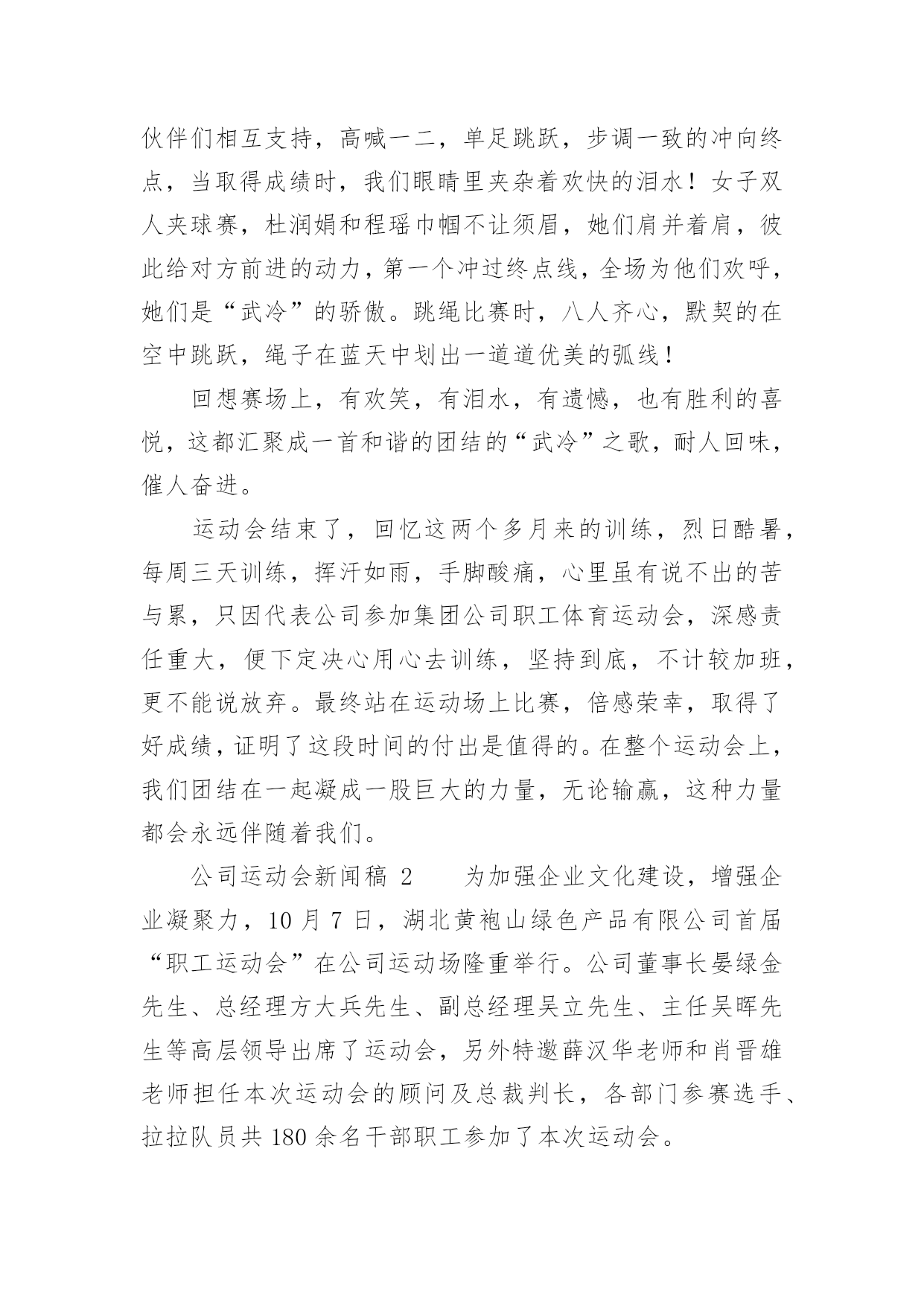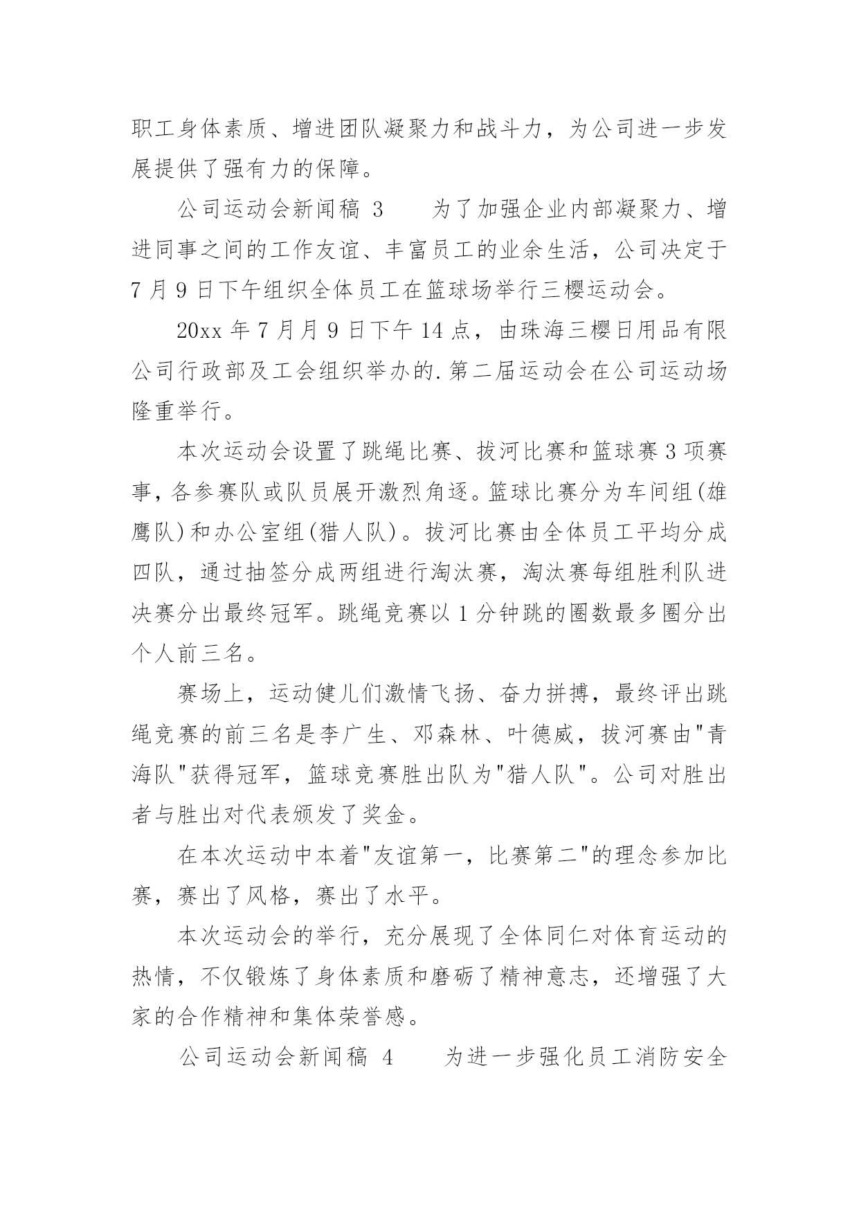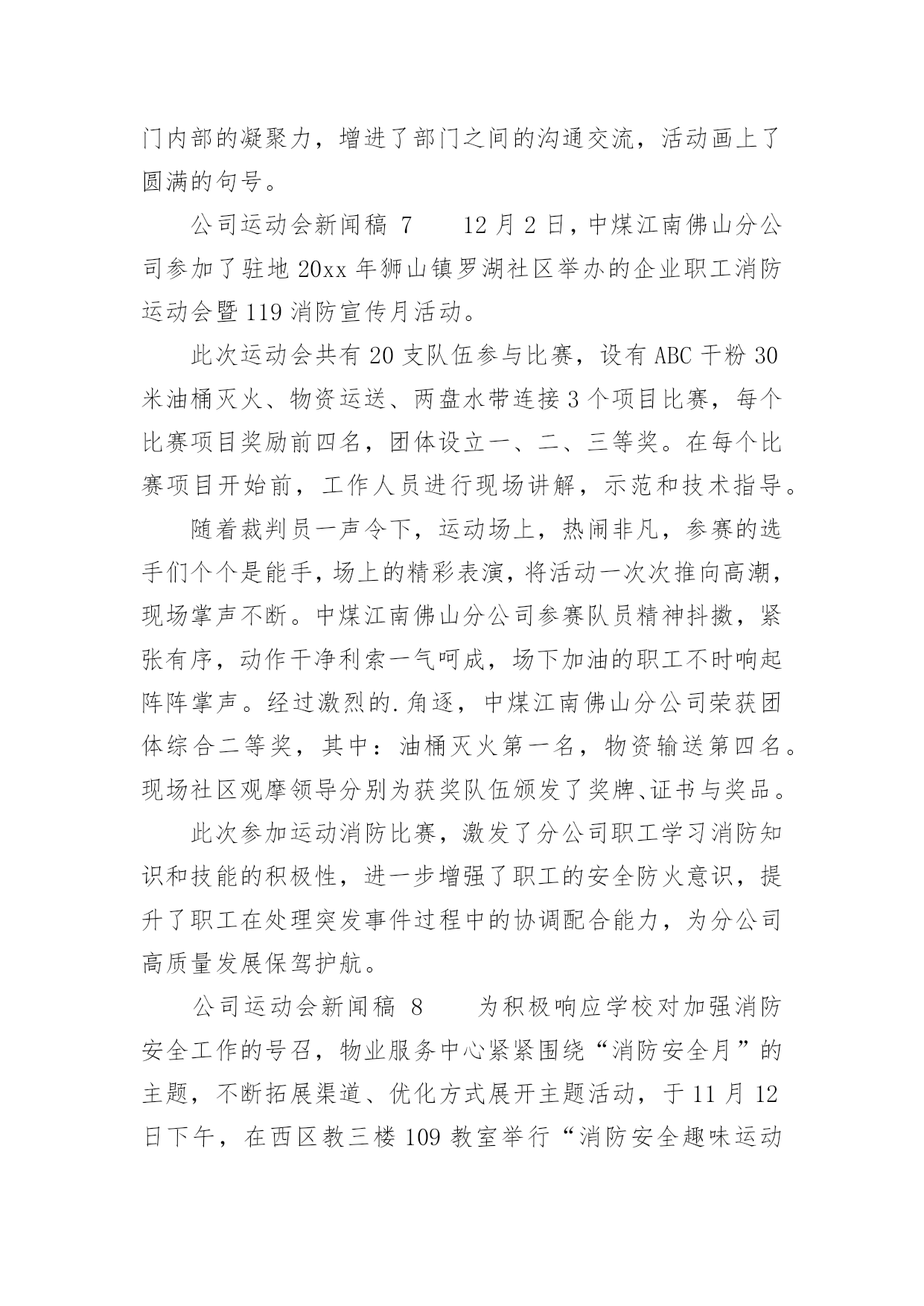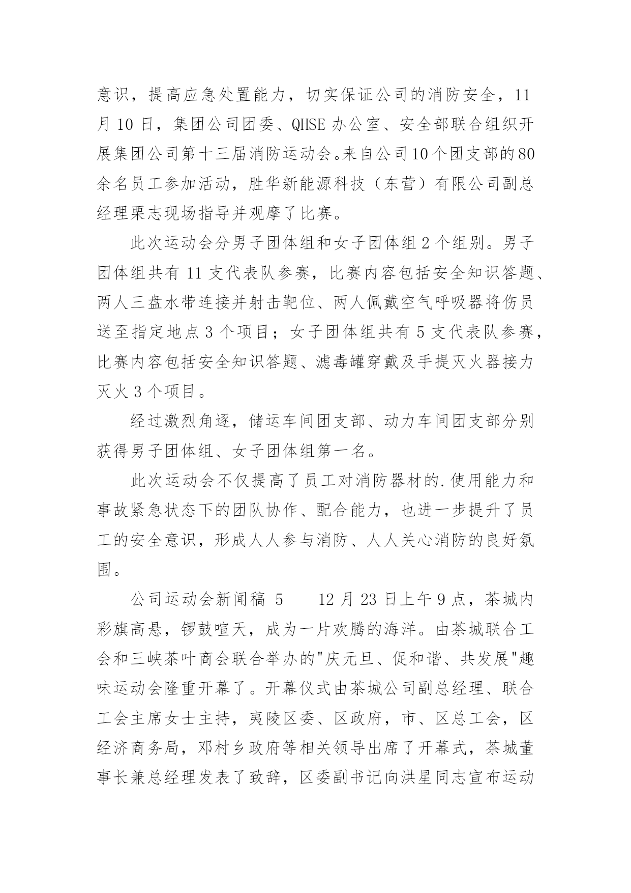 公司运动会新闻稿公司运动会新闻稿(精选10篇)在人们越来越重视发展的今天,新闻稿出现的次数越来越多,新闻作为一种以叙事为主的文体,它的基本要素和我们语文界常用的记叙文的六要素是一致的。那么新闻稿一般是怎么写的呢?下面是小编帮大家整理的公司运动会新闻稿,仅供参考,欢迎大家阅读。公司运动会新闻稿120xx年9月20日,在大连理工大学运动场上召开了冰山集团第十三届职工体育运动会,心中满是兴奋。运动会终于开始了,精彩、简短的开幕式给我留下了深刻的印象。“武冷”方队第二个入场,我们身穿黄色外套,在蓝天白云下显得格外引人注目,昂首挺胸,精神抖擞。我们踏着整齐的步伐,一步一步的走过主席台,用行动证明了这段时间的艰苦训练是值得的。当听到集团总经理致开幕词时说到“感谢远道而来的武冷”,心中是无比的激动与自豪。我永远忘不了赛场上那一个个飒爽的英姿,那一个个矫健的步伐,那一张张不服输的笑脸,那一声声的呐喊,正是我们取得较好成绩的'条件。在4x400男子接力赛、4x100男女混合接力赛中,我们武冷健儿像离弦的箭一般,他们毫不畏惧,接力棒在他们手中传递着集体的力量!艰难的1500米,王东深深调整自己的呼吸,在这条征途上,用勇敢的心去面对,坚持就是胜利!“手足情深”游艺赛,我和我的小伙伴们相互支持,高喊一二,单足跳跃,步调一致的冲向终点,当取得成绩时,我们眼睛里夹杂着欢快的泪水!女子双人夹球赛,杜润娟和程瑶巾帼不让须眉,她们肩并着肩,彼此给对方前进的动力,第一个冲过终点线,全场为他们欢呼,她们是“武冷”的骄傲。跳绳比赛时,八人齐心,默契的在空中跳跃,绳子在蓝天中划出一道道优美的弧线!回想赛场上,有欢笑,有泪水,有遗憾,也有胜利的喜悦,这都汇聚成一首和谐的团结的“武冷”之歌,耐人回味,催人奋进。运动会结束了,回忆这两个多月来的训练,烈日酷暑,每周三天训练,挥汗如雨,手脚酸痛,心里虽有说不出的苦与累,只因代表公司参加集团公司职工体育运动会,深感责任重大,便下定决心用心去训练,坚持到底,不计较加班,更不能说放弃。最终站在运动场上比赛,倍感荣幸,取得了好成绩,证明了这段时间的付出是值得的。在整个运动会上,我们团结在一起凝成一股巨大的力量,无论输赢,这种力量都会永远伴随着我们。公司运动会新闻稿2为加强企业文化建设,增强企业凝聚力,10月7日,湖北黄袍山绿色产品有限公司首届“职工运动会”在公司运动场隆重举行。公司董事长晏绿金先生、总经理方大兵先生、副总经理吴立先生、主任吴晖先生等高层领导出席了运动会,另外特邀薛汉华老师和肖晋雄老师担任本次运动会的顾问及总裁判长,各部门参赛选手、拉拉队员共180余名干部职工参加了本次运动会。开幕式上,参赛运动员身着统一的服装,喊着响亮的口号,在《运动员进行曲》中迈着稳健整齐的步伐步入赛场。首先,由运动员代表杨林和裁判代表徐康分别宣誓,随后,由大会组委会副主任魏明生先生宣布运动会开幕。本届运动会共设置100米、4×100米、乒乓球、羽毛球、拔河、象棋、女子跳绳、趣味体育八个项目。在赛场上,运动健儿们比速度、比耐力、比技巧,你追我赶、勇往直前、坚持不懈,赢得了现场观众的阵阵助威声和呐喊声!在赛场下互勉互励、气氛感人。另外,本届运动会服务工作到位、后勤保障有力。裁判员和工作人员各司其职、兢兢业业,以“公平公正”的原则保证了各项比赛的`正常进行,取得了运动成绩和精神文明的双丰收,以实际行动向祖国母亲62周岁生日献上了一份厚礼!本次运动会为期两天,于10月8日下午4时,在公司剧院举办了闭幕式。首先,肖晋雄老师公布比赛结果,并由公司董事长晏绿金先生、总经理方大兵先生、副总经理吴立先生、主任吴晖先生等公司领导为获奖者颁奖,最后,公司董事长晏绿金先生为本届运动会致闭幕词。晏绿金董事长希望公司上下能发扬赛场上团队协作、勇往直前的精神,在工作上互帮互助,不断进取,以崭新的精神面貌迎接新的挑战!本届运动会是公司举办的首届职工运动会,也是展示职工精神风貌、推进职工精神文明建设的一次盛会,对加强公司干部职工之间的相互沟通、增进团结,以及对培养职工积极向上、顽强拼搏的精神具有重要意义。更重要的是增强了职工身体素质、增进团队凝聚力和战斗力,为公司进一步发展提供了强有力的保障。公司运动会新闻稿3为了加强企业内部凝聚力、增进同事之间的工作友谊、丰富员工的业余生活,公司决定于7月9日下午组织全体员工在篮球场举行三樱运动会。20xx年7月月9日下午14点,由珠海三樱日用品有限公司行政部及工会组织举办的.第二届运动会在公司运动场隆重举行。本次运动会设置了跳绳比赛、拔河比赛和篮球赛3项赛事,各参赛队或队员展开激烈角逐。篮球比赛分为车间组(雄鹰队)和办公室组(猎人队)。拔河比赛由全体员工平均分成四队,通过抽签分成两组进行淘汰赛,淘汰赛每组胜利队进决赛分出最终冠军。跳绳竞赛以
