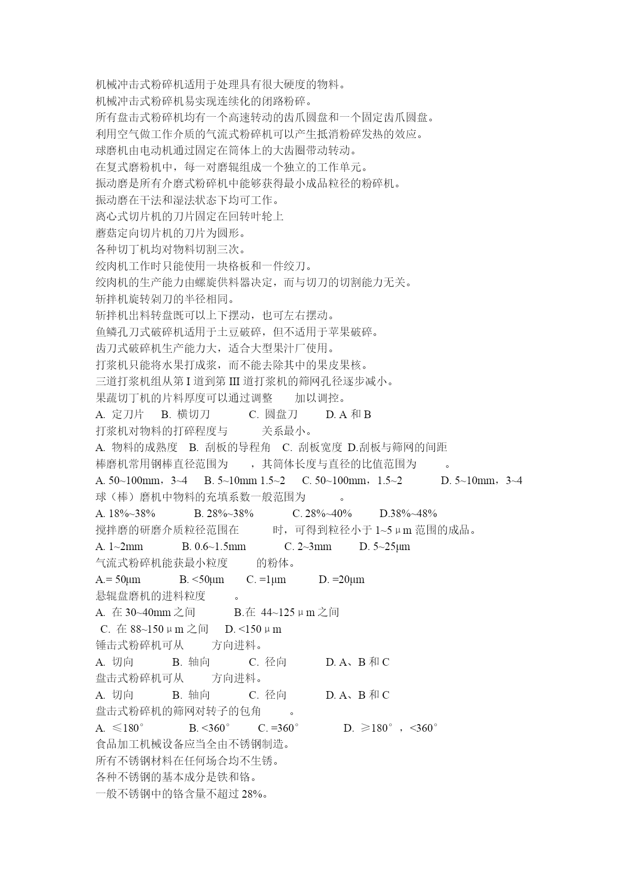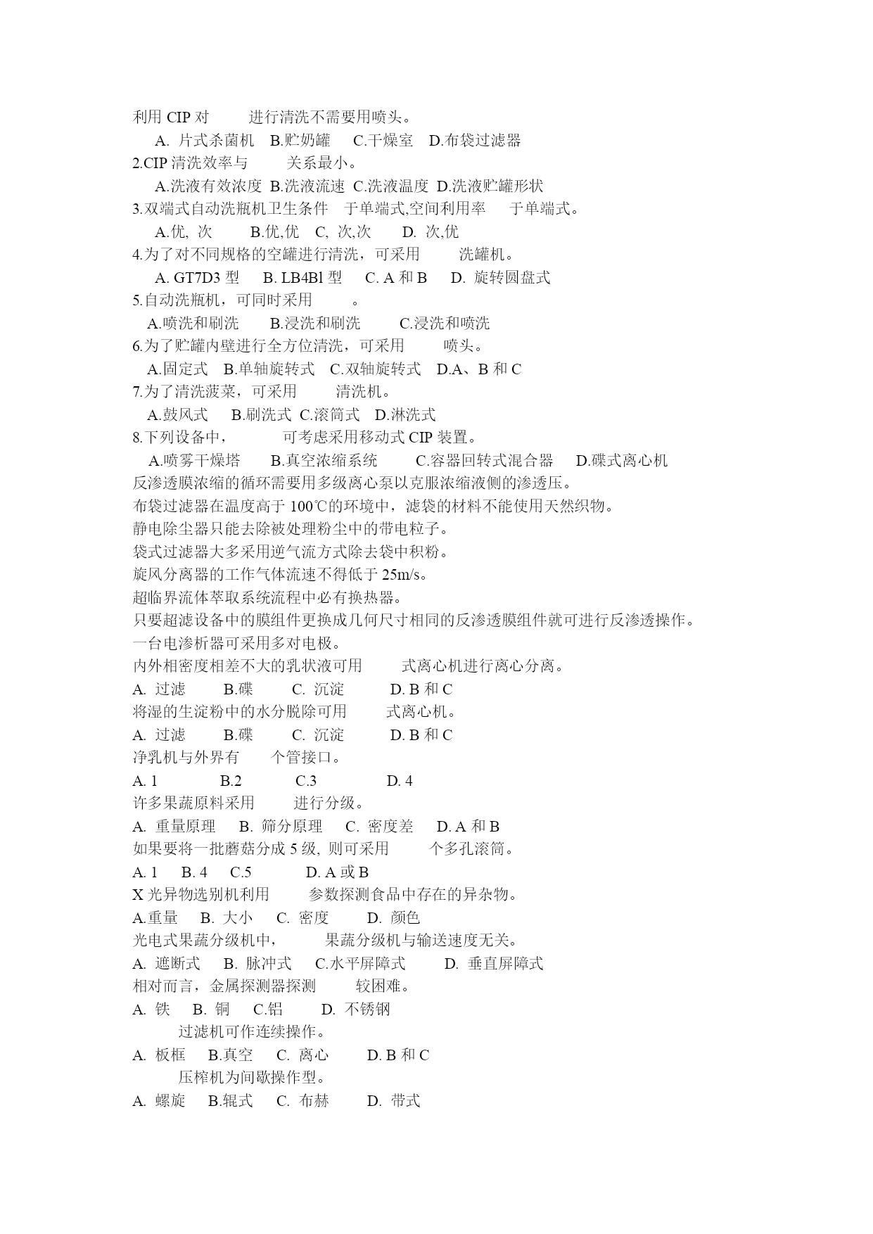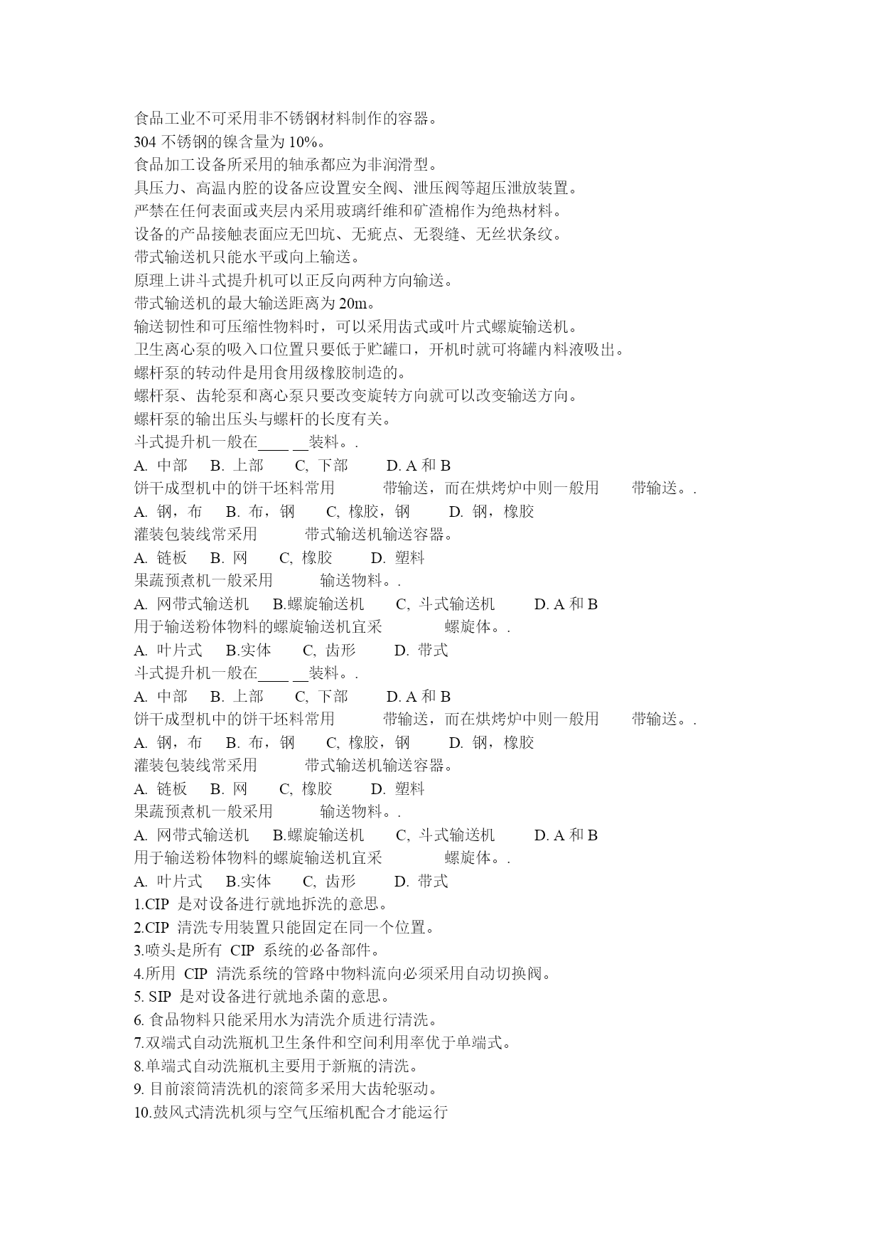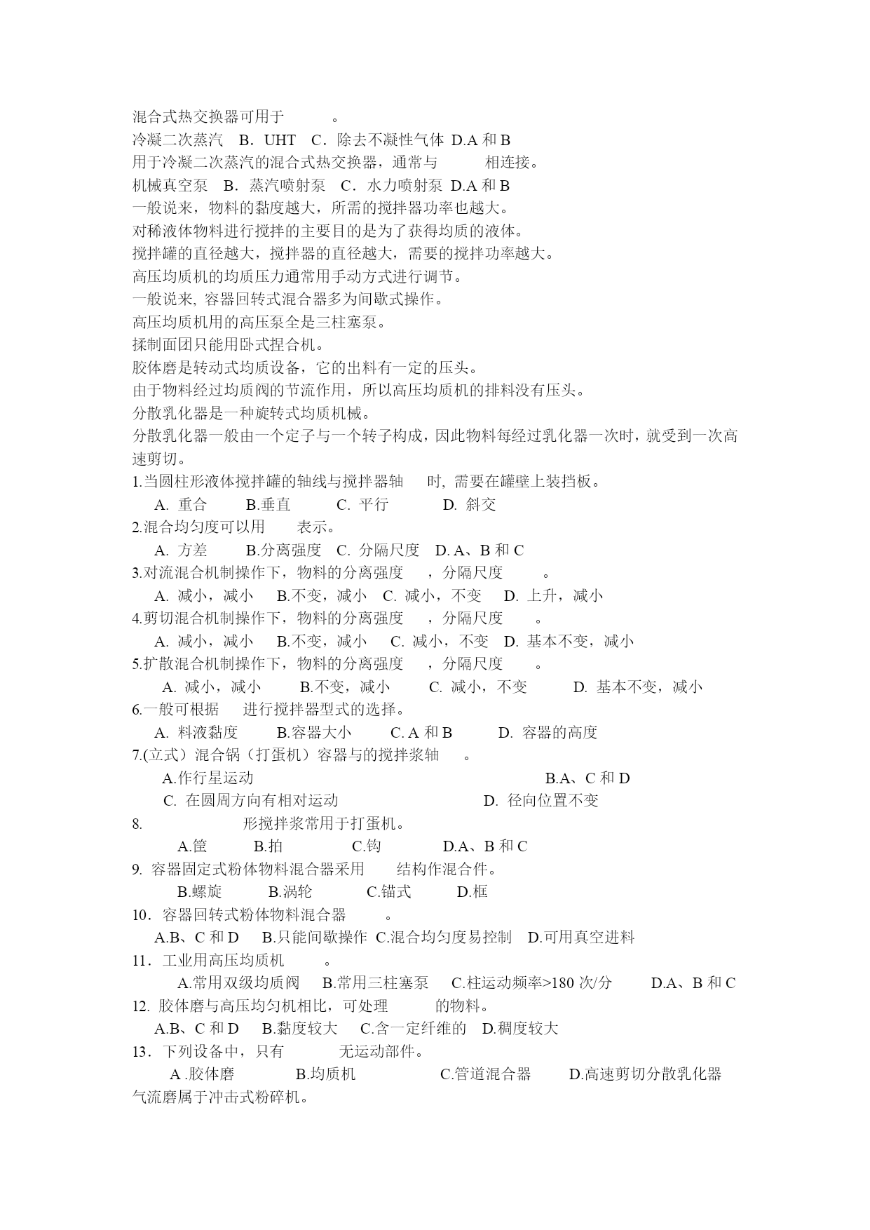 4升膜式蒸发器不适用于易起泡物料的浓缩,但可得到高浓度的浓缩液。5升膜式蒸发器物料与加热器蒸汽呈逆流走向。6降膜式蒸发器物料与加热器蒸汽呈并流走向。7刮板薄膜式蒸发器适用于高黏度料液的浓缩。10使用水力喷射泵的真空蒸发系统一般不再专门设二次蒸汽冷凝器。12真空蒸发系统的不凝性气体主要来自于料液。15水力喷射泵既起冷凝也起抽真空作用。17用于蒸汽喷射泵的蒸汽压力较高,且要求压力稳定。1下列哪种机件不可能在真空蒸发系统中出现。()A.冷凝器B.蒸汽喷射泵C.换热器D.热风分配器下列几种真空装置中,()产生的真空度最易受季节影响。A.蒸汽喷射泵B.水力喷射泵C.干式真空泵D.水环真空泵升膜式蒸发器一般采用()流方式加热。A.顺B.逆C.混D.错需要预热到接触沸点进料的蒸发器有。A.降膜式B.升膜式C.强制循环式D.A和B真空蒸发系统中的不凝性气体来自于()。A.料液B.加热蒸汽C.冷却水D.A和C料液在蒸发器中滞留时间最短的蒸发器是。A.离心薄膜式B.升膜式C.降膜式D.外加热强制循环式料液在蒸发器中滞留时间最长的蒸发器是。A.中央循环管式B.升膜式C.降膜式D.板式冷冻真空干燥系统的冷阱装在干燥室外的最大好处是可以连续除霜。真空干燥箱适用于固体或热敏性液体食品物料的干燥。流化床干燥器与喷雾干燥器相比,不需要粉尘回收装置。离心喷雾式干燥室的直径/高度比值较大,所以不易在壁上产生焦粉结垢。所有喷雾干燥机中,只有气流干燥雾化器才需要压缩空气。布袋过滤器可以装在干燥塔(箱)内。以热空气为干燥介质的喷雾干燥机,一般需空气过滤器净化空气。压力喷雾用的雾化压力范围在0.2~2MPa。逆流和顺流式列管式换热器的管程为单程。蒸汽注入式加热器是将蒸汽注入产品的直接式加热器。一般板式热交换器的传热板四角有4个圆孔。旋转刮板式热交换器的刮板均以活动铰链方式与转筒连接。旋转刮板式热交换器只能直立安装。为了排料方便,所有的夹层锅底均设有一个排料口。列管式热交换器可用作。杀菌器B.冷凝器C.蒸发加热器D.A、B和C板式热交换器可用作。杀菌器B.冷凝器C.蒸发加热器D.A和C在所有热交换器中,热交换器的密封圈最少。板式B.套管式C.列管式D.A和B下列热交换器中,最适用于黏稠物料。板式B.螺旋板式C.列管式D.旋转刮板式混合式热交换器可用于。冷凝二次蒸汽B.UHTC.除去不凝性气体D.A和B用于冷凝二次蒸汽的混合式热交换器,通常与相连接。机械真空泵B.蒸汽喷射泵C.水力喷射泵D.A和B一般说来,物料的黏度越大,所需的搅拌器功率也越大。对稀液体物料进行搅拌的主要目的是为了获得均质的液体。搅拌罐的直径越大,搅拌器的直径越大,需要的搅拌功率越大。高压均质机的均质压力通常用手动方式进行调节。一般说来,容器回转式混合器多为间歇式操作。高压均质机用的高压泵全是三柱塞泵。揉制面团只能用卧式捏合机。胶体磨是转动式均质设备,它的出料有一定的压头。由于物料经过均质阀的节流作用,所以高压均质机的排料没有压头。分散乳化器是一种旋转式均质机械。分散乳化器一般由一个定子与一个转子构成,因此物料每经过乳化器一次时,就受到一次高速剪切。1.当圆柱形液体搅拌罐的轴线与搅拌器轴时,需要在罐壁上装挡板。A.重合B.垂直C.平行D.斜交2.混合均匀度可以用表示。A.方差B.分离强度C.分隔尺度D.A、B和C3.对流混合机制操作下,物料的分离强度,分隔尺度。A.减小,减小B.不变,减小C.减小,不变D.上升,减小4.剪切混合机制操作下,物料的分离强度,分隔尺度。A.减小,减小B.不变,减小C.减小,不变D.基本不变,减小5.扩散混合机制操作下,物料的分离强度,分隔尺度。A.减小,减小B.不变,减小C.减小,不变D.基本不变,减小6.一般可根据进行搅拌器型式的选择。A.料液黏度B.容器大小C.A和BD.容器的高度7.(立式)混合锅(打蛋机)容器与的搅拌浆轴。A.作行星运动B.A、C和DC.在圆周方向有相对运动D.径向位置不变8.形搅拌浆常用于打蛋机。A.筐B.拍C.钩D.A、B和C9.容器固定式粉体物料混合器采用结构作混合件。B.螺旋B.涡轮C.锚式D.框10.容器回转式粉体物料混合器。A.B、C和DB.只能间歇操作C.混合均匀度易控制D.可用真空进料11.工业用高压均质机。A.常用双级均质阀B.常用三柱塞泵C.柱运动频率>180次/分D.A、B和C12.胶体磨与高压均匀机相比,可处理的物料。A.B、C和DB.黏度较大C.含一定纤维的D.稠度较大13.下列设备中,只有无运动部件。A.胶体磨B.均质机C.管道混合器D.高速剪切分散乳化器