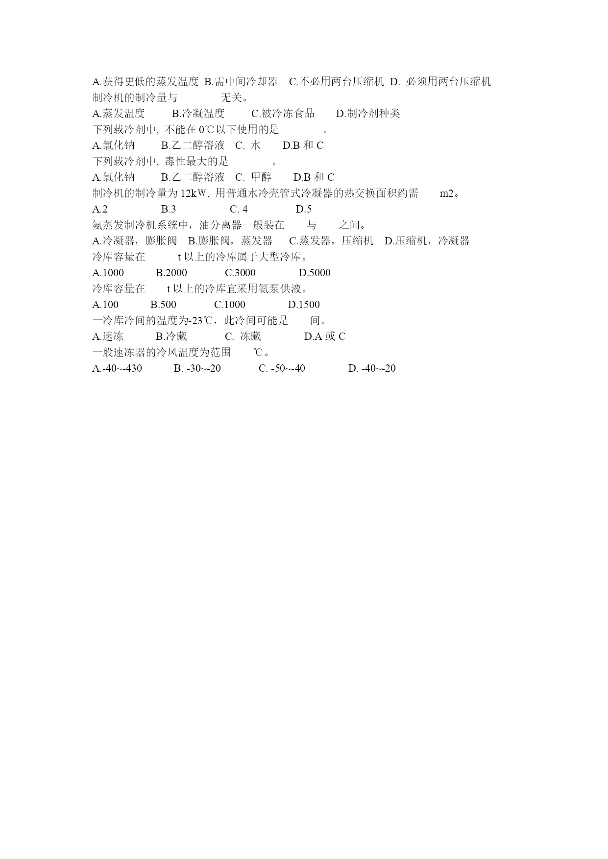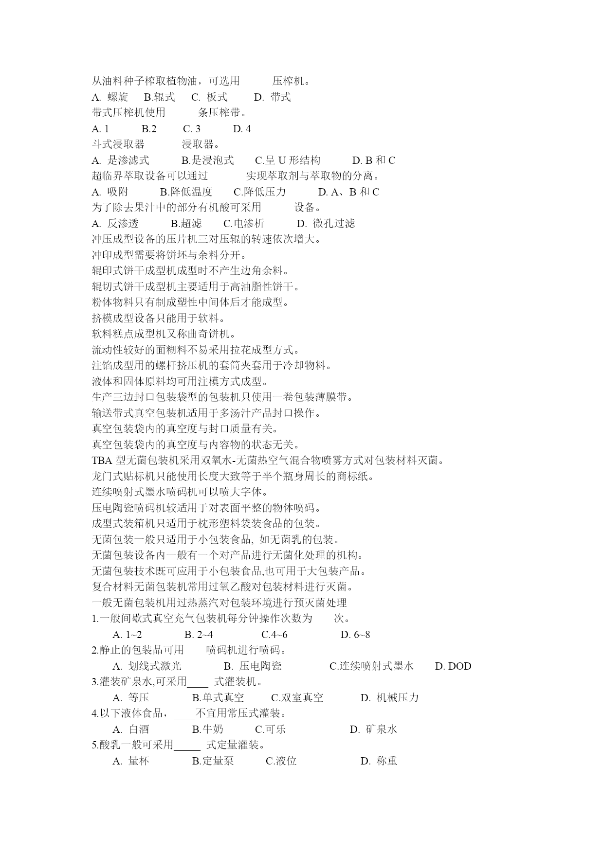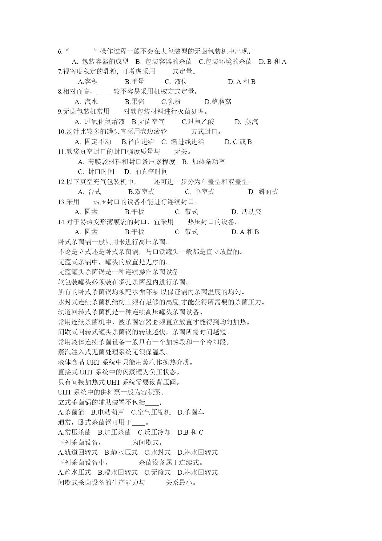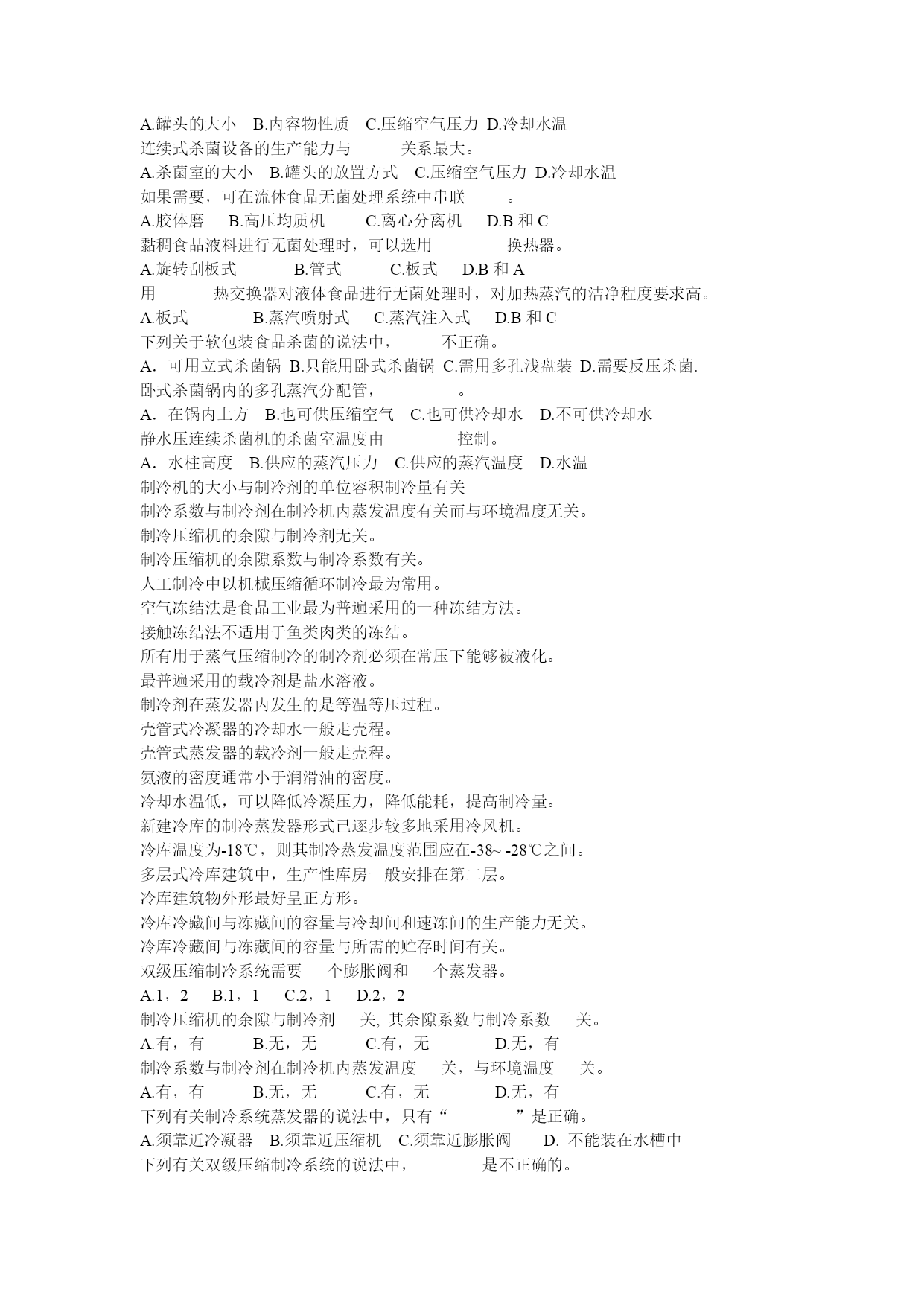 4升膜式蒸发器不适用于易起泡物料的浓缩,但可得到高浓度的浓缩液。5升膜式蒸发器物料与加热器蒸汽呈逆流走向。6降膜式蒸发器物料与加热器蒸汽呈并流走向。7刮板薄膜式蒸发器适用于高黏度料液的浓缩。10使用水力喷射泵的真空蒸发系统一般不再专门设二次蒸汽冷凝器。12真空蒸发系统的不凝性气体主要来自于料液。15水力喷射泵既起冷凝也起抽真空作用。17用于蒸汽喷射泵的蒸汽压力较高,且要求压力稳定。1下列哪种机件不可能在真空蒸发系统中出现。()A.冷凝器B.蒸汽喷射泵C.换热器D.热风分配器下列几种真空装置中,()产生的真空度最易受季节影响。A.蒸汽喷射泵B.水力喷射泵C.干式真空泵D.水环真空泵升膜式蒸发器一般采用()流方式加热。A.顺B.逆C.混D.错需要预热到接触沸点进料的蒸发器有。A.降膜式B.升膜式C.强制循环式D.A和B真空蒸发系统中的不凝性气体来自于()。A.料液B.加热蒸汽C.冷却水D.A和C料液在蒸发器中滞留时间最短的蒸发器是。A.离心薄膜式B.升膜式C.降膜式D.外加热强制循环式料液在蒸发器中滞留时间最长的蒸发器是。A.中央循环管式B.升膜式C.降膜式D.板式冷冻真空干燥系统的冷阱装在干燥室外的最大好处是可以连续除霜。真空干燥箱适用于固体或热敏性液体食品物料的干燥。流化床干燥器与喷雾干燥器相比,不需要粉尘回收装置。离心喷雾式干燥室的直径/高度比值较大,所以不易在壁上产生焦粉结垢。所有喷雾干燥机中,只有气流干燥雾化器才需要压缩空气。布袋过滤器可以装在干燥塔(箱)内。以热空气为干燥介质的喷雾干燥机,一般需空气过滤器净化空气。压力喷雾用的雾化压力范围在0.2~2MPa。逆流和顺流式列管式换热器的管程为单程。蒸汽注入式加热器是将蒸汽注入产品的直接式加热器。一般板式热交换器的传热板四角有4个圆孔。旋转刮板式热交换器的刮板均以活动铰链方式与转筒连接。旋转刮板式热交换器只能直立安装。为了排料方便,所有的夹层锅底均设有一个排料口。列管式热交换器可用作。杀菌器B.冷凝器C.蒸发加热器D.A、B和C板式热交换器可用作。杀菌器B.冷凝器C.蒸发加热器D.A和C在所有热交换器中,热交换器的密封圈最少。板式B.套管式C.列管式D.A和B下列热交换器中,最适用于黏稠物料。板式B.螺旋板式C.列管式D.旋转刮板式混合式热交换器可用于。冷凝二次蒸汽B.UHTC.除去不凝性气体D.A和B用于冷凝二次蒸汽的混合式热交换器,通常与相连接。机械真空泵B.蒸汽喷射泵C.水力喷射泵D.A和B一般说来,物料的黏度越大,所需的搅拌器功率也越大。对稀液体物料进行搅拌的主要目的是为了获得均质的液体。搅拌罐的直径越大,搅拌器的直径越大,需要的搅拌功率越大。高压均质机的均质压力通常用手动方式进行调节。一般说来,容器回转式混合器多为间歇式操作。高压均质机用的高压泵全是三柱塞泵。揉制面团只能用卧式捏合机。胶体磨是转动式均质设备,它的出料有一定的压头。由于物料经过均质阀的节流作用,所以高压均质机的排料没有压头。分散乳化器是一种旋转式均质机械。分散乳化器一般由一个定子与一个转子构成,因此物料每经过乳化器一次时,就受到一次高速剪切。1.当圆柱形液体搅拌罐的轴线与搅拌器轴时,需要在罐壁上装挡板。A.重合B.垂直C.平行D.斜交2.混合均匀度可以用表示。A.方差B.分离强度C.分隔尺度D.A、B和C3.对流混合机制操作下,物料的分离强度,分隔尺度。A.减小,减小B.不变,减小C.减小,不变D.上升,减小4.剪切混合机制操作下,物料的分离强度,分隔尺度。A.减小,减小B.不变,减小C.减小,不变D.基本不变,减小5.扩散混合机制操作下,物料的分离强度,分隔尺度。A.减小,减小B.不变,减小C.减小,不变D.基本不变,减小6.一般可根据进行搅拌器型式的选择。A.料液黏度B.容器大小C.A和BD.容器的高度7.(立式)混合锅(打蛋机)容器与的搅拌浆轴。A.作行星运动B.A、C和DC.在圆周方向有相对运动D.径向位置不变8.形搅拌浆常用于打蛋机。A.筐B.拍C.钩D.A、B和C9.容器固定式粉体物料混合器采用结构作混合件。B.螺旋B.涡轮C.锚式D.框10.容器回转式粉体物料混合器。A.B、C和DB.只能间歇操作C.混合均匀度易控制D.可用真空进料11.工业用高压均质机。A.常用双级均质阀B.常用三柱塞泵C.柱运动频率>180次/分D.A、B和C12.胶体磨与高压均匀机相比,可处理的物料。A.B、C和DB.黏度较大C.含一定纤维的D.稠度较大13.下列设备中,只有无运动部件。A.胶体磨B.均质机C.管道混合器D.高速剪切分散乳化器
