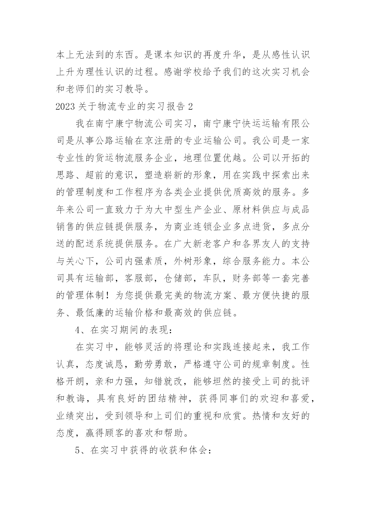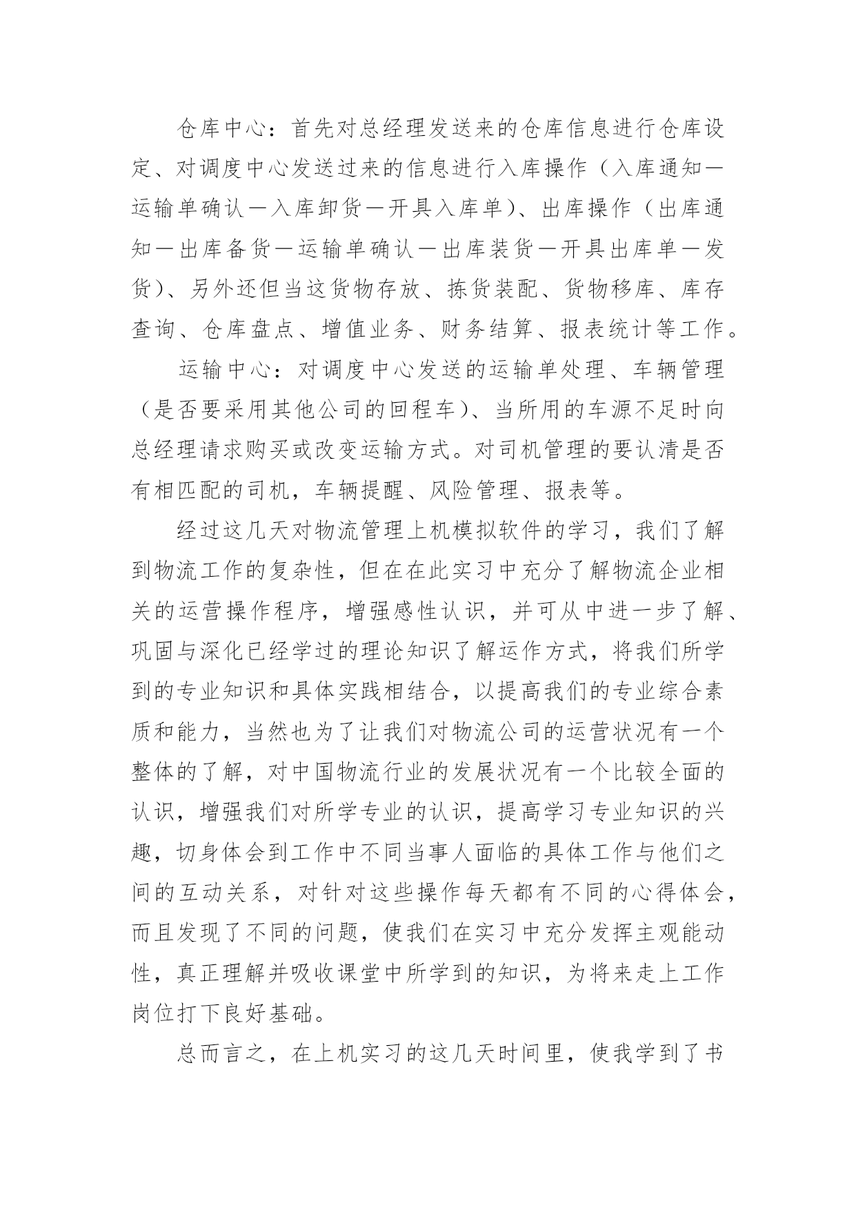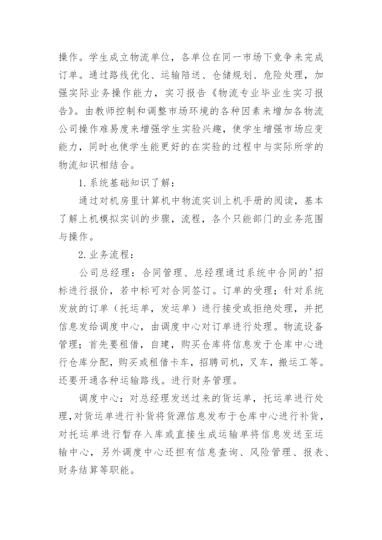 物流专业的实习报告2023关于物流专业的实习报告在现实生活中,接触并使用报告的人越来越多,其在写作上具有一定的窍门。一听到写报告马上头昏脑涨?以下是小编为大家整理的2023关于物流专业的实习报告,欢迎大家分享。2023关于物流专业的实习报告1为了更好的适应以后的学习和工作,在本学期末,由学校统一安排利用浙科物流管理软件进行实习,物流专业毕业生实习报告。我们将所学到的专业知识和具体实践相结合,以提高我们的专业综合素质和能力,当然也为了让我们对物流公司的运营状况有一个整体的了解,物流的特点,主要设备和作业流程,运营管理,增强同学们对所学专业的认识,提高学习专业知识的兴趣,深化对所学知识的理解,以便即将迈入社会的我们能够更好的适应以后的学习和工作,为以后的学习和工作打下坚实的基础。“物流”作为国民经济发展的动脉和基础产业,是一种新的生产力,是新的经济增长点。针对对这一物流形式学校利用浙科物流管理软件给我们一个更广泛的了解机会,软件中分公司总经理、调度中心、仓库中心、运输中心、四个角色来模拟现实的物流公司在一个模拟的市场环境中的实际操作。学生成立物流单位,各单位在同一市场下竞争来完成订单。通过路线优化、运输陪送、仓储规划、危险处理,加强实际业务操作能力,实习报告《物流专业毕业生实习报告》。由教师控制和调整市场环境的各种因素来增加各物流公司操作难易度来增强学生实验兴趣,使学生增强市场应变能力,同时也使学生能更好的在实验的过程中与实际所学的物流知识相结合。1.系统基础知识了解:通过对机房里计算机中物流实训上机手册的阅读,基本了解上机模拟实训的步骤,流程,各个只能部门的业务范围与操作。2.业务流程:公司总经理:合同管理、总经理通过系统中合同的'招标进行报价,若中标可对合同签订。订单的受理;针对系统发放的订单(托运单,发运单)进行接受或拒绝处理,并把信息发给调度中心,由调度中心对订单进行处理。物流设备管理;首先要租借,自建,购买仓库将信息发于仓库中心进行仓库分配,购买或租借卡车,招聘司机,叉车,搬运工等。还要开通各种运输路线。进行财务管理。调度中心:对总经理发送过来的货运单,托运单进行处理,对货运单进行补货将货源信息发布于仓库中心进行补货,对托运单进行暂存入库或直接生成运输单将信息发送至运输中心,另外调度中心还担有信息查询、风险管理、报表、财务结算等职能。仓库中心:首先对总经理发送来的仓库信息进行仓库设定、对调度中心发送过来的信息进行入库操作(入库通知-运输单确认-入库卸货-开具入库单)、出库操作(出库通知-出库备货-运输单确认-出库装货-开具出库单-发货)、另外还但当这货物存放、拣货装配、货物移库、库存查询、仓库盘点、增值业务、财务结算、报表统计等工作。运输中心:对调度中心发送的运输单处理、车辆管理(是否要采用其他公司的回程车)、当所用的车源不足时向总经理请求购买或改变运输方式。对司机管理的要认清是否有相匹配的司机,车辆提醒、风险管理、报表等。经过这几天对物流管理上机模拟软件的学习,我们了解到物流工作的复杂性,但在在此实习中充分了解物流企业相关的运营操作程序,增强感性认识,并可从中进一步了解、巩固与深化已经学过的理论知识了解运作方式,将我们所学到的专业知识和具体实践相结合,以提高我们的专业综合素质和能力,当然也为了让我们对物流公司的运营状况有一个整体的了解,对中国物流行业的发展状况有一个比较全面的认识,增强我们对所学专业的认识,提高学习专业知识的兴趣,切身体会到工作中不同当事人面临的具体工作与他们之间的互动关系,对针对这些操作每天都有不同的心得体会,而且发现了不同的问题,使我们在实习中充分发挥主观能动性,真正理解并吸收课堂中所学到的知识,为将来走上工作岗位打下良好基础。总而言之,在上机实习的这几天时间里,使我学到了书本上无法到的东西。是课本知识的再度升华,是从感性认识上升为理性认识的过程。感谢学校给予我们的这次实习机会和老师们的实习教导。2023关于物流专业的实习报告2我在南宁康宁物流公司实习,南宁康宁快运运输有限公司是从事公路运输在京注册的专业运输公司。我公司是一家专业性的货运物流服务企业,地理位置优越。公司以开拓的思路、超前的意识,塑造崭新的形象,用在实践中探索出来的管理制度和工作程序为各类企业提供优质高效的服务。多年来公司一直致力于为大中型生产企业、原材料供应与成品销售的供应链提供服务,为商业连锁企业多点进货,多点分送的配送系统提供服务。在广大新老客户和各界友人的支持与关心下,公司内强素质,外树形象,综合服务能力。本公司具有运输部,客服部,仓储部,车队,财务部等一套完善的管理体制!为您提供最完美的物流方案、最方便快捷的服务、最低廉的运输价格和最高效的供应链。4、在实习期间的表现:在实习中,能够灵活的将理论和实践连接起来,我工作认真