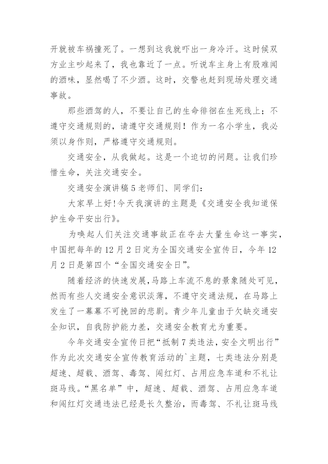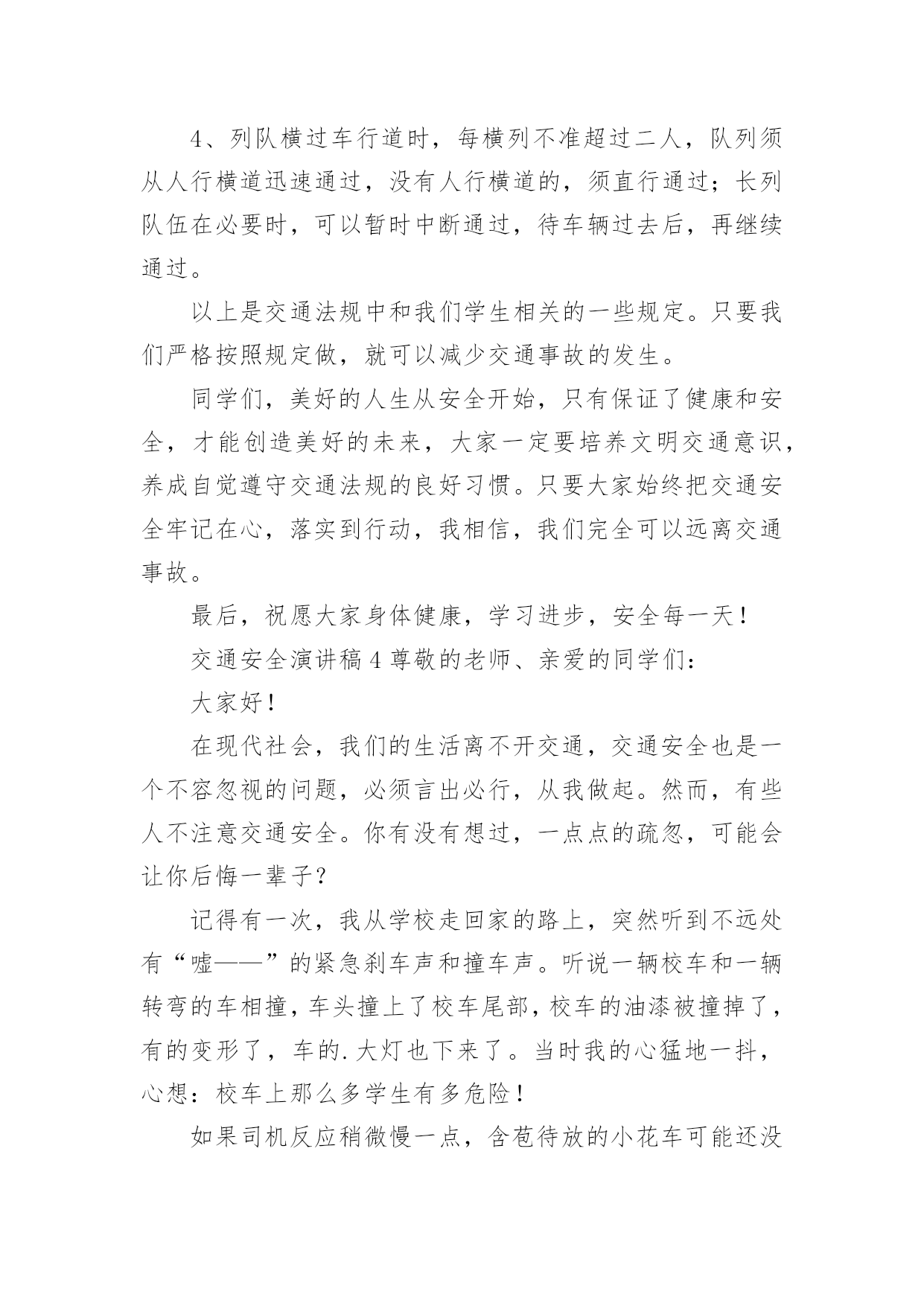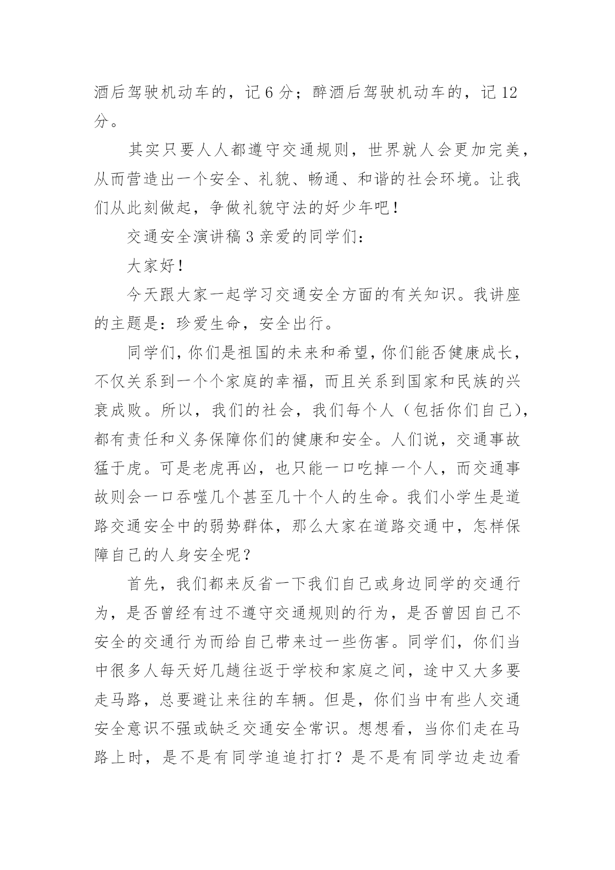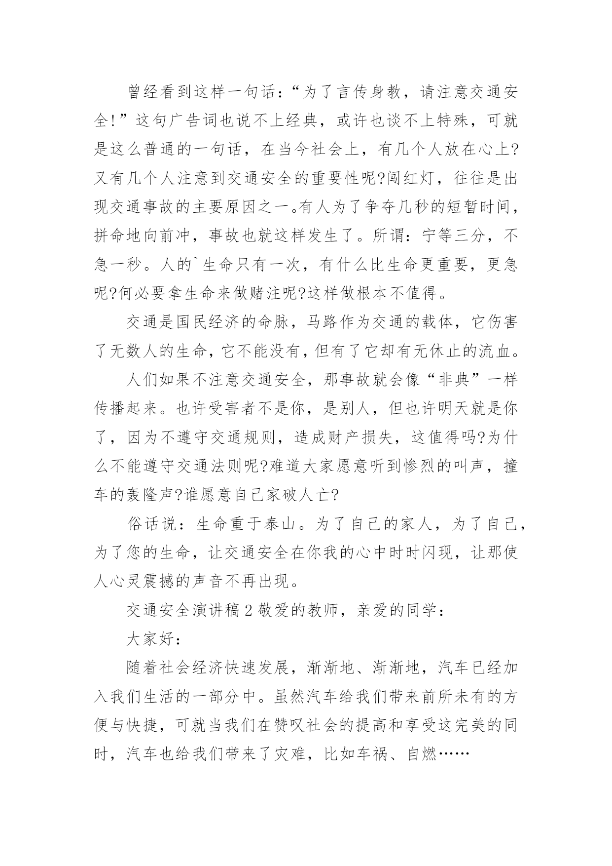 交通安全演讲稿2021交通安全演讲稿(精选7篇)使用正确的写作思路书写演讲稿会更加事半功倍。在现在社会,演讲稿在我们的视野里出现的频率越来越高,那么,怎么去写演讲稿呢?下面是小编整理的2021交通安全演讲稿(精选7篇),仅供参考,欢迎大家阅读。交通安全演讲稿1亲爱的老师、同学们:大家好!生命是唯一的,是宝贵的,世界因为有了生命而变得精彩。您的生命,您珍惜吗?要想生命得到保障,请您遵守交通规则。交通事故时时刻刻都会发生,它像颗威力十足的炸弹,一时大意,这颗埋伏在我们生活中的炸弹就会爆炸,炸得家庭破碎,炸得人心悲苦。记得我曾经在报纸上看到这样一则报道,我当时惊呆了。一位市民,因为要赶着去上班,而他必须绕过栏杆才能坐车,无奈之下,他情非得已地跨过栏杆。这时,突然,一辆卡车直奔而来,在这千钧一发的时候,只听“啊”的一声尖叫,这位市民被车撞得惨不忍睹,面目全非。当他被送到医院时,早已奄奄一息了。家属为此伤心欲绝。如果他当初能遵守交通规则,不乱跨越栏杆,他也就不会为此付出惨重的代价,把宝贵的生命白白地葬送。曾经看到这样一句话:“为了言传身教,请注意交通安全!”这句广告词也说不上经典,或许也谈不上特殊,可就是这么普通的一句话,在当今社会上,有几个人放在心上?又有几个人注意到交通安全的重要性呢?闯红灯,往往是出现交通事故的主要原因之一。有人为了争夺几秒的短暂时间,拼命地向前冲,事故也就这样发生了。所谓:宁等三分,不急一秒。人的`生命只有一次,有什么比生命更重要,更急呢?何必要拿生命来做赌注呢?这样做根本不值得。交通是国民经济的命脉,马路作为交通的载体,它伤害了无数人的生命,它不能没有,但有了它却有无休止的流血。人们如果不注意交通安全,那事故就会像“非典”一样传播起来。也许受害者不是你,是别人,但也许明天就是你了,因为不遵守交通规则,造成财产损失,这值得吗?为什么不能遵守交通法则呢?难道大家愿意听到惨烈的叫声,撞车的轰隆声?谁愿意自己家破人亡?俗话说:生命重于泰山。为了自己的家人,为了自己,为了您的生命,让交通安全在你我的心中时时闪现,让那使人心灵震撼的声音不再出现。交通安全演讲稿2敬爱的教师,亲爱的同学:大家好:随着社会经济快速发展,渐渐地、渐渐地,汽车已经加入我们生活的一部分中。虽然汽车给我们带来前所未有的方便与快捷,可就当我们在赞叹社会的提高和享受这完美的同时,汽车也给我们带来了灾难,比如车祸、自燃……车祸夺去了一个个鲜活的生命,使一个个幸福美满的家庭妻离子散、家破人亡……所以目前首要一个问题就应当加强交通管理法制化,科学化,礼貌化,构成良好的习惯和道德风范。“遵守交通规则,不乱闯红灯。“是个很重要的问题,我们不仅仅要把这句话挂在嘴边,还要把它深深地记在心上,把安全放在首位,让事故的发生可能性变得越来越少。让我们在安全的包围下欢乐、健康地成长,建设自我美丽的家园!有一次,我在放学回家的路上,看见中学生冒着寒风,在路口体验“交通协管员”的工作,在红灯亮时,有一小伙子置协管员呼声不顾,仍要往前冲,被协管员强行拦住,小伙子对协管员破口大骂,甚至拳脚相加,对协管员不尊重,不服管的现象屡见不鲜。一些骑车人和行人仅有在交警面前,才会自觉些,而很少把协管员当回事,甚至恶语相加。其实,从某种语言上来说,这是不尊重自我的生命,换句话说是对自我生命的不负职责。人的生命仅有一次,我要呼吁全社会的人民都来遵守交通规则,做个遵守法规,礼貌谦让的好公民。我要在生活小区里出版一个关于《交通安全知识》的宣传栏,让大家增强交通安全意识,养成良好的交通习惯。回到学校,我要协助少先队辅导员办《交通安全知识》小报,发动各班级举行《交通安全知识》主题班队会,教大家唱《交通安全“拍手歌”》、《红绿灯之歌》等。结合此刻的'状况,此刻引起的车祸的根源是人们饮酒后开车。根据《道路交通安全违法行为记分分值》规定:饮酒后驾驶机动车的,记6分;醉酒后驾驶机动车的,记12分。其实只要人人都遵守交通规则,世界就人会更加完美,从而营造出一个安全、礼貌、畅通、和谐的社会环境。让我们从此刻做起,争做礼貌守法的好少年吧!交通安全演讲稿3亲爱的同学们:大家好!今天跟大家一起学习交通安全方面的有关知识。我讲座的主题是:珍爱生命,安全出行。同学们,你们是祖国的未来和希望,你们能否健康成长,不仅关系到一个个家庭的幸福,而且关系到国家和民族的兴衰成败。所以,我们的社会,我们每个人(包括你们自己),都有责任和义务保障你们的健康和安全。人们说,交通事故猛于虎。可是老虎再凶,也只能一口吃掉一个人,而交通事故则会一口吞噬几个甚至几十个人的生命。我们小学生是道路交通安全中的弱势群体,那么大家在道路交通中,怎样保障自己的人身安全呢?首先,我们都来反省一下我们自己或身边同学的交通行为,是否曾经有过不遵守交通规则的行为,是否曾