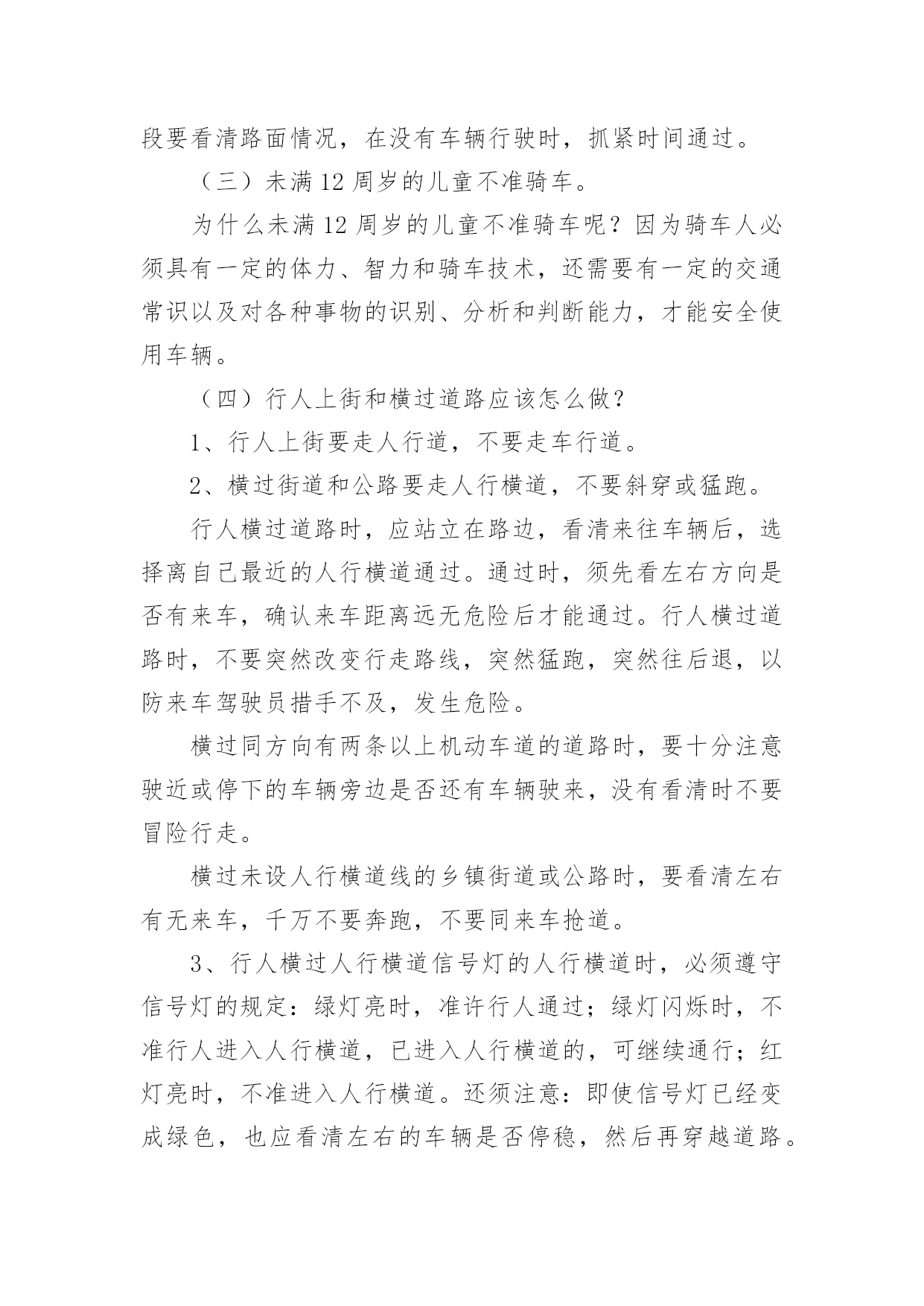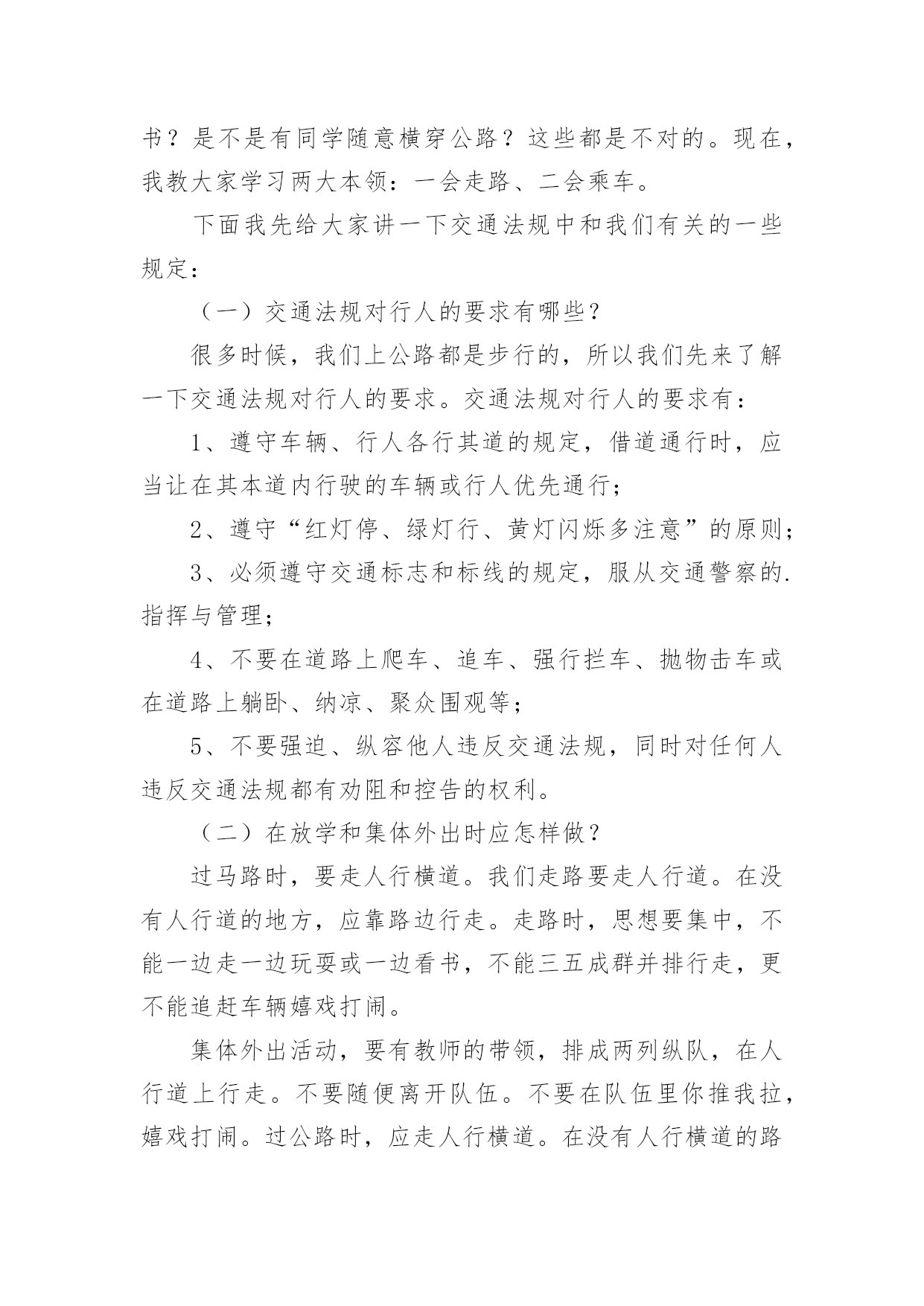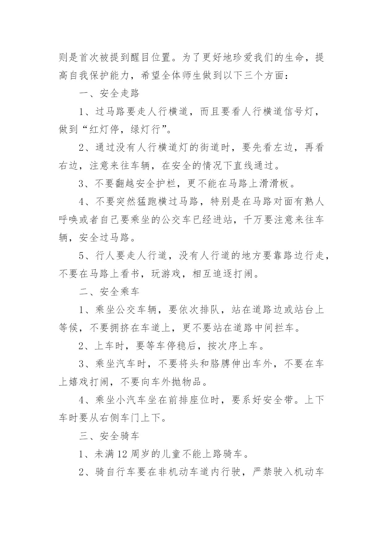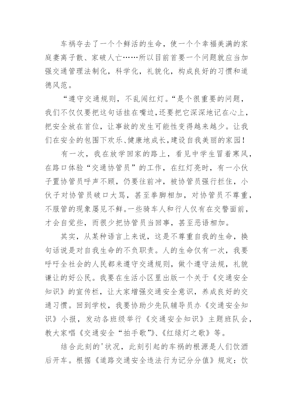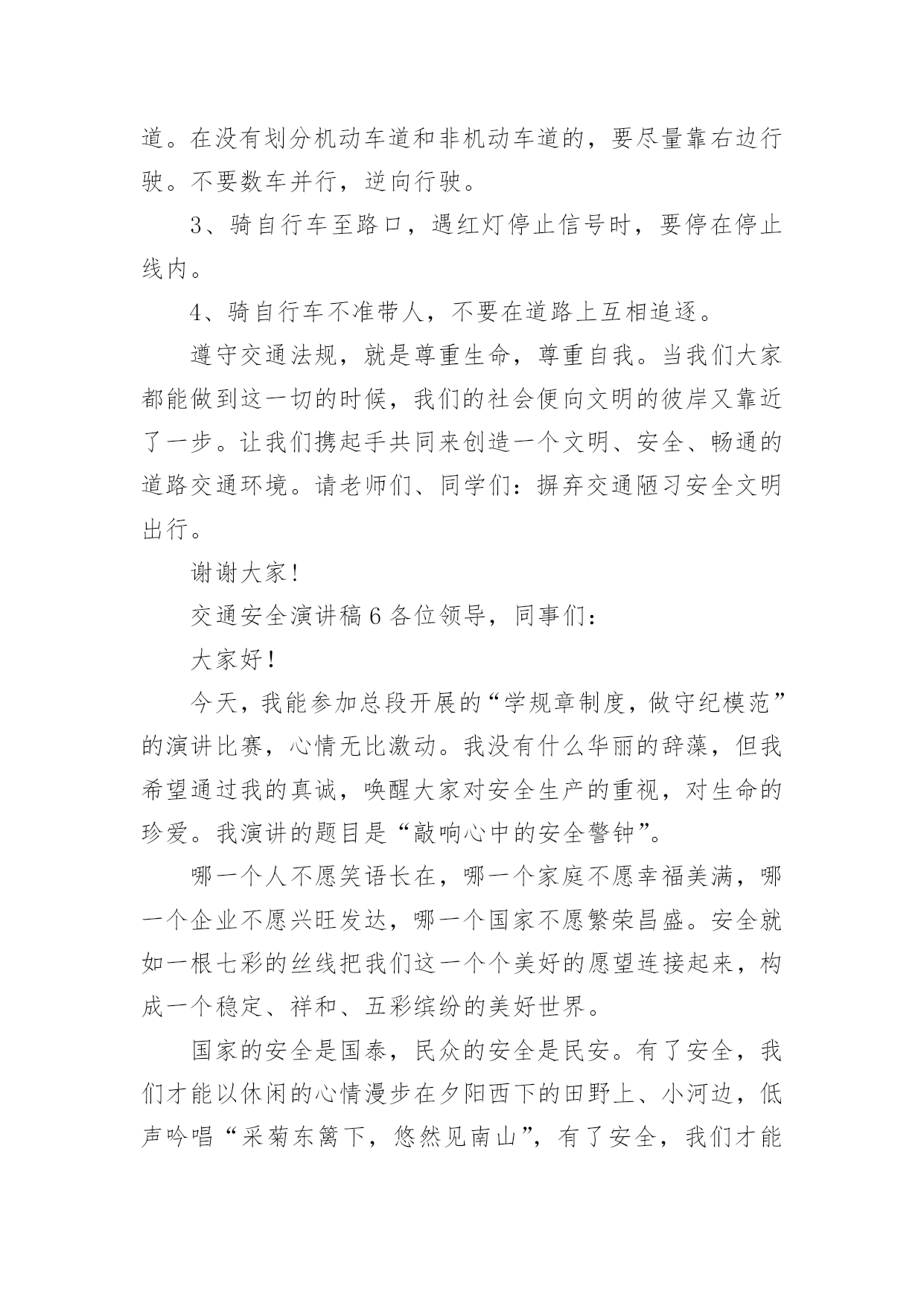 交通安全演讲稿2021交通安全演讲稿(精选7篇)使用正确的写作思路书写演讲稿会更加事半功倍。在现在社会,演讲稿在我们的视野里出现的频率越来越高,那么,怎么去写演讲稿呢?下面是小编整理的2021交通安全演讲稿(精选7篇),仅供参考,欢迎大家阅读。交通安全演讲稿1亲爱的老师、同学们:大家好!生命是唯一的,是宝贵的,世界因为有了生命而变得精彩。您的生命,您珍惜吗?要想生命得到保障,请您遵守交通规则。交通事故时时刻刻都会发生,它像颗威力十足的炸弹,一时大意,这颗埋伏在我们生活中的炸弹就会爆炸,炸得家庭破碎,炸得人心悲苦。记得我曾经在报纸上看到这样一则报道,我当时惊呆了。一位市民,因为要赶着去上班,而他必须绕过栏杆才能坐车,无奈之下,他情非得已地跨过栏杆。这时,突然,一辆卡车直奔而来,在这千钧一发的时候,只听“啊”的一声尖叫,这位市民被车撞得惨不忍睹,面目全非。当他被送到医院时,早已奄奄一息了。家属为此伤心欲绝。如果他当初能遵守交通规则,不乱跨越栏杆,他也就不会为此付出惨重的代价,把宝贵的生命白白地葬送。曾经看到这样一句话:“为了言传身教,请注意交通安全!”这句广告词也说不上经典,或许也谈不上特殊,可就是这么普通的一句话,在当今社会上,有几个人放在心上?又有几个人注意到交通安全的重要性呢?闯红灯,往往是出现交通事故的主要原因之一。有人为了争夺几秒的短暂时间,拼命地向前冲,事故也就这样发生了。所谓:宁等三分,不急一秒。人的`生命只有一次,有什么比生命更重要,更急呢?何必要拿生命来做赌注呢?这样做根本不值得。交通是国民经济的命脉,马路作为交通的载体,它伤害了无数人的生命,它不能没有,但有了它却有无休止的流血。人们如果不注意交通安全,那事故就会像“非典”一样传播起来。也许受害者不是你,是别人,但也许明天就是你了,因为不遵守交通规则,造成财产损失,这值得吗?为什么不能遵守交通法则呢?难道大家愿意听到惨烈的叫声,撞车的轰隆声?谁愿意自己家破人亡?俗话说:生命重于泰山。为了自己的家人,为了自己,为了您的生命,让交通安全在你我的心中时时闪现,让那使人心灵震撼的声音不再出现。交通安全演讲稿2敬爱的教师,亲爱的同学:大家好:随着社会经济快速发展,渐渐地、渐渐地,汽车已经加入我们生活的一部分中。虽然汽车给我们带来前所未有的方便与快捷,可就当我们在赞叹社会的提高和享受这完美的同时,汽车也给我们带来了灾难,比如车祸、自燃……车祸夺去了一个个鲜活的生命,使一个个幸福美满的家庭妻离子散、家破人亡……所以目前首要一个问题就应当加强交通管理法制化,科学化,礼貌化,构成良好的习惯和道德风范。“遵守交通规则,不乱闯红灯。“是个很重要的问题,我们不仅仅要把这句话挂在嘴边,还要把它深深地记在心上,把安全放在首位,让事故的发生可能性变得越来越少。让我们在安全的包围下欢乐、健康地成长,建设自我美丽的家园!有一次,我在放学回家的路上,看见中学生冒着寒风,在路口体验“交通协管员”的工作,在红灯亮时,有一小伙子置协管员呼声不顾,仍要往前冲,被协管员强行拦住,小伙子对协管员破口大骂,甚至拳脚相加,对协管员不尊重,不服管的现象屡见不鲜。一些骑车人和行人仅有在交警面前,才会自觉些,而很少把协管员当回事,甚至恶语相加。其实,从某种语言上来说,这是不尊重自我的生命,换句话说是对自我生命的不负职责。人的生命仅有一次,我要呼吁全社会的人民都来遵守交通规则,做个遵守法规,礼貌谦让的好公民。我要在生活小区里出版一个关于《交通安全知识》的宣传栏,让大家增强交通安全意识,养成良好的交通习惯。回到学校,我要协助少先队辅导员办《交通安全知识》小报,发动各班级举行《交通安全知识》主题班队会,教大家唱《交通安全“拍手歌”》、《红绿灯之歌》等。结合此刻的'状况,此刻引起的车祸的根源是人们饮酒后开车。根据《道路交通安全违法行为记分分值》规定:饮酒后驾驶机动车的,记6分;醉酒后驾驶机动车的,记12分。其实只要人人都遵守交通规则,世界就人会更加完美,从而营造出一个安全、礼貌、畅通、和谐的社会环境。让我们从此刻做起,争做礼貌守法的好少年吧!交通安全演讲稿3亲爱的同学们:大家好!今天跟大家一起学习交通安全方面的有关知识。我讲座的主题是:珍爱生命,安全出行。同学们,你们是祖国的未来和希望,你们能否健康成长,不仅关系到一个个家庭的幸福,而且关系到国家和民族的兴衰成败。所以,我们的社会,我们每个人(包括你们自己),都有责任和义务保障你们的健康和安全。人们说,交通事故猛于虎。可是老虎再凶,也只能一口吃掉一个人,而交通事故则会一口吞噬几个甚至几十个人的生命。我们小学生是道路交通安全中的弱势群体,那么大家在道路交通中,怎样保障自己的人身安全呢?首先,我们都来反省一下我们自己或身边同学的交通行为,是否曾经有过不遵守交通规则的行为,是否曾
