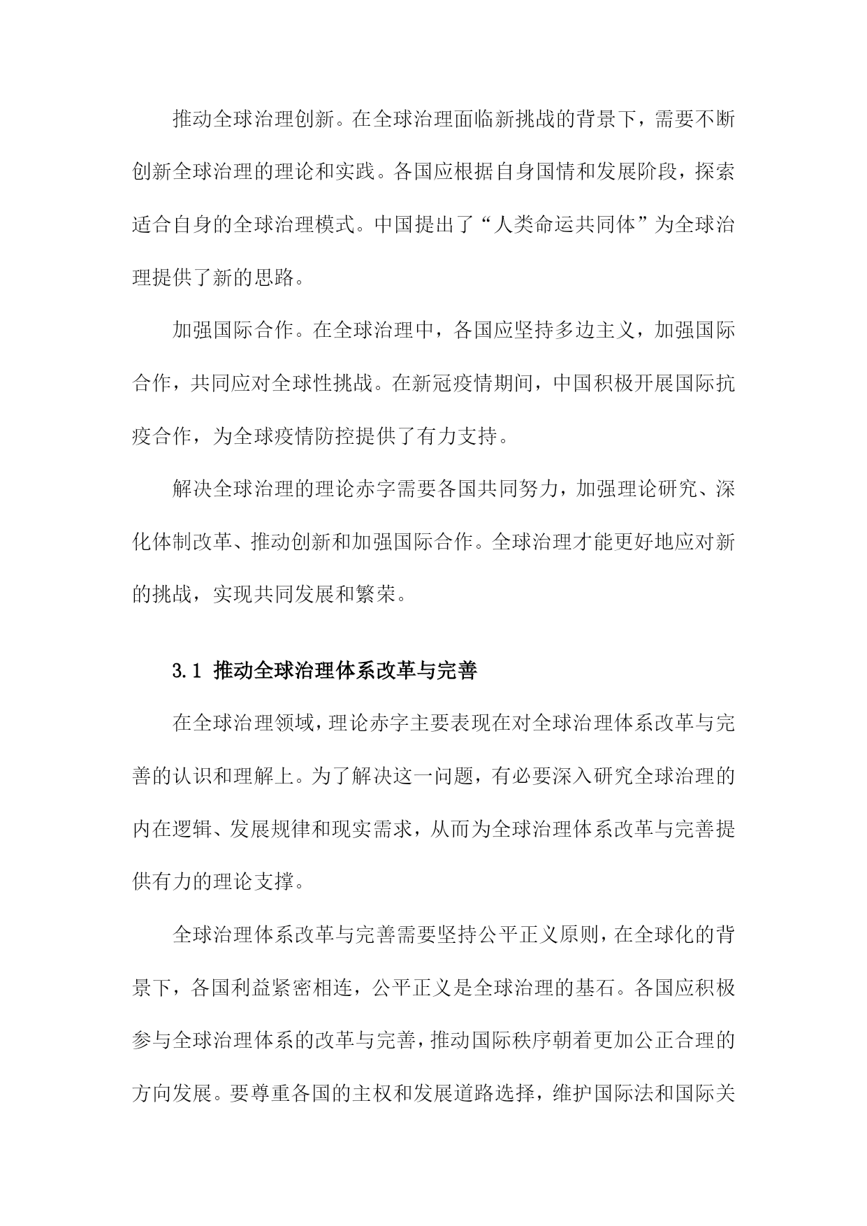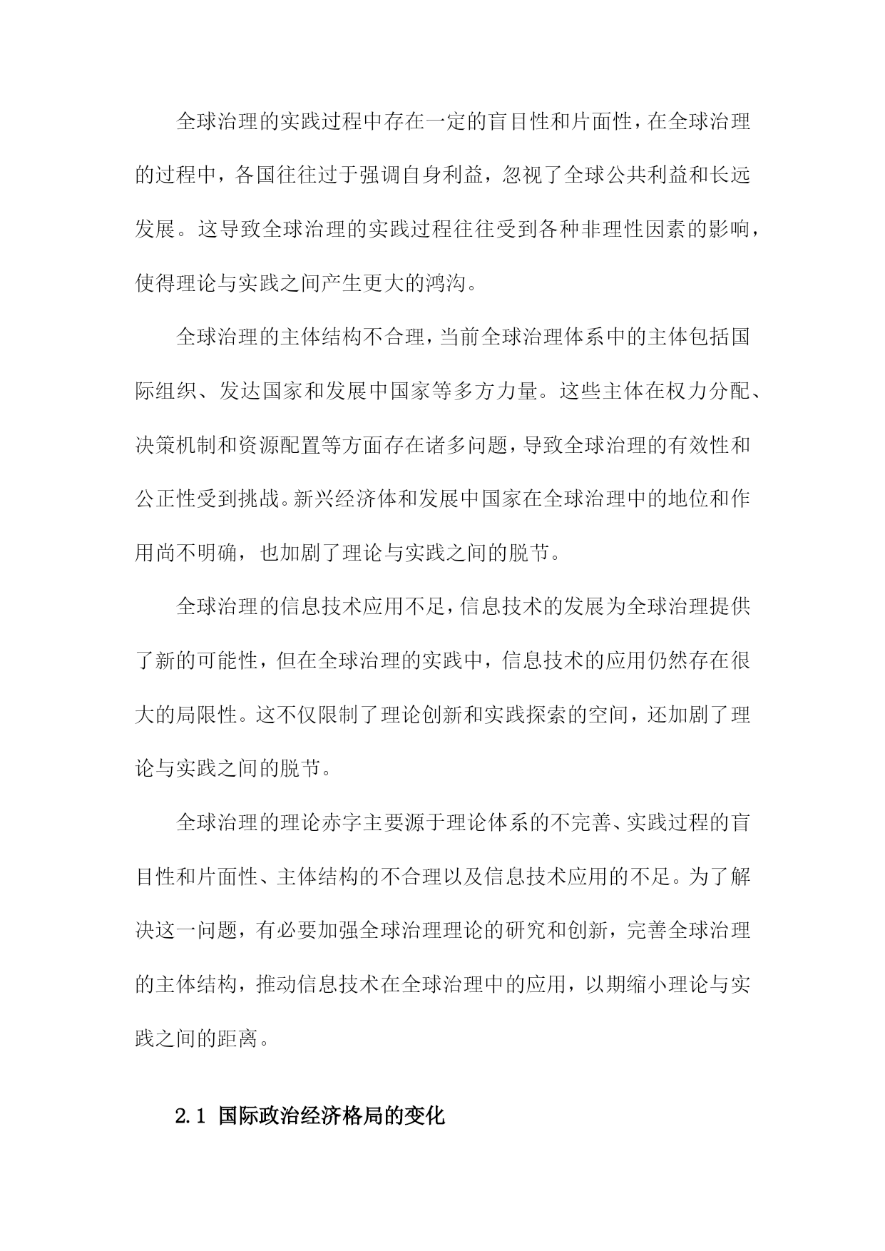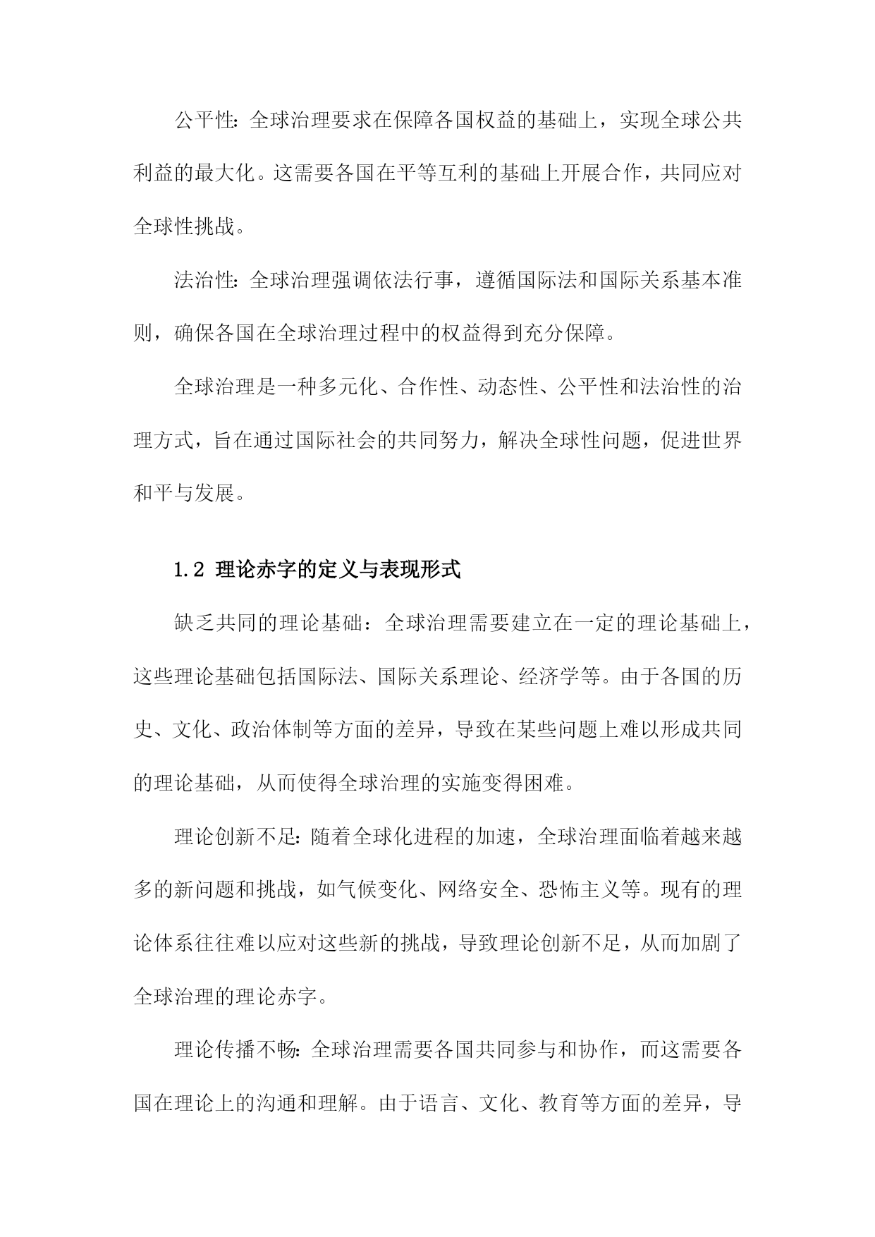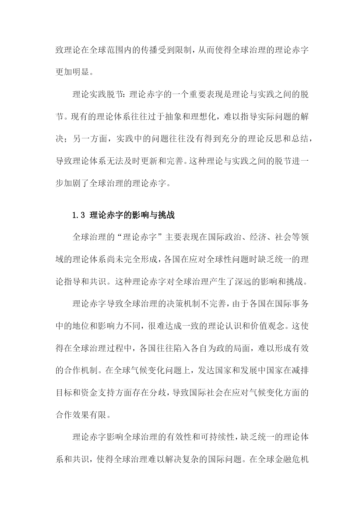 论全球治理的“理论赤字”及其纾解1.全球治理的理论赤字概述随着全球化的不断深入,各国之间的联系日益紧密,全球治理面临着诸多挑战。尽管国际社会已经取得了一定的进展,但仍然存在着许多理论上的不足和空白。这种现象被称为全球治理的理论赤字,全球治理的理论赤字主要表现在全球治理体系、全球治理机制、全球治理原则等方面。本文将对全球治理的理论赤字进行概述,并探讨如何纾解这一问题。1.1全球治理的概念与特点多样性:全球治理涉及众多国家和地区,各国在政治制度、文化传统、经济发展水平等方面存在差异,因此在全球治理过程中需要充分尊重各国的主权和发展道路。合作性:全球治理强调国际合作,通过多边机制和国际组织加强沟通与协调,共同应对全球性挑战。联合国作为最具代表性的国际组织,在全球治理中发挥着关键作用。动态性:全球治理是一个不断发展和完善的过程,随着国际形势的变化和全球性问题的出现,全球治理的目标和手段也在不断调整和优化。公平性:全球治理要求在保障各国权益的基础上,实现全球公共利益的最大化。这需要各国在平等互利的基础上开展合作,共同应对全球性挑战。法治性:全球治理强调依法行事,遵循国际法和国际关系基本准则,确保各国在全球治理过程中的权益得到充分保障。全球治理是一种多元化、合作性、动态性、公平性和法治性的治理方式,旨在通过国际社会的共同努力,解决全球性问题,促进世界和平与发展。1.2理论赤字的定义与表现形式缺乏共同的理论基础:全球治理需要建立在一定的理论基础上,这些理论基础包括国际法、国际关系理论、经济学等。由于各国的历史、文化、政治体制等方面的差异,导致在某些问题上难以形成共同的理论基础,从而使得全球治理的实施变得困难。理论创新不足:随着全球化进程的加速,全球治理面临着越来越多的新问题和挑战,如气候变化、网络安全、恐怖主义等。现有的理论体系往往难以应对这些新的挑战,导致理论创新不足,从而加剧了全球治理的理论赤字。理论传播不畅:全球治理需要各国共同参与和协作,而这需要各国在理论上的沟通和理解。由于语言、文化、教育等方面的差异,导致理论在全球范围内的传播受到限制,从而使得全球治理的理论赤字更加明显。理论实践脱节:理论赤字的一个重要表现是理论与实践之间的脱节。现有的理论体系往往过于抽象和理想化,难以指导实际问题的解决;另一方面,实践中的问题往往没有得到充分的理论反思和总结,导致理论体系无法及时更新和完善。这种理论与实践之间的脱节进一步加剧了全球治理的理论赤字。1.3理论赤字的影响与挑战全球治理的“理论赤字”主要表现在国际政治、经济、社会等领域的理论体系尚未完全形成,各国在应对全球性问题时缺乏统一的理论指导和共识。这种理论赤字对全球治理产生了深远的影响和挑战。理论赤字导致全球治理的决策机制不完善,由于各国在国际事务中的地位和影响力不同,很难达成一致的理论认识和价值观念。这使得在全球治理过程中,各国往往陷入各自为政的局面,难以形成有效的合作机制。在全球气候变化问题上,发达国家和发展中国家在减排目标和资金支持方面存在分歧,导致国际社会在应对气候变化方面的合作效果有限。理论赤字影响全球治理的有效性和可持续性,缺乏统一的理论体系和共识,使得全球治理难以解决复杂的国际问题。在全球金融危机爆发后,国际社会对于如何加强金融监管和防范系统性风险的认识尚不一致,导致应对措施的效果受到限制。理论赤字还可能导致全球治理的决策过程缺乏透明度和民主性,使得各国在国际事务中的权益受到损害。理论赤字加剧了全球治理的不确定性,在缺乏统一理论体系的情况下,各国在应对国际问题时容易受到外部势力的影响,导致全球治理的路径选择和发展方向充满变数。在全球网络安全问题上,一些国家试图通过网络空间进行军事竞赛,加剧了国际社会的紧张局势。全球治理的“理论赤字”对其产生了诸多影响和挑战。为了应对这些挑战,国际社会需要加强理论研究和创新,形成具有普遍认同的国际理论体系,以促进全球治理的有效性、可持续性和稳定性。各国应积极参与全球治理的决策过程,推动国际社会形成更加公正、合理的国际秩序。2.全球治理的理论赤字原因分析全球治理的理论体系尚未形成完善的框架,虽然国际社会在全球化进程中逐渐形成了一套关于全球治理的理论和观点,但这些理论和观点往往缺乏系统性和完整性,难以为全球治理提供一个统一的理论基础。由于各国政治体制、文化传统和价值观念的差异,全球治理的理论体系很难达成共识,导致理论与实践之间的脱节。全球治理的实践过程中存在一定的盲目性和片面性,在全球治理的过程中,各国往往过于强调自身利益,忽视了全球公共利益和长远发展。这导致全球治理的实践过程往往受到各种非理性因素的影响,使得理论与实践之间产生更大的鸿沟。全球治理的主体结构不合理,当前全球治理体系中的主体包括国际组织、发