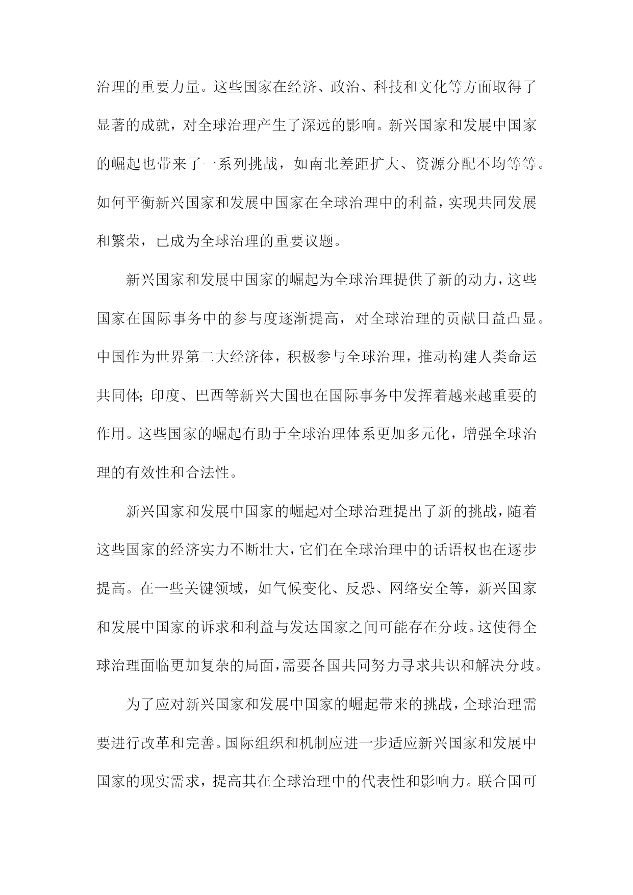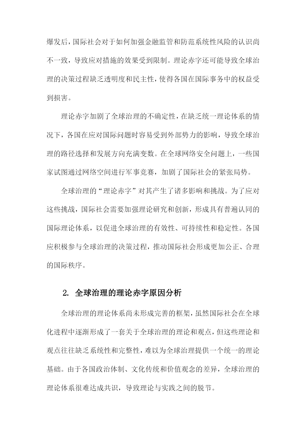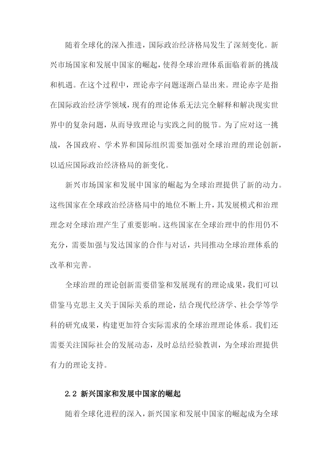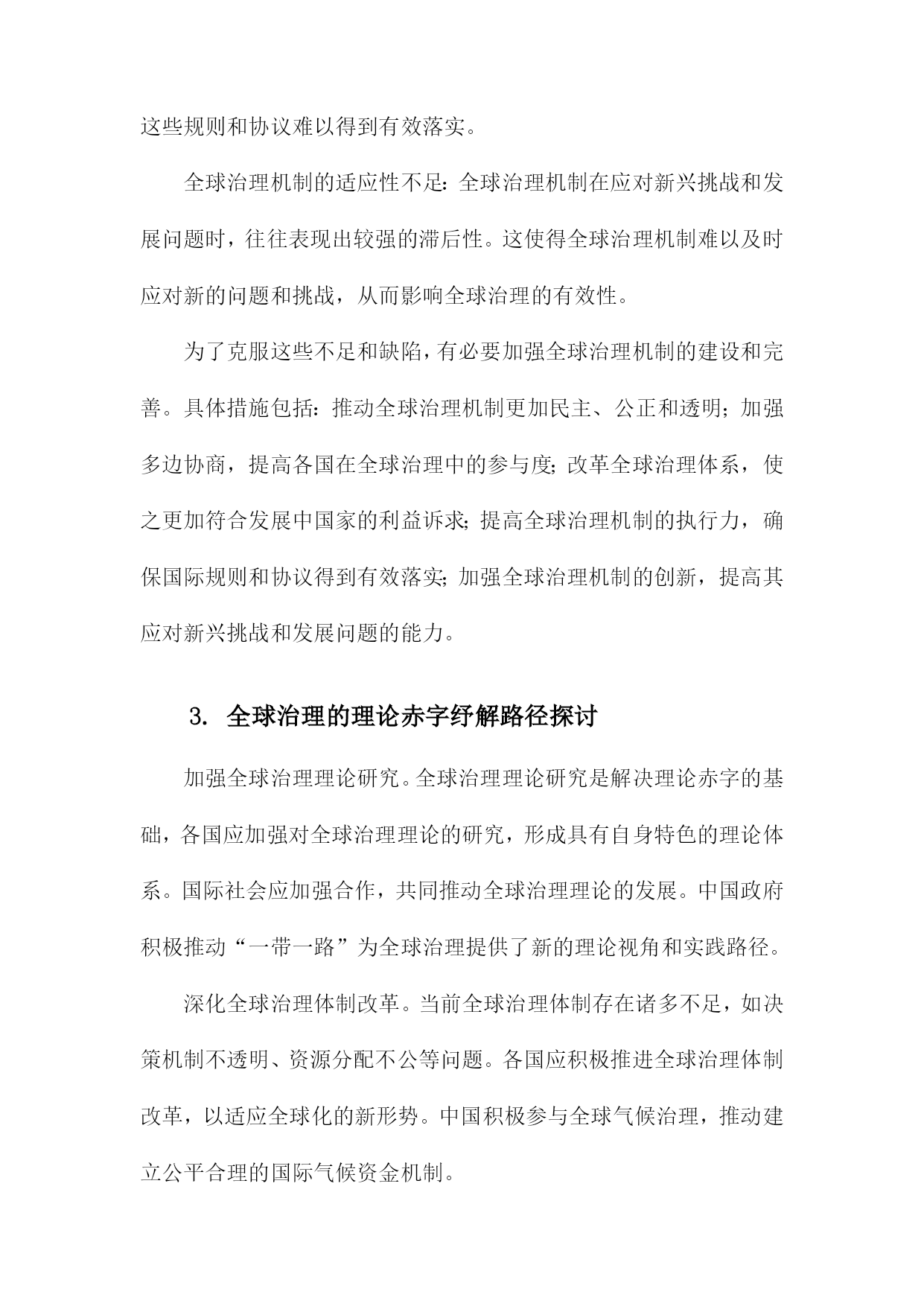 论全球治理的“理论赤字”及其纾解1.全球治理的理论赤字概述随着全球化的不断深入,各国之间的联系日益紧密,全球治理面临着诸多挑战。尽管国际社会已经取得了一定的进展,但仍然存在着许多理论上的不足和空白。这种现象被称为全球治理的理论赤字,全球治理的理论赤字主要表现在全球治理体系、全球治理机制、全球治理原则等方面。本文将对全球治理的理论赤字进行概述,并探讨如何纾解这一问题。1.1全球治理的概念与特点多样性:全球治理涉及众多国家和地区,各国在政治制度、文化传统、经济发展水平等方面存在差异,因此在全球治理过程中需要充分尊重各国的主权和发展道路。合作性:全球治理强调国际合作,通过多边机制和国际组织加强沟通与协调,共同应对全球性挑战。联合国作为最具代表性的国际组织,在全球治理中发挥着关键作用。动态性:全球治理是一个不断发展和完善的过程,随着国际形势的变化和全球性问题的出现,全球治理的目标和手段也在不断调整和优化。公平性:全球治理要求在保障各国权益的基础上,实现全球公共利益的最大化。这需要各国在平等互利的基础上开展合作,共同应对全球性挑战。法治性:全球治理强调依法行事,遵循国际法和国际关系基本准则,确保各国在全球治理过程中的权益得到充分保障。全球治理是一种多元化、合作性、动态性、公平性和法治性的治理方式,旨在通过国际社会的共同努力,解决全球性问题,促进世界和平与发展。1.2理论赤字的定义与表现形式缺乏共同的理论基础:全球治理需要建立在一定的理论基础上,这些理论基础包括国际法、国际关系理论、经济学等。由于各国的历史、文化、政治体制等方面的差异,导致在某些问题上难以形成共同的理论基础,从而使得全球治理的实施变得困难。理论创新不足:随着全球化进程的加速,全球治理面临着越来越多的新问题和挑战,如气候变化、网络安全、恐怖主义等。现有的理论体系往往难以应对这些新的挑战,导致理论创新不足,从而加剧了全球治理的理论赤字。理论传播不畅:全球治理需要各国共同参与和协作,而这需要各国在理论上的沟通和理解。由于语言、文化、教育等方面的差异,导致理论在全球范围内的传播受到限制,从而使得全球治理的理论赤字更加明显。理论实践脱节:理论赤字的一个重要表现是理论与实践之间的脱节。现有的理论体系往往过于抽象和理想化,难以指导实际问题的解决;另一方面,实践中的问题往往没有得到充分的理论反思和总结,导致理论体系无法及时更新和完善。这种理论与实践之间的脱节进一步加剧了全球治理的理论赤字。1.3理论赤字的影响与挑战全球治理的“理论赤字”主要表现在国际政治、经济、社会等领域的理论体系尚未完全形成,各国在应对全球性问题时缺乏统一的理论指导和共识。这种理论赤字对全球治理产生了深远的影响和挑战。理论赤字导致全球治理的决策机制不完善,由于各国在国际事务中的地位和影响力不同,很难达成一致的理论认识和价值观念。这使得在全球治理过程中,各国往往陷入各自为政的局面,难以形成有效的合作机制。在全球气候变化问题上,发达国家和发展中国家在减排目标和资金支持方面存在分歧,导致国际社会在应对气候变化方面的合作效果有限。理论赤字影响全球治理的有效性和可持续性,缺乏统一的理论体系和共识,使得全球治理难以解决复杂的国际问题。在全球金融危机爆发后,国际社会对于如何加强金融监管和防范系统性风险的认识尚不一致,导致应对措施的效果受到限制。理论赤字还可能导致全球治理的决策过程缺乏透明度和民主性,使得各国在国际事务中的权益受到损害。理论赤字加剧了全球治理的不确定性,在缺乏统一理论体系的情况下,各国在应对国际问题时容易受到外部势力的影响,导致全球治理的路径选择和发展方向充满变数。在全球网络安全问题上,一些国家试图通过网络空间进行军事竞赛,加剧了国际社会的紧张局势。全球治理的“理论赤字”对其产生了诸多影响和挑战。为了应对这些挑战,国际社会需要加强理论研究和创新,形成具有普遍认同的国际理论体系,以促进全球治理的有效性、可持续性和稳定性。各国应积极参与全球治理的决策过程,推动国际社会形成更加公正、合理的国际秩序。2.全球治理的理论赤字原因分析全球治理的理论体系尚未形成完善的框架,虽然国际社会在全球化进程中逐渐形成了一套关于全球治理的理论和观点,但这些理论和观点往往缺乏系统性和完整性,难以为全球治理提供一个统一的理论基础。由于各国政治体制、文化传统和价值观念的差异,全球治理的理论体系很难达成共识,导致理论与实践之间的脱节。全球治理的实践过程中存在一定的盲目性和片面性,在全球治理的过程中,各国往往过于强调自身利益,忽视了全球公共利益和长远发展。这导致全球治理的实践过程往往受到各种非理性因素的影响,使得理论与实践之间产生更大的鸿沟。全球治理的主体结构不合理,当前全球治理体系中的主体包括国际组织、发