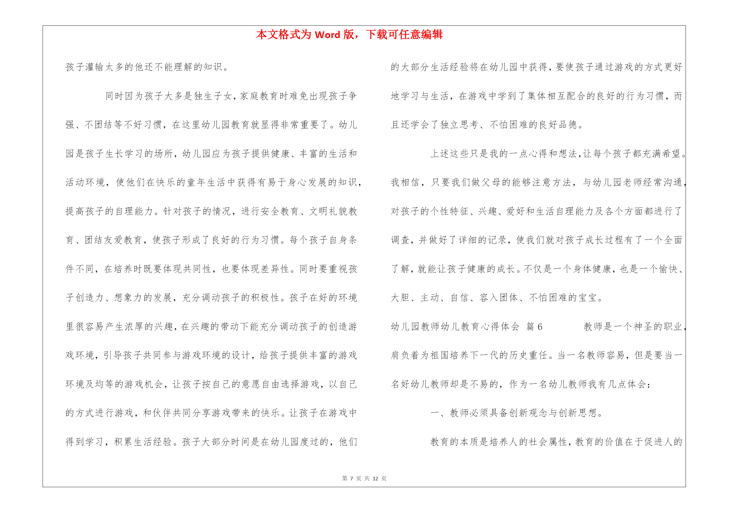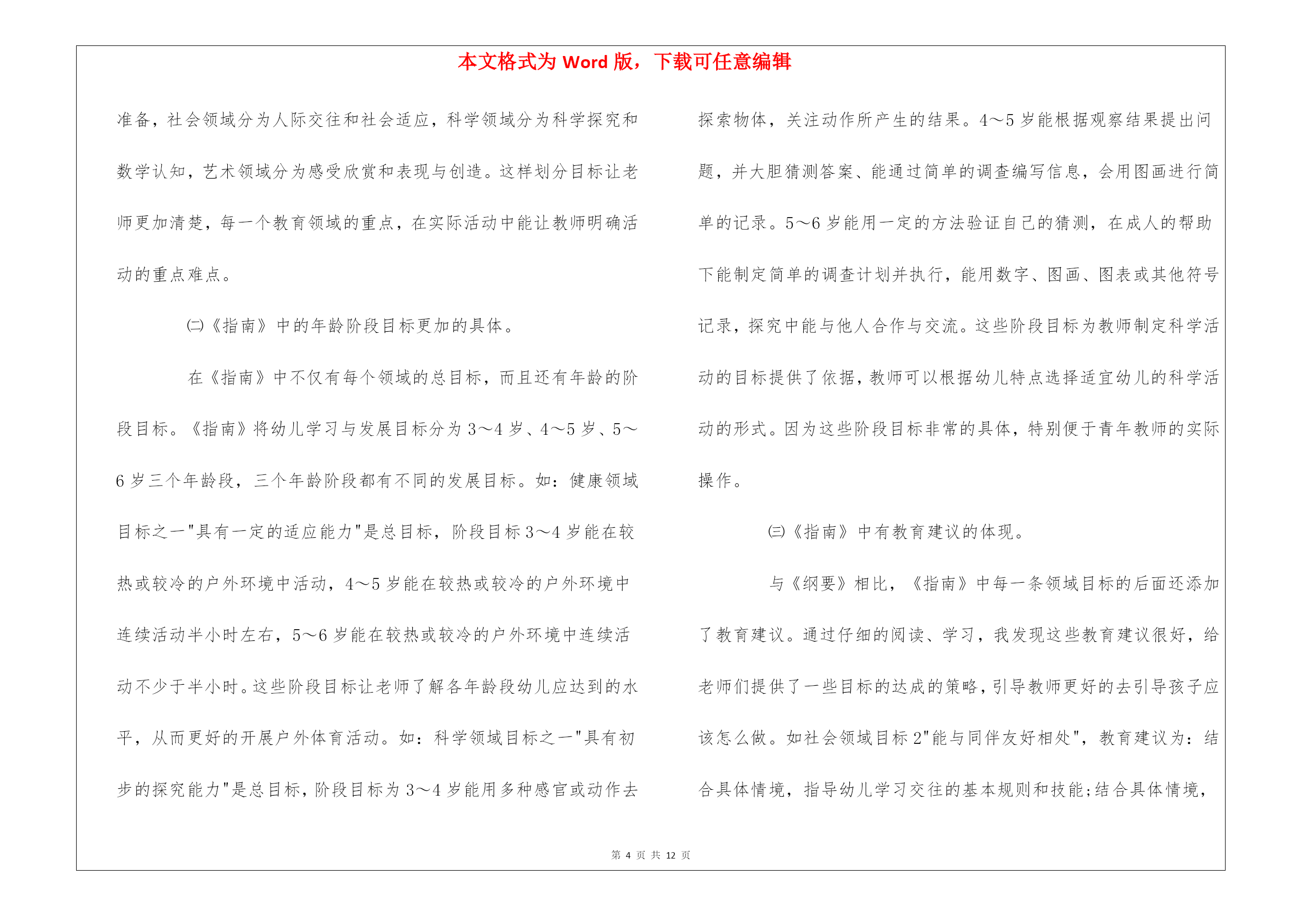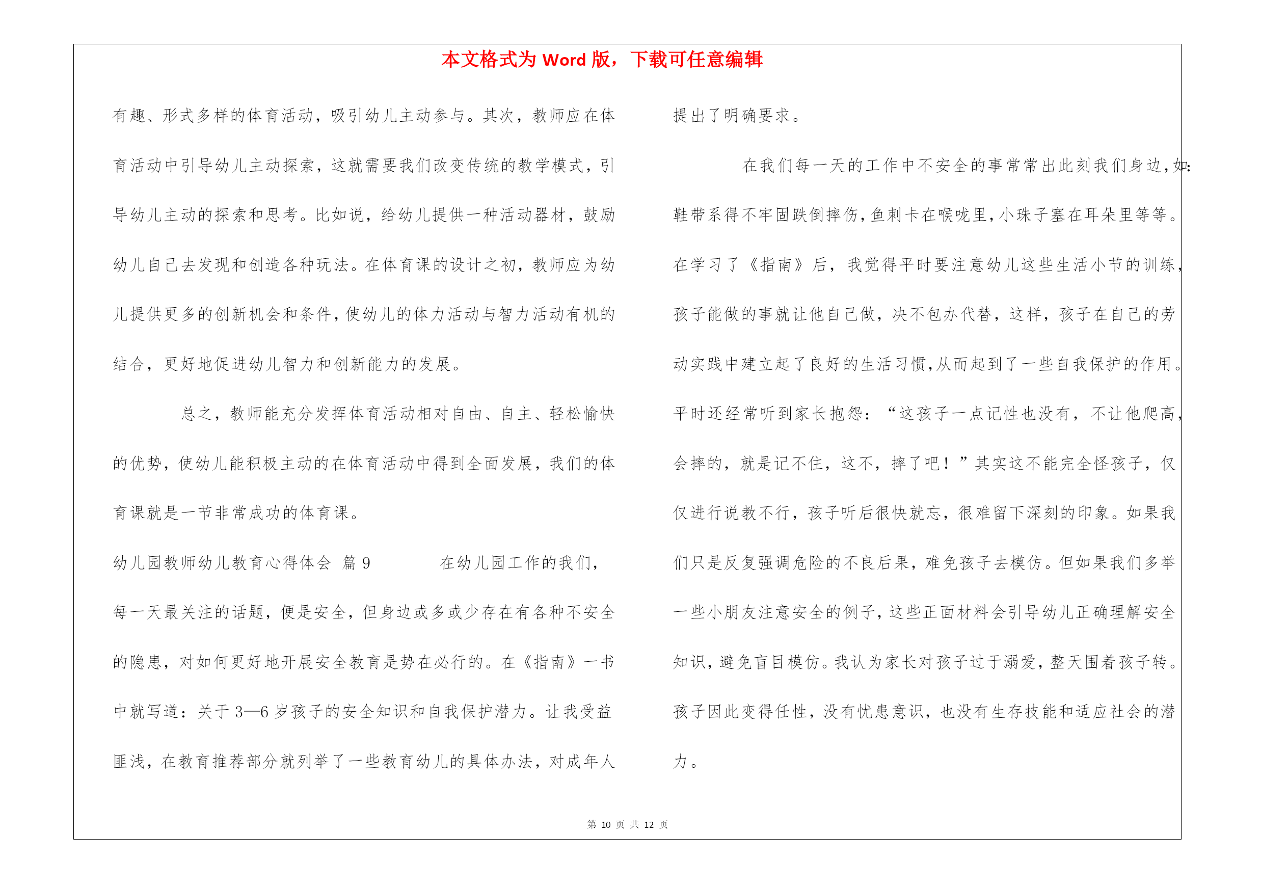 本文格式为Word版,下载可任意编辑第PAGE\*MERGEFORMAT12页共NUMPAGES\*MERGEFORMAT12页幼儿园教师幼儿教育心得体会集合10篇>幼儿园教师幼儿教育心得体会集合10篇某些事情让我们心里有了一些心得后,写一篇心得体会,记录下来,这样我们可以养成良好的总结方法。那么心得体会怎么写才能感染读者呢?下面是我为大家整理的幼儿园教师幼儿教育心得体会10篇,仅供参考,欢迎大家阅读。幼儿园教师幼儿教育心得体会篇1我是一名小学的语文教师,从事教学已有二十多年了,由于幼儿园差教师,我被调进幼儿园工作,一晃六年过去了,回忆过去走过的路,再展望未来,真的,当一名幼教老师真快乐!和天真活泼的小朋友在一起心情爽:每当音乐一响起,小朋友们都会跟着音乐的节奏欢快的跳动,那稚气的笑脸、那整齐的动作,再加上优雅的音乐声,我的心倍儿爽啊!幼儿的好奇与好问也常常令人暗笑:有一次,一个小朋友问道:“老师,你读过书吗?老师,人是怎样出生的?树叶为什么到秋天就会落呢?小雨怎么那么捣蛋啊?蚂蚁吃什么呀?”等等一些有时候不好直接回答的问题,幼儿们的幼稚让我看来太可爱哦!幼儿们对老师的讨好也叫人舒心:幼儿们别看他们小小的年纪,可讨好老师,是一个比一个行,每天就会有些孩子围着老师,对老师说:“老师你今天穿的好漂亮啊,你好年轻啊,我们好喜欢你啊,”等等。当老师一靠近他们,他们就会向老师撒娇,休息时,一些孩子就都来靠在我的身边,在我身上摸来摸去,我知道他们这是喜欢老师的一种表达方式,我就是特别特别喜欢那群幼稚可爱的孩子。当一名老师好,可当一名幼儿园的老师更好,幼儿园的老师整天生活在欢声笑语之中,心中无压力,虽然责任重大,但只要有责任心,我觉得当幼儿园的老师是我无怨无悔的选择,做一名幼儿园的老师真好!幼儿园教师幼儿教育心得体会篇2孩子们陆续被家长接走了,看到杂乱的教室,我和钱老师站在一起,相视一笑,“开始整理吧,明天还是这样子。”是呀,面对孩子,我们没有苛求,虽然,每天不管多累都要收拾战场一样的场面,毕竟,看重孩子们的进步是我们最大的满足,累点也值得了。边收拾凌乱的玩具,不由得让我想起刚被家长接走的孩子们,看到插塑玩具,让我记起哭闹的新生王子恒,正是这个插塑,让我打开了孩子的话题,孩子由原来的哭闹到学会了创造,入园以来,飞机、花朵、长城在孩子的手中尽情展现。他在幼儿园找到了乐趣与欢笑,还时不时的走到我面前跟我炫耀:“老师,我没有找奶奶,我自己玩的。孩子们玩耍的场面在我这里历历在目,我不由得笑出声来,真的,好可爱的孩子们。“无奈了吧。”听到我笑声的钱老师对我说,“谁说无奈,是太可爱,看吧,等到下一星期,杂乱的教室就不杂乱了。”怎样,想到这些孩子们可爱的身影,在不知不觉中,教室就被我们收拾的整整齐齐,一切又回复了昨天的样子。因为,我相信,杂乱是暂时的,它需要我们每个教师的耐心与爱心。在一日活动中,我这个当老师的常常以挑剔的眼光对待孩子,恨不得孩子们个个十全十美,处处都能合乎我的标准。然而那一次孩子们对我的宽容却让我深深的感动,同时也启迪我对以往的做法进行了深刻的反思。幼儿园教师幼儿教育心得体会篇3为深入贯彻《国家中长期教育改革和发展规划纲要(20xx202年)》和《国务院关于当前发展学前教育的若干意见》,指导幼儿园和家实施科学的保育和教育,促进幼儿身心全面和谐发展,制定《3~6岁儿童学习与发展指南》,简称《指南》。《指南》中涵盖了很多的内容,为了深入了《指南》要传达给我们老师的精神,利用假期时间,我认真的学习、理解了《指南》,以下就是我学习《指南》的心得体会。一、对《指南》的概念有了进一步的了解。为了更加深入的了解《指南》的内容,我首先认真学习了《指南》的概念。《指南》以为幼儿后继学习和终身发展奠定良好素质基础为目标,以促进幼儿在体、智、德、美各方面的全面协调发展为核心,旨在引导幼儿园教师和家长树立正确的教育观念,了解36岁幼儿学习与发展的基本规律和特点,建立对幼儿发展的合理期望。从概念中能看出《指南》和《纲要》要达到的目标是一致的,不同在于《指南》中不仅有教师参与,还有家长的参与,这说明教孩子不只是老师的事情,要需要家长一起配合。此外,"了解36岁幼儿学习与发展的基本规律和特点,建立对幼儿发展的合理期望。"更好的将"以幼儿为本"体现在《指南》中。二、对实施《指南》的原则有了进一步的了解。只有明确了《指南》的原则,才能更好的贯彻《指南》的精神。《指南》的原则为:遵循幼儿的发展规律和学习特点,关注幼儿身心全面和谐发展、尊重幼儿发展的个体差异。这三个原则都把都幼儿作为主体,在制定原则时更多的是考虑孩子的'特点和身心发展的规律,为今后执行《指南》目标更加有目的性。其中原则说到:要注重学习与发展各领域之间的相互渗透和整合,从不同角度促进幼儿全