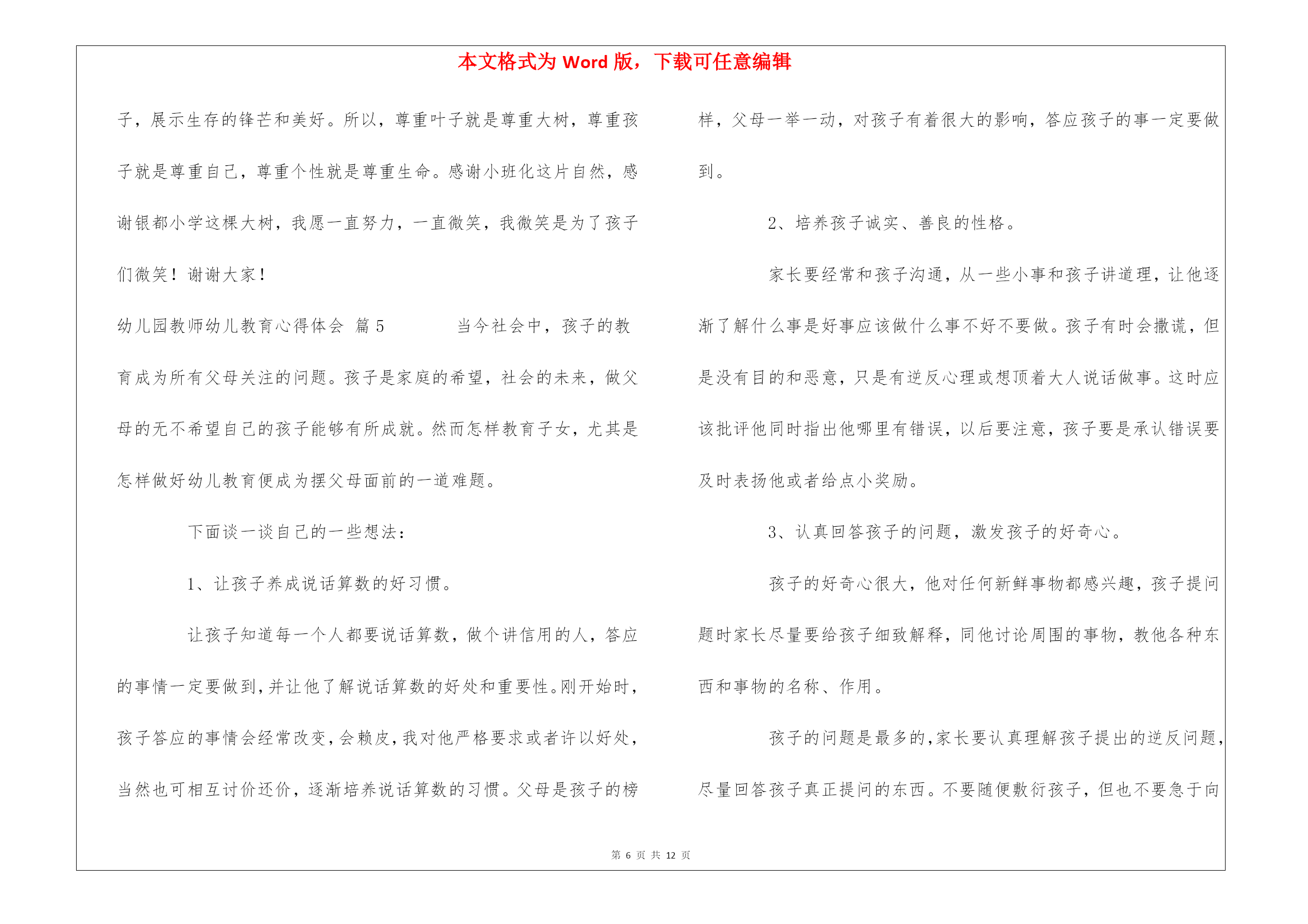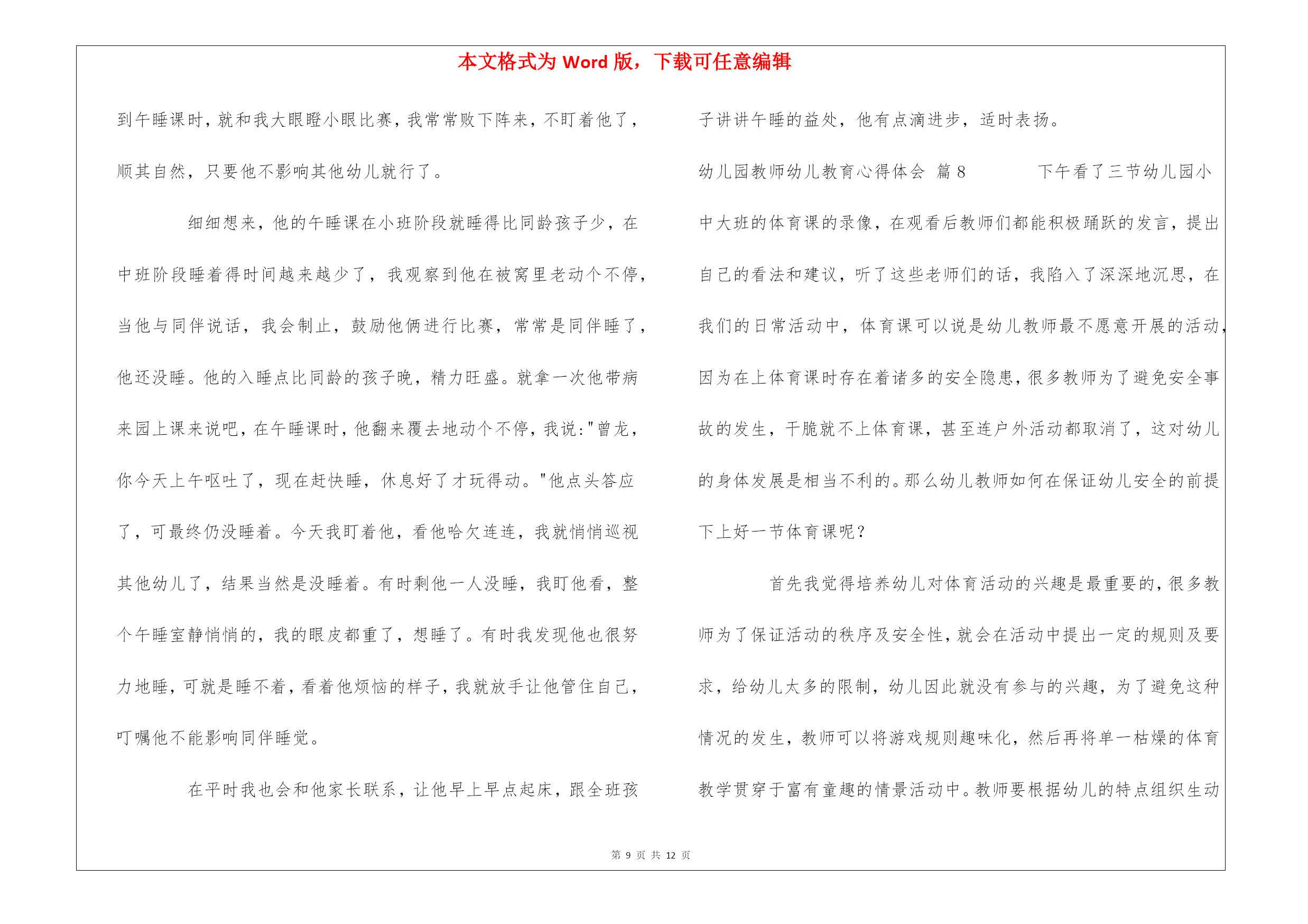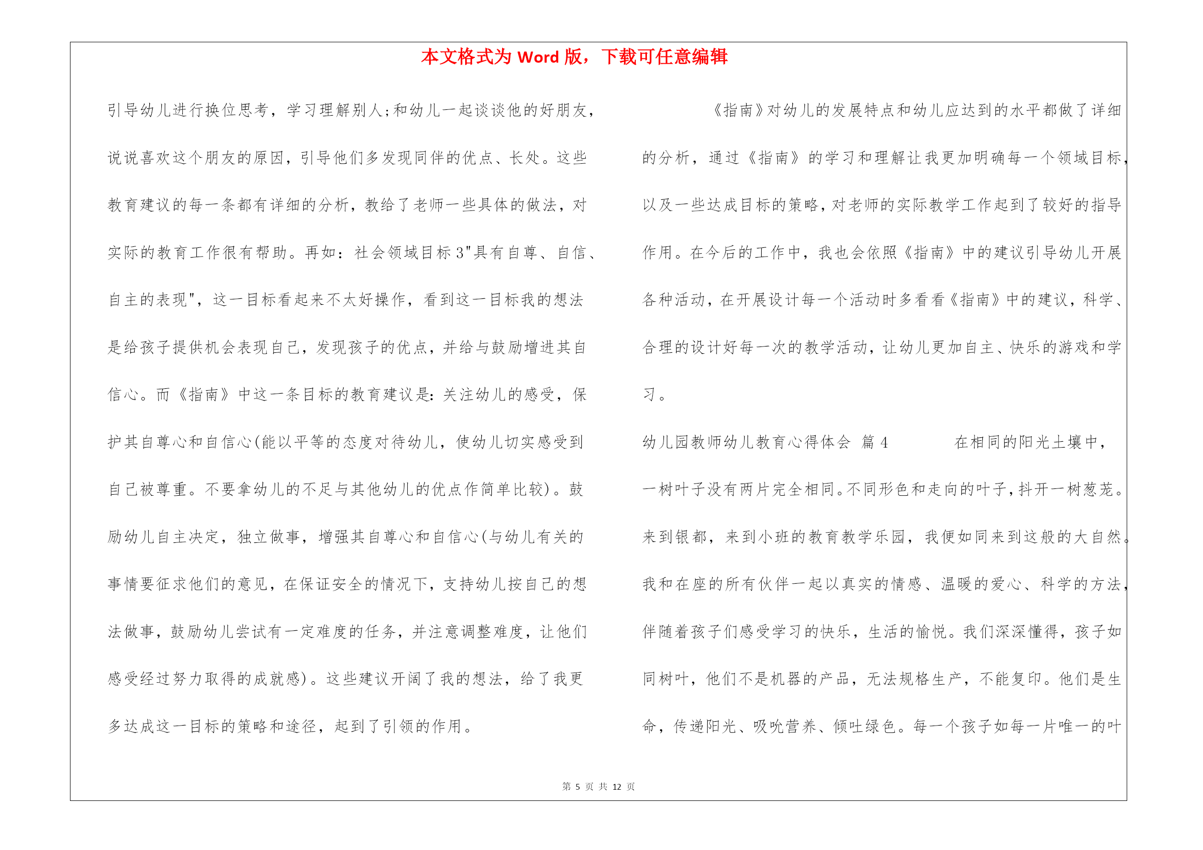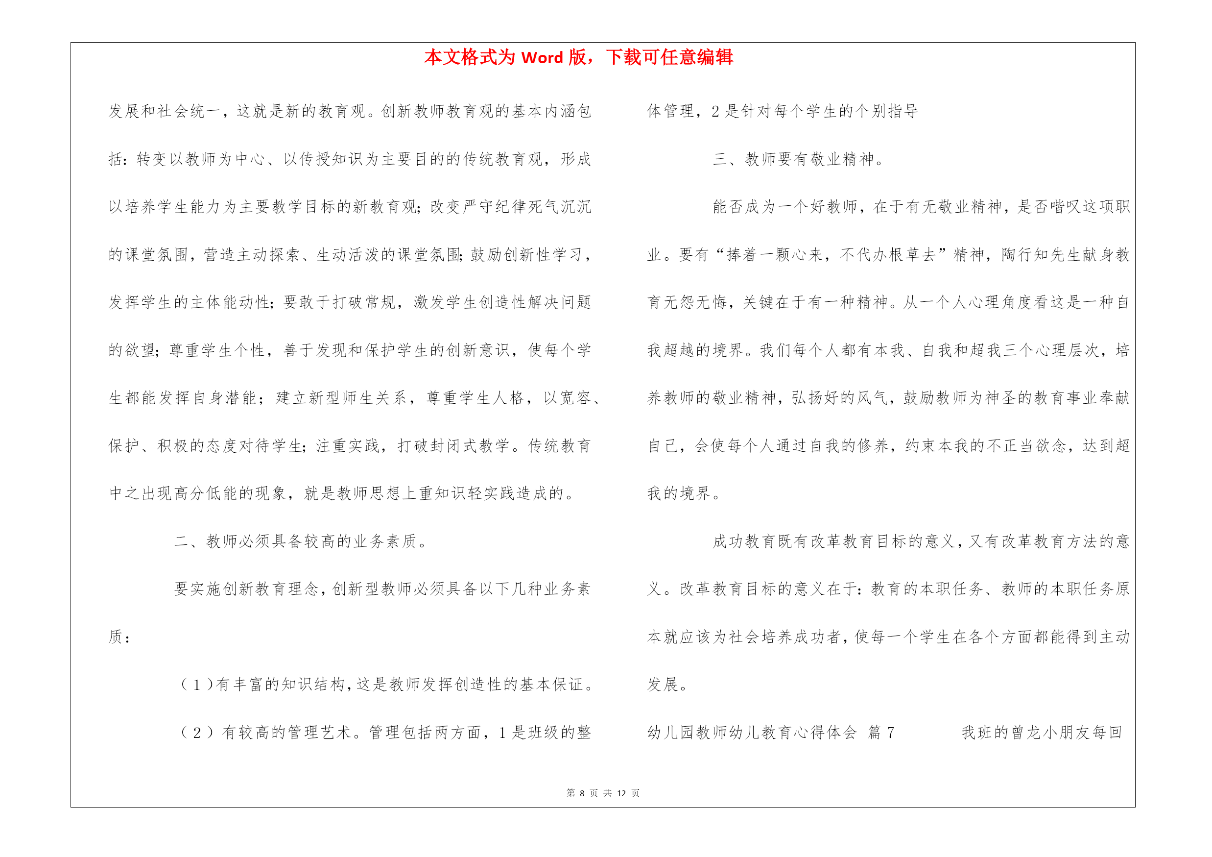 本文格式为Word版,下载可任意编辑第PAGE\*MERGEFORMAT12页共NUMPAGES\*MERGEFORMAT12页幼儿园教师幼儿教育心得体会集合10篇>幼儿园教师幼儿教育心得体会集合10篇某些事情让我们心里有了一些心得后,写一篇心得体会,记录下来,这样我们可以养成良好的总结方法。那么心得体会怎么写才能感染读者呢?下面是我为大家整理的幼儿园教师幼儿教育心得体会10篇,仅供参考,欢迎大家阅读。幼儿园教师幼儿教育心得体会篇1我是一名小学的语文教师,从事教学已有二十多年了,由于幼儿园差教师,我被调进幼儿园工作,一晃六年过去了,回忆过去走过的路,再展望未来,真的,当一名幼教老师真快乐!和天真活泼的小朋友在一起心情爽:每当音乐一响起,小朋友们都会跟着音乐的节奏欢快的跳动,那稚气的笑脸、那整齐的动作,再加上优雅的音乐声,我的心倍儿爽啊!幼儿的好奇与好问也常常令人暗笑:有一次,一个小朋友问道:“老师,你读过书吗?老师,人是怎样出生的?树叶为什么到秋天就会落呢?小雨怎么那么捣蛋啊?蚂蚁吃什么呀?”等等一些有时候不好直接回答的问题,幼儿们的幼稚让我看来太可爱哦!幼儿们对老师的讨好也叫人舒心:幼儿们别看他们小小的年纪,可讨好老师,是一个比一个行,每天就会有些孩子围着老师,对老师说:“老师你今天穿的好漂亮啊,你好年轻啊,我们好喜欢你啊,”等等。当老师一靠近他们,他们就会向老师撒娇,休息时,一些孩子就都来靠在我的身边,在我身上摸来摸去,我知道他们这是喜欢老师的一种表达方式,我就是特别特别喜欢那群幼稚可爱的孩子。当一名老师好,可当一名幼儿园的老师更好,幼儿园的老师整天生活在欢声笑语之中,心中无压力,虽然责任重大,但只要有责任心,我觉得当幼儿园的老师是我无怨无悔的选择,做一名幼儿园的老师真好!幼儿园教师幼儿教育心得体会篇2孩子们陆续被家长接走了,看到杂乱的教室,我和钱老师站在一起,相视一笑,“开始整理吧,明天还是这样子。”是呀,面对孩子,我们没有苛求,虽然,每天不管多累都要收拾战场一样的场面,毕竟,看重孩子们的进步是我们最大的满足,累点也值得了。边收拾凌乱的玩具,不由得让我想起刚被家长接走的孩子们,看到插塑玩具,让我记起哭闹的新生王子恒,正是这个插塑,让我打开了孩子的话题,孩子由原来的哭闹到学会了创造,入园以来,飞机、花朵、长城在孩子的手中尽情展现。他在幼儿园找到了乐趣与欢笑,还时不时的走到我面前跟我炫耀:“老师,我没有找奶奶,我自己玩的。孩子们玩耍的场面在我这里历历在目,我不由得笑出声来,真的,好可爱的孩子们。“无奈了吧。”听到我笑声的钱老师对我说,“谁说无奈,是太可爱,看吧,等到下一星期,杂乱的教室就不杂乱了。”怎样,想到这些孩子们可爱的身影,在不知不觉中,教室就被我们收拾的整整齐齐,一切又回复了昨天的样子。因为,我相信,杂乱是暂时的,它需要我们每个教师的耐心与爱心。在一日活动中,我这个当老师的常常以挑剔的眼光对待孩子,恨不得孩子们个个十全十美,处处都能合乎我的标准。然而那一次孩子们对我的宽容却让我深深的感动,同时也启迪我对以往的做法进行了深刻的反思。幼儿园教师幼儿教育心得体会篇3为深入贯彻《国家中长期教育改革和发展规划纲要(20xx202年)》和《国务院关于当前发展学前教育的若干意见》,指导幼儿园和家实施科学的保育和教育,促进幼儿身心全面和谐发展,制定《3~6岁儿童学习与发展指南》,简称《指南》。《指南》中涵盖了很多的内容,为了深入了《指南》要传达给我们老师的精神,利用假期时间,我认真的学习、理解了《指南》,以下就是我学习《指南》的心得体会。一、对《指南》的概念有了进一步的了解。为了更加深入的了解《指南》的内容,我首先认真学习了《指南》的概念。《指南》以为幼儿后继学习和终身发展奠定良好素质基础为目标,以促进幼儿在体、智、德、美各方面的全面协调发展为核心,旨在引导幼儿园教师和家长树立正确的教育观念,了解36岁幼儿学习与发展的基本规律和特点,建立对幼儿发展的合理期望。从概念中能看出《指南》和《纲要》要达到的目标是一致的,不同在于《指南》中不仅有教师参与,还有家长的参与,这说明教孩子不只是老师的事情,要需要家长一起配合。此外,"了解36岁幼儿学习与发展的基本规律和特点,建立对幼儿发展的合理期望。"更好的将"以幼儿为本"体现在《指南》中。二、对实施《指南》的原则有了进一步的了解。只有明确了《指南》的原则,才能更好的贯彻《指南》的精神。《指南》的原则为:遵循幼儿的发展规律和学习特点,关注幼儿身心全面和谐发展、尊重幼儿发展的个体差异。这三个原则都把都幼儿作为主体,在制定原则时更多的是考虑孩子的'特点和身心发展的规律,为今后执行《指南》目标更加有目的性。其中原则说到:要注重学习与发展各领域之间的相互渗透和整合,从不同角度促进幼儿全