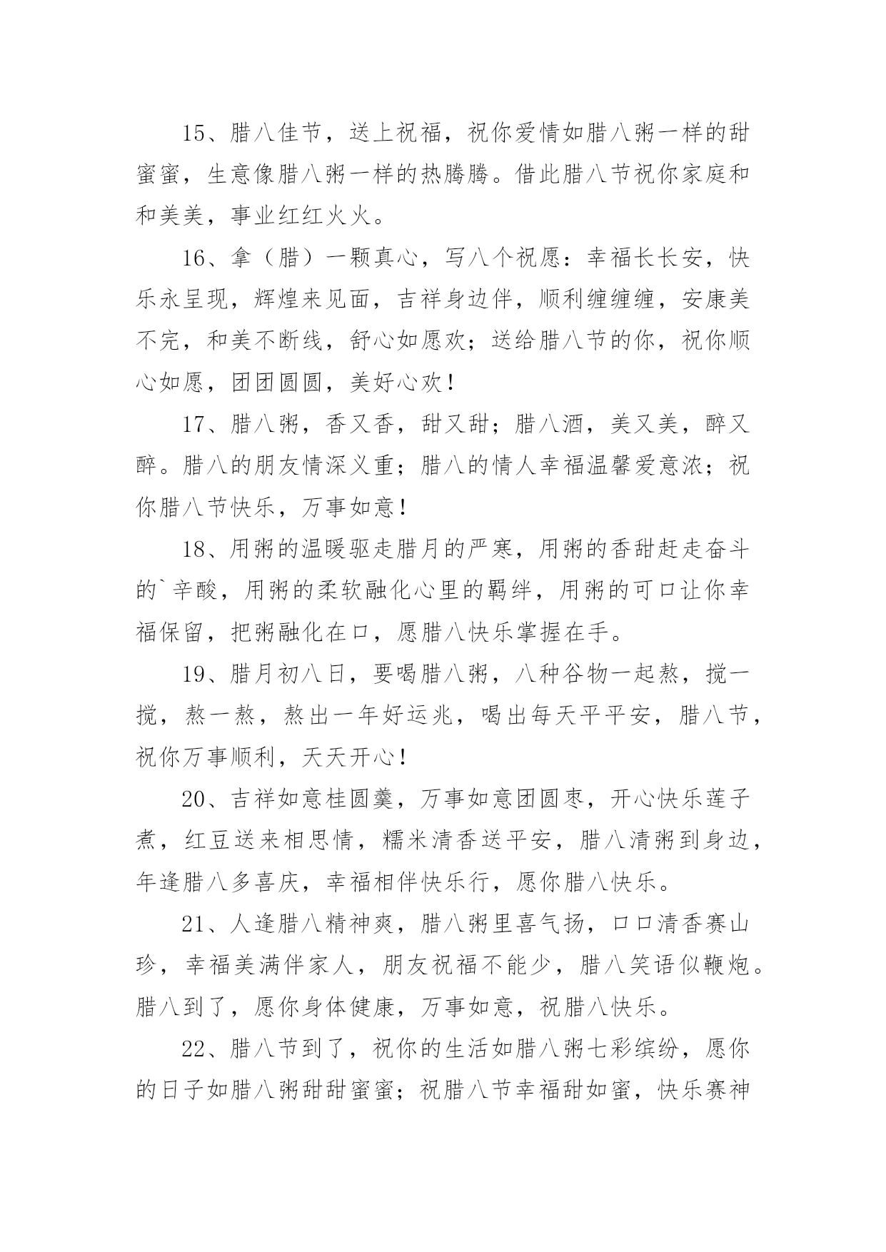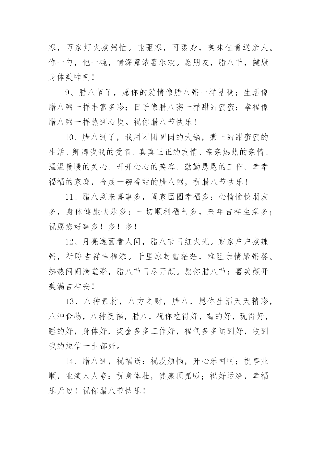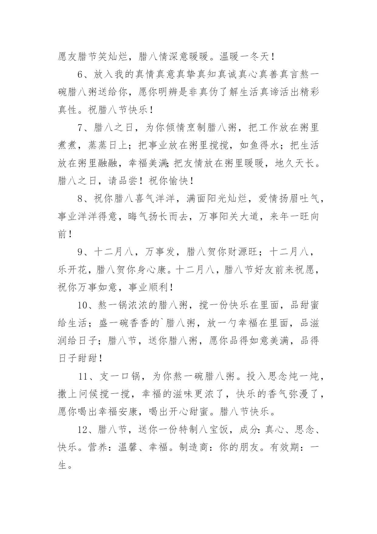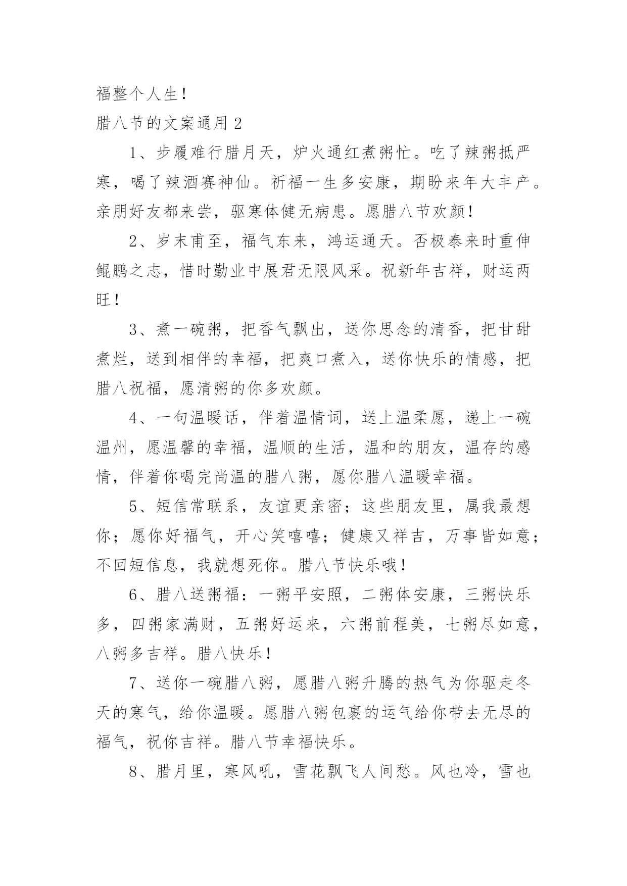 腊八节的文案腊八节的文案通用在生活、工作和学习中,大家肯定对各类文案都很熟悉吧,文案用以记录和分享生活日常。你知道什么样的文案才能称之为经典吗?下面是小编帮大家整理的腊八节的文案通用,希望对大家有所帮助。腊八节的文案通用11、是腊八节,送你一碗腊八粥,心情爽朗无烦忧,请接受我深深的祝福。愿所有的欢乐都陪伴着你直到永远,祝你腊八节快乐!2、煮一碗粥,把香气飘出,送你思念的清香,把甘甜煮烂,送到相伴的幸福,把爽口煮入,送你快乐的情感,把腊八祝福,愿清粥的你多欢颜。3、腊八节到了,我送给你一份大礼,就是腊八节的祝福,它里面包裹着我国上千年人们传承下来的美好祝愿,今天传到你家,有了这样深深的祝福,你想不幸福都不行哦!接礼啦!4、今天是腊八节,送你八气,愿你长得很有灵气,个人很有才气,家庭总是和气,经常会有喜气,天天充满朝气,做人很有福气,身上满是财气,时时有好运气。5、红红鞭炮震天响,红红辣粥诱人馋。亲朋品尝精神爽,邪魔闻了逃离远。吃了辣粥无脑烦,吉祥如意身健康。愿友腊节笑灿烂,腊八情深意暖暖。温暖一冬天!6、放入我的真情真意真挚真知真诚真心真善真言熬一碗腊八粥送给你,愿你明辨是非真伪了解生活真谛活出精彩真性。祝腊八节快乐!7、腊八之日,为你倾情烹制腊八粥,把工作放在粥里煮煮,蒸蒸日上;把事业放在粥里搅搅,如鱼得水;把生活放在粥里融融,幸福美满;把友情放在粥里暖暖,地久天长。腊八之日,请品尝!祝你愉快!8、祝你腊八喜气洋洋,满面阳光灿烂,爱情扬眉吐气,事业洋洋得意,晦气扬长而去,万事阳关大道,来年一旺向前!9、十二月八,万事发,腊八贺你财源旺;十二月八,乐开花,腊八贺你身心康。十二月八,腊八节好友前来祝愿,祝你万事如意,事业顺利!10、熬一锅浓浓的腊八粥,搅一份快乐在里面,品甜蜜给生活;盛一碗香香的`腊八粥,放一勺幸福在里面,品滋润给日子;腊八节,送你腊八粥,愿你品得如意美满,品得日子甜甜!11、支一口锅,为你熬一碗腊八粥。投入思念炖一炖,撒上问候搅一搅,幸福的滋味更浓了,快乐的香气弥漫了,愿你喝出幸福安康,喝出开心甜蜜。腊八节快乐。12、腊八节,送你一份特制八宝饭,成分:真心、思念、快乐。营养:温馨、幸福。制造商:你的朋友。有效期:一生。13、腊月初八日,要喝腊八粥,八种谷物一起熬,搅一搅,熬一熬,熬出一年好运兆,喝出每天平平安,腊八节,祝你万事顺利,天天开心!14、一勺开心糖,千粒如意米,颗颗健康果,一把好运豆,融以滴滴问候水,煮以烈烈祝福火,盛一碗香喷喷的腊八粥给你喝,愿你腊八节快乐!15、想想腊八粥,美了,做做腊八粥,喜了,看看腊八粥,乐了,闻闻腊八粥,爽了,尝尝腊八粥,呆了,喝喝腊八粥,醉了,送送腊八粥,祝福了,祝您腊八节幸福快乐了!16、甜蜜枣+健康豆+开心莲子+快乐果仁,加幸福水,用幸福火慢慢熬一生一世!今天腊八节喝了它,一生一世福寿安康笑哈哈!17、腊月腊八送健康,八宝谷物粥里藏。营养养生利肠胃,各种口味任你尝。亲朋好友齐相聚,开开心心话短长。深情厚谊身边傍,笑声阵阵传四方。祝你快乐健康!18、喝了腊八粥,心情爽朗无烦忧;喝了腊八粥,事业爱情双丰收;喝了腊八粥,神佛保佑增福寿;喝了腊八粥,幸福美满年年有!腊八节到了,别忘了喝粥哦~19、一口粥,香浓浓;两口粥,情融融;三口粥,甜蜜蜜;四口粥,暖悠悠;五口粥,热腾腾;六口粥,顺溜溜;七口粥,红旺旺;八口粥,腊八节,愿你福长久!20、拿一个快乐的碗,盛一碗幸福的腊八粥,取一个好运的汤匙,让甜蜜融入口中,让笑容挂在脸上,让幸福荡漾在心中。腊八节,喝一碗浓情的腊八粥,走过温暖冬季,幸福整个人生!腊八节的文案通用21、步履难行腊月天,炉火通红煮粥忙。吃了辣粥抵严寒,喝了辣酒赛神仙。祈福一生多安康,期盼来年大丰产。亲朋好友都来尝,驱寒体健无病患。愿腊八节欢颜!2、岁末甫至,福气东来,鸿运通天。否极泰来时重伸鲲鹏之志,惜时勤业中展君无限风采。祝新年吉祥,财运两旺!3、煮一碗粥,把香气飘出,送你思念的清香,把甘甜煮烂,送到相伴的幸福,把爽口煮入,送你快乐的情感,把腊八祝福,愿清粥的你多欢颜。4、一句温暖话,伴着温情词,送上温柔愿,递上一碗温州,愿温馨的幸福,温顺的生活,温和的朋友,温存的感情,伴着你喝完尚温的腊八粥,愿你腊八温暖幸福。5、短信常联系,友谊更亲密;这些朋友里,属我最想你;愿你好福气,开心笑嘻嘻;健康又祥吉,万事皆如意;不回短信息,我就想死你。腊八节快乐哦!6、腊八送粥福:一粥平安照,二粥体安康,三粥快乐多,四粥家满财,五粥好运来,六粥前程美,七粥尽如意,八粥多吉祥。腊八快乐!7、送你一碗腊八粥,愿腊八粥升腾的热气为你驱走冬天的寒气,给你温暖。愿腊八粥包裹的运气给你带去无尽的福气,祝你吉祥。腊八节幸福快乐。8、腊月里,寒风吼,雪花飘飞人间愁。风也冷,雪也寒,万家灯火煮粥