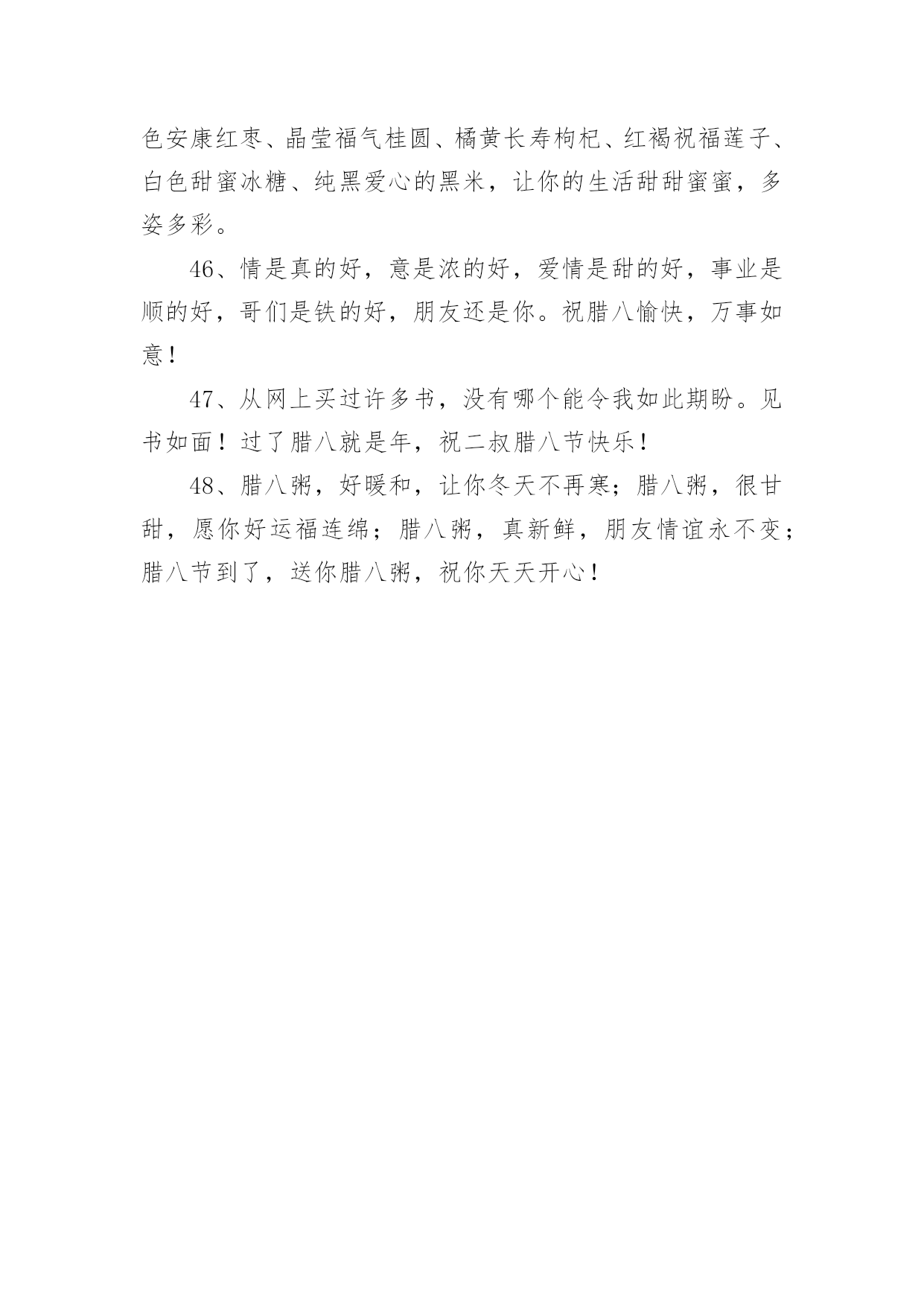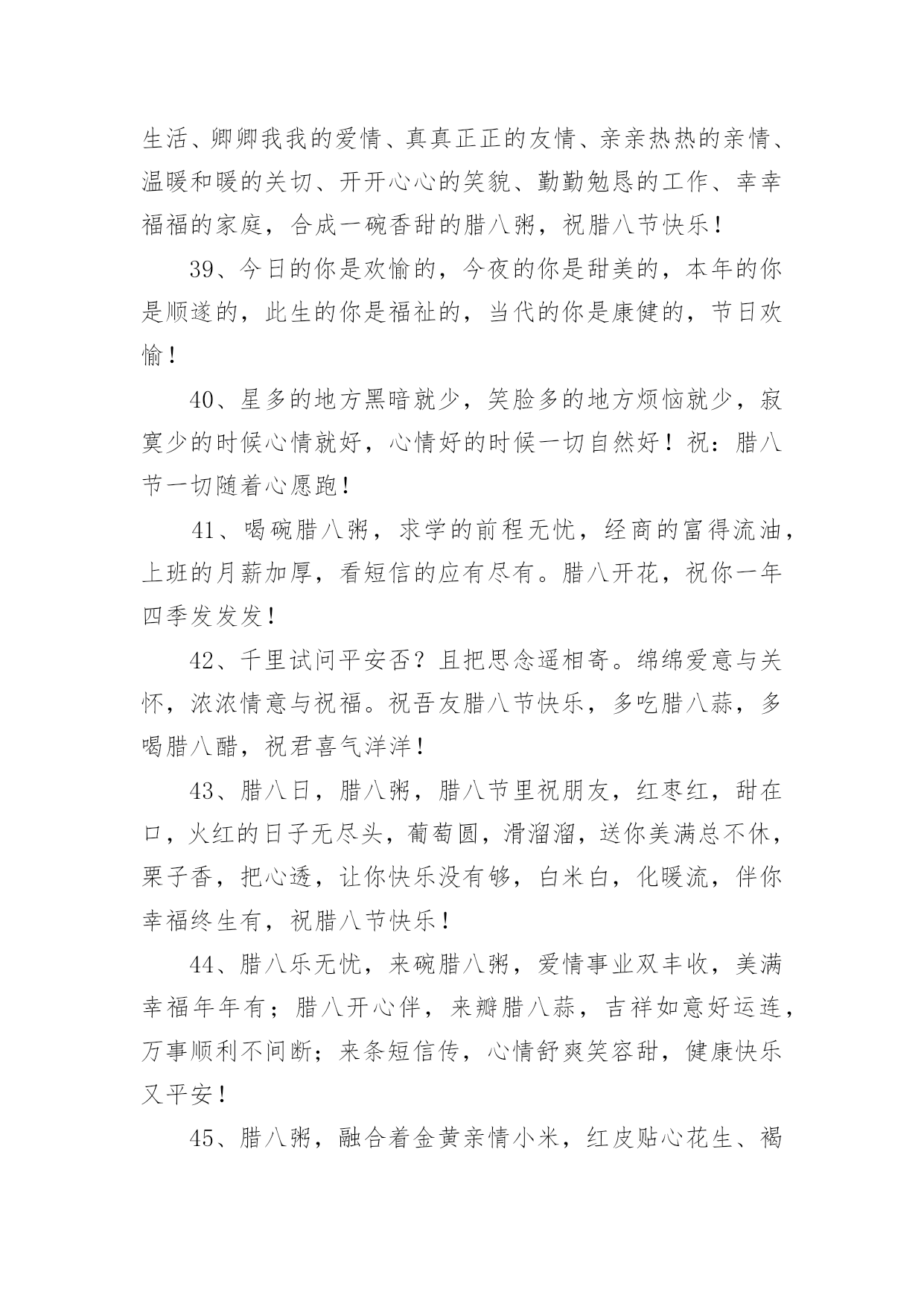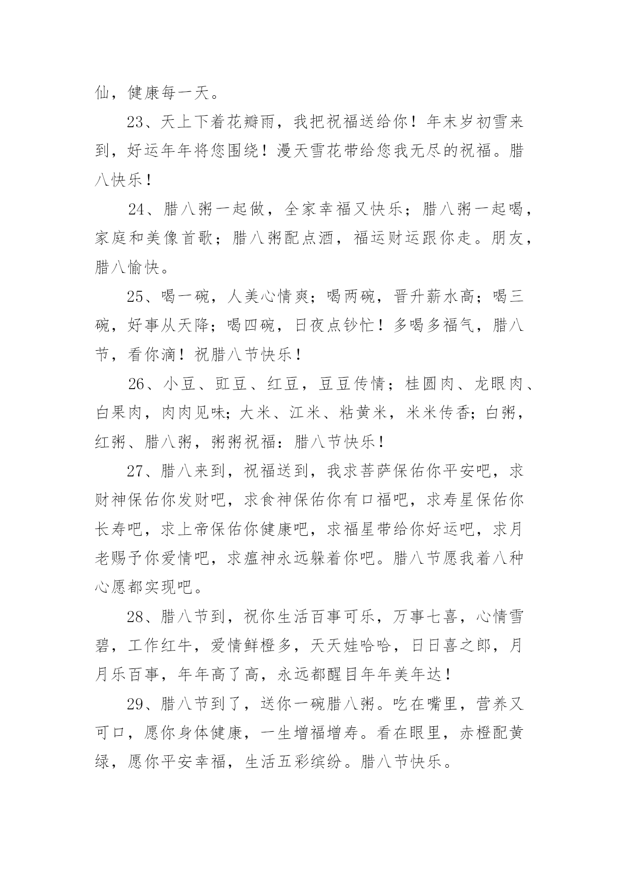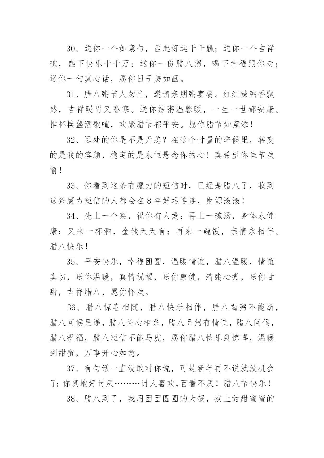腊八节的文案腊八节的文案通用在生活、工作和学习中,大家肯定对各类文案都很熟悉吧,文案用以记录和分享生活日常。你知道什么样的文案才能称之为经典吗?下面是小编帮大家整理的腊八节的文案通用,希望对大家有所帮助。腊八节的文案通用11、是腊八节,送你一碗腊八粥,心情爽朗无烦忧,请接受我深深的祝福。愿所有的欢乐都陪伴着你直到永远,祝你腊八节快乐!2、煮一碗粥,把香气飘出,送你思念的清香,把甘甜煮烂,送到相伴的幸福,把爽口煮入,送你快乐的情感,把腊八祝福,愿清粥的你多欢颜。3、腊八节到了,我送给你一份大礼,就是腊八节的祝福,它里面包裹着我国上千年人们传承下来的美好祝愿,今天传到你家,有了这样深深的祝福,你想不幸福都不行哦!接礼啦!4、今天是腊八节,送你八气,愿你长得很有灵气,个人很有才气,家庭总是和气,经常会有喜气,天天充满朝气,做人很有福气,身上满是财气,时时有好运气。5、红红鞭炮震天响,红红辣粥诱人馋。亲朋品尝精神爽,邪魔闻了逃离远。吃了辣粥无脑烦,吉祥如意身健康。愿友腊节笑灿烂,腊八情深意暖暖。温暖一冬天!6、放入我的真情真意真挚真知真诚真心真善真言熬一碗腊八粥送给你,愿你明辨是非真伪了解生活真谛活出精彩真性。祝腊八节快乐!7、腊八之日,为你倾情烹制腊八粥,把工作放在粥里煮煮,蒸蒸日上;把事业放在粥里搅搅,如鱼得水;把生活放在粥里融融,幸福美满;把友情放在粥里暖暖,地久天长。腊八之日,请品尝!祝你愉快!8、祝你腊八喜气洋洋,满面阳光灿烂,爱情扬眉吐气,事业洋洋得意,晦气扬长而去,万事阳关大道,来年一旺向前!9、十二月八,万事发,腊八贺你财源旺;十二月八,乐开花,腊八贺你身心康。十二月八,腊八节好友前来祝愿,祝你万事如意,事业顺利!10、熬一锅浓浓的腊八粥,搅一份快乐在里面,品甜蜜给生活;盛一碗香香的`腊八粥,放一勺幸福在里面,品滋润给日子;腊八节,送你腊八粥,愿你品得如意美满,品得日子甜甜!11、支一口锅,为你熬一碗腊八粥。投入思念炖一炖,撒上问候搅一搅,幸福的滋味更浓了,快乐的香气弥漫了,愿你喝出幸福安康,喝出开心甜蜜。腊八节快乐。12、腊八节,送你一份特制八宝饭,成分:真心、思念、快乐。营养:温馨、幸福。制造商:你的朋友。有效期:一生。13、腊月初八日,要喝腊八粥,八种谷物一起熬,搅一搅,熬一熬,熬出一年好运兆,喝出每天平平安,腊八节,祝你万事顺利,天天开心!14、一勺开心糖,千粒如意米,颗颗健康果,一把好运豆,融以滴滴问候水,煮以烈烈祝福火,盛一碗香喷喷的腊八粥给你喝,愿你腊八节快乐!15、想想腊八粥,美了,做做腊八粥,喜了,看看腊八粥,乐了,闻闻腊八粥,爽了,尝尝腊八粥,呆了,喝喝腊八粥,醉了,送送腊八粥,祝福了,祝您腊八节幸福快乐了!16、甜蜜枣+健康豆+开心莲子+快乐果仁,加幸福水,用幸福火慢慢熬一生一世!今天腊八节喝了它,一生一世福寿安康笑哈哈!17、腊月腊八送健康,八宝谷物粥里藏。营养养生利肠胃,各种口味任你尝。亲朋好友齐相聚,开开心心话短长。深情厚谊身边傍,笑声阵阵传四方。祝你快乐健康!18、喝了腊八粥,心情爽朗无烦忧;喝了腊八粥,事业爱情双丰收;喝了腊八粥,神佛保佑增福寿;喝了腊八粥,幸福美满年年有!腊八节到了,别忘了喝粥哦~19、一口粥,香浓浓;两口粥,情融融;三口粥,甜蜜蜜;四口粥,暖悠悠;五口粥,热腾腾;六口粥,顺溜溜;七口粥,红旺旺;八口粥,腊八节,愿你福长久!20、拿一个快乐的碗,盛一碗幸福的腊八粥,取一个好运的汤匙,让甜蜜融入口中,让笑容挂在脸上,让幸福荡漾在心中。腊八节,喝一碗浓情的腊八粥,走过温暖冬季,幸福整个人生!腊八节的文案通用21、步履难行腊月天,炉火通红煮粥忙。吃了辣粥抵严寒,喝了辣酒赛神仙。祈福一生多安康,期盼来年大丰产。亲朋好友都来尝,驱寒体健无病患。愿腊八节欢颜!2、岁末甫至,福气东来,鸿运通天。否极泰来时重伸鲲鹏之志,惜时勤业中展君无限风采。祝新年吉祥,财运两旺!3、煮一碗粥,把香气飘出,送你思念的清香,把甘甜煮烂,送到相伴的幸福,把爽口煮入,送你快乐的情感,把腊八祝福,愿清粥的你多欢颜。4、一句温暖话,伴着温情词,送上温柔愿,递上一碗温州,愿温馨的幸福,温顺的生活,温和的朋友,温存的感情,伴着你喝完尚温的腊八粥,愿你腊八温暖幸福。5、短信常联系,友谊更亲密;这些朋友里,属我最想你;愿你好福气,开心笑嘻嘻;健康又祥吉,万事皆如意;不回短信息,我就想死你。腊八节快乐哦!6、腊八送粥福:一粥平安照,二粥体安康,三粥快乐多,四粥家满财,五粥好运来,六粥前程美,七粥尽如意,八粥多吉祥。腊八快乐!7、送你一碗腊八粥,愿腊八粥升腾的热气为你驱走冬天的寒气,给你温暖。愿腊八粥包裹的运气给你带去无尽的福气,祝你吉祥。腊八节幸福快乐。8、腊月里,寒风吼,雪花飘飞人间愁。风也冷,雪也寒,万家灯火煮粥