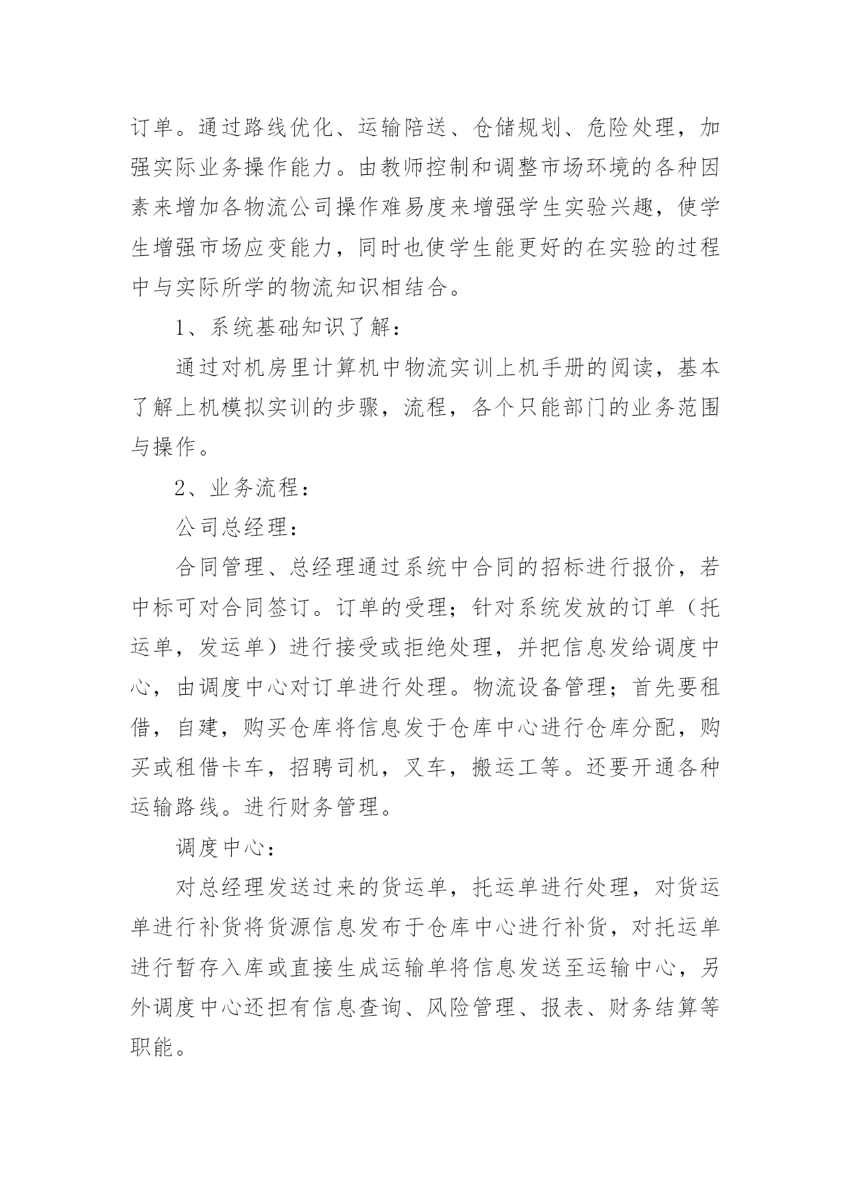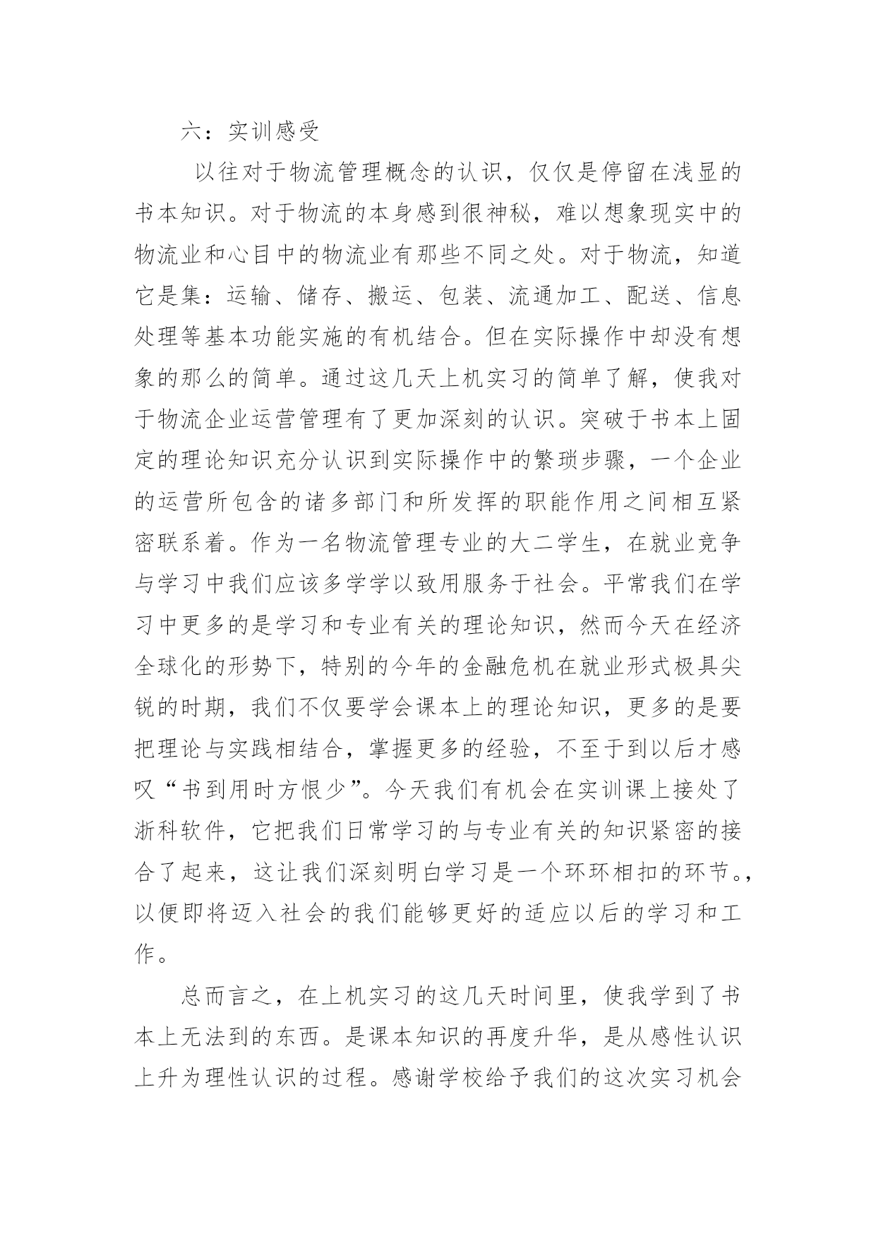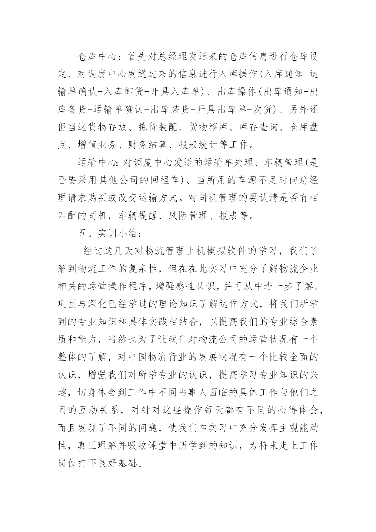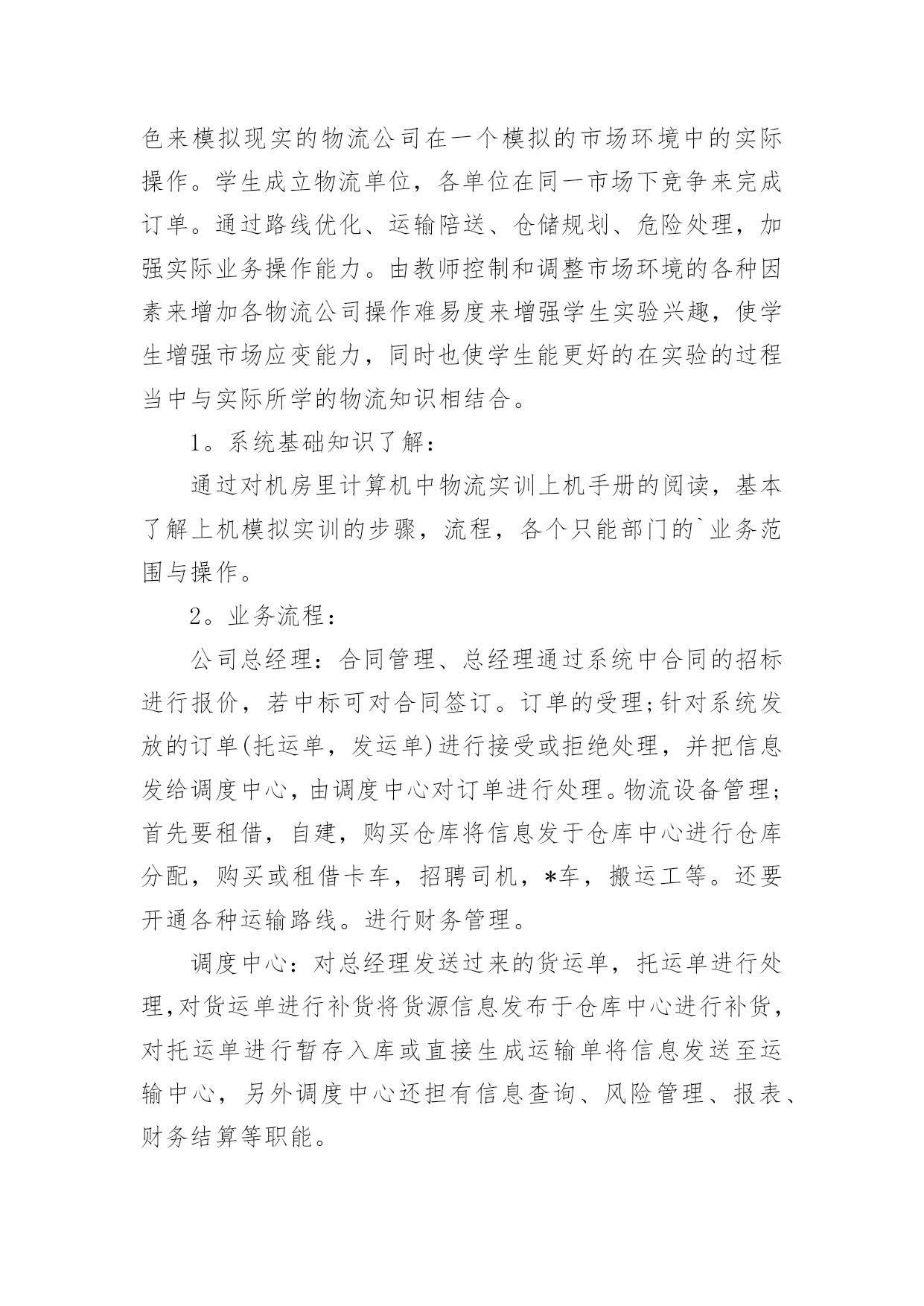 物流专业大学实习报告物流专业大学实习报告在当下这个社会中,报告使用的次数愈发增长,报告包含标题、正文、结尾等。那么什么样的报告才是有效的呢?下面是小编为大家收集的物流专业大学实习报告,欢迎大家借鉴与参考,希望对大家有所帮助。物流专业大学实习报告1为了更好的适应以后的学习和工作,在本学期末,由学校统一安排利用浙科物流管理软件进行实习。我们将所学到的专业知识和具体实践相结合,以提高我们的专业综合素质和能力,当然也为了让我们对物流公司的运营状况有一个整体的了解,物流的特点,主要设备和作业流程,运营管理,增强同学们对所学专业的认识,提高学习专业知识的兴趣,深化对所学知识的理解,以便即将迈入社会的我们能够更好的适应以后的学习和工作,为以后的学习和工作打下坚实的基础。“物流”作为国民经济发展的动脉和基础产业,是一种新的生产力,是新的经济增长点。针对对这一物流形式学校利用浙科物流管理软件给我们一个更广泛的了解机会,软件中分公司总经理、调度中心、仓库中心、运输中心、四个角色来模拟现实的物流公司在一个模拟的市场环境中的实际操作。学生成立物流单位,各单位在同一市场下竞争来完成订单。通过路线优化、运输陪送、仓储规划、危险处理,加强实际业务操作能力。由教师控制和调整市场环境的各种因素来增加各物流公司操作难易度来增强学生实验兴趣,使学生增强市场应变能力,同时也使学生能更好的在实验的过程中与实际所学的物流知识相结合。1、系统基础知识了解:通过对机房里计算机中物流实训上机手册的阅读,基本了解上机模拟实训的步骤,流程,各个只能部门的业务范围与操作。2、业务流程:公司总经理:合同管理、总经理通过系统中合同的招标进行报价,若中标可对合同签订。订单的受理;针对系统发放的订单(托运单,发运单)进行接受或拒绝处理,并把信息发给调度中心,由调度中心对订单进行处理。物流设备管理;首先要租借,自建,购买仓库将信息发于仓库中心进行仓库分配,购买或租借卡车,招聘司机,叉车,搬运工等。还要开通各种运输路线。进行财务管理。调度中心:对总经理发送过来的货运单,托运单进行处理,对货运单进行补货将货源信息发布于仓库中心进行补货,对托运单进行暂存入库或直接生成运输单将信息发送至运输中心,另外调度中心还担有信息查询、风险管理、报表、财务结算等职能。仓库中心:首先对总经理发送来的仓库信息进行仓库设定、对调度中心发送过来的信息进行入库操作(入库通知-运输单确认-入库卸货-开具入库单)、出库操作(出库通知-出库备货-运输单确认-出库装货-开具出库单-发货)、另外还但当这货物存放、拣货装配、货物移库、库存查询、仓库盘点、增值业务、财务结算、报表统计等工作。运输中心:对调度中心发送的运输单处理、车辆管理(是否要采用其他公司的回程车)、当所用的车源不足时向总经理请求购买或改变运输方式。对司机管理的要认清是否有相匹配的司机,车辆提醒、风险管理、报表等。经过这几天对物流管理上机模拟软件的学习,我们了解到物流工作的'复杂性,但在在此实习中充分了解物流企业相关的运营操作程序,增强感性认识,并可从中进一步了解、巩固与深化已经学过的理论知识了解运作方式,将我们所学到的专业知识和具体实践相结合,以提高我们的专业综合素质和能力,当然也为了让我们对物流公司的运营状况有一个整体的了解,对中国物流行业的发展状况有一个比较全面的认识,增强我们对所学专业的认识,提高学习专业知识的兴趣,切身体会到工作中不同当事人面临的具体工作与他们之间的互动关系,对针对这些操作每天都有不同的心得体会,而且发现了不同的问题,使我们在实习中充分发挥主观能动性,真正理解并吸收课堂中所学到的知识,为将来走上工作岗位打下良好基础。总而言之,在上机实习的这几天时间里,使我学到了书本上无法到的东西。是课本知识的再度升华,是从感性认识上升为理性认识的过程。感谢学校给予我们的这次实习机会和老师们的实习教导。物流专业大学实习报告2本人是物流专业的学生,这段时间来在物流公司参加毕业顶岗实习,了解了很多也学习到了很多,下面是我实习时候的一些心得和报告!一、实习目标为了以后能更好的适应工作和学习,学校组织到xx物流配送中心进行动期x月的实习。重要是为了懂得物流的作业流程,以便对我国的物流业能有更深的懂得。二、实习请求了解物流的特色,xx货运,主要装备和作业流程,对其进行剖析,并根据学习的理论提出自己的看法。三、实习单位简介配送中心是以组织配送性销售或供给,履行实物配送为重要职能的流通型结点。具有集货中心、分货中心的职能。xx公司是在xx连锁超市基本了发展起来的大型企业,拥有大型百货购物中心,社区连锁超市,中心城市方便岛为支柱的三大贸易,并以现代物流配送中心为支撑平台。xx物流配送中心是一个中等范围的物流配送基地,是综合性的物流配送中心。兼有转运和集散功效,也可以扩大至
